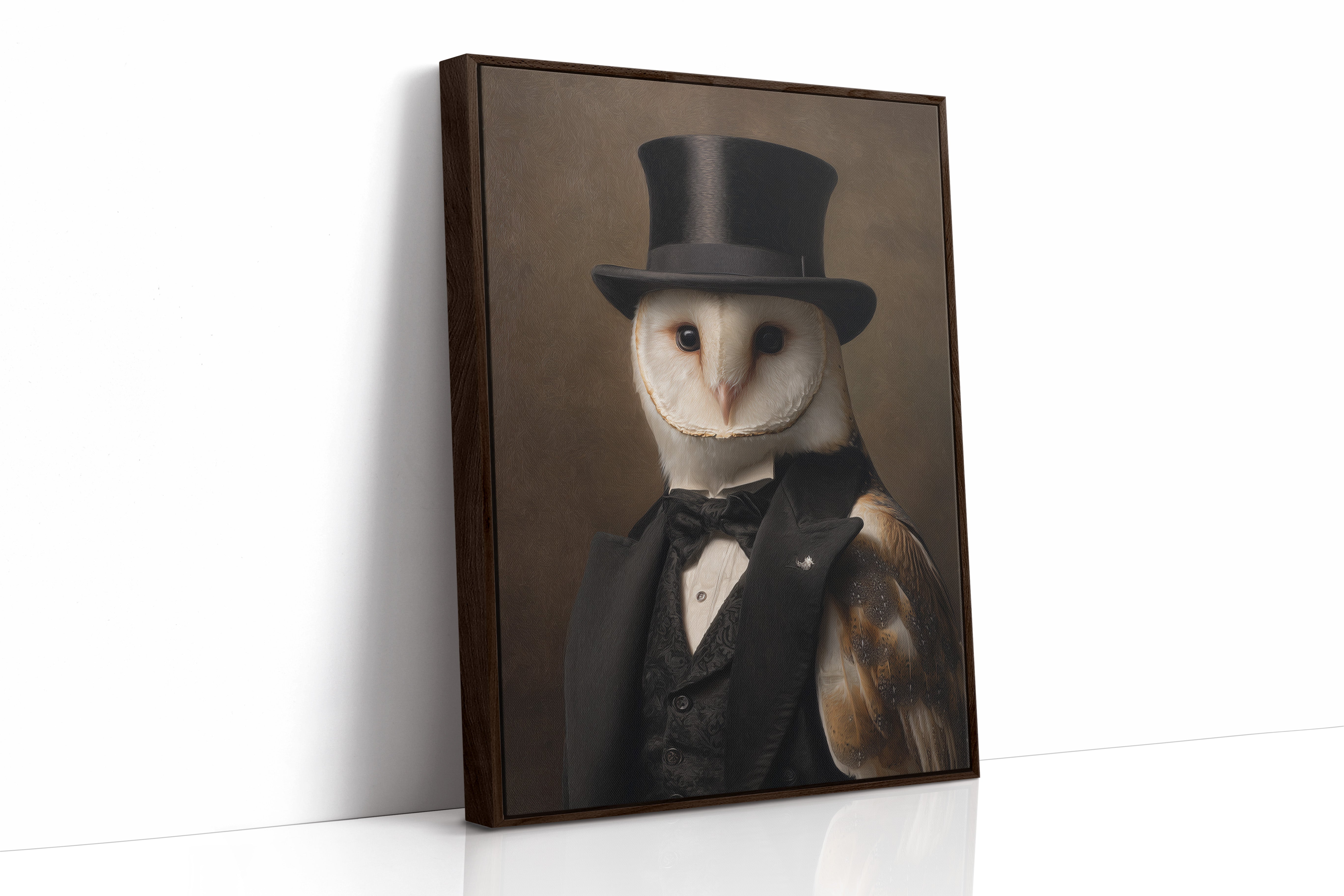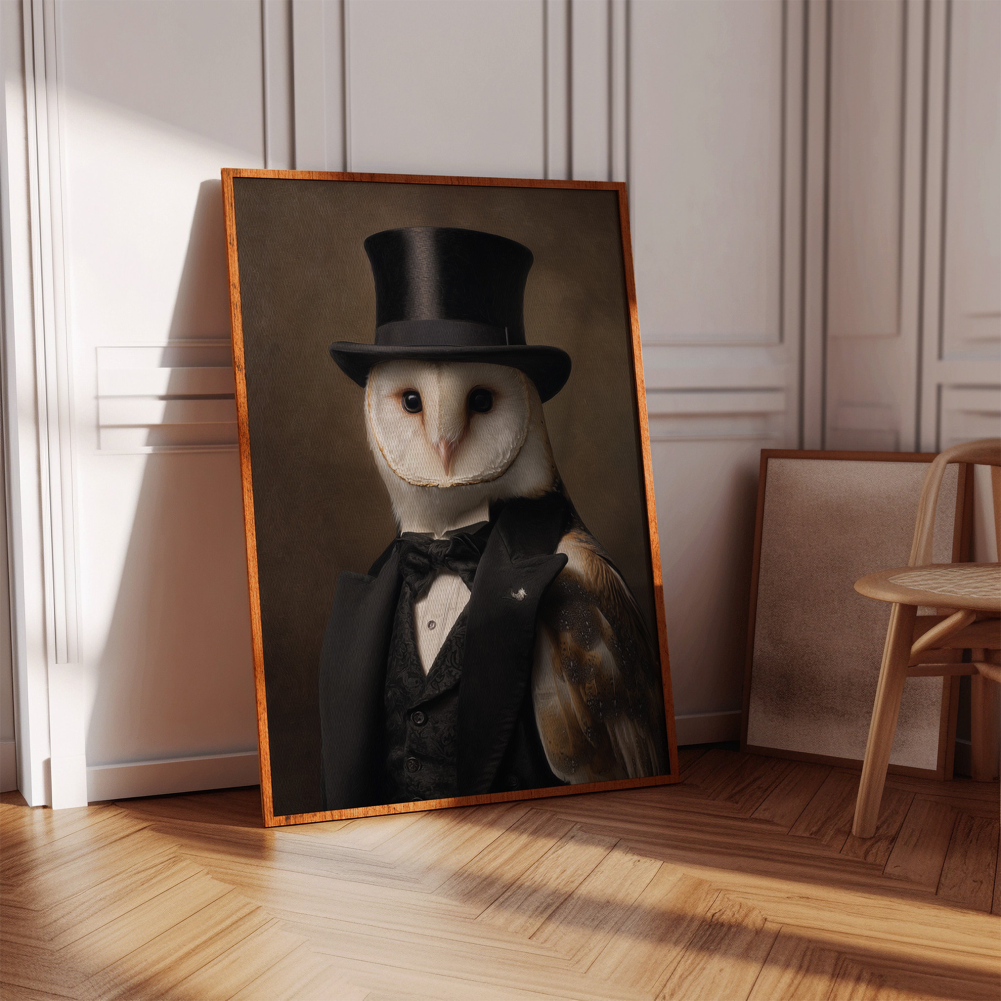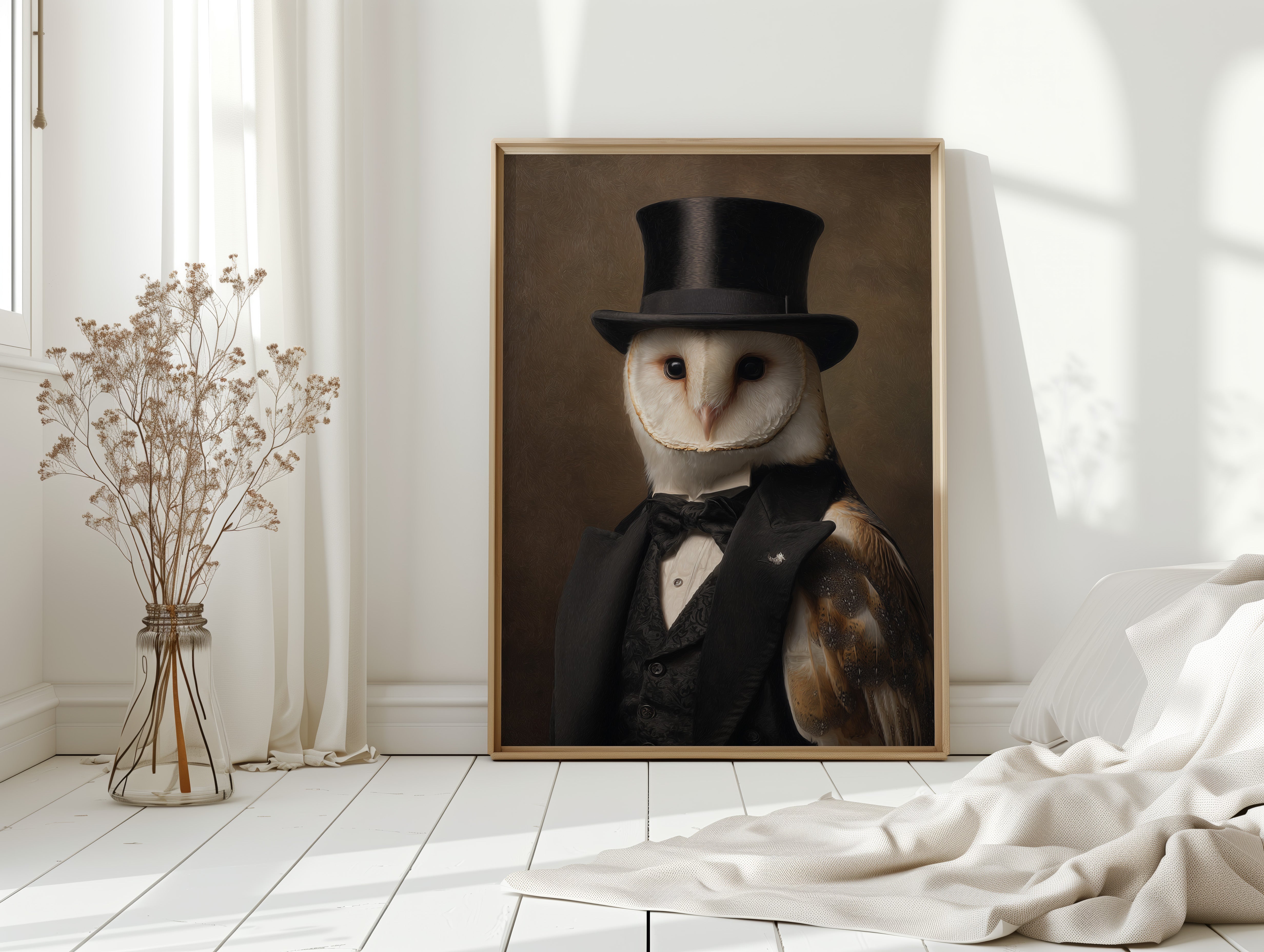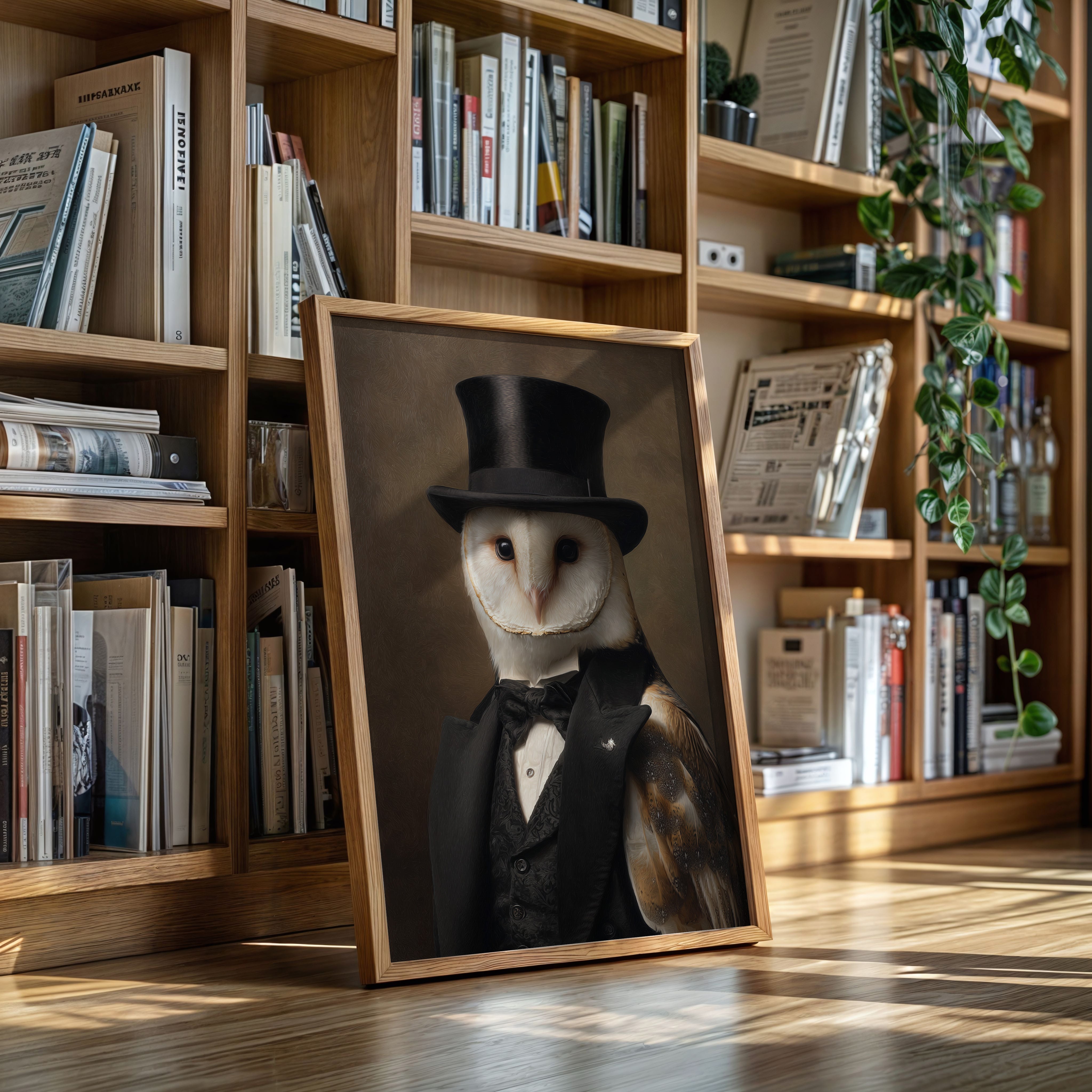 In a quiet glade, an owl dons a classic ensemble, merging elegance with nature's grace. This piece embodies the charm of artisanal craftsmanship, inviting a whimsical yet refined atmosphere. With intricate details of feathers and fabric, the contrast between the wild and the sophisticated unfoldsa celebration of nature's beauty dressed in finery. Perfect for a study or library, this portrait adds a touch of elegance to any space, inspiring conversations and curiosity.