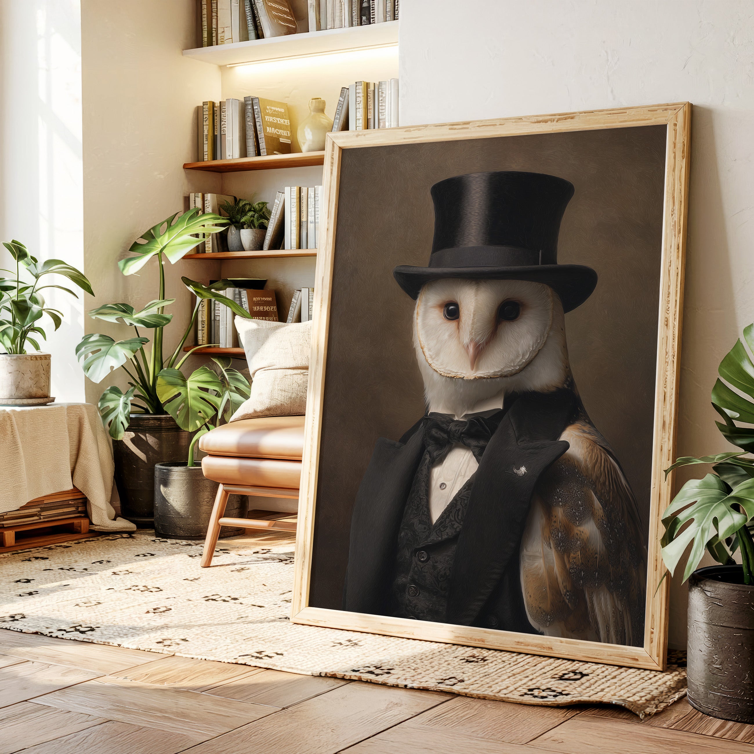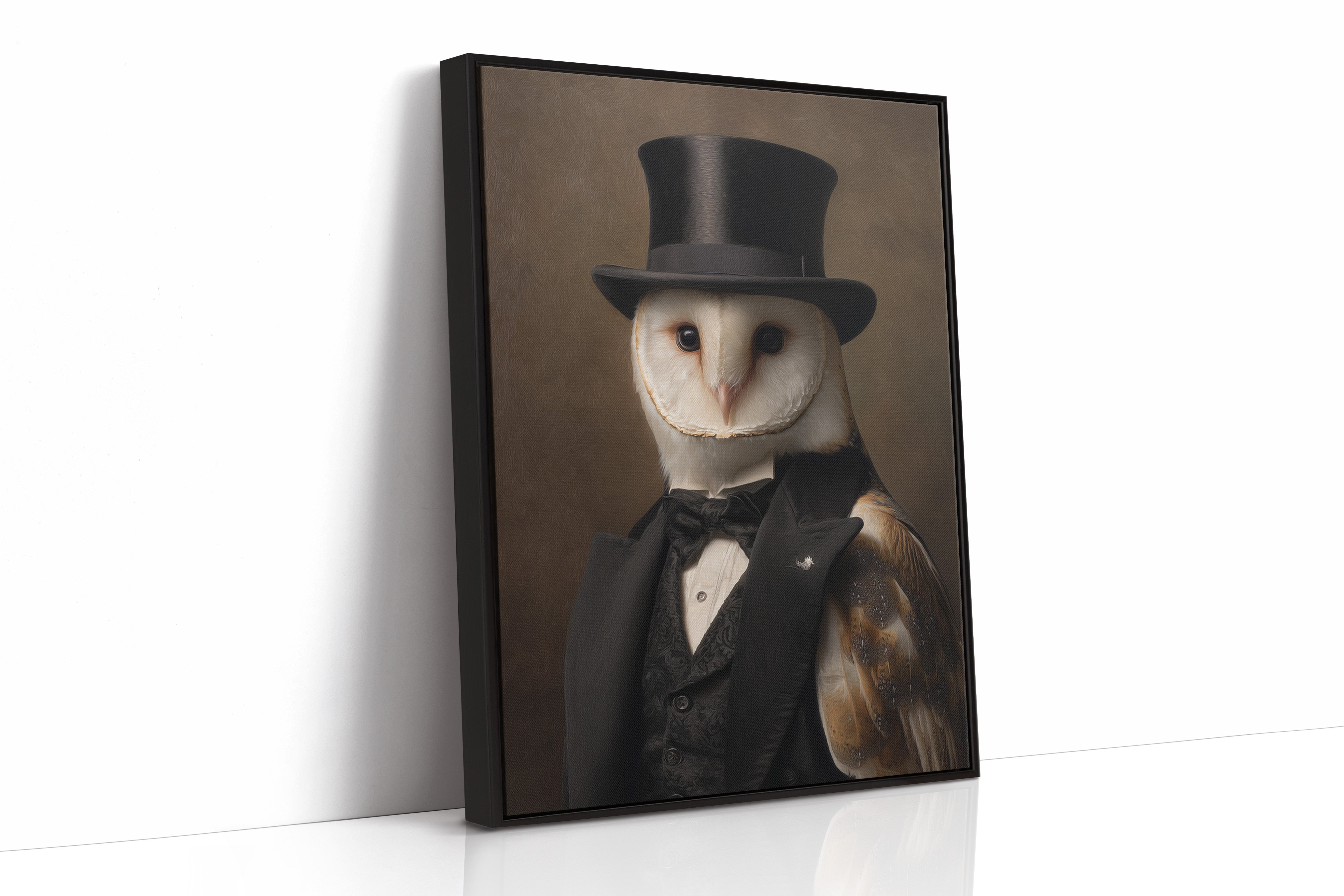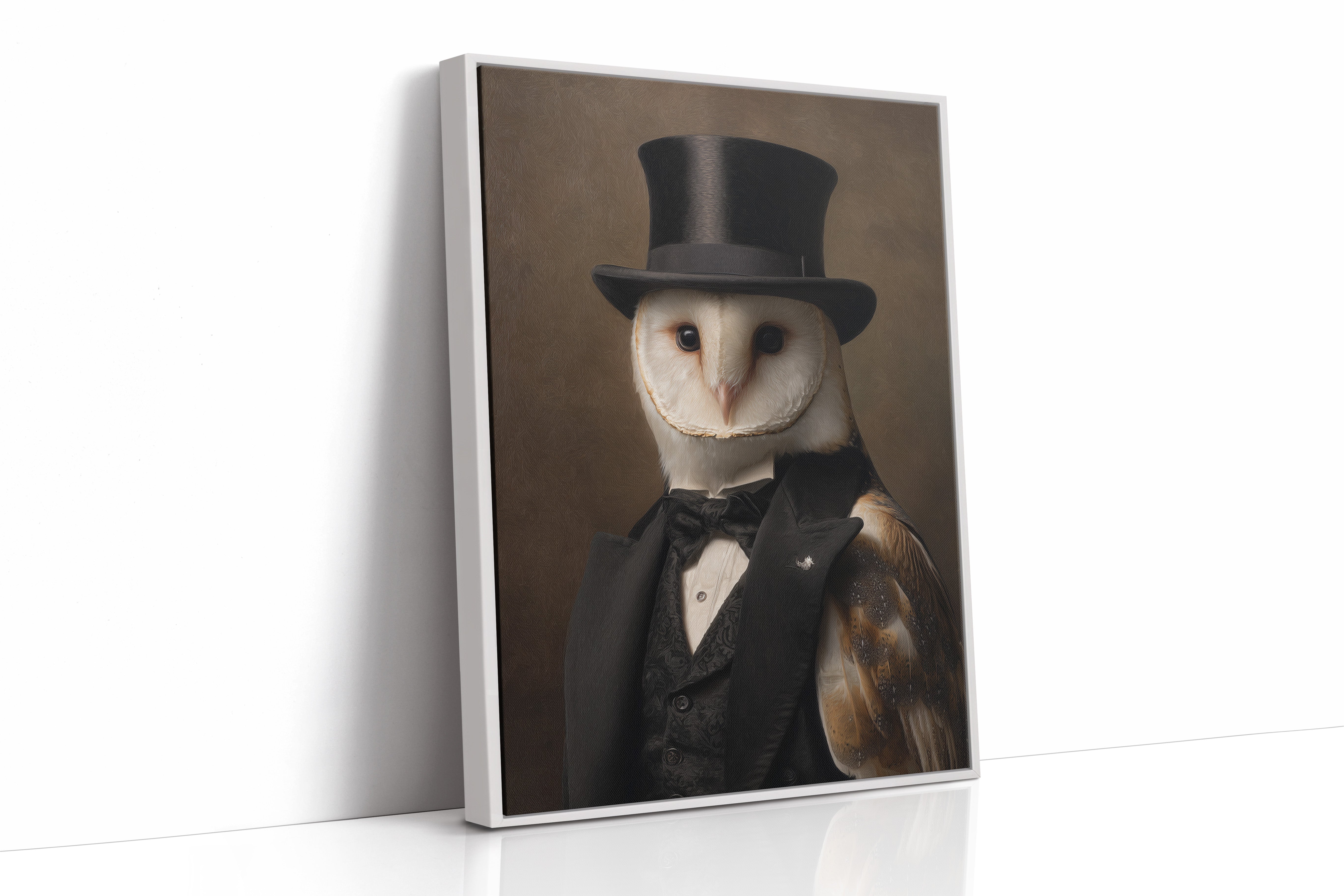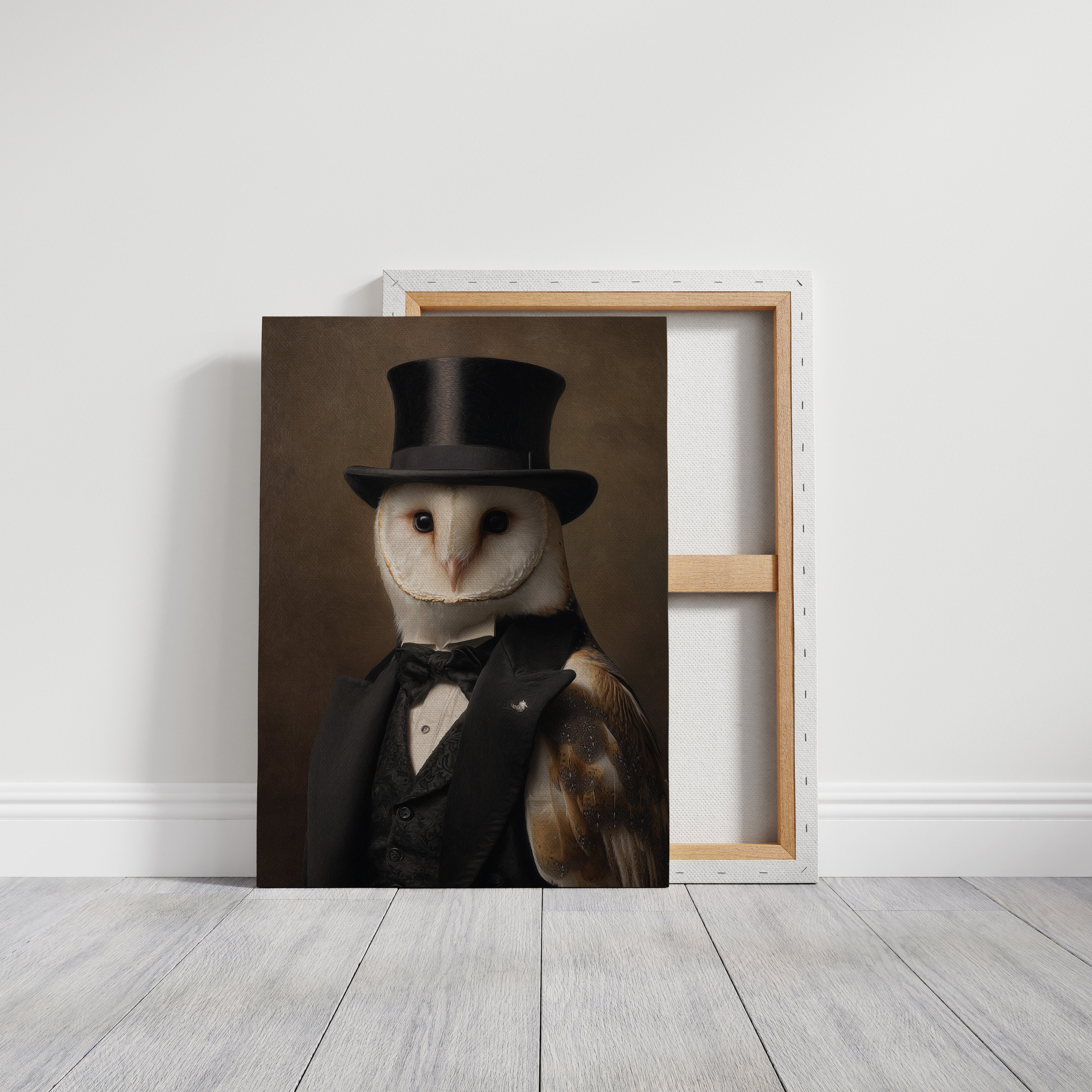In a quiet glade, an owl dons a classic ensemble, merging elegance with nature's grace. This piece embodies the charm of artisanal craftsmanship, inviting a whimsical yet refined atmosphere. With intricate details of feathers and fabric, the contrast between the wild and the sophisticated unfoldsa celebration of nature's beauty dressed in finery. Perfect for a study or library, this portrait adds a touch of elegance to any space, inspiring conversations and curiosity.