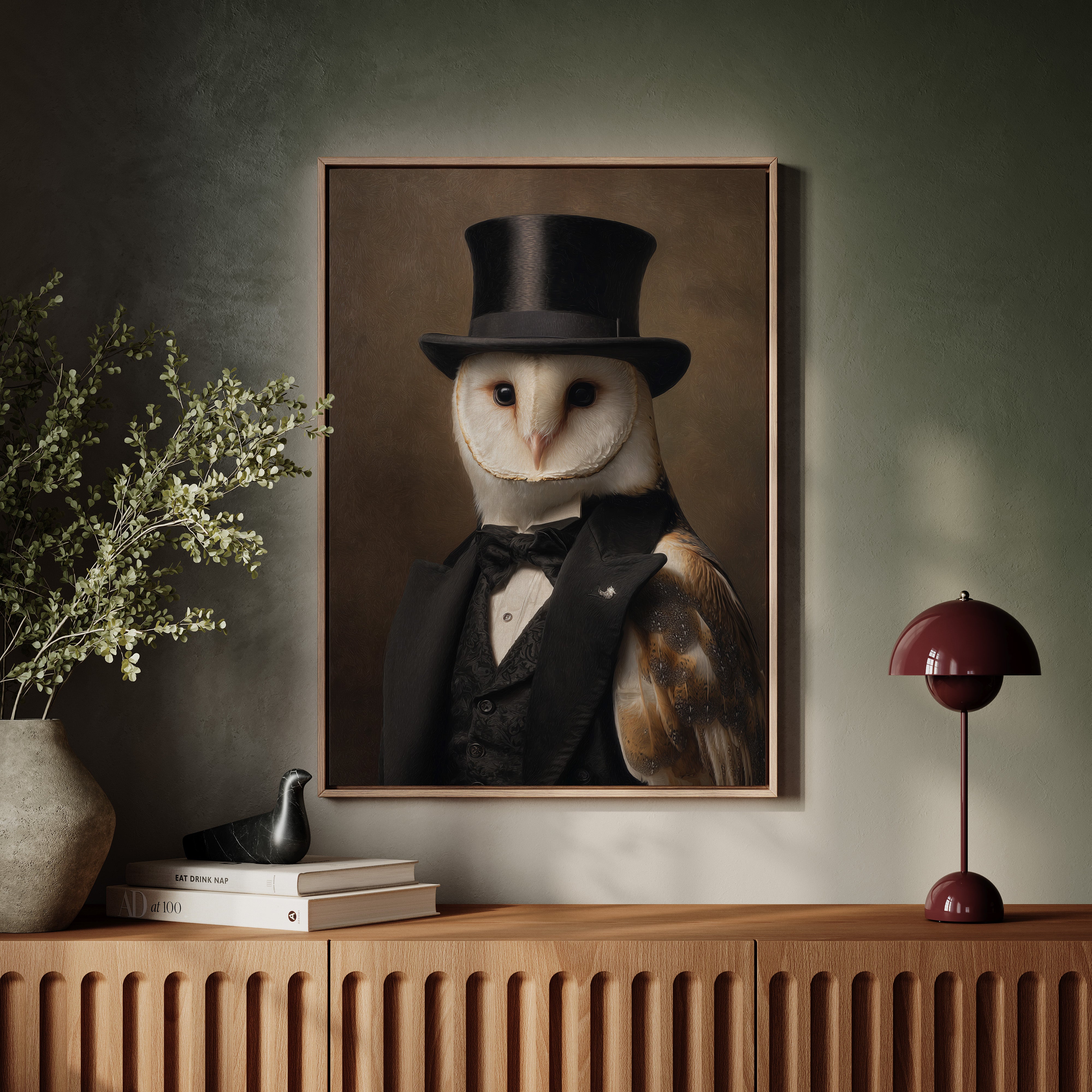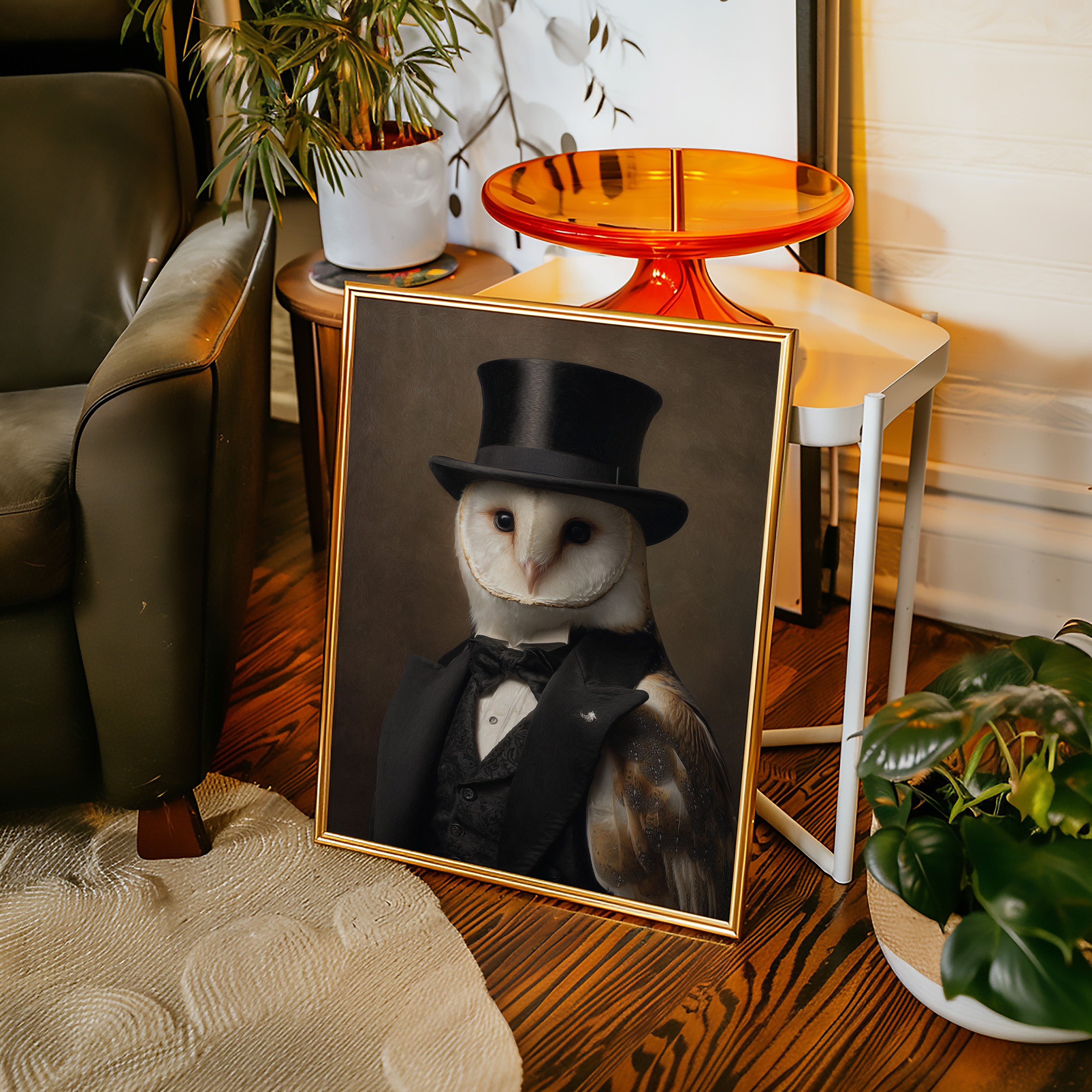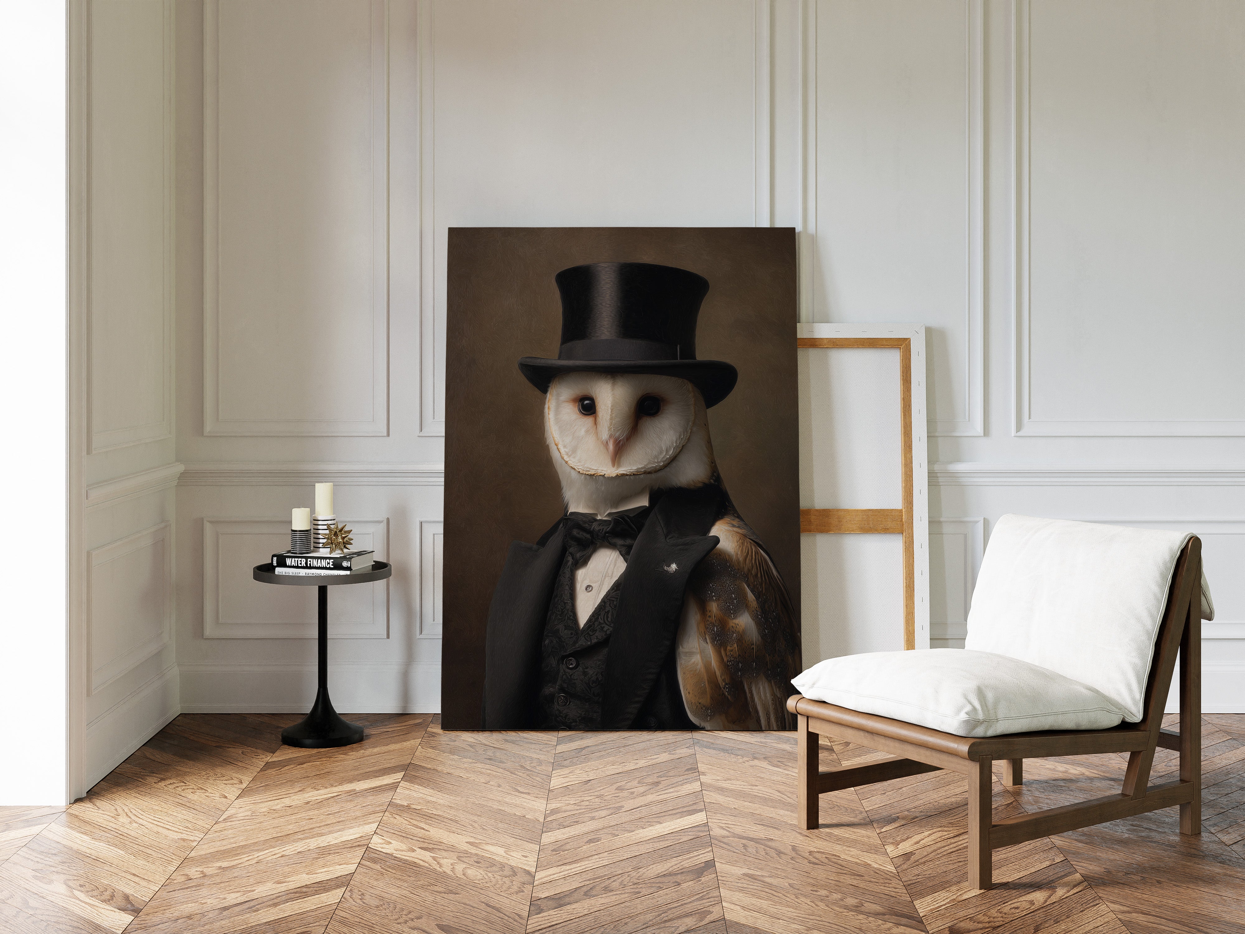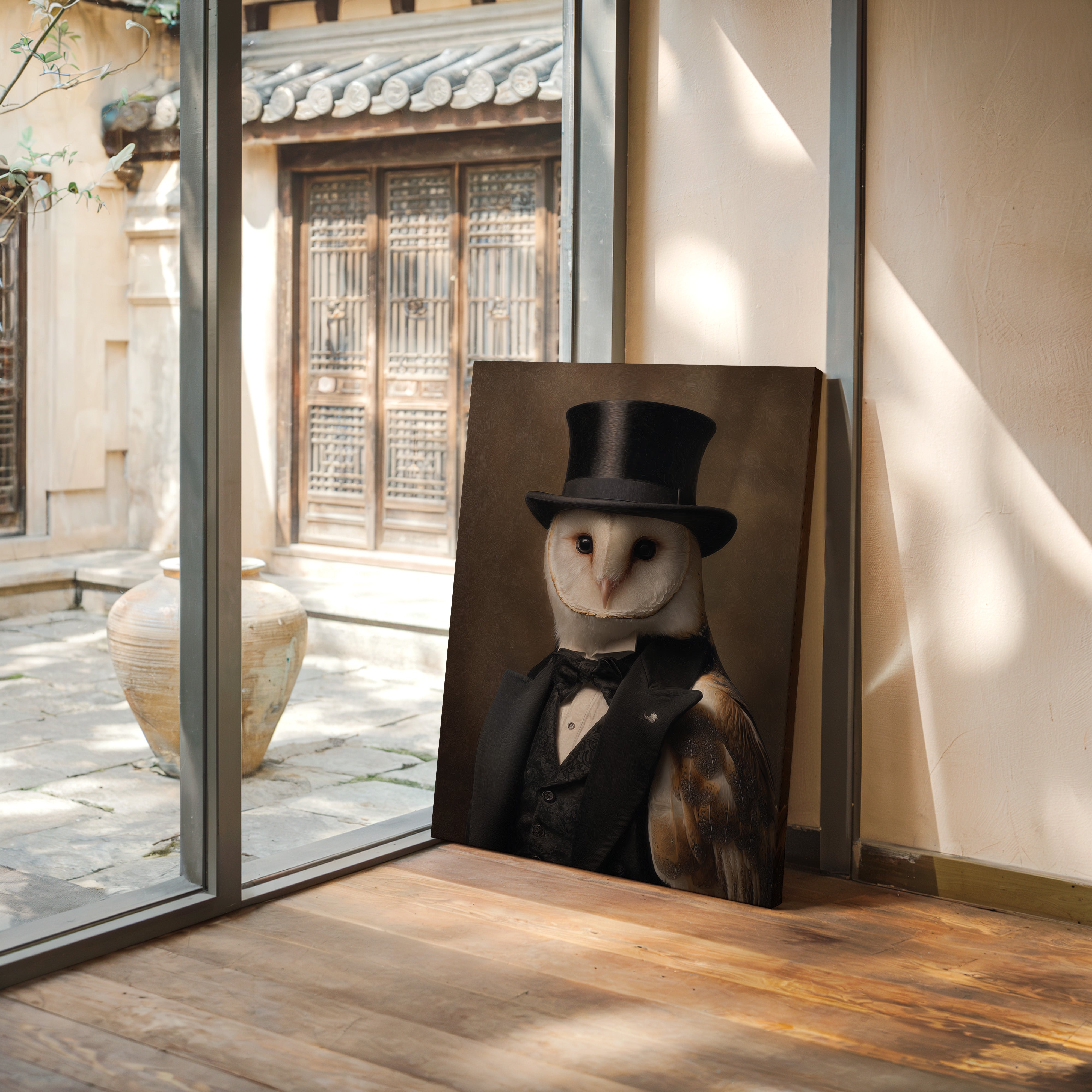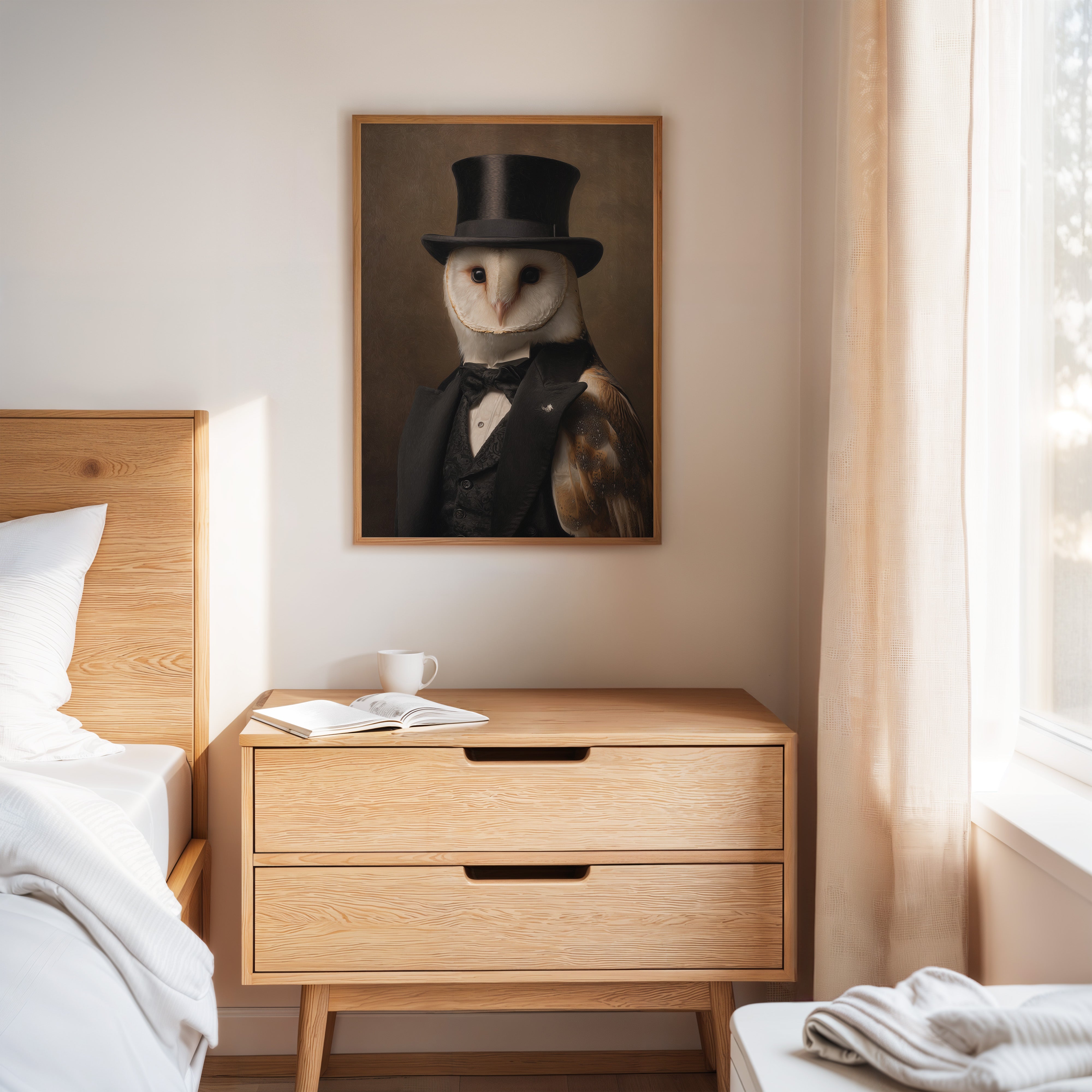 In a quiet glade, an owl dons a classic ensemble, merging elegance with nature's grace. This piece embodies the charm of artisanal craftsmanship, inviting a whimsical yet refined atmosphere. With intricate details of feathers and fabric, the contrast between the wild and the sophisticated unfoldsa celebration of nature's beauty dressed in finery. Perfect for a study or library, this portrait adds a touch of elegance to any space, inspiring conversations and curiosity.