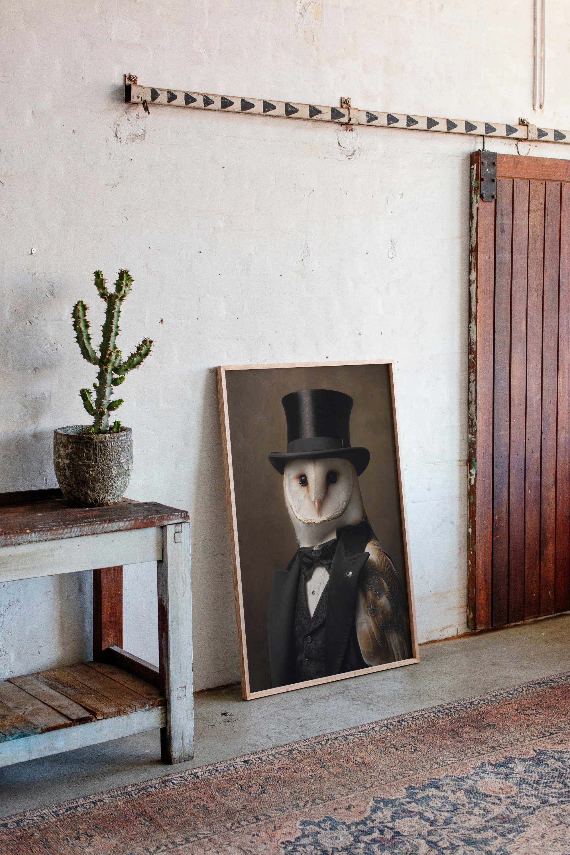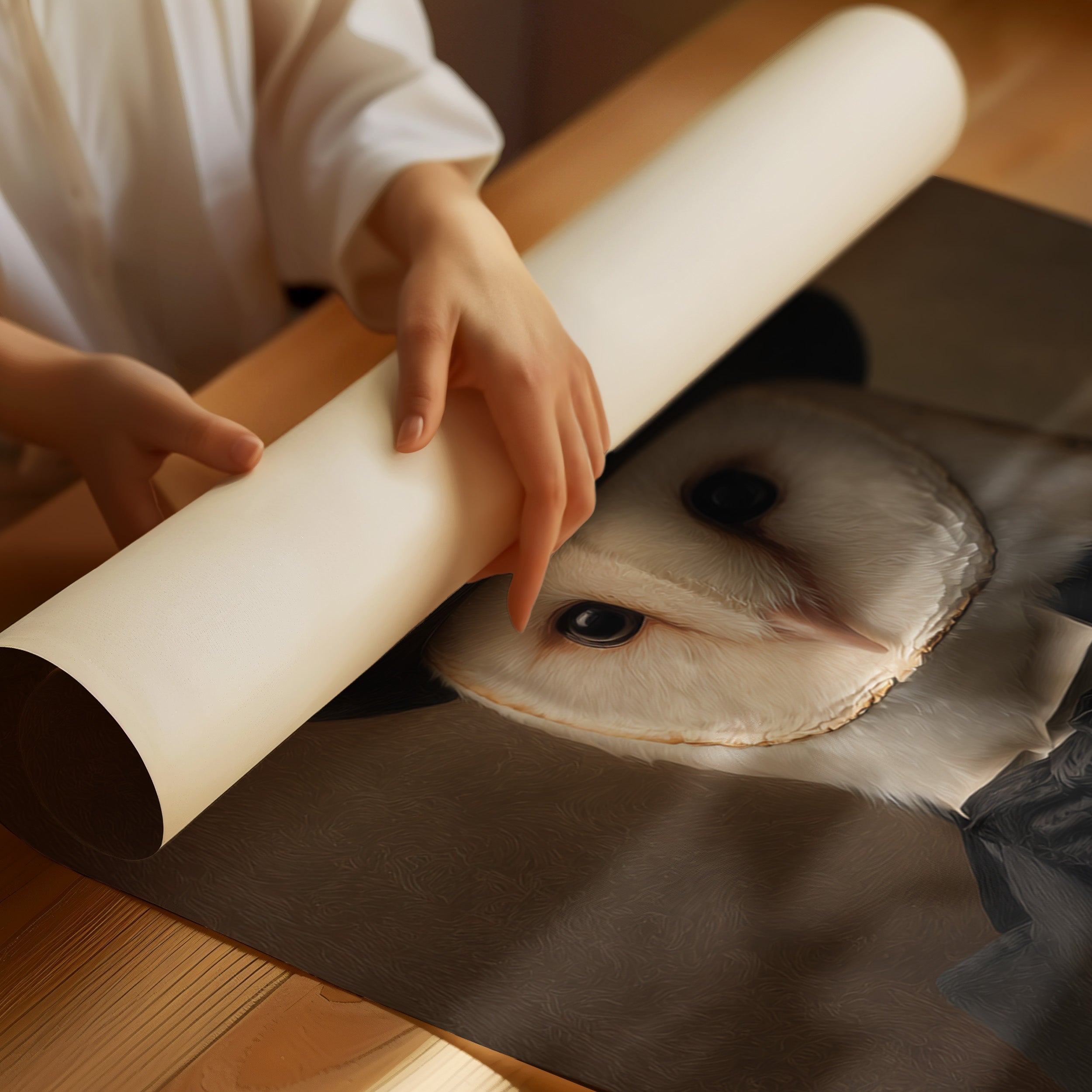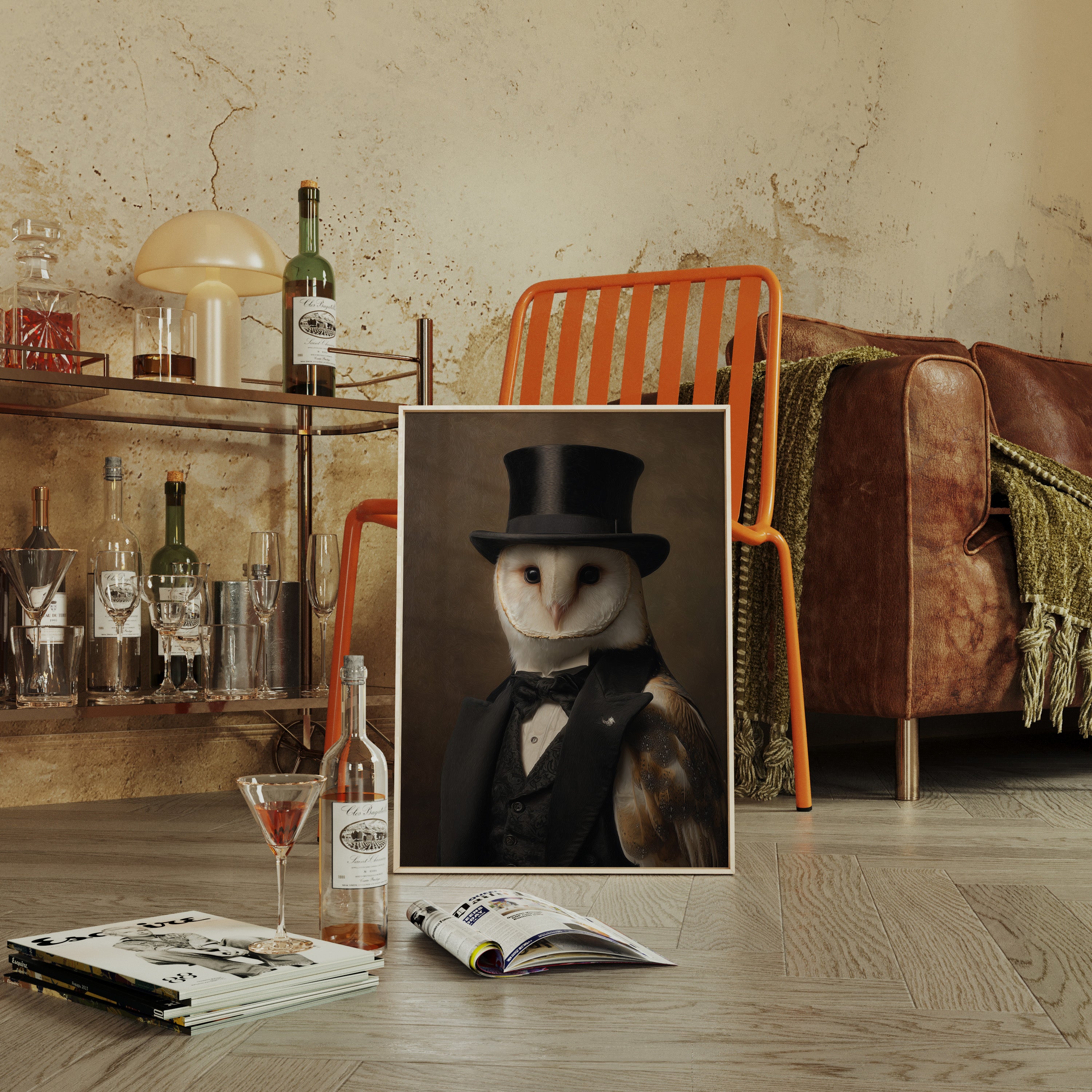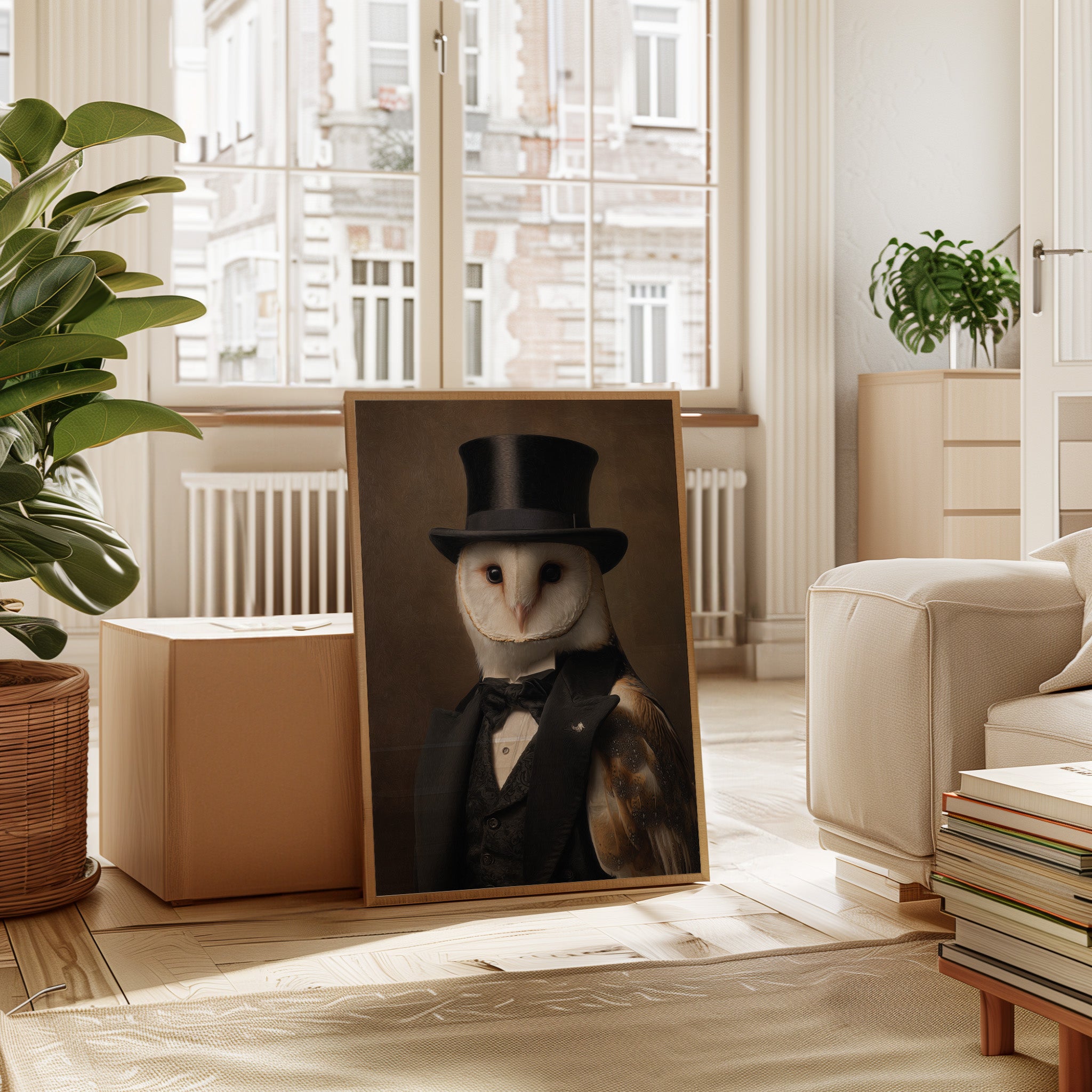 In a quiet glade, an owl dons a classic ensemble, merging elegance with nature's grace. This piece embodies the charm of artisanal craftsmanship, inviting a whimsical yet refined atmosphere. With intricate details of feathers and fabric, the contrast between the wild and the sophisticated unfoldsa celebration of nature's beauty dressed in finery. Perfect for a study or library, this portrait adds a touch of elegance to any space, inspiring conversations and curiosity.