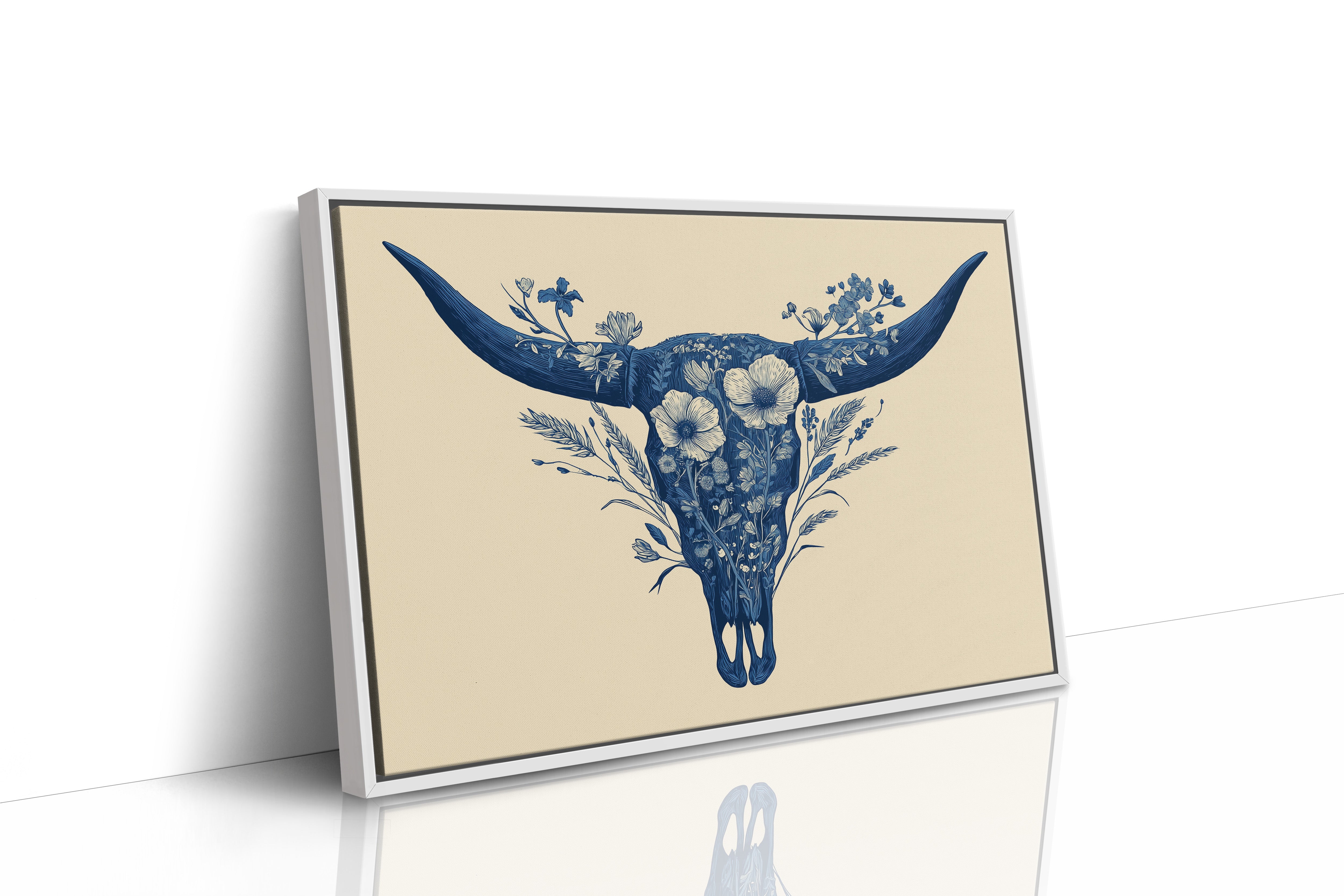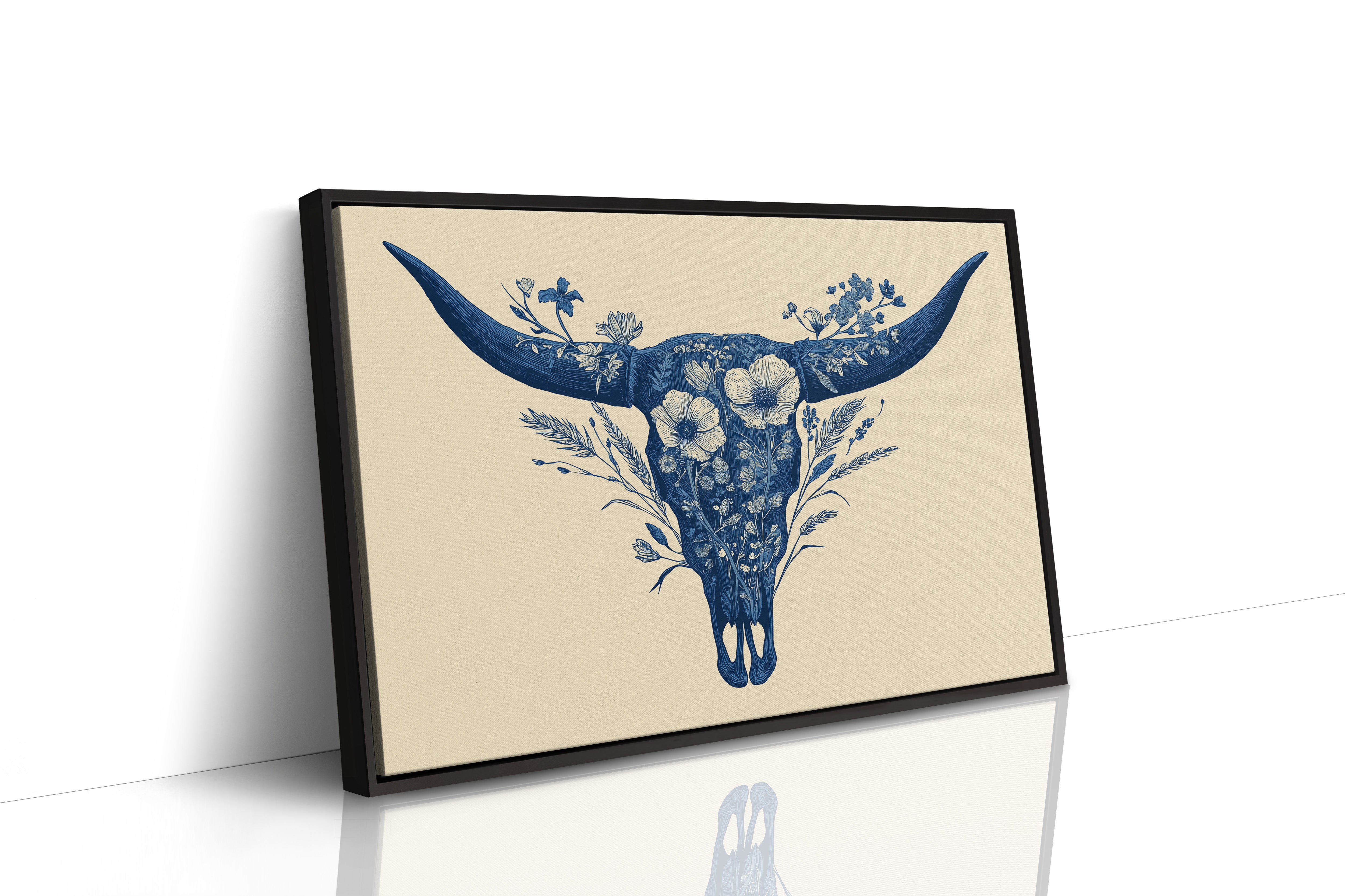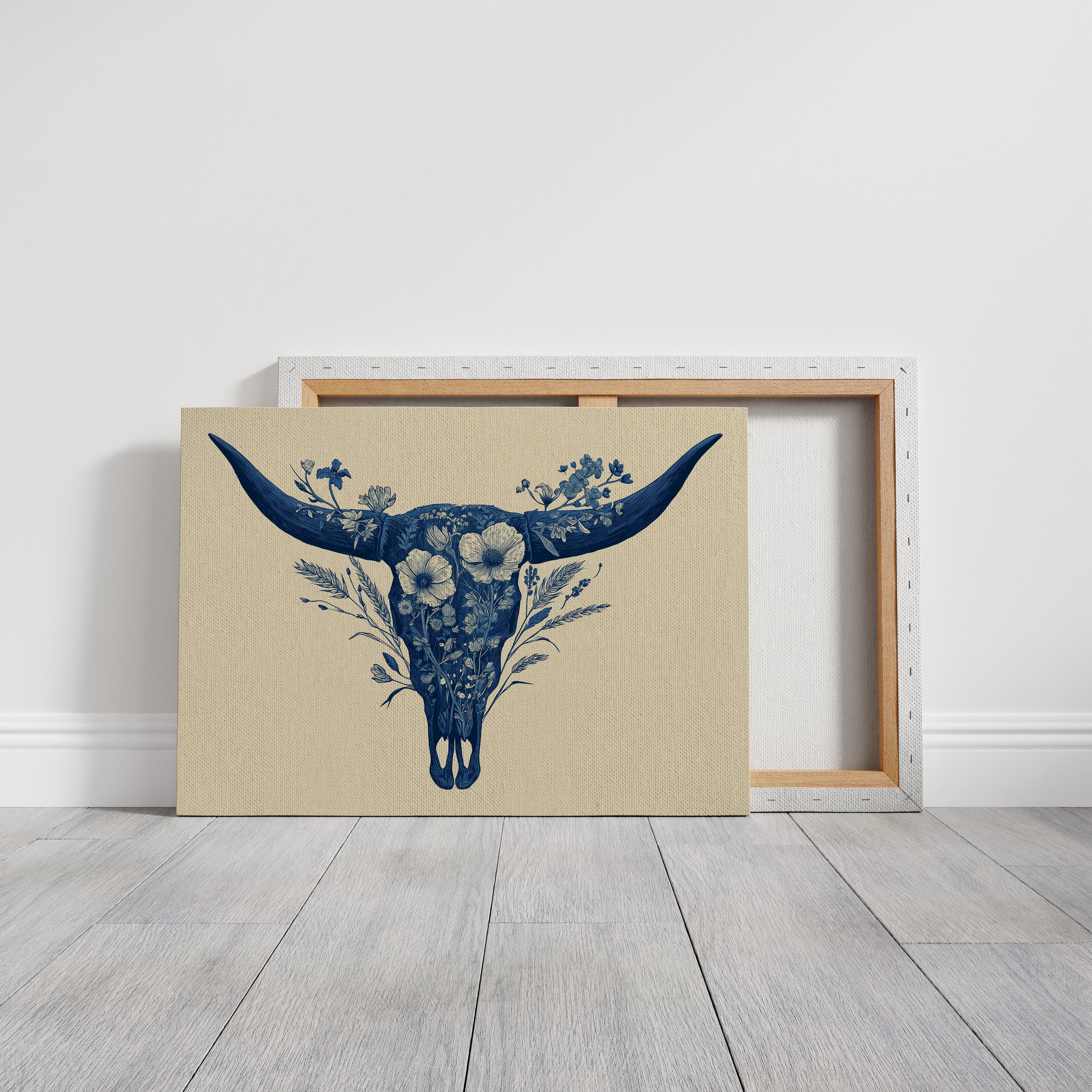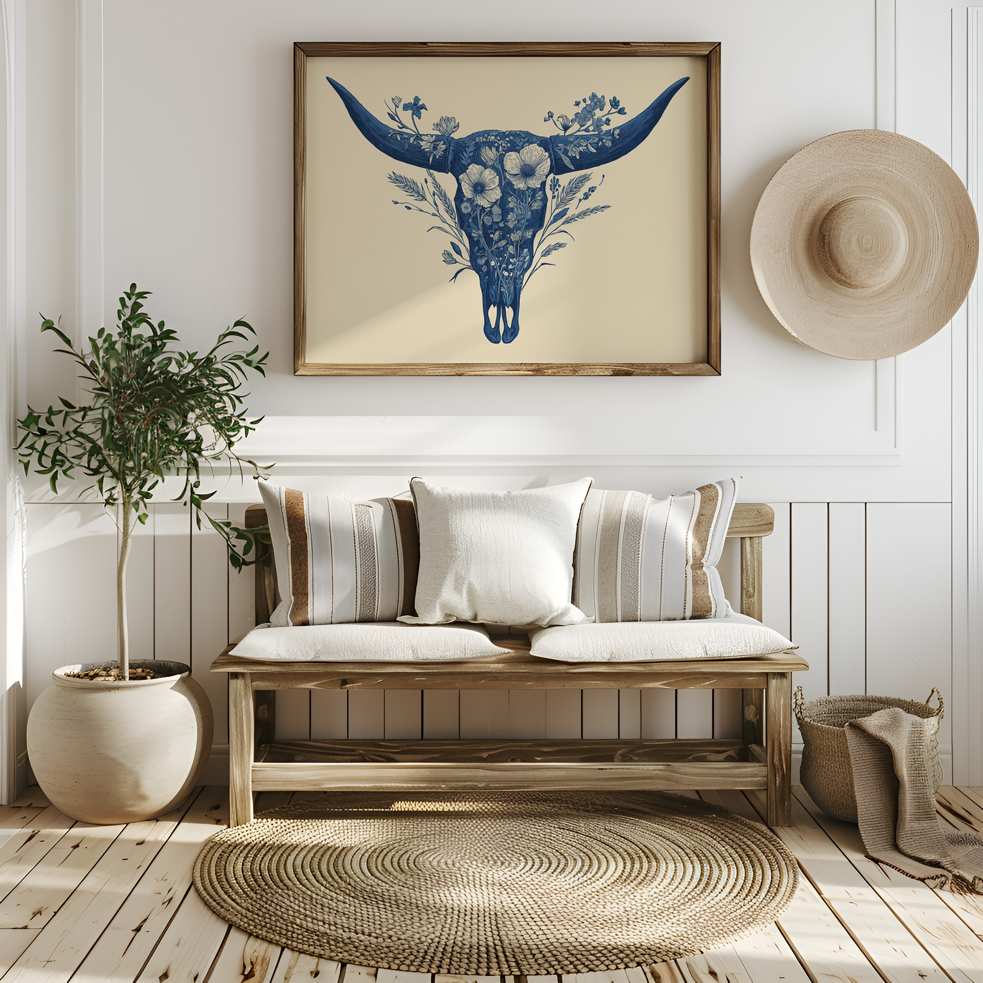 A delicate dance of navy blooms adorns the ancient symbol of western spirit, transforming a cattle skull into an ethereal garden. Intricate florals weave through the distinctive silhouette, creating a stunning juxtaposition of rugged strength and botanical grace. The monochromatic indigo palette against warm cream brings a contemporary sophistication to southwestern imagery. Perfect for modern ranch homes, bohemian living spaces, or any room seeking to blend natural elements with artistic refinement.