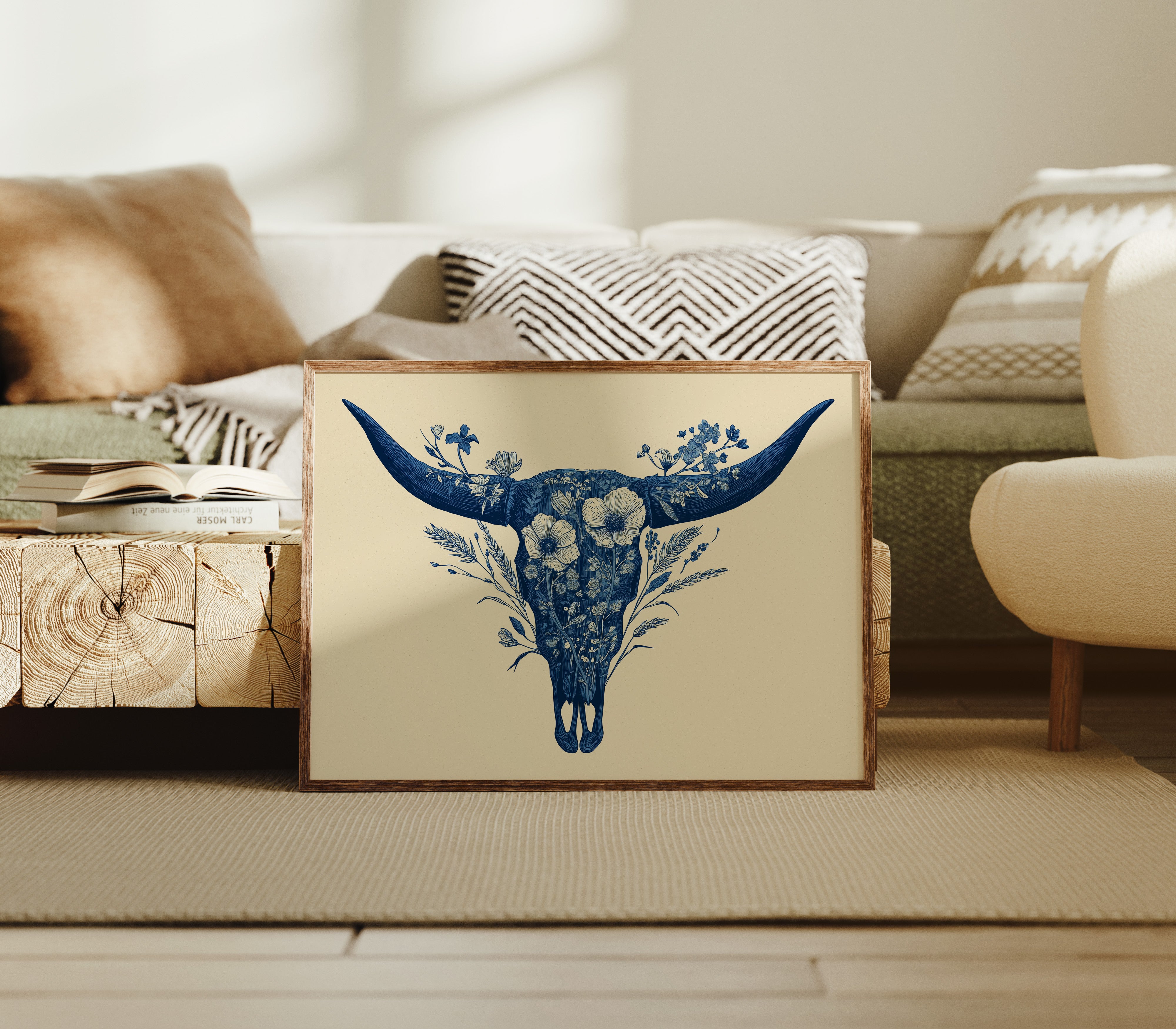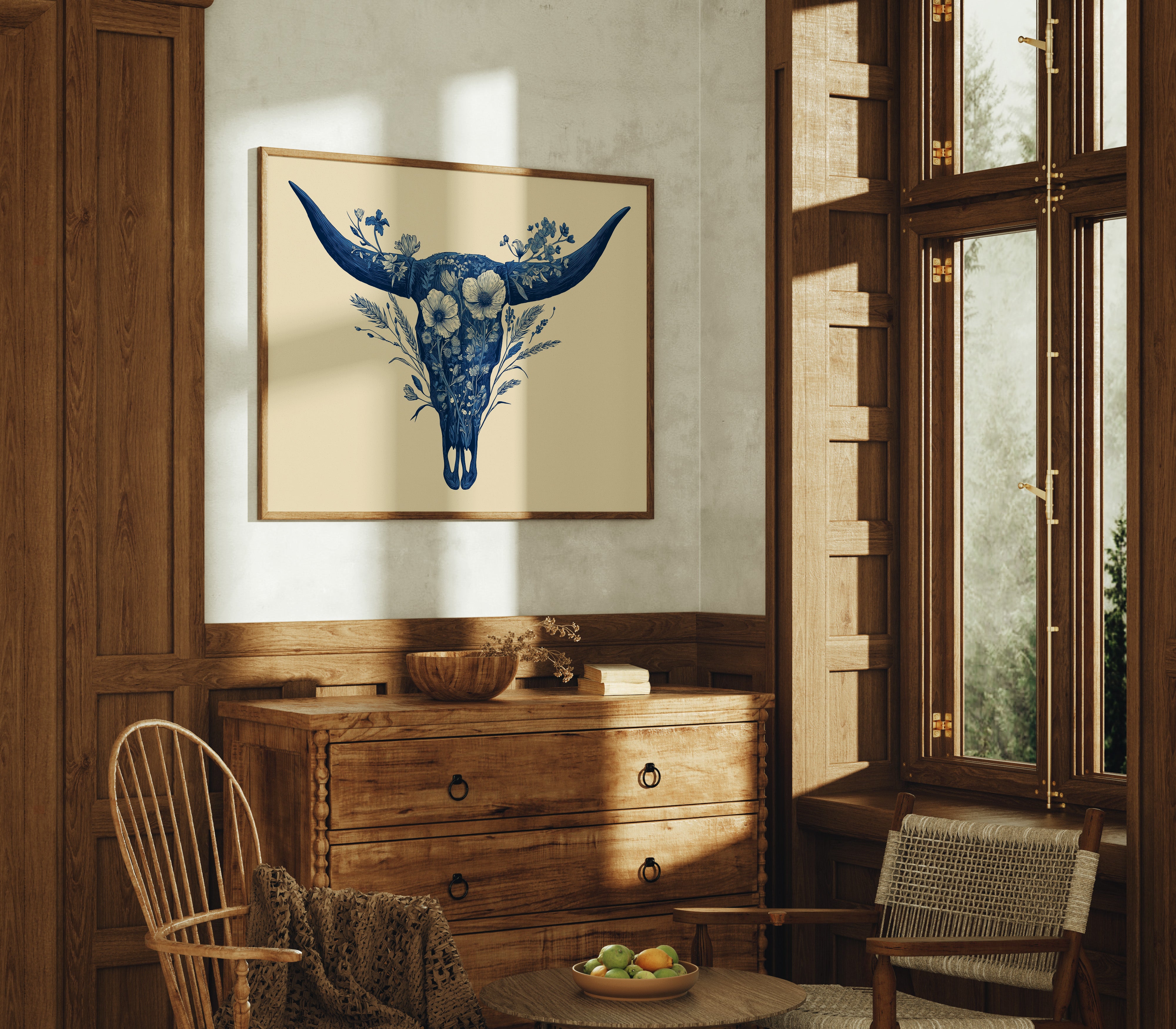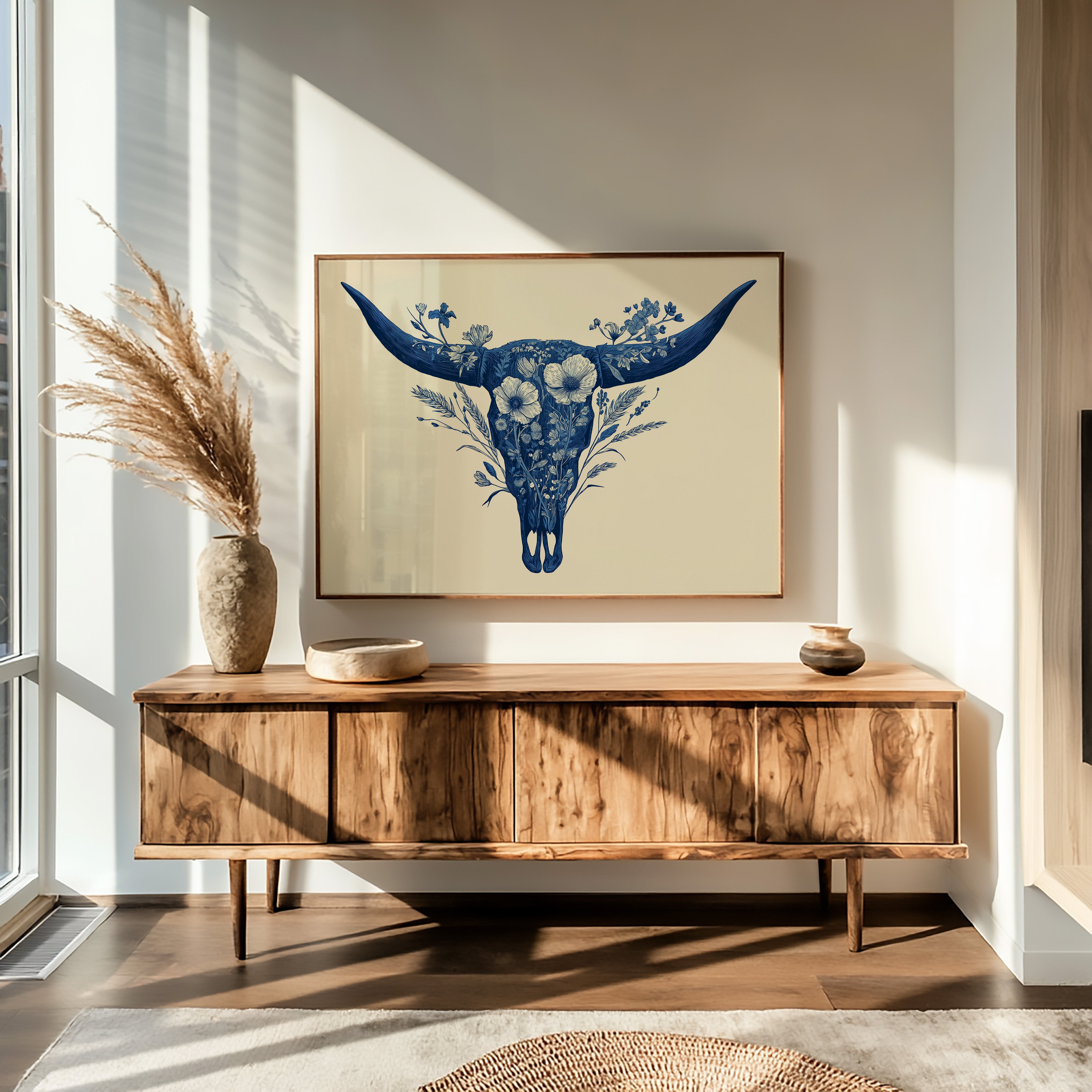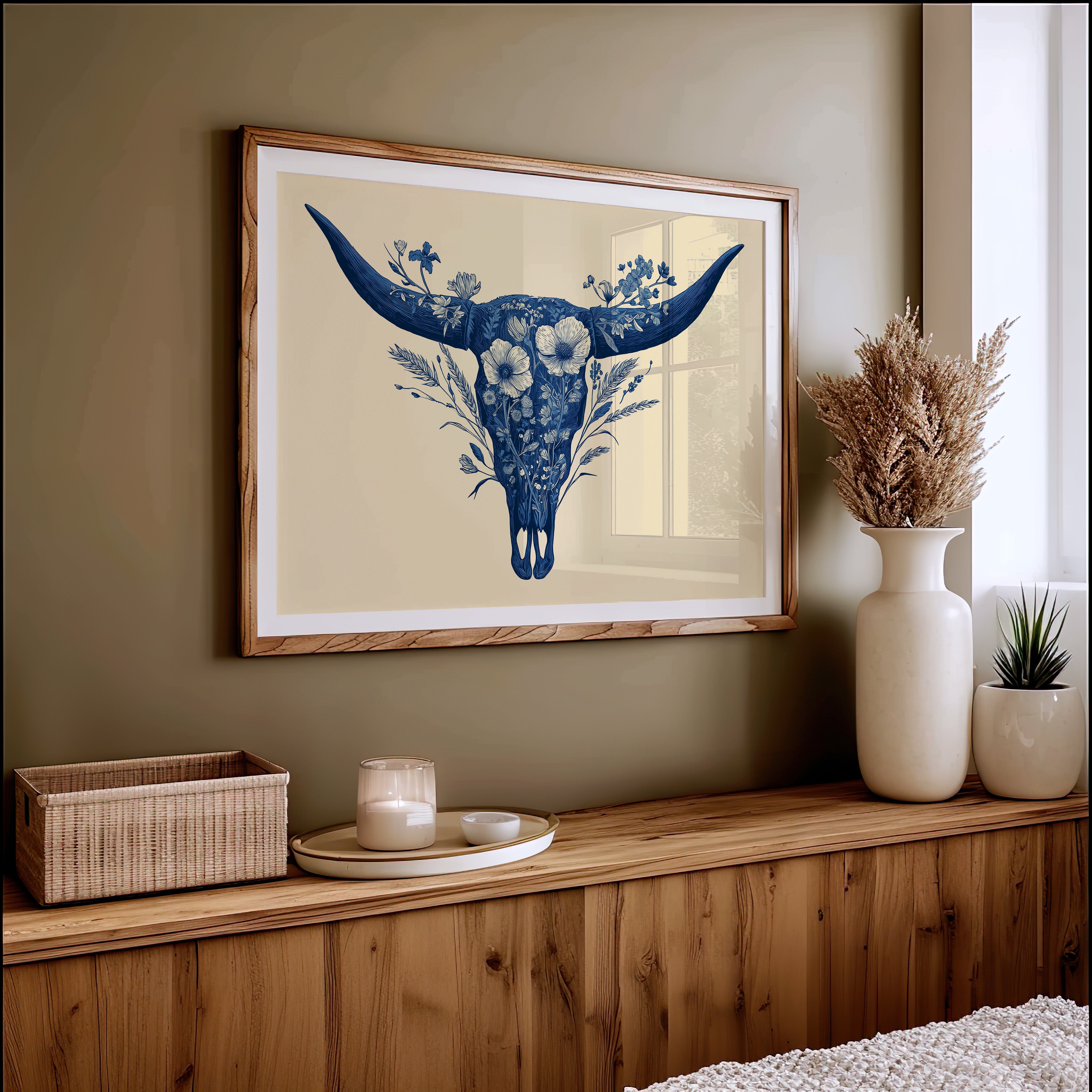 A delicate dance of navy blooms adorns the ancient symbol of western spirit, transforming a cattle skull into an ethereal garden. Intricate florals weave through the distinctive silhouette, creating a stunning juxtaposition of rugged strength and botanical grace. The monochromatic indigo palette against warm cream brings a contemporary sophistication to southwestern imagery. Perfect for modern ranch homes, bohemian living spaces, or any room seeking to blend natural elements with artistic refinement.