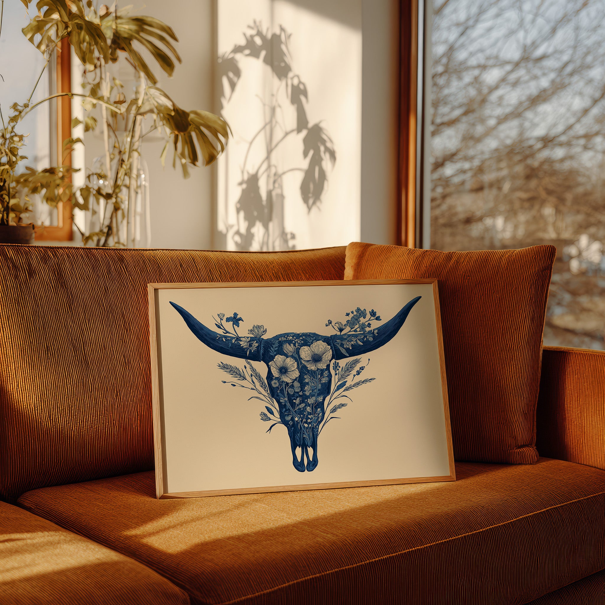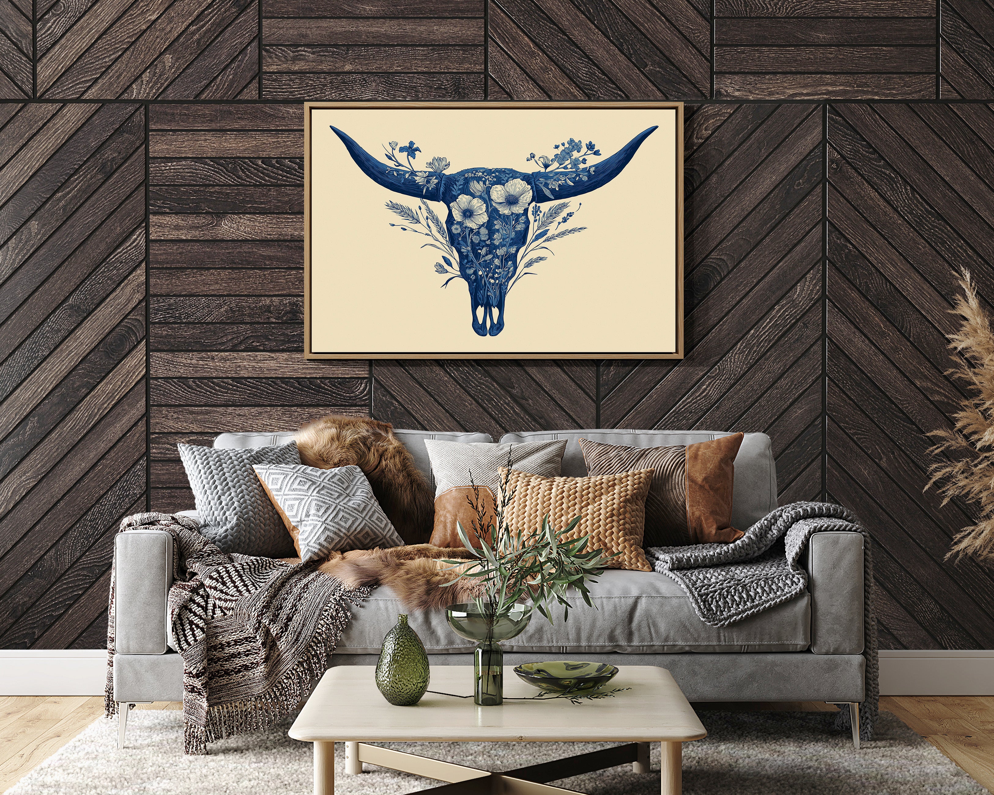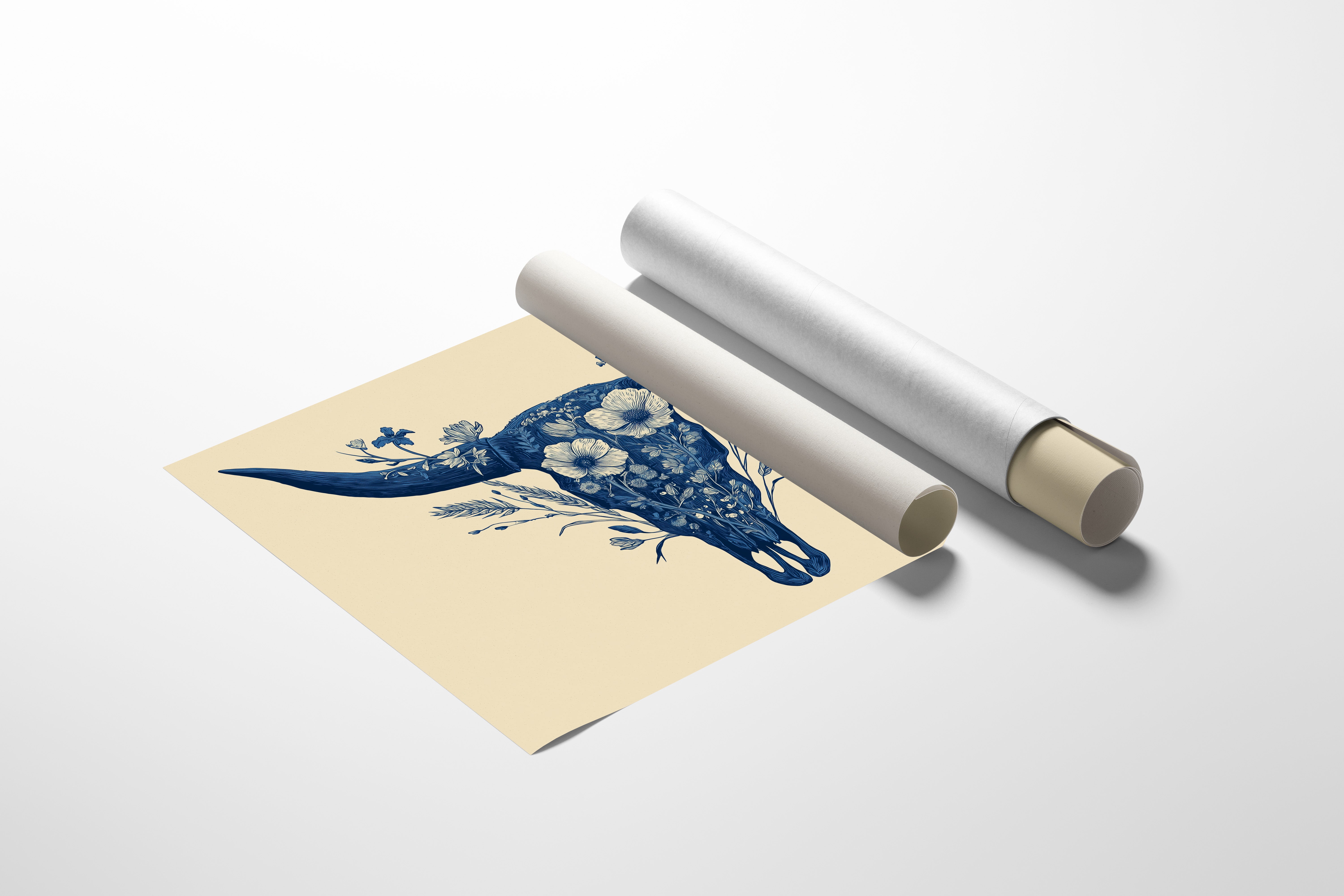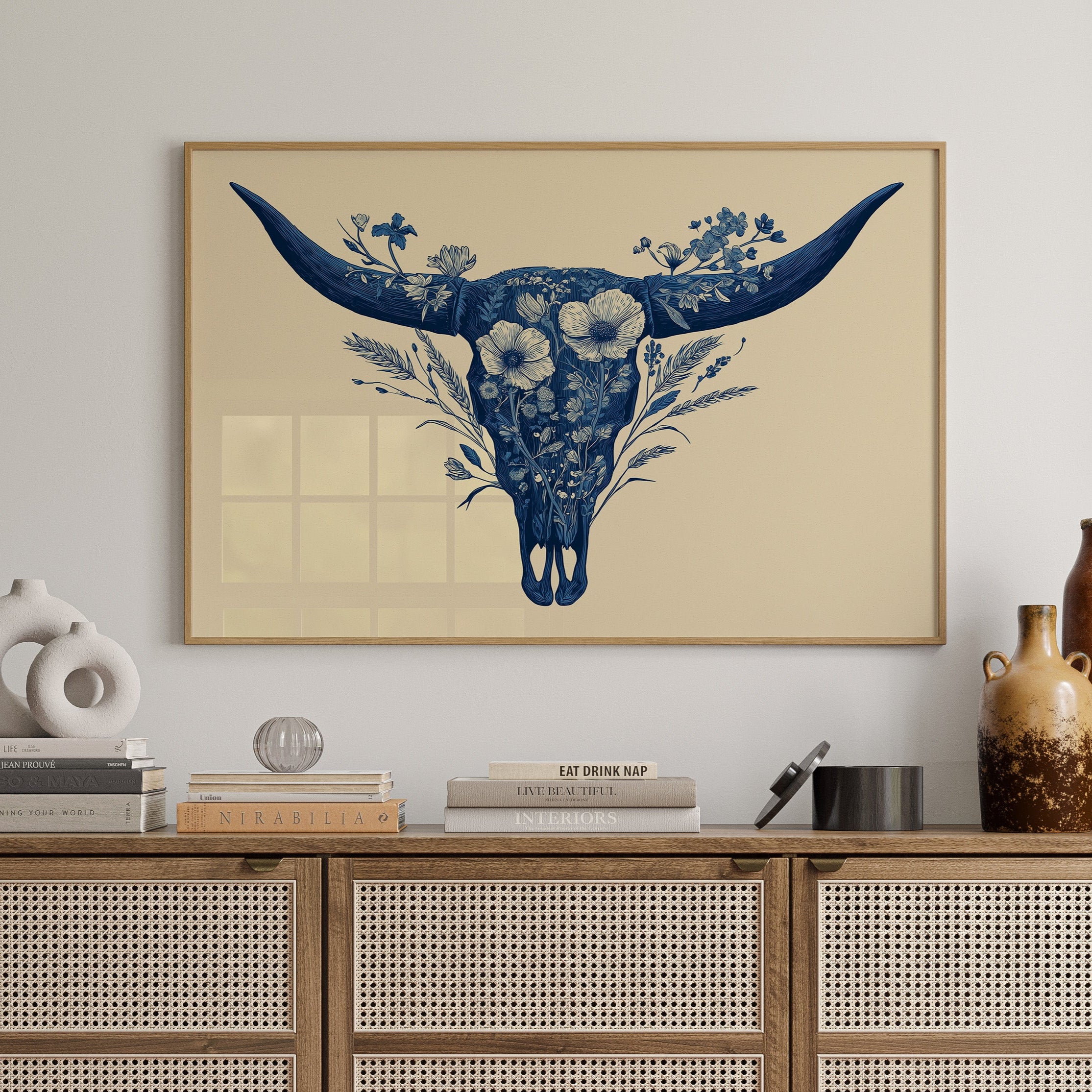 A delicate dance of navy blooms adorns the ancient symbol of western spirit, transforming a cattle skull into an ethereal garden. Intricate florals weave through the distinctive silhouette, creating a stunning juxtaposition of rugged strength and botanical grace. The monochromatic indigo palette against warm cream brings a contemporary sophistication to southwestern imagery. Perfect for modern ranch homes, bohemian living spaces, or any room seeking to blend natural elements with artistic refinement.