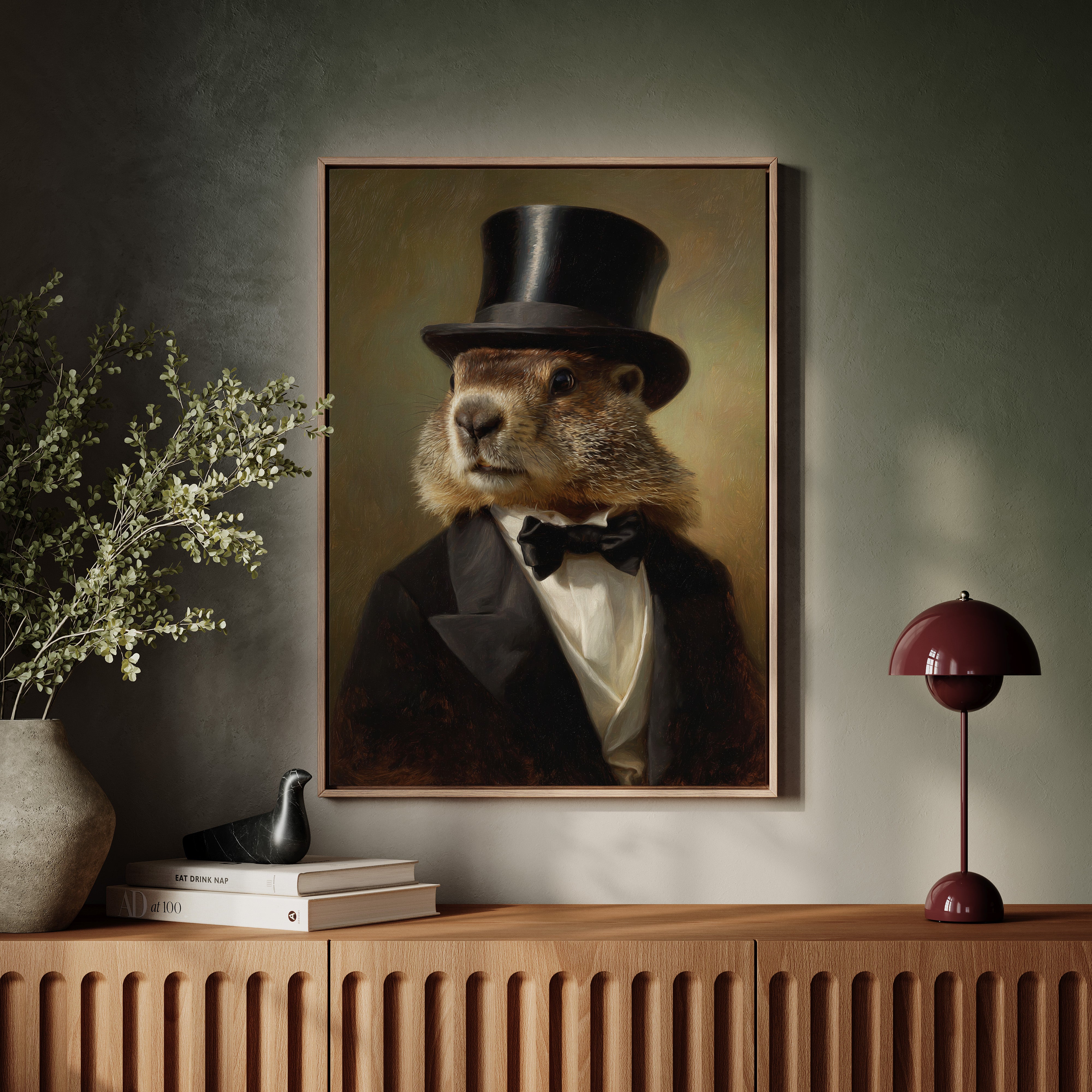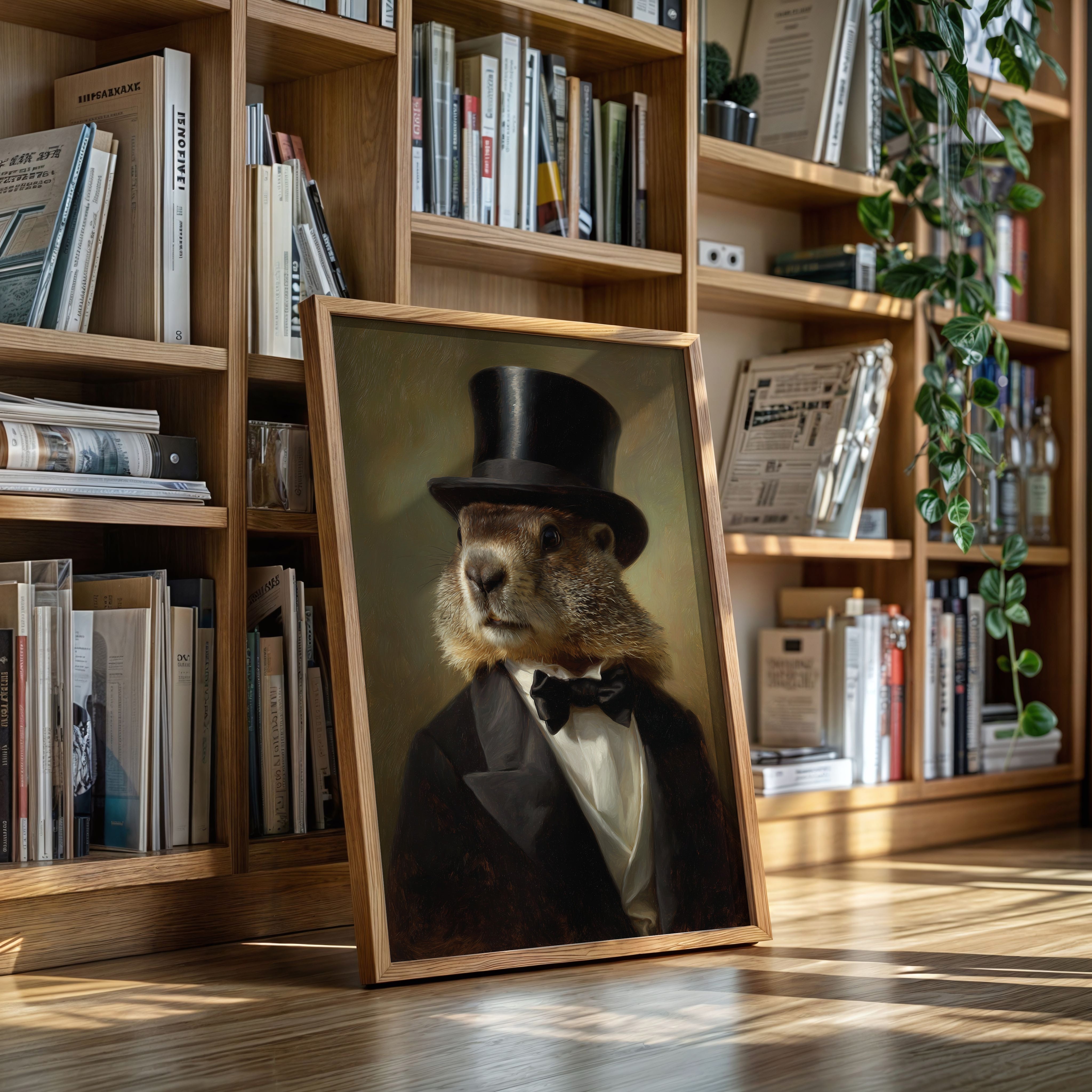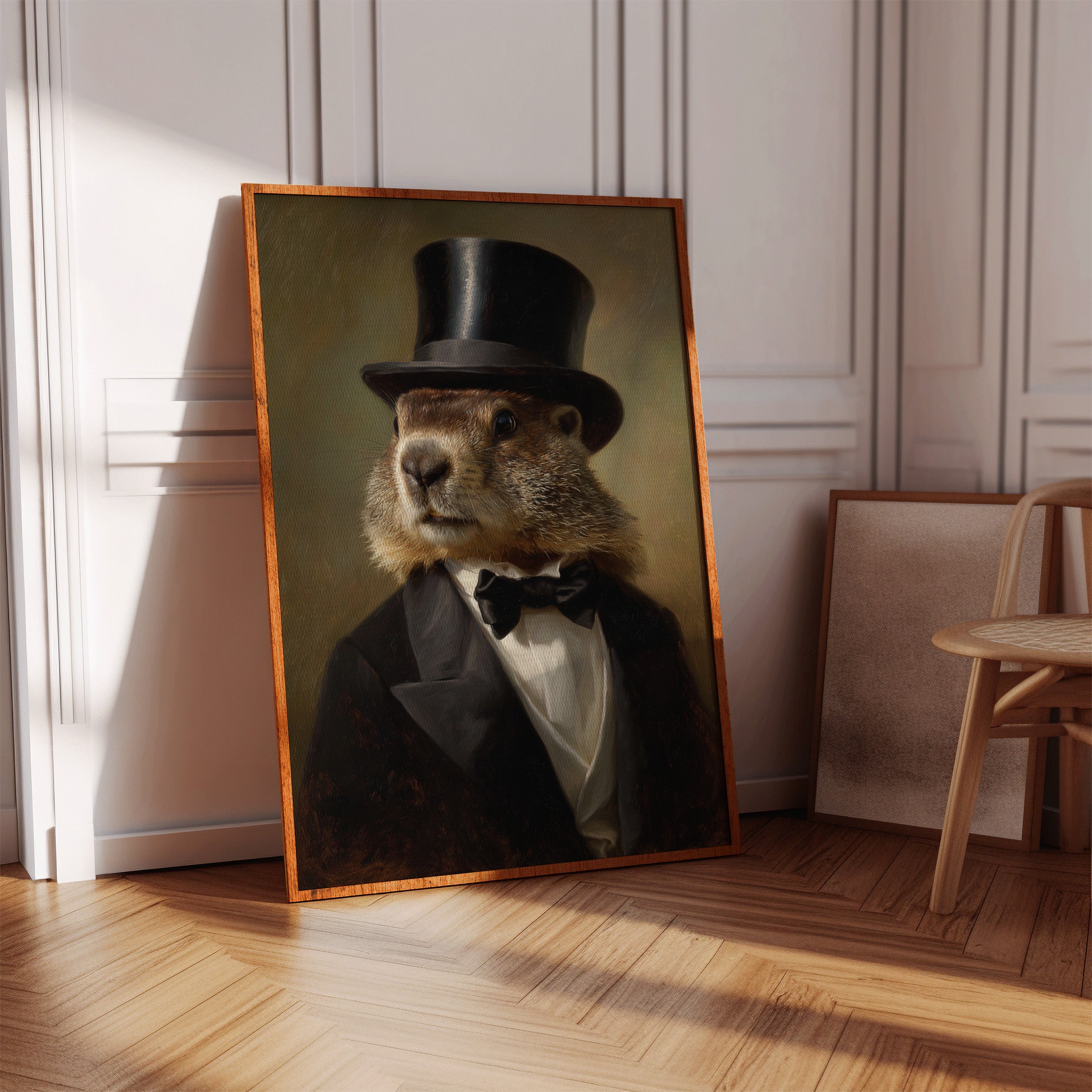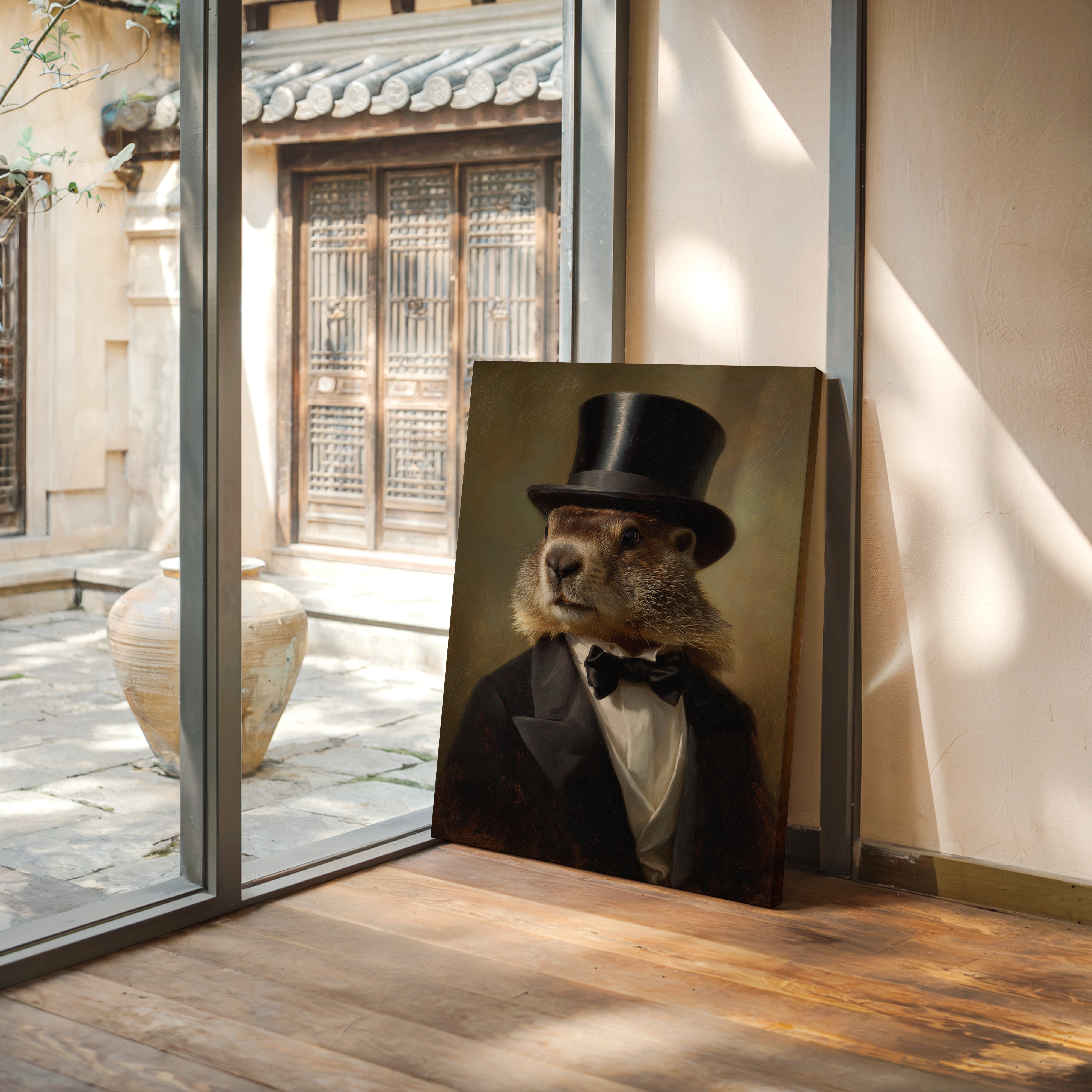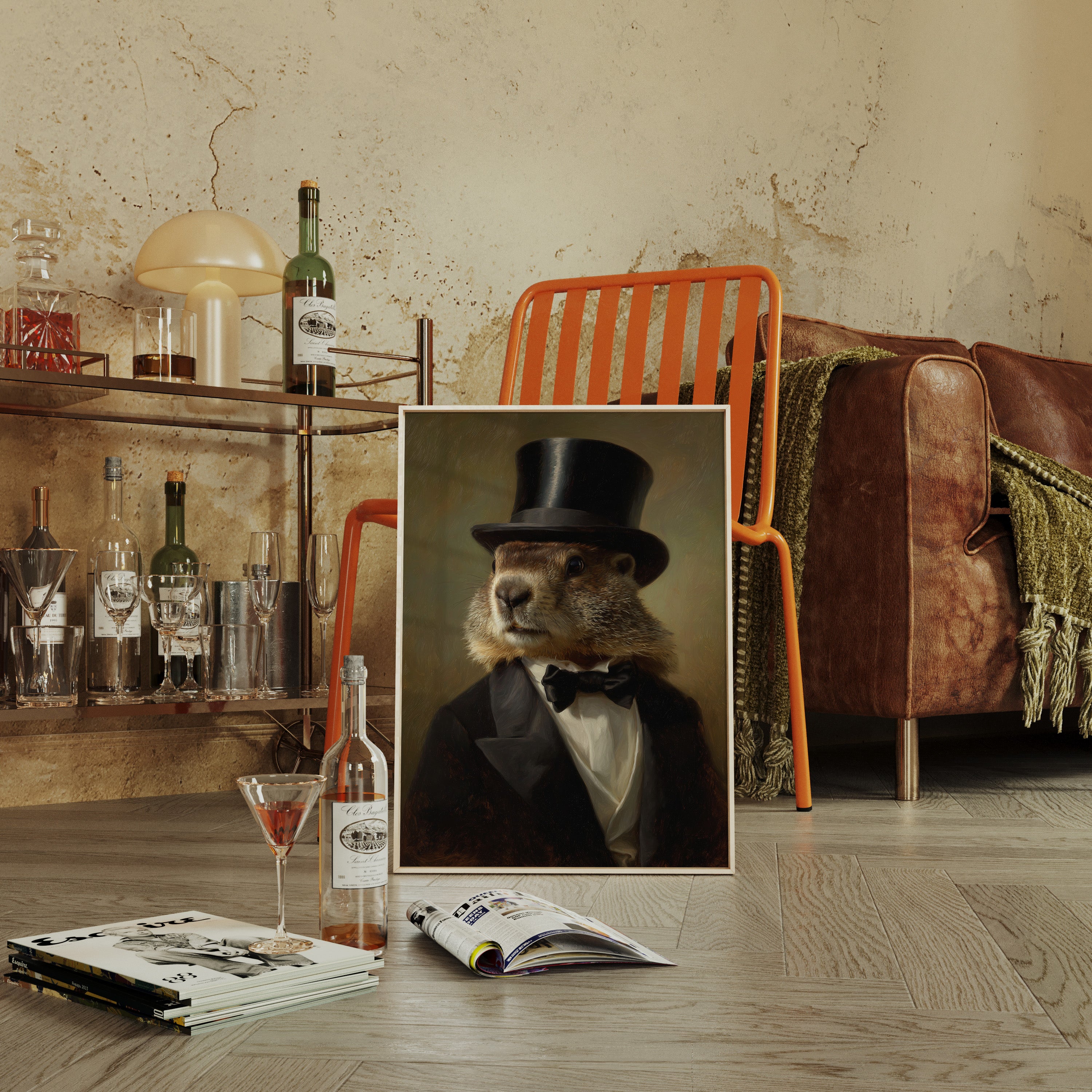 In a realm where whimsy meets elegance, a dapper creature stands poised, embodying the charm of a bygone era. This piece captures the essence of playful sophistication, perfect for the 'Artisanal' collection. Clad in a tailored tuxedo and top hat, the character exudes a delightful mix of curiosity and charm, inviting viewers into a narrative filled with unexpected grace. The rich textures and warm tones create an inviting atmosphere, making it an ideal statement in a study or a cozy reading nook.