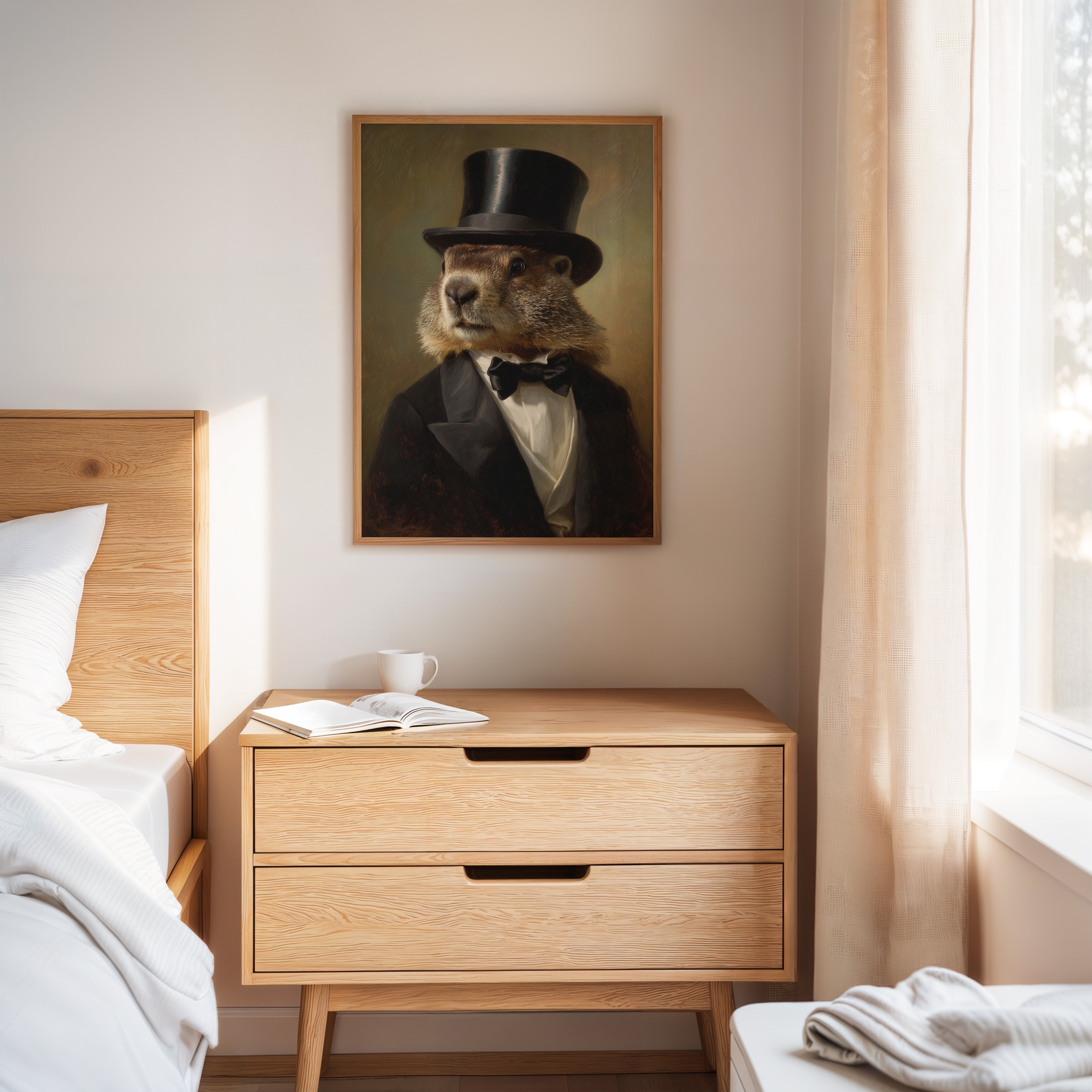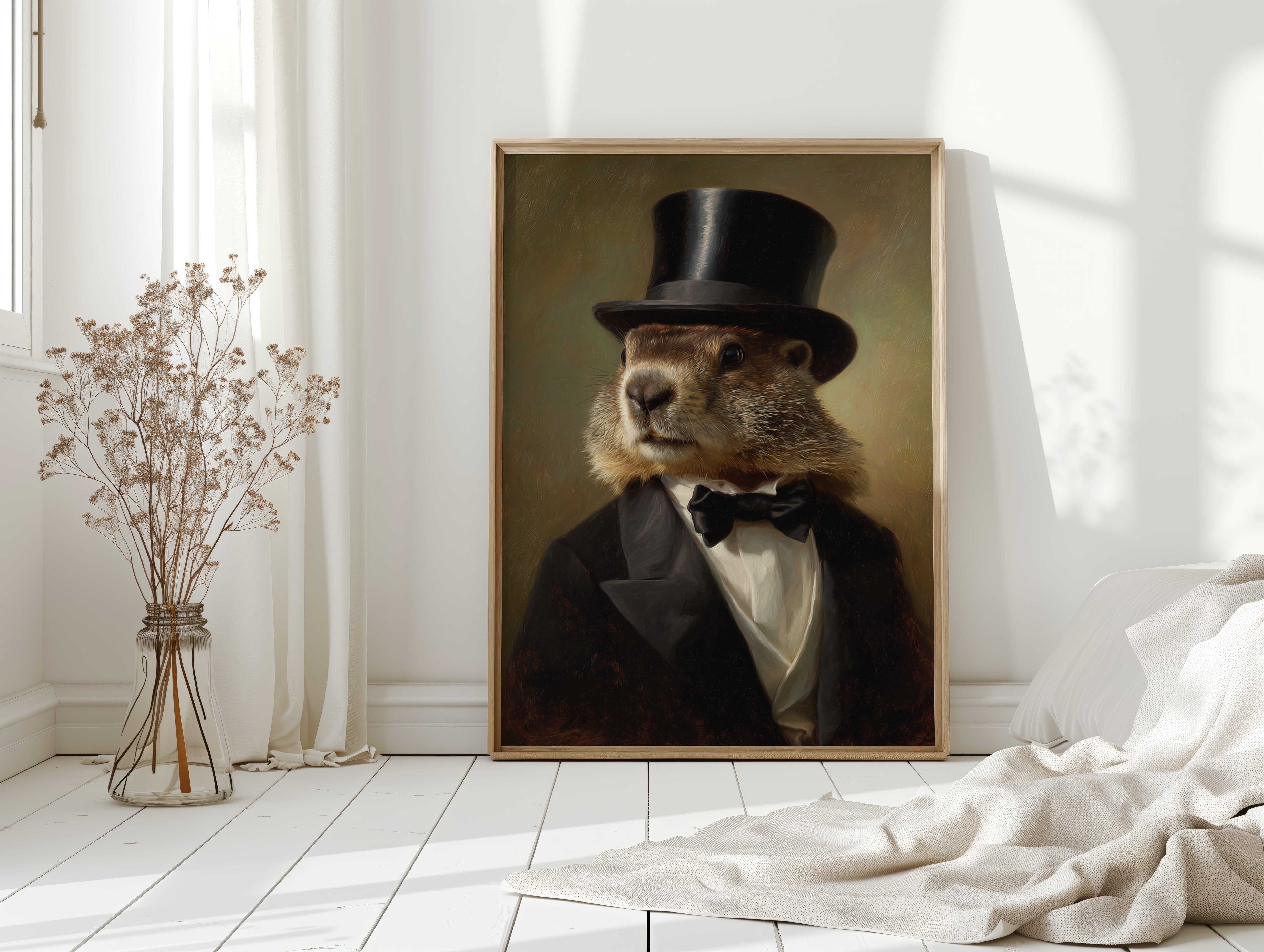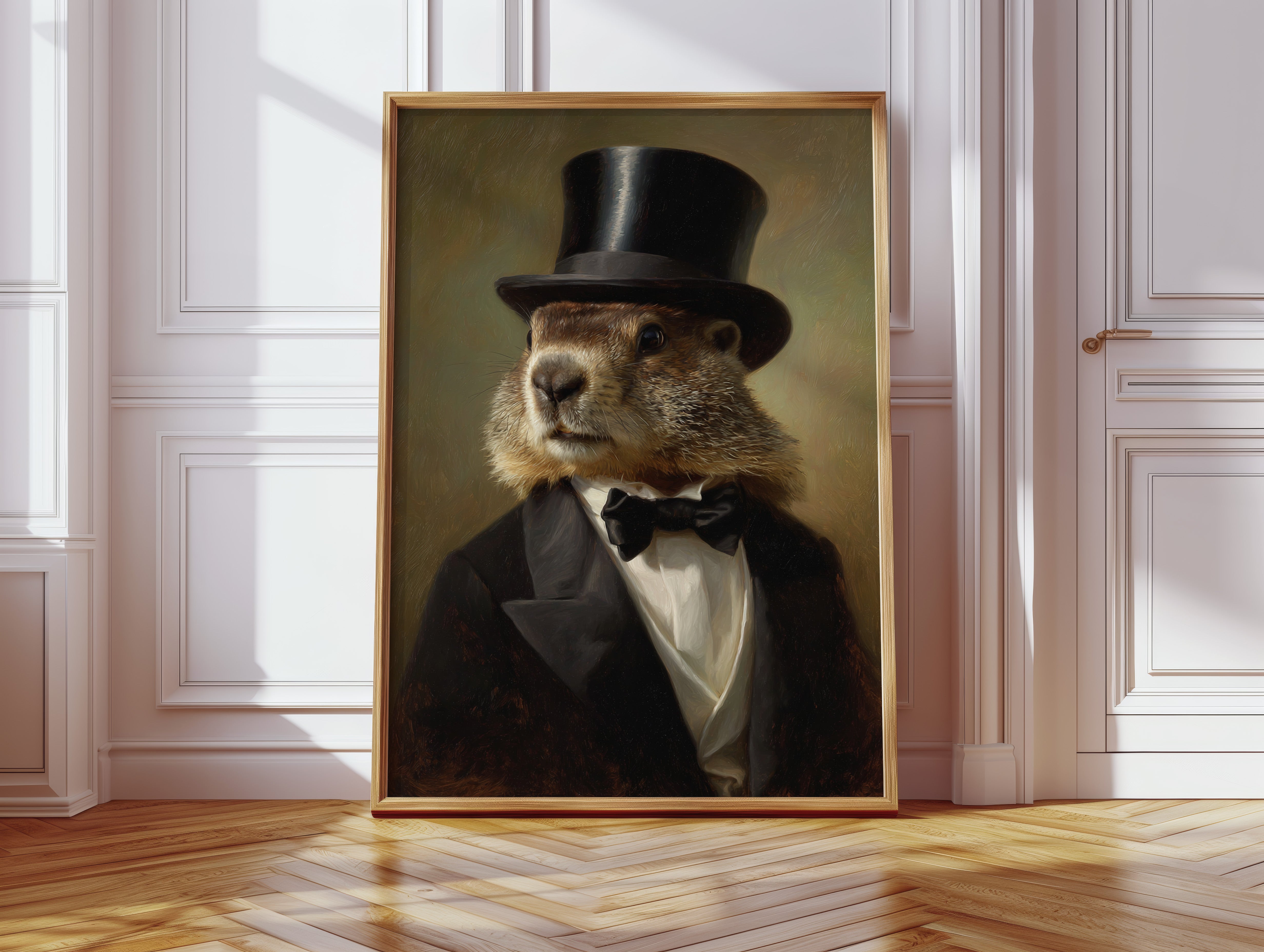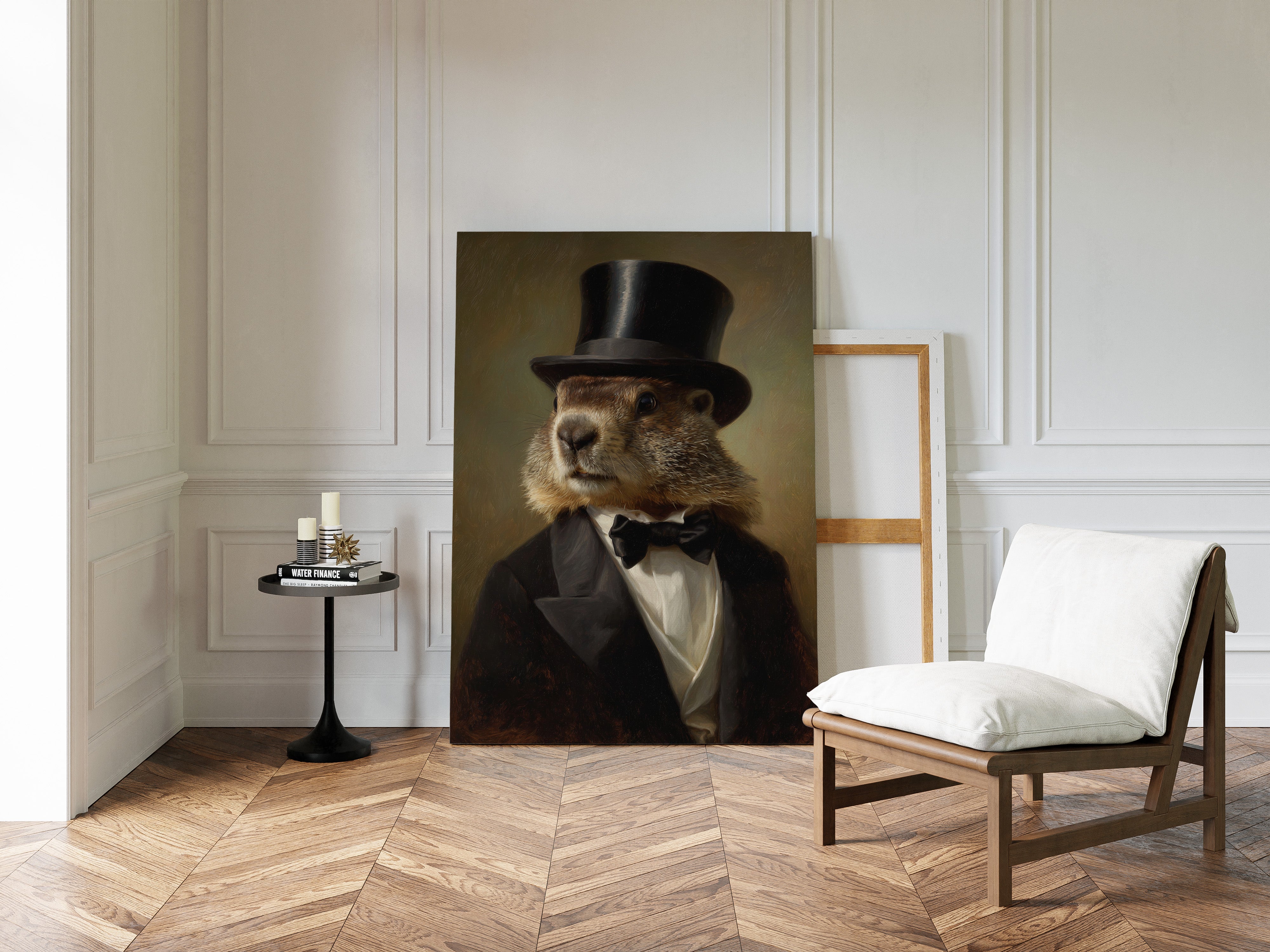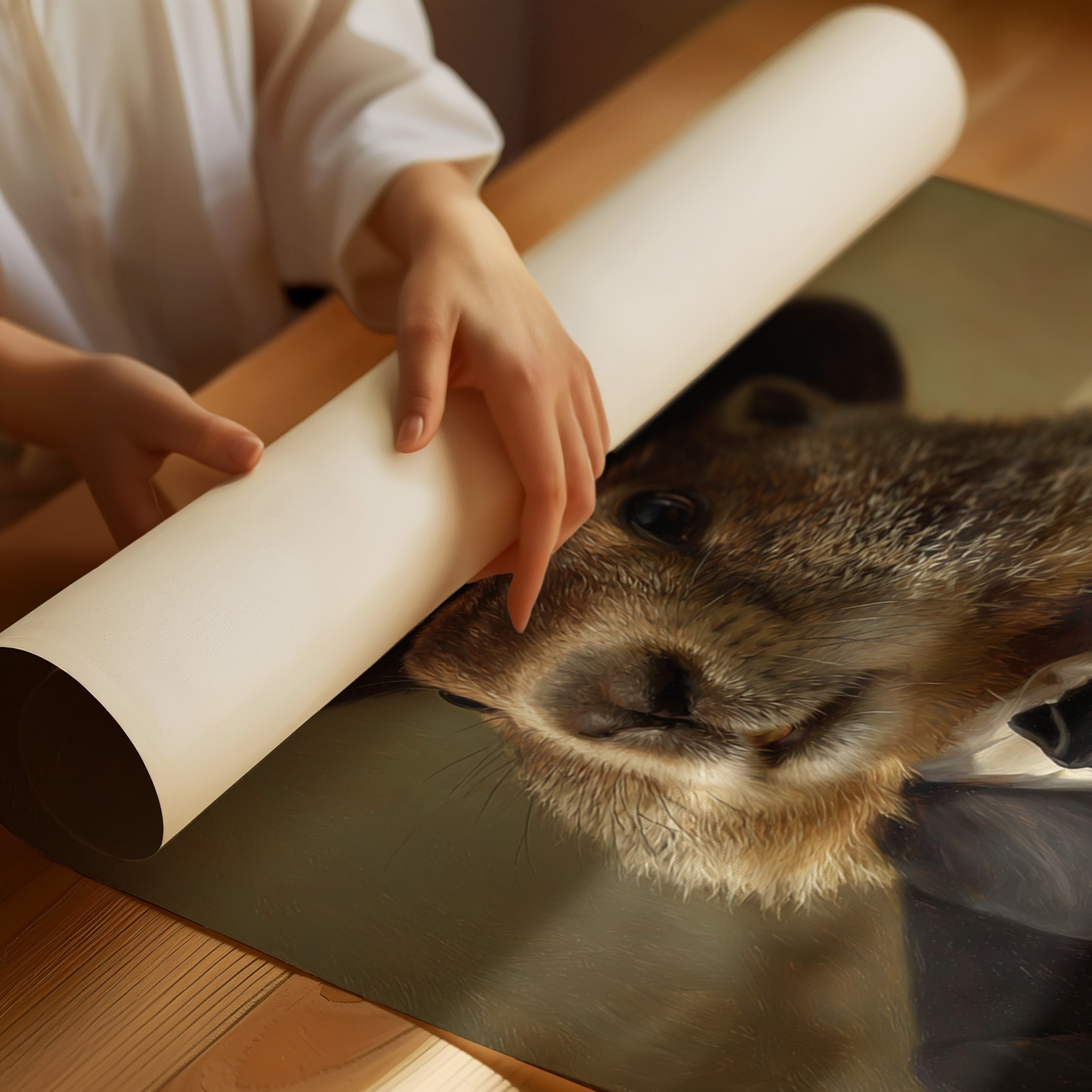 In a realm where whimsy meets elegance, a dapper creature stands poised, embodying the charm of a bygone era. This piece captures the essence of playful sophistication, perfect for the 'Artisanal' collection. Clad in a tailored tuxedo and top hat, the character exudes a delightful mix of curiosity and charm, inviting viewers into a narrative filled with unexpected grace. The rich textures and warm tones create an inviting atmosphere, making it an ideal statement in a study or a cozy reading nook.