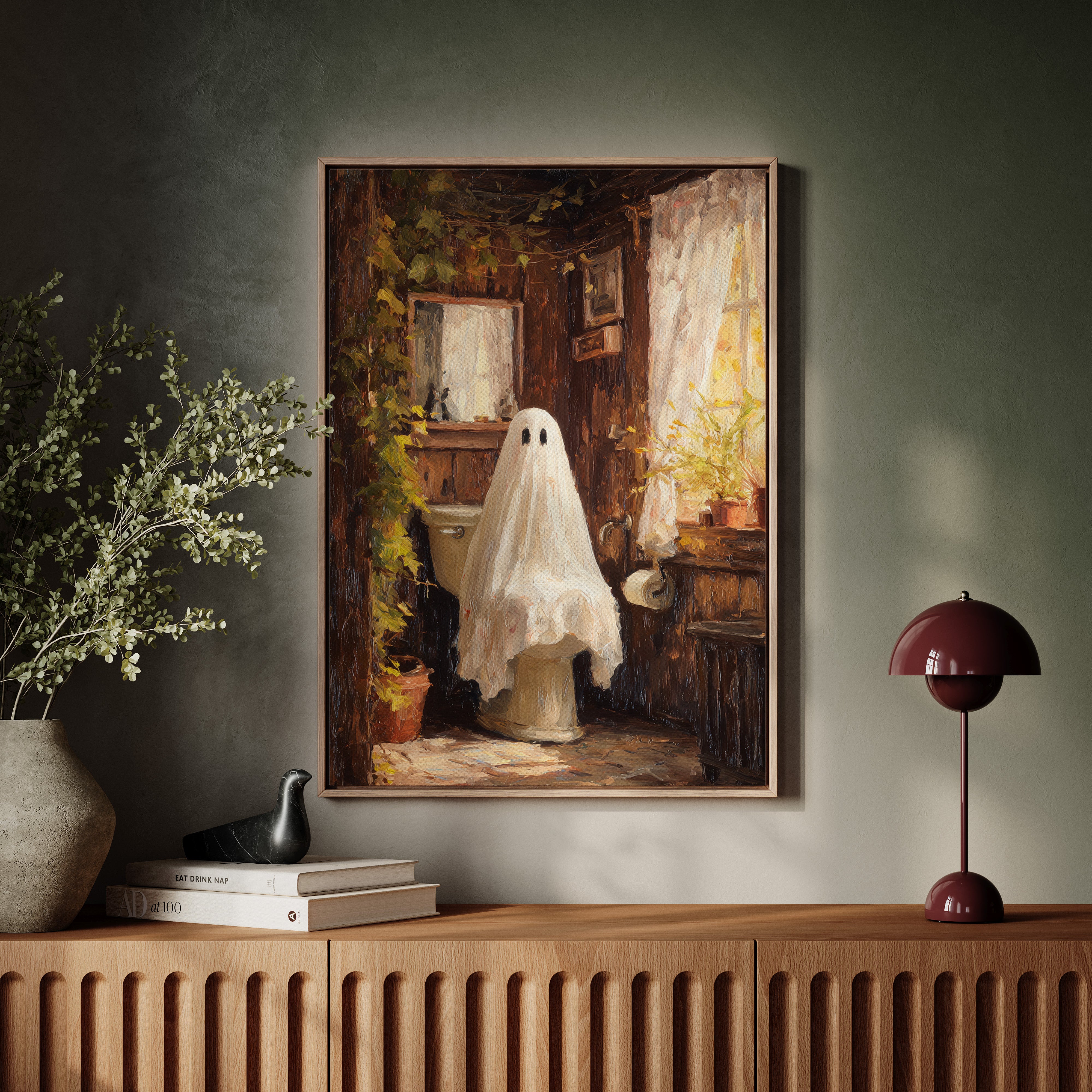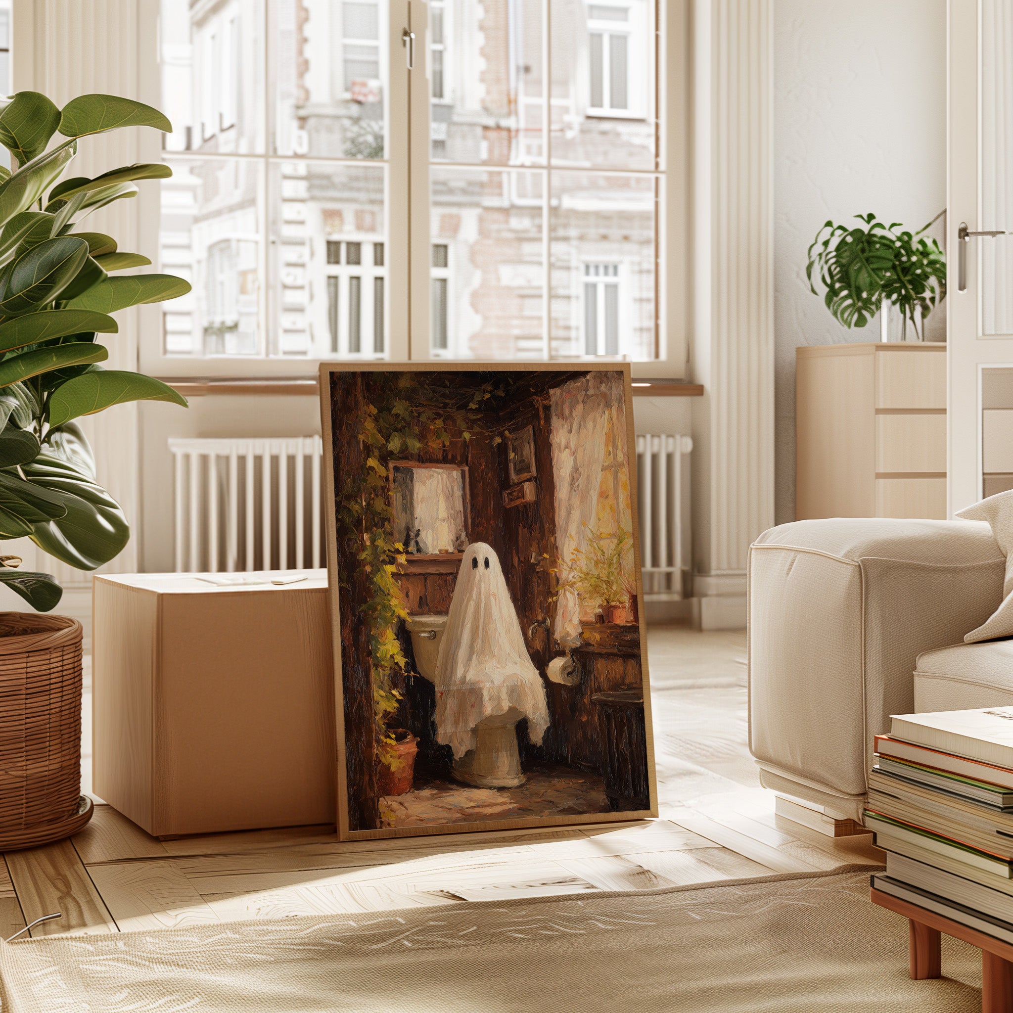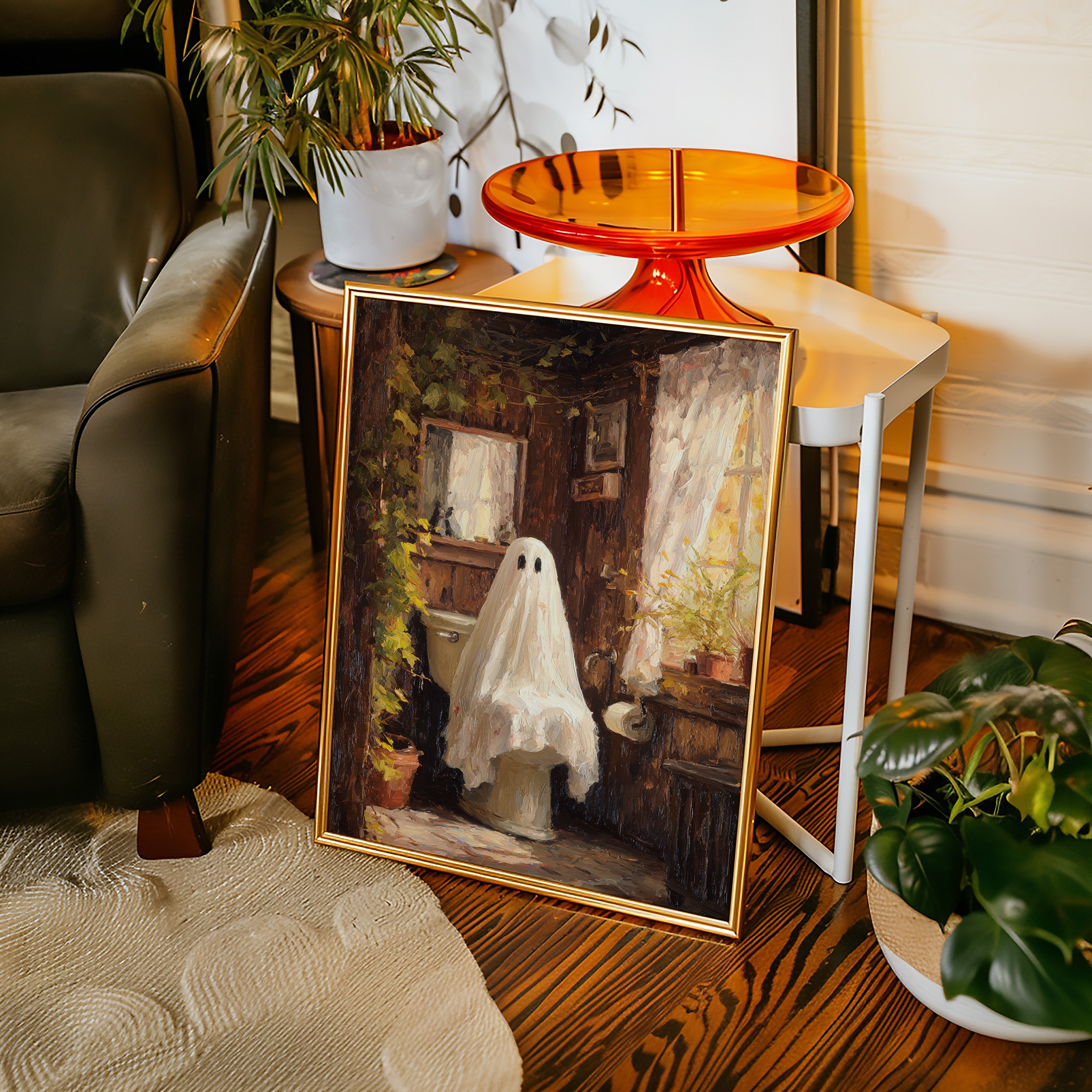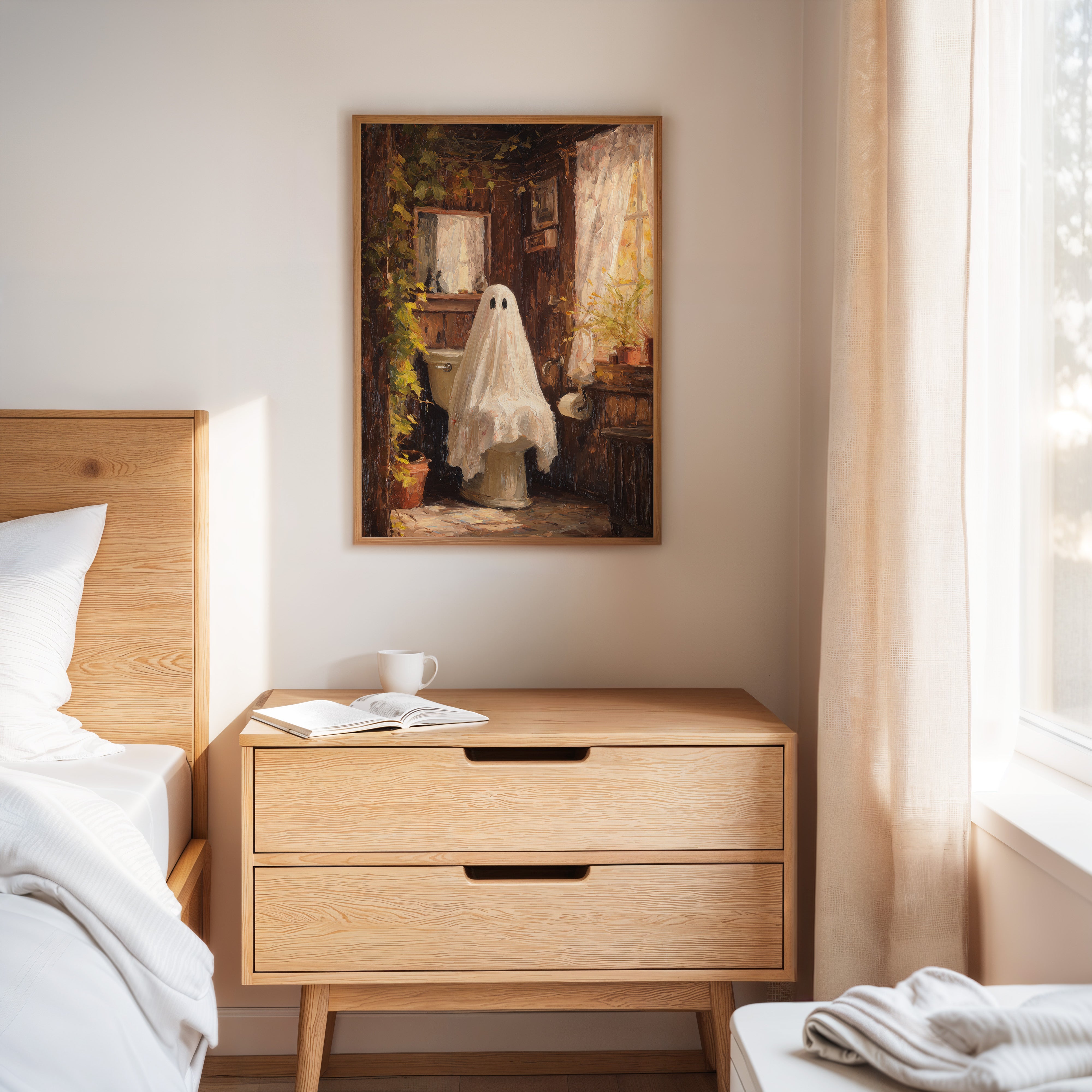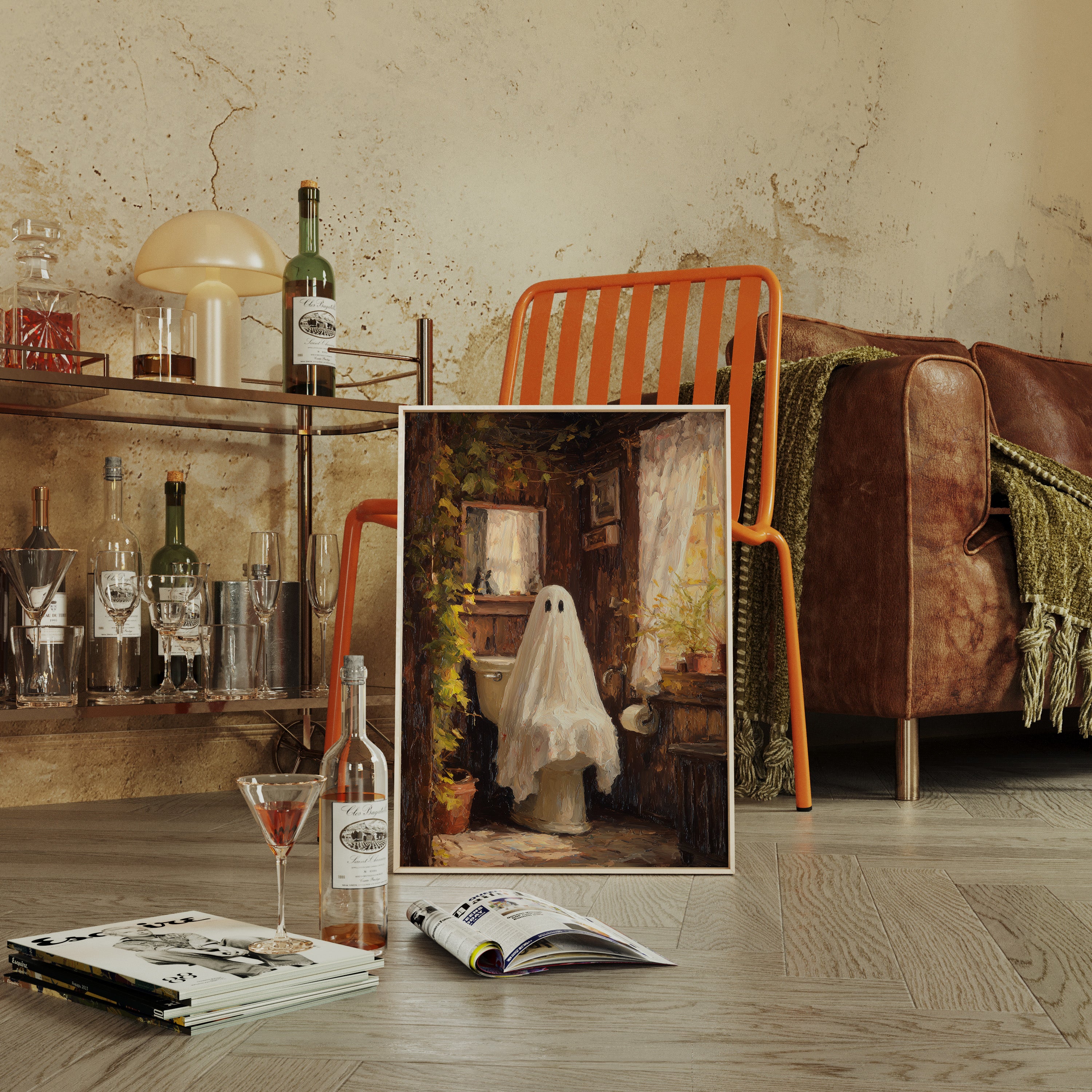 In the quiet corners of our imagination, where whimsy meets nostalgia, a ghost finds its solace in the ordinary rooms of our lives. This enchanting artwork captures the playful spirit of the unseen, inviting a sense of wonder and curiosity.
