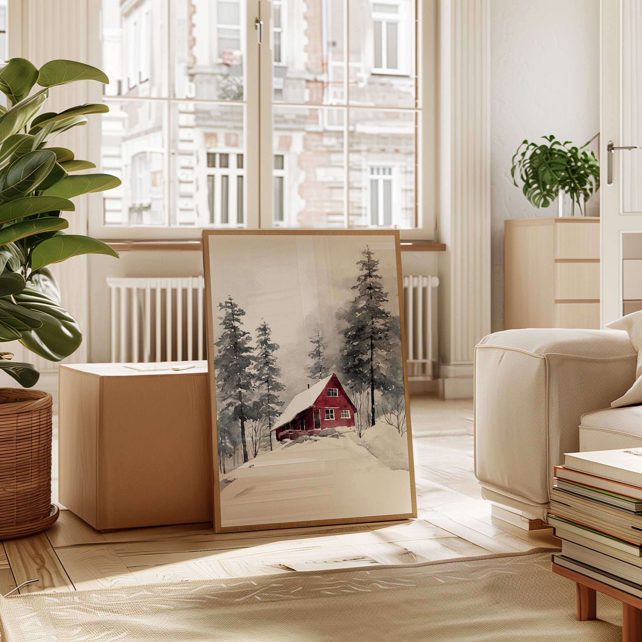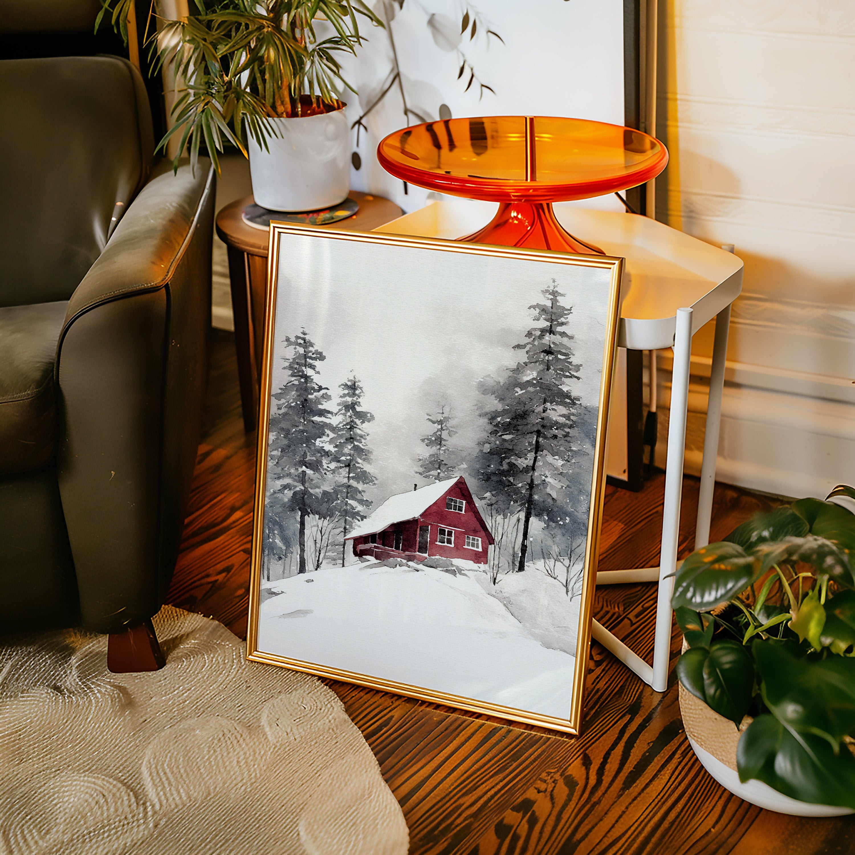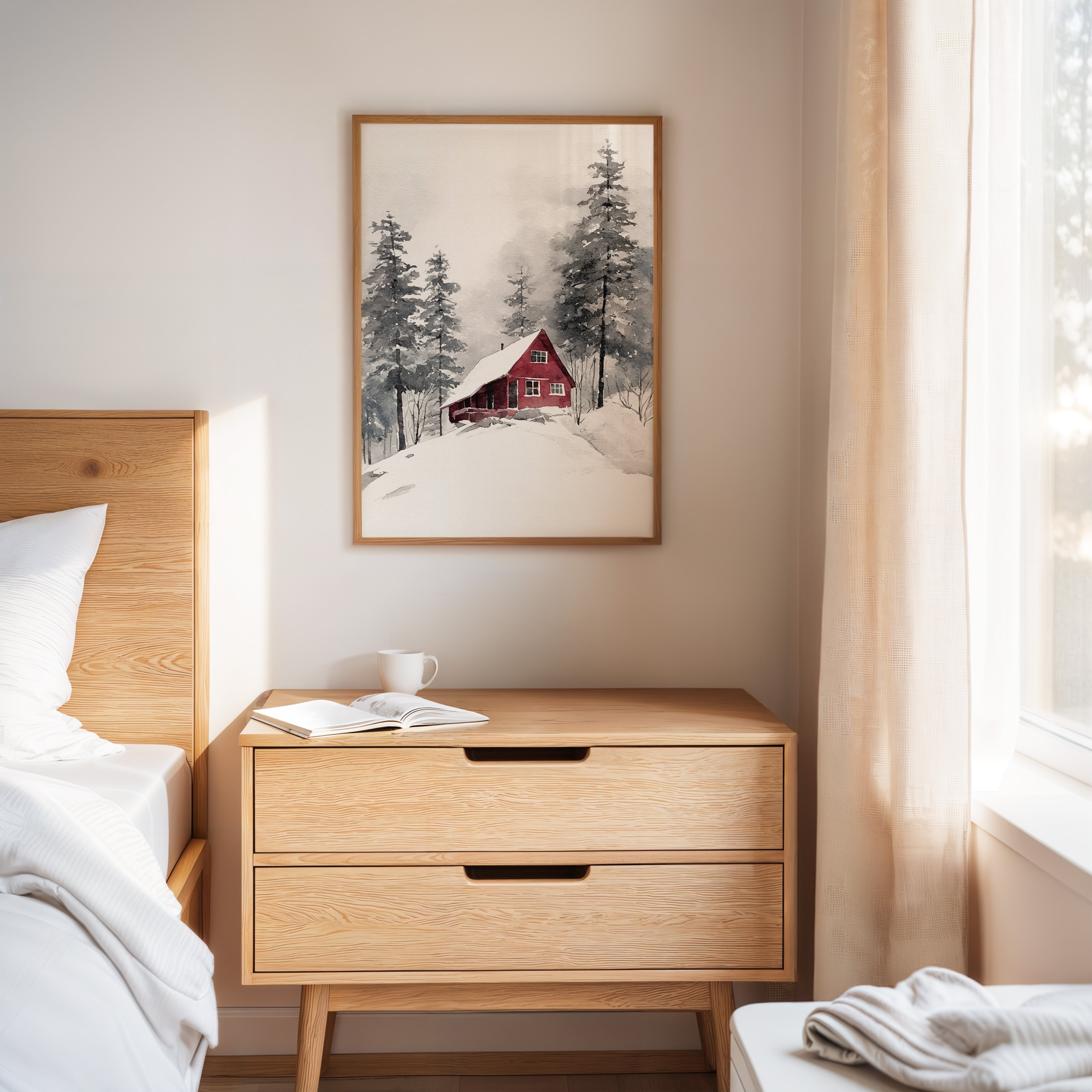 Nestled in a snowy embrace, a crimson cottage stands resilient against the chill, inviting warmth amid the white. This piece captures the essence of artisanal craftsmanship, echoing a cozy retreat. The vibrant red exterior contrasts beautifully with the muted grays and whites of the surrounding landscape, while the gentle strokes of watercolor create a soft, inviting atmosphere. Ideal for a living room or study, this artwork fosters a sense of home and comfort throughout the cold months.