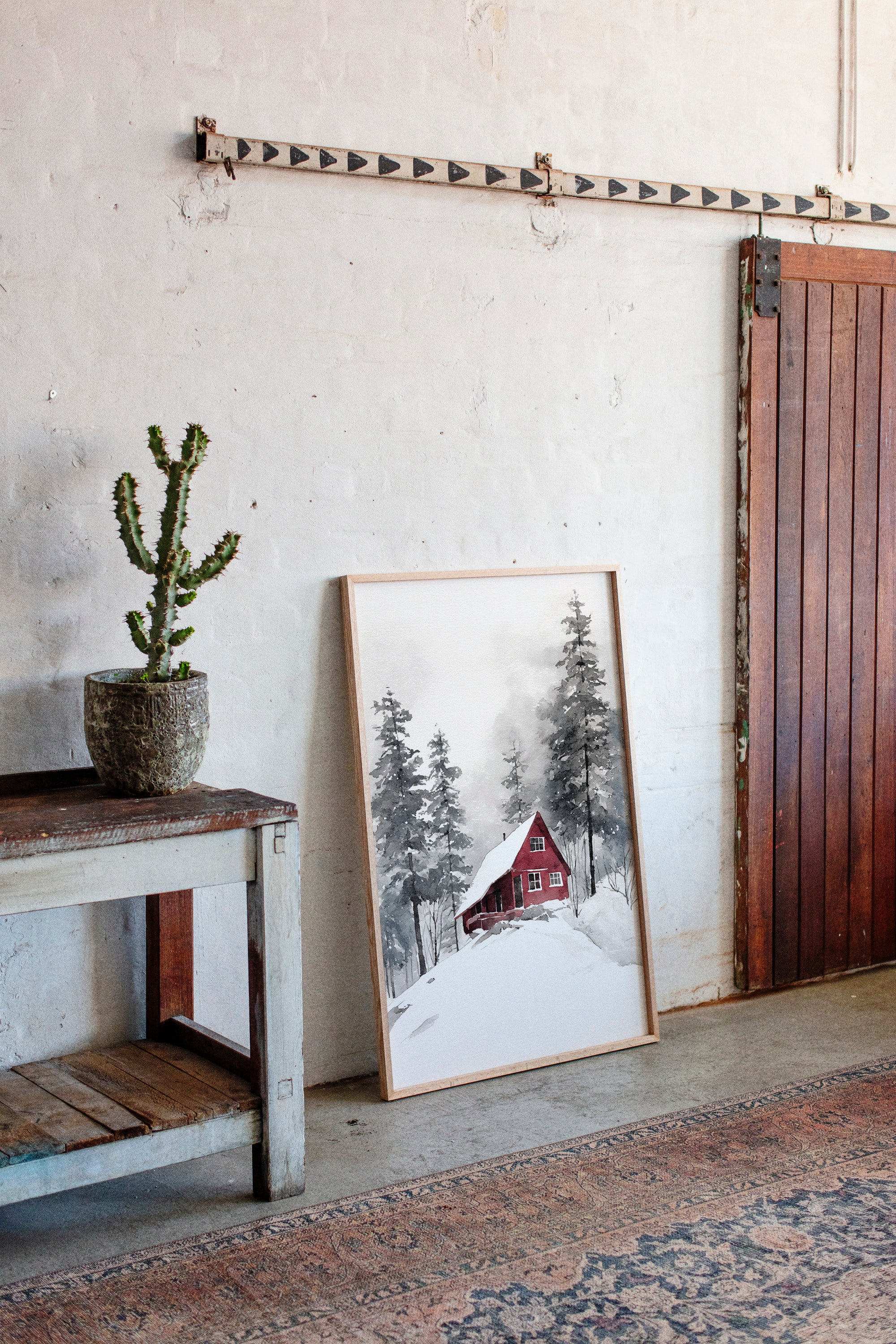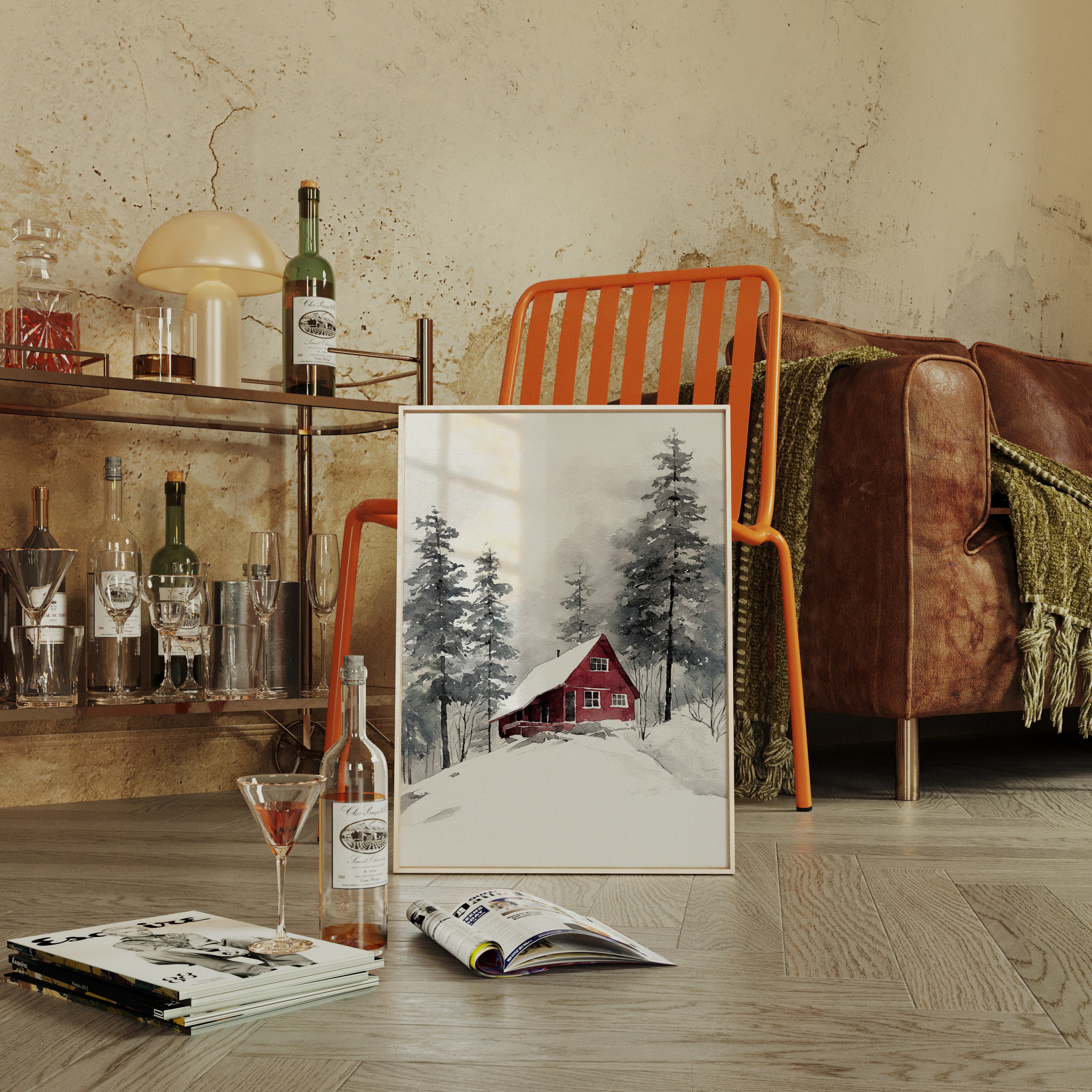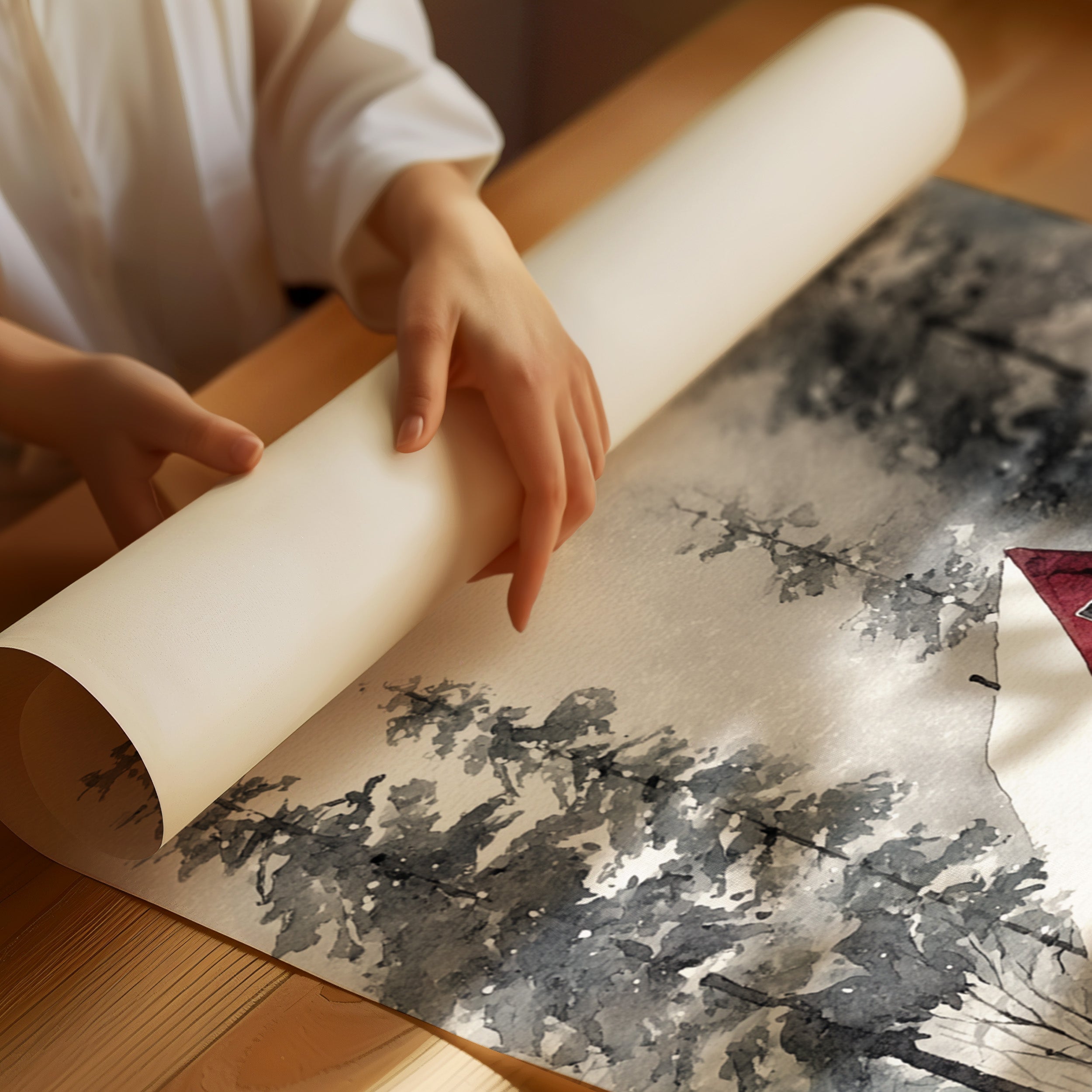 Nestled in a snowy embrace, a crimson cottage stands resilient against the chill, inviting warmth amid the white. This piece captures the essence of artisanal craftsmanship, echoing a cozy retreat. The vibrant red exterior contrasts beautifully with the muted grays and whites of the surrounding landscape, while the gentle strokes of watercolor create a soft, inviting atmosphere. Ideal for a living room or study, this artwork fosters a sense of home and comfort throughout the cold months.