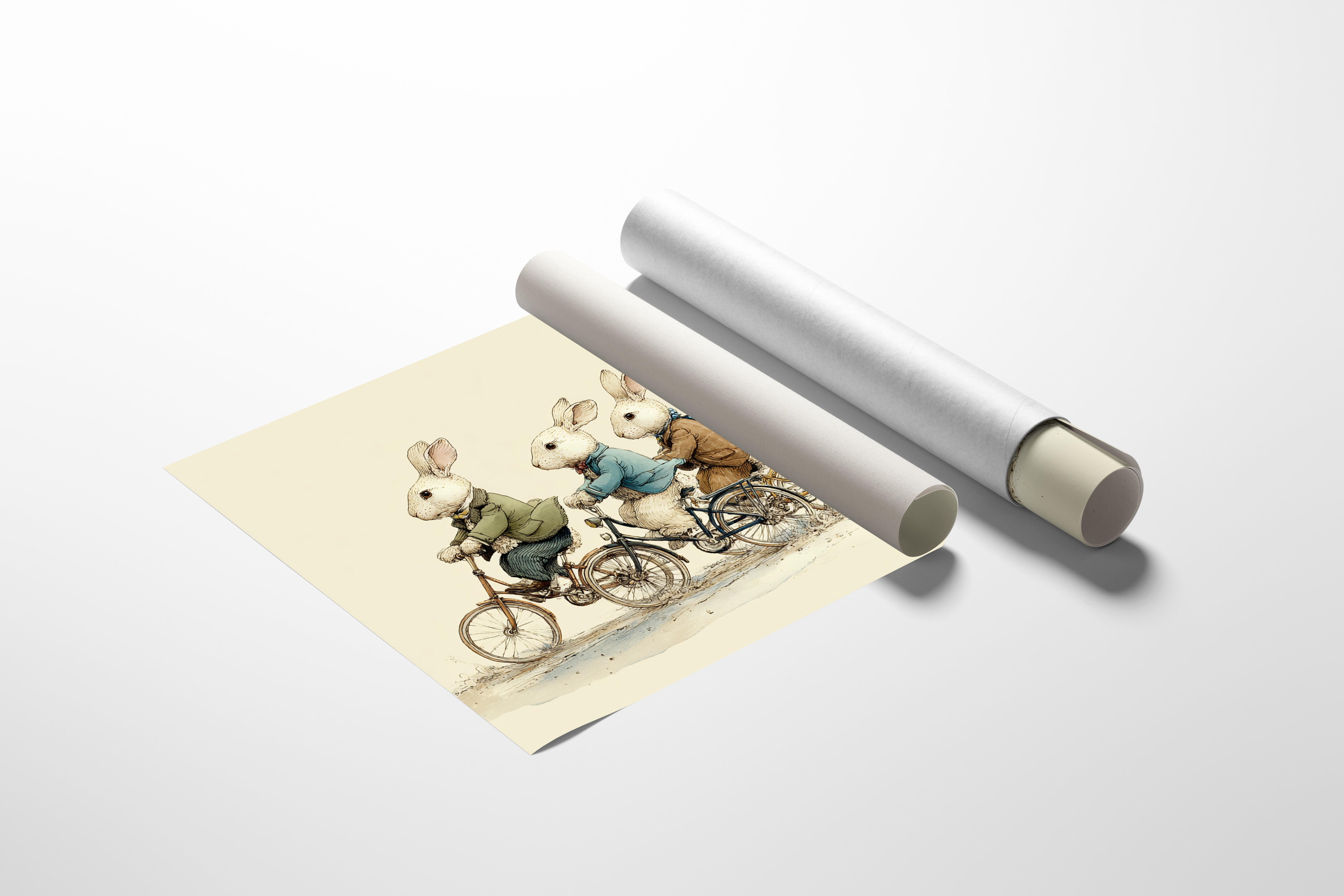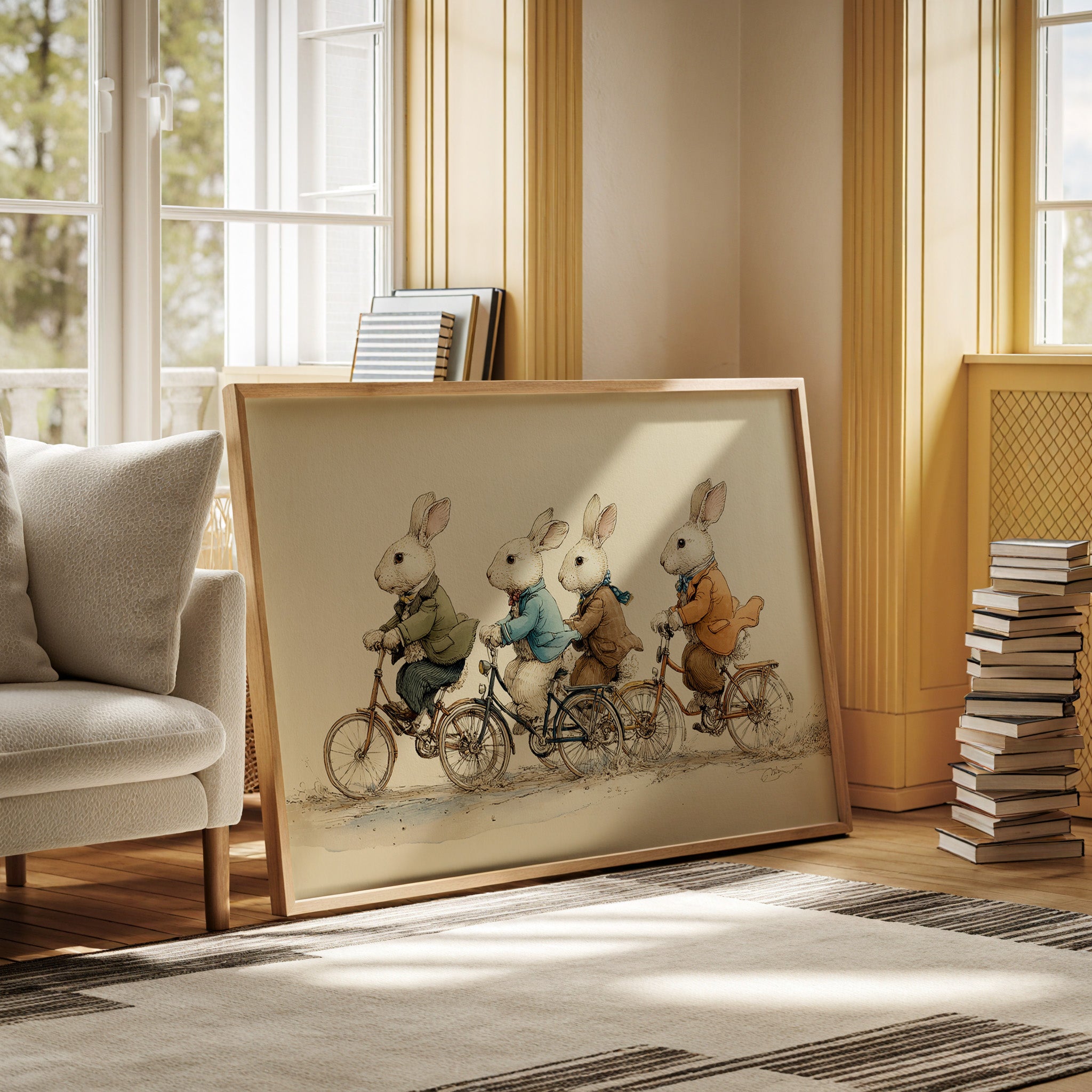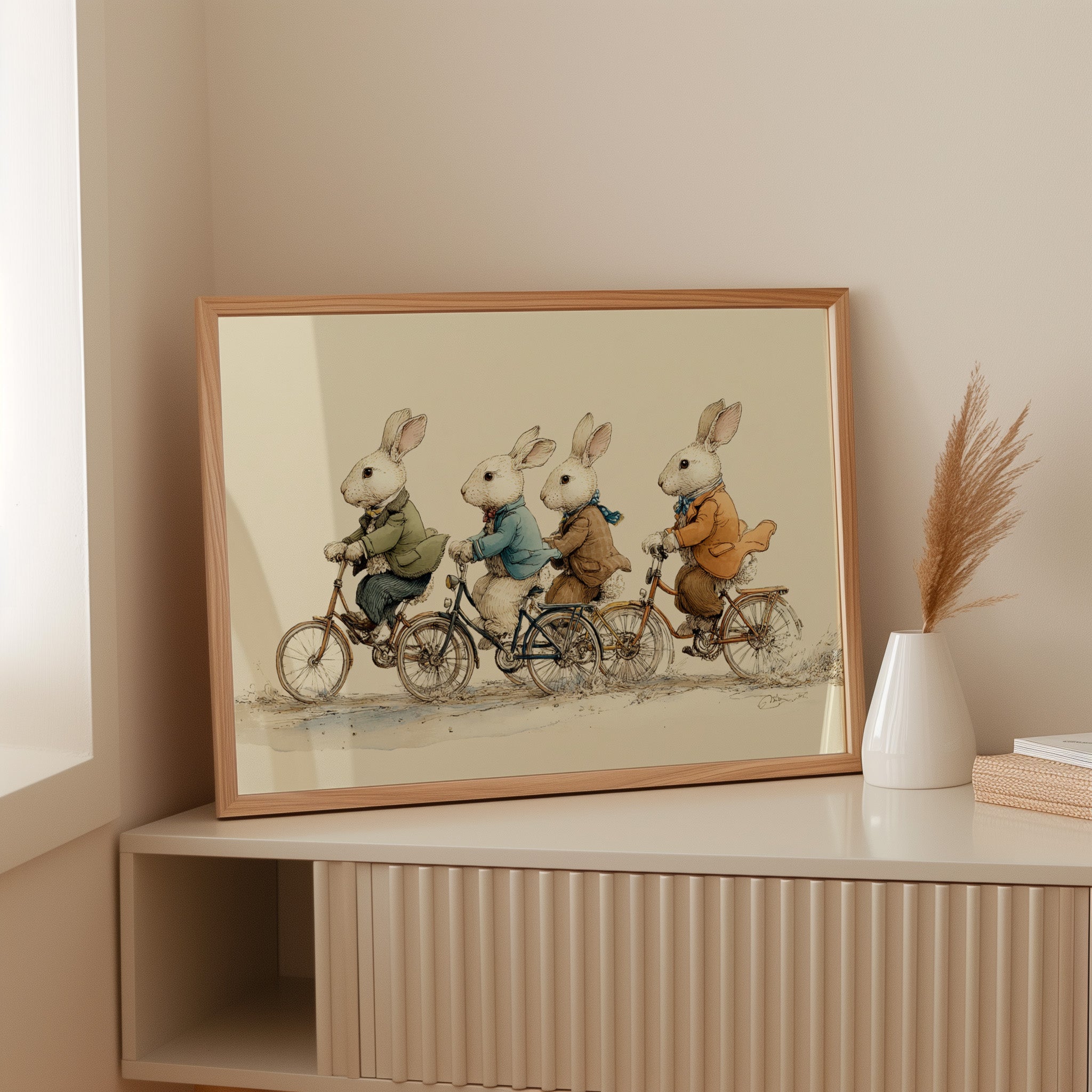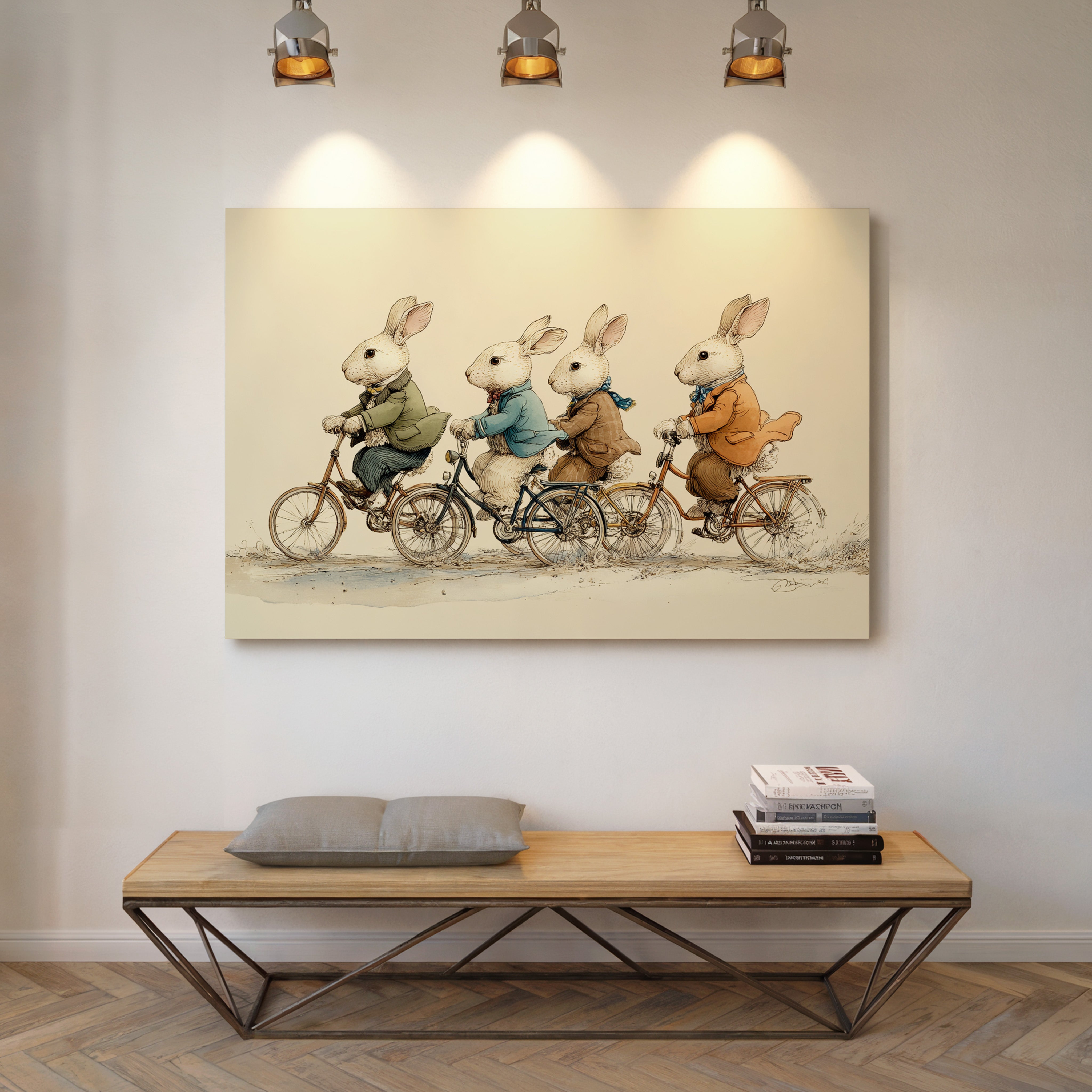 Four dapper rabbits, each with a unique flair, pedal their way through a sunlit afternoon, embodying a spirit of adventure and camaraderie. This playful piece invites you into a world where imagination reigns and stories unfold. With each stroke, the textured fur and vibrant attire of the rabbits resonate with a sense of joy and freedom, celebrating the simple pleasures of life. Perfect for a child's room or a cozy reading nook, this enchanting scene sparks curiosity and warmth.