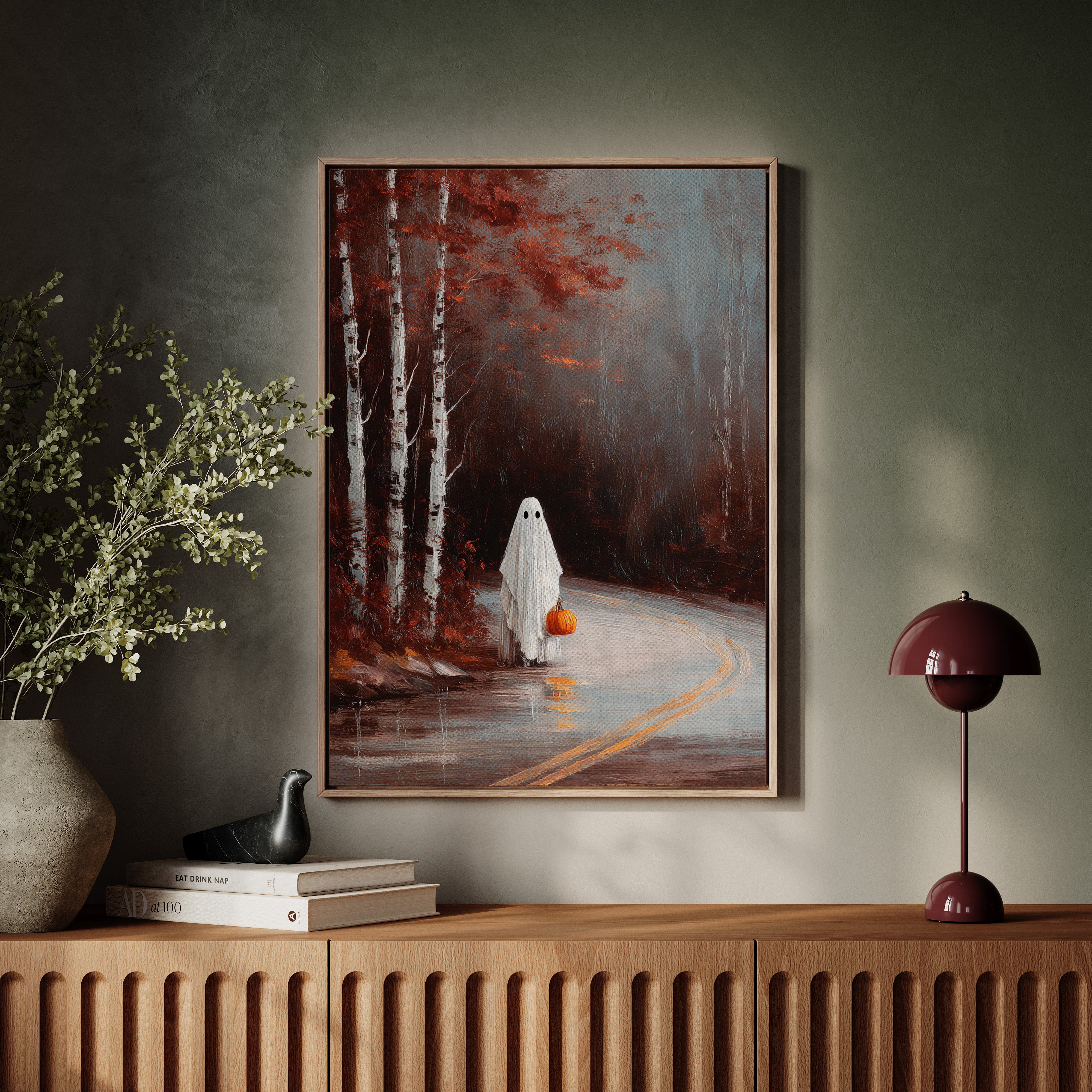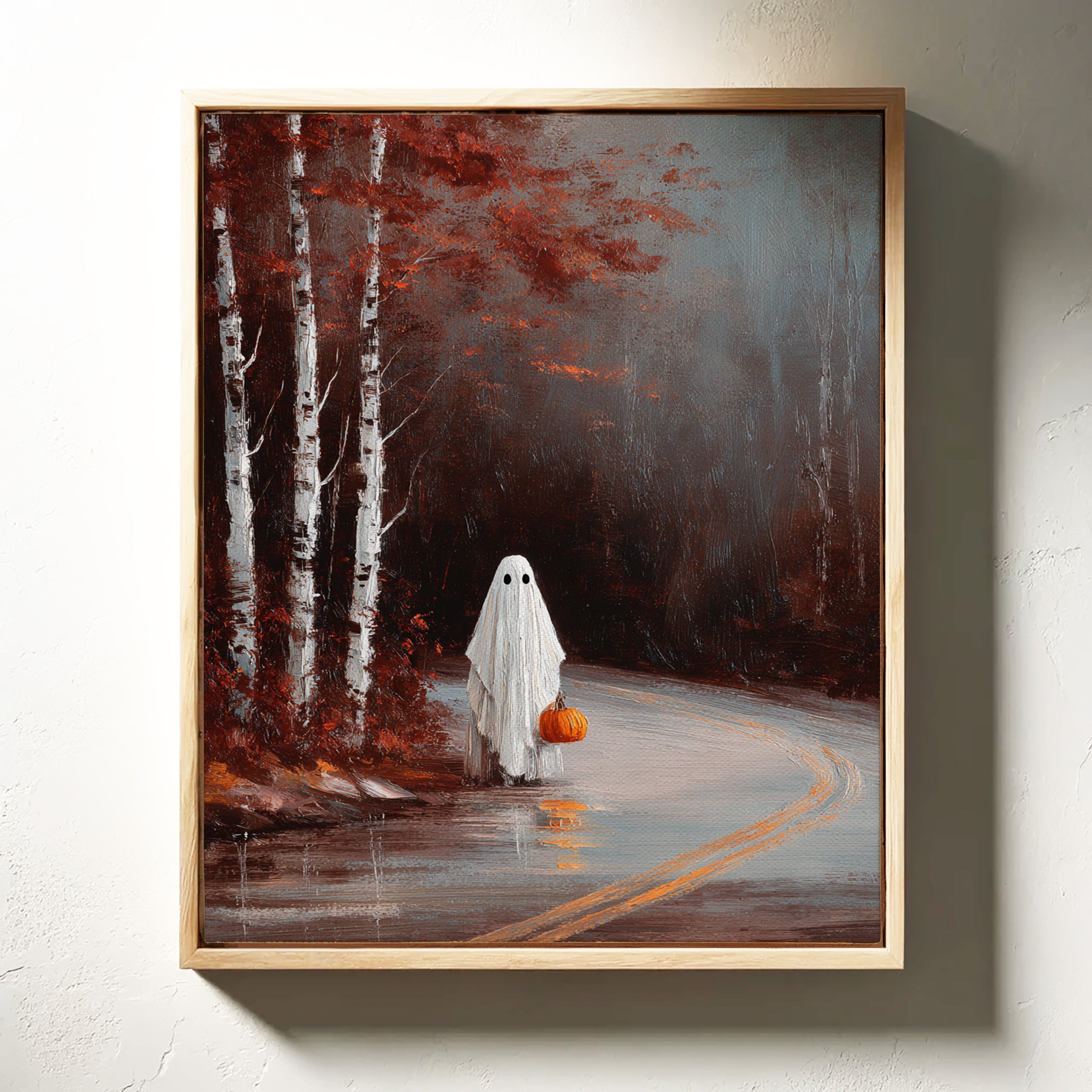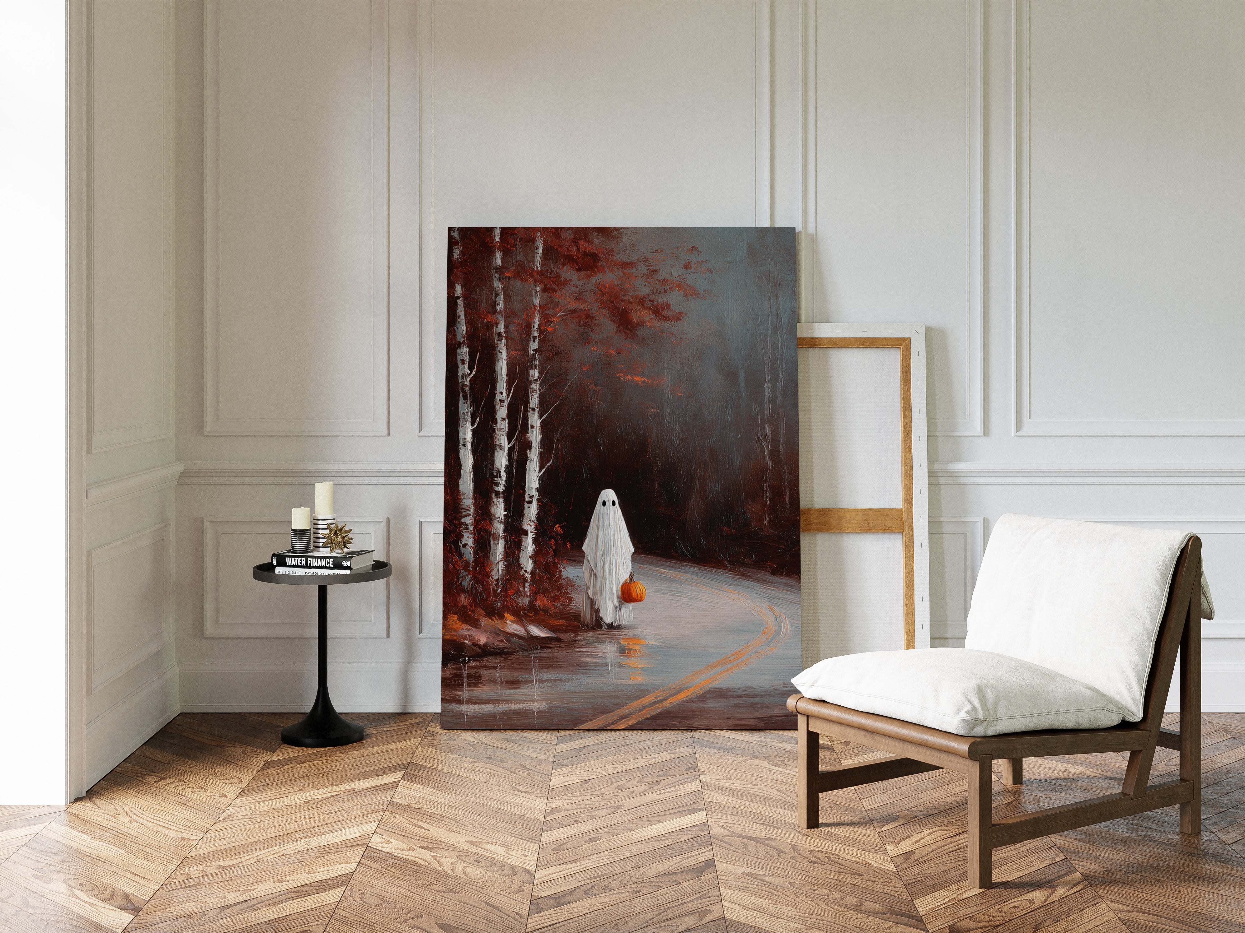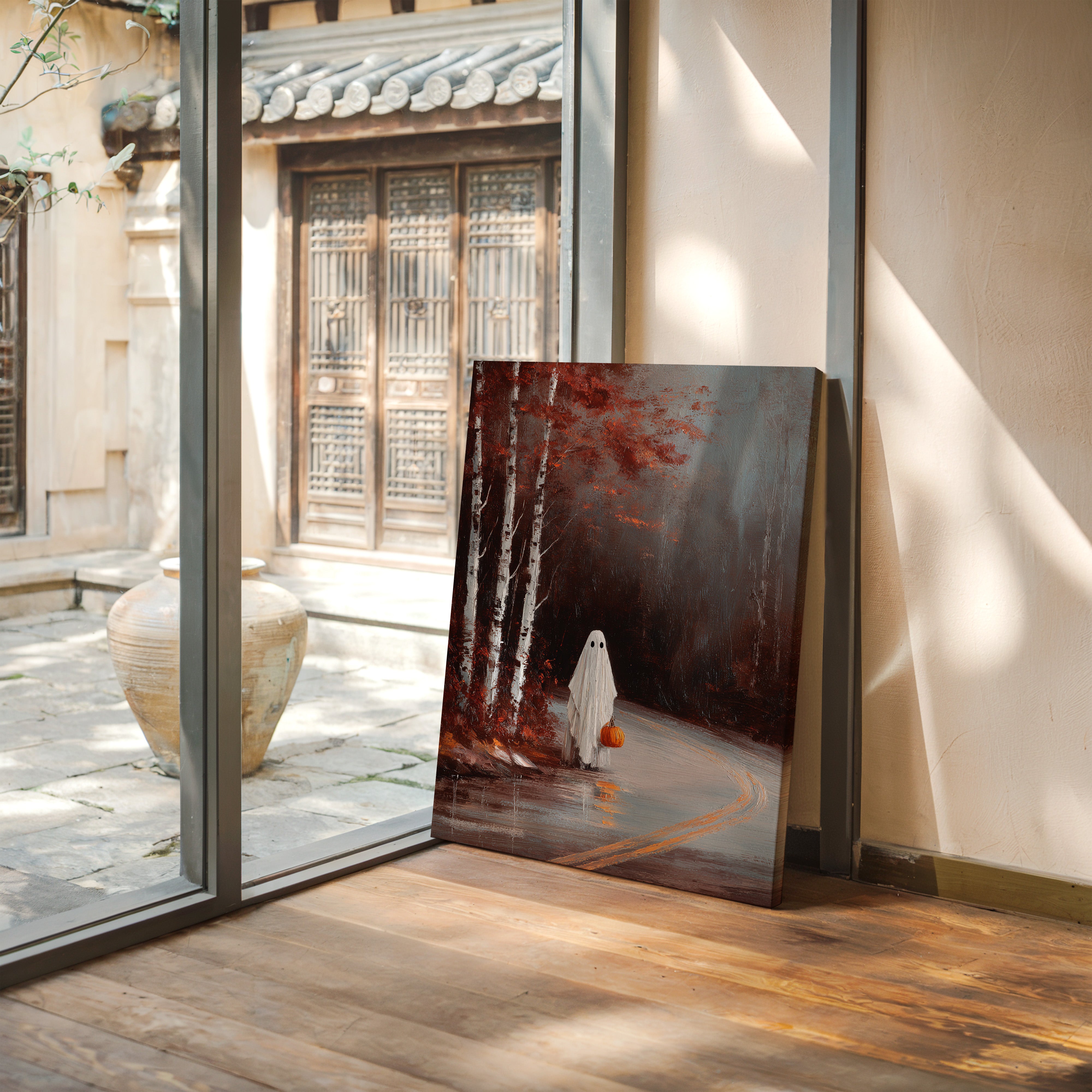 In the stillness of an autumn evening, a playful spirit wanders the winding road, a pumpkin clutched tightly in hand. Part of the Artisanal collection, this piece captures the whimsy of a season steeped in nostalgia. The vibrant reds and oranges of the trees juxtapose against the soft, spectral figure, creating a striking contrast that evokes both warmth and mystery. Perfect for a cozy nook or an inviting hallway, this enchanting scene brings a touch of seasonal charm to any space.
