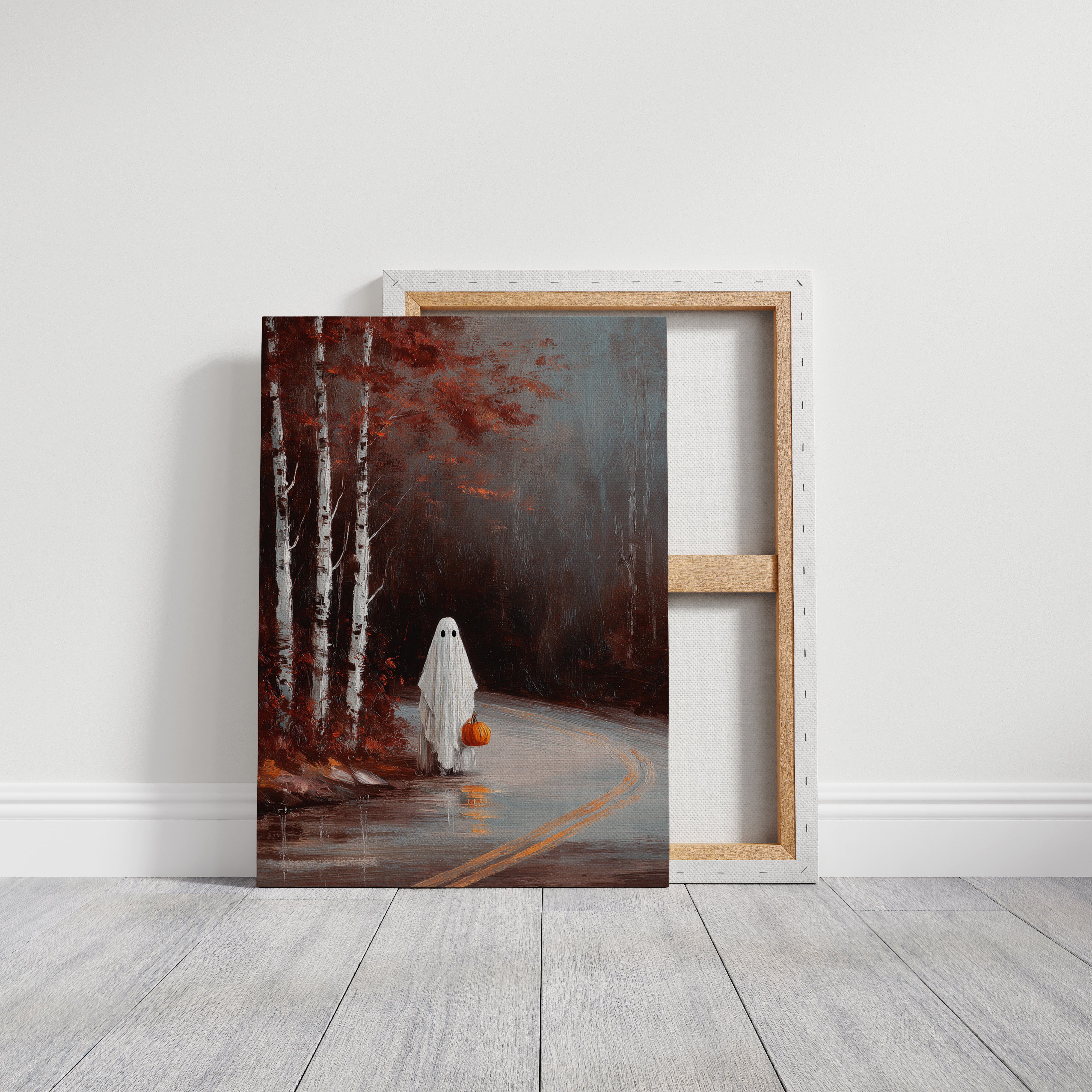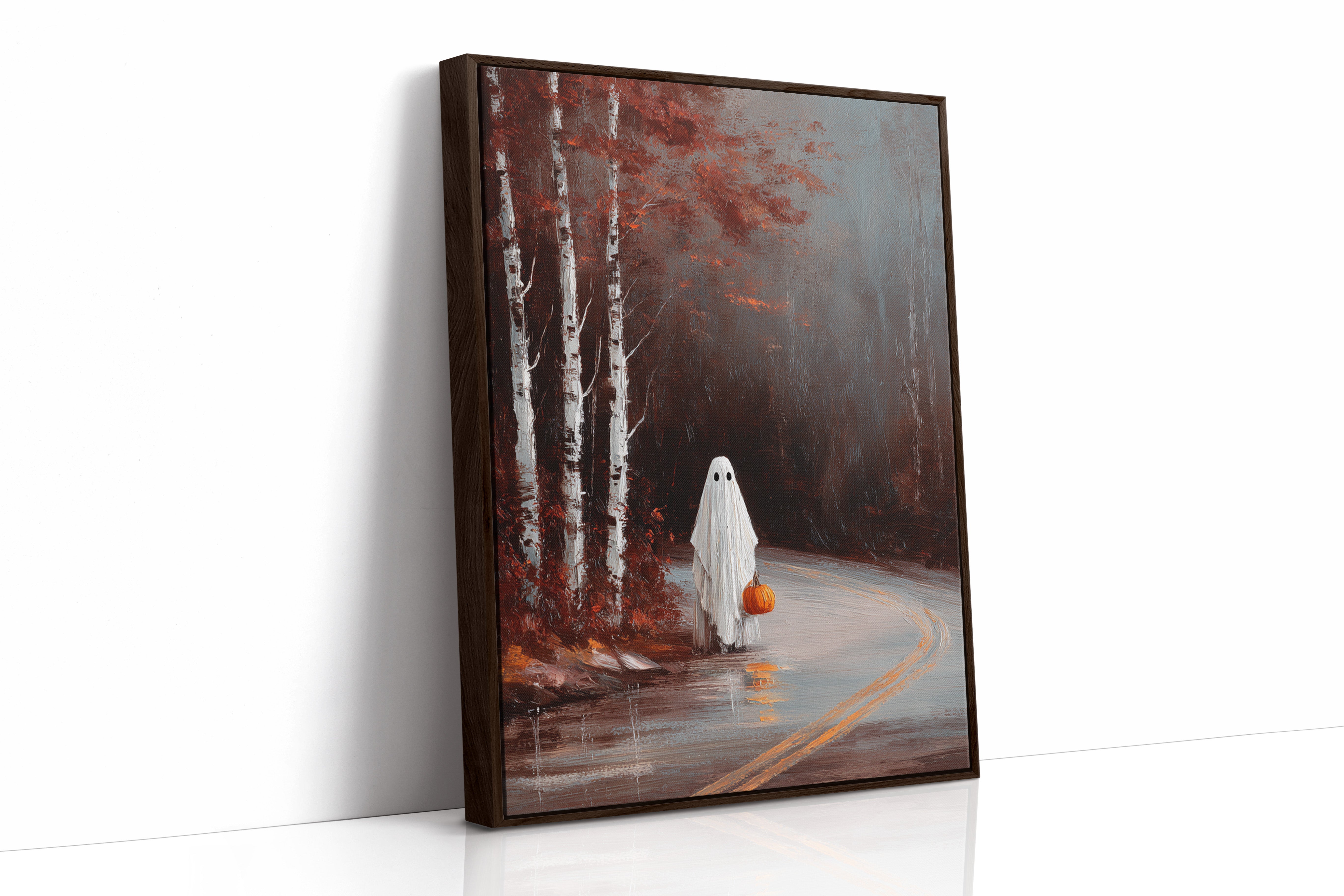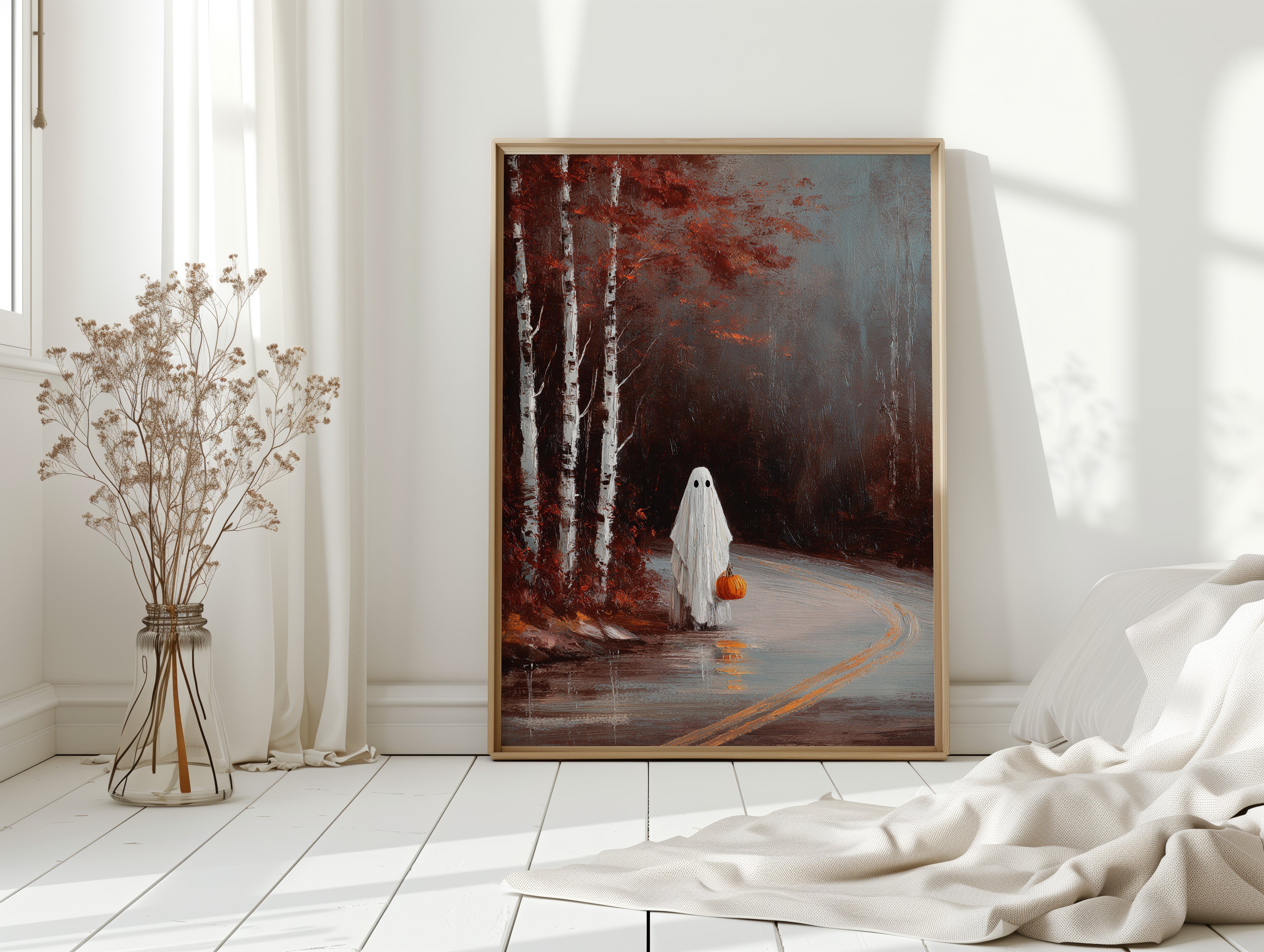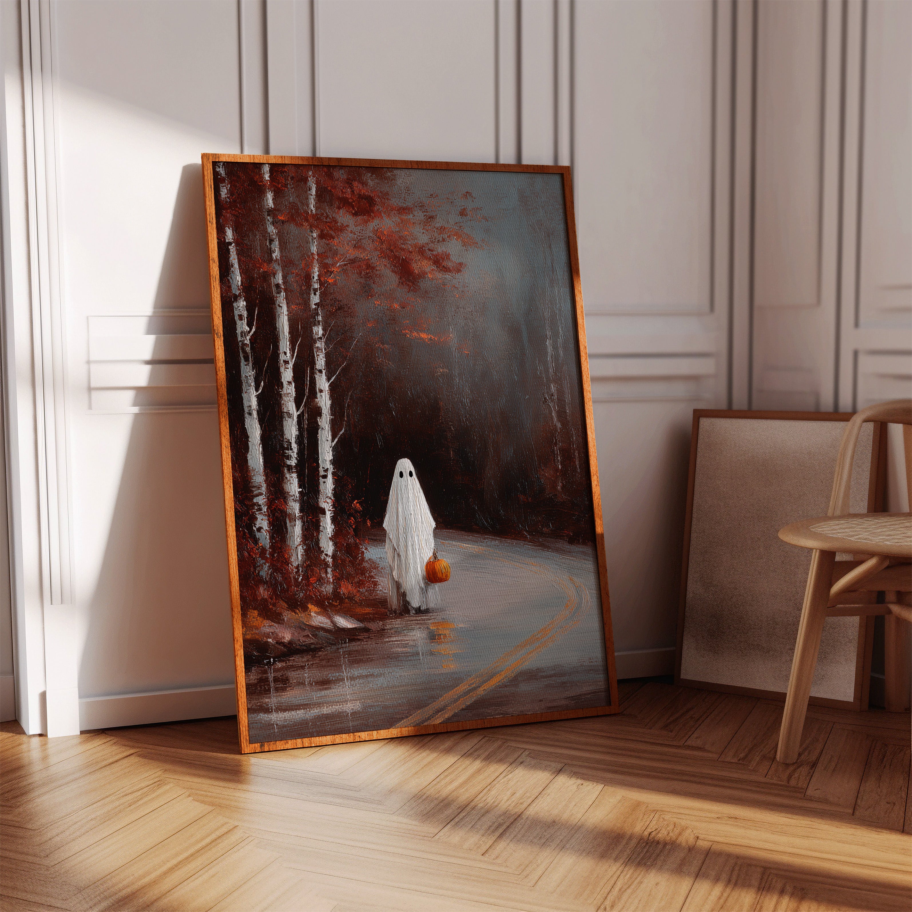In the stillness of an autumn evening, a playful spirit wanders the winding road, a pumpkin clutched tightly in hand. Part of the Artisanal collection, this piece captures the whimsy of a season steeped in nostalgia. The vibrant reds and oranges of the trees juxtapose against the soft, spectral figure, creating a striking contrast that evokes both warmth and mystery. Perfect for a cozy nook or an inviting hallway, this enchanting scene brings a touch of seasonal charm to any space.