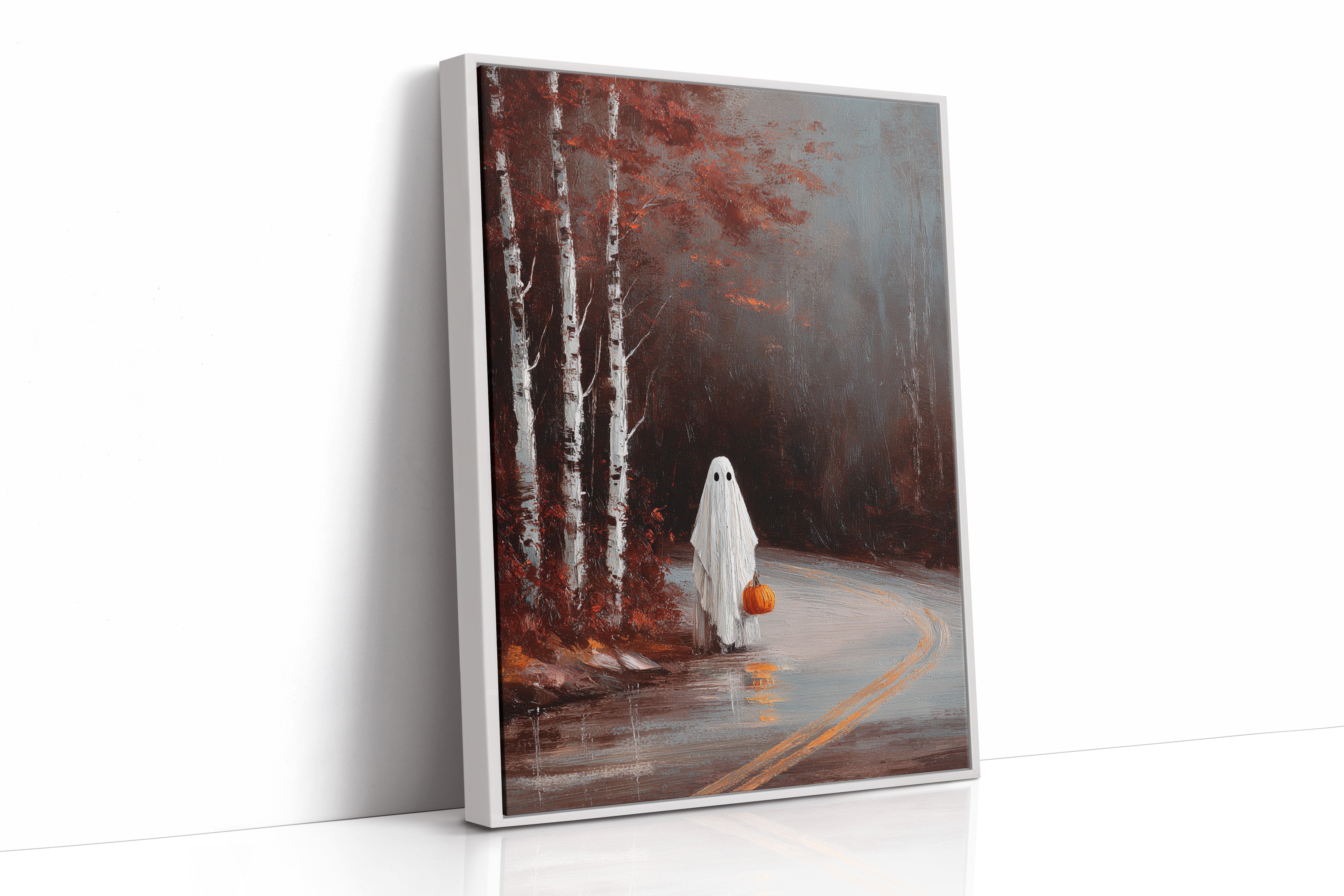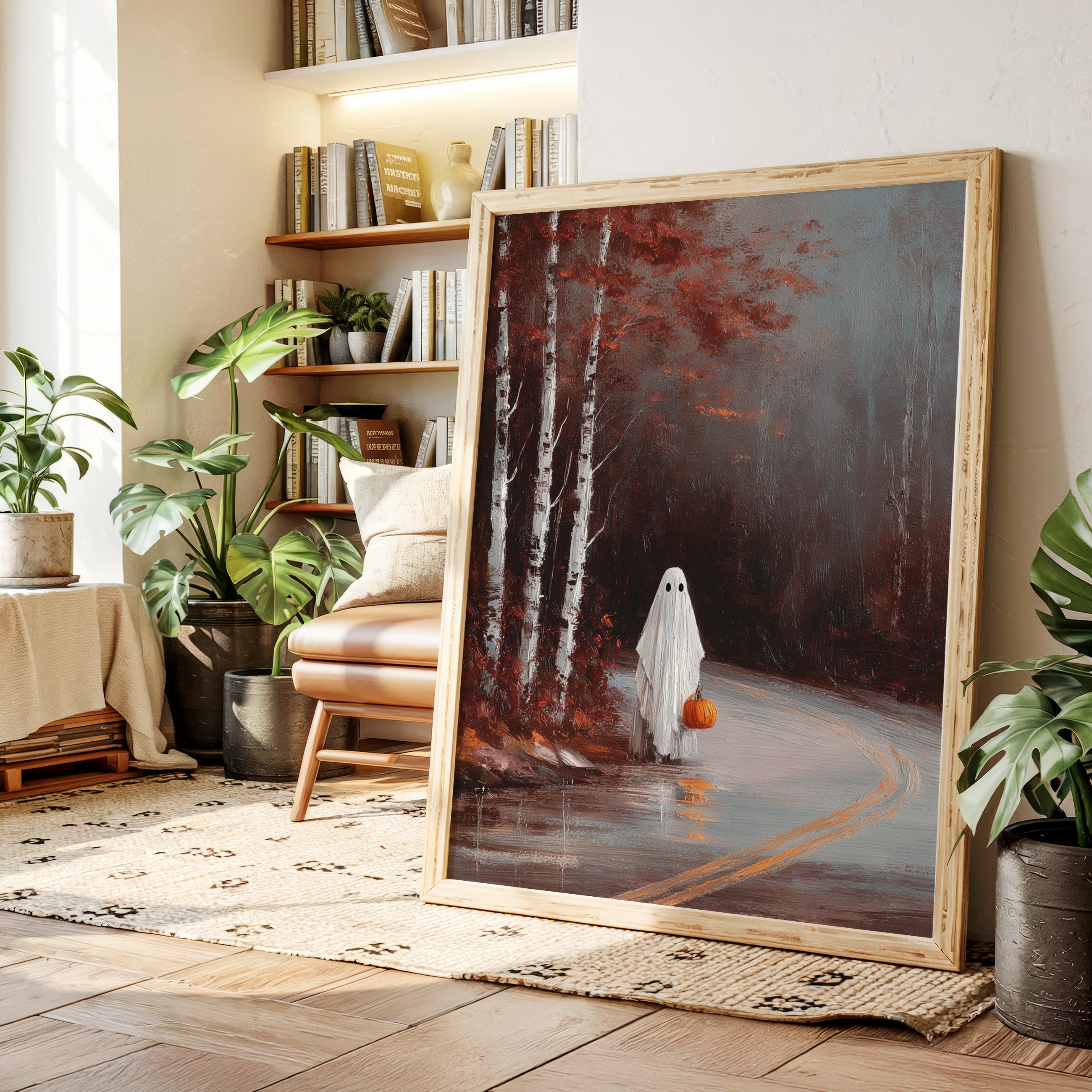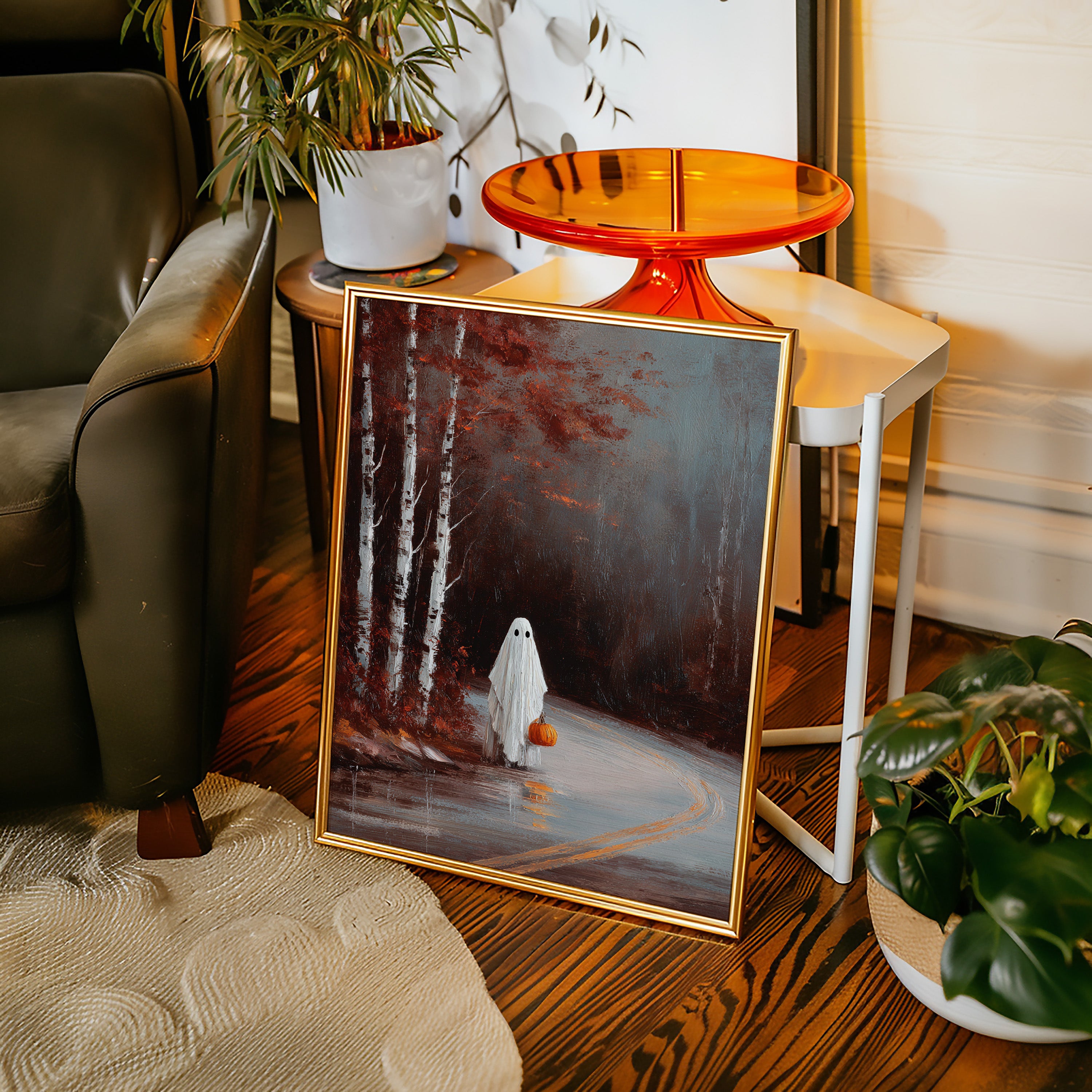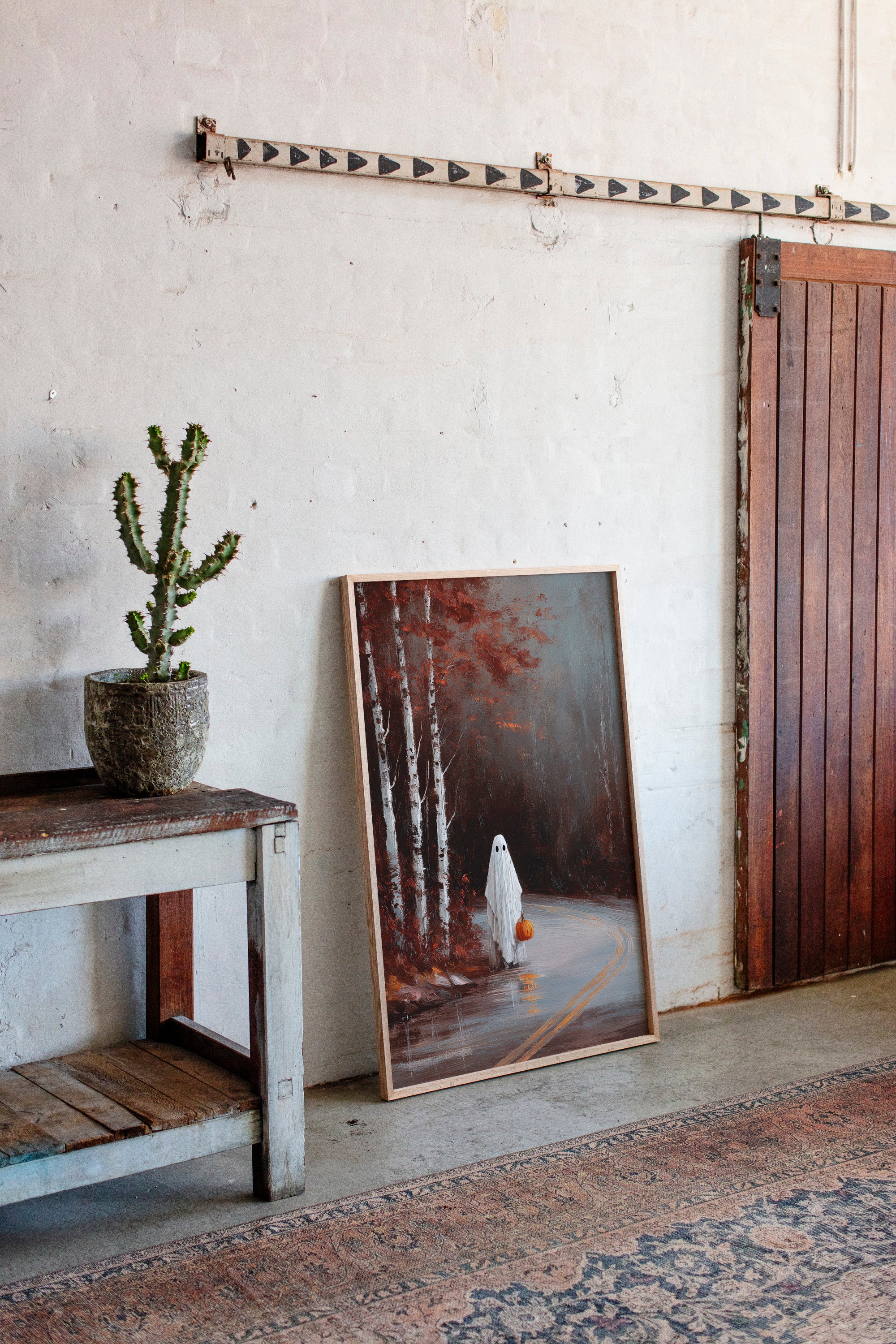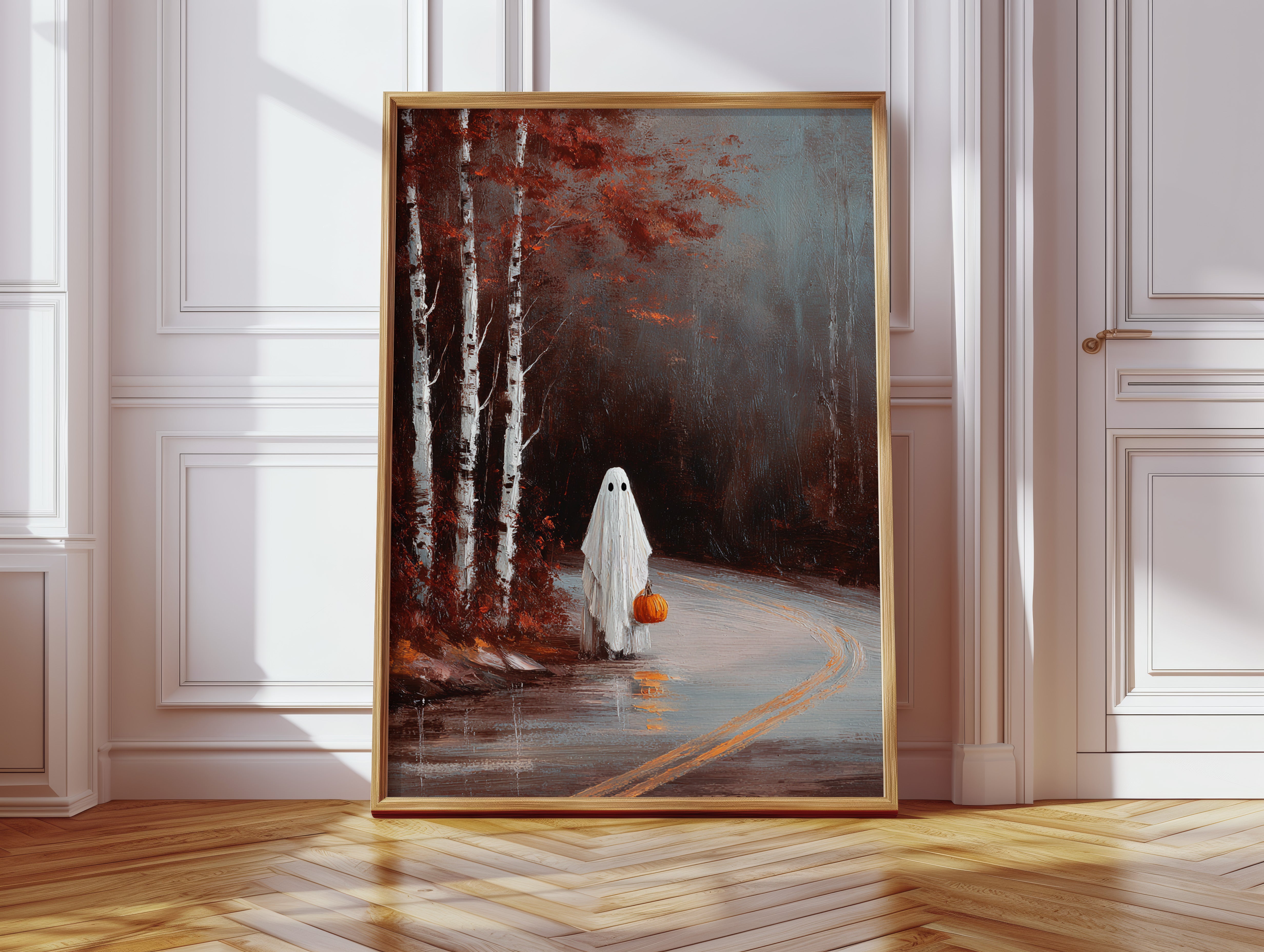 In the stillness of an autumn evening, a playful spirit wanders the winding road, a pumpkin clutched tightly in hand. Part of the Artisanal collection, this piece captures the whimsy of a season steeped in nostalgia. The vibrant reds and oranges of the trees juxtapose against the soft, spectral figure, creating a striking contrast that evokes both warmth and mystery. Perfect for a cozy nook or an inviting hallway, this enchanting scene brings a touch of seasonal charm to any space.