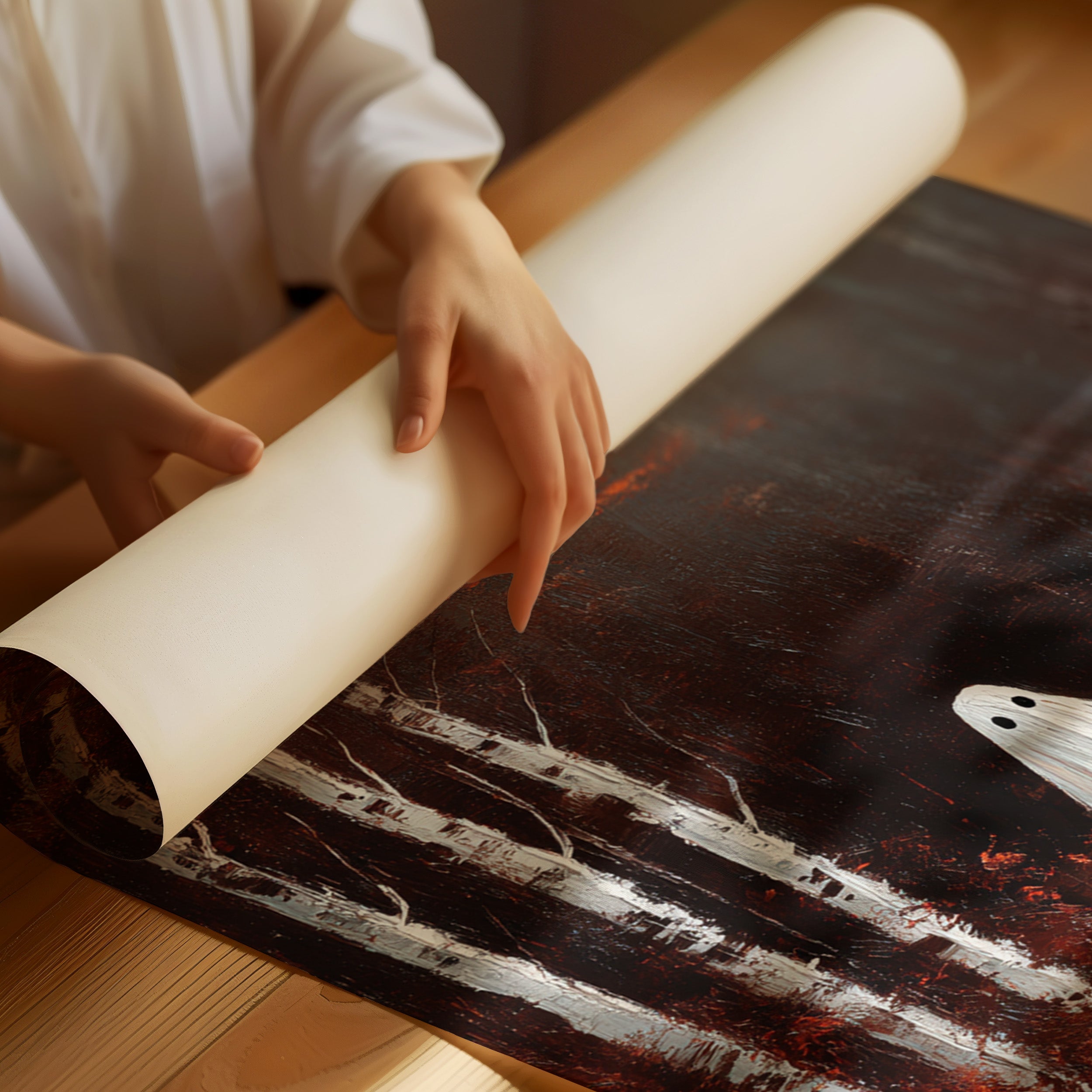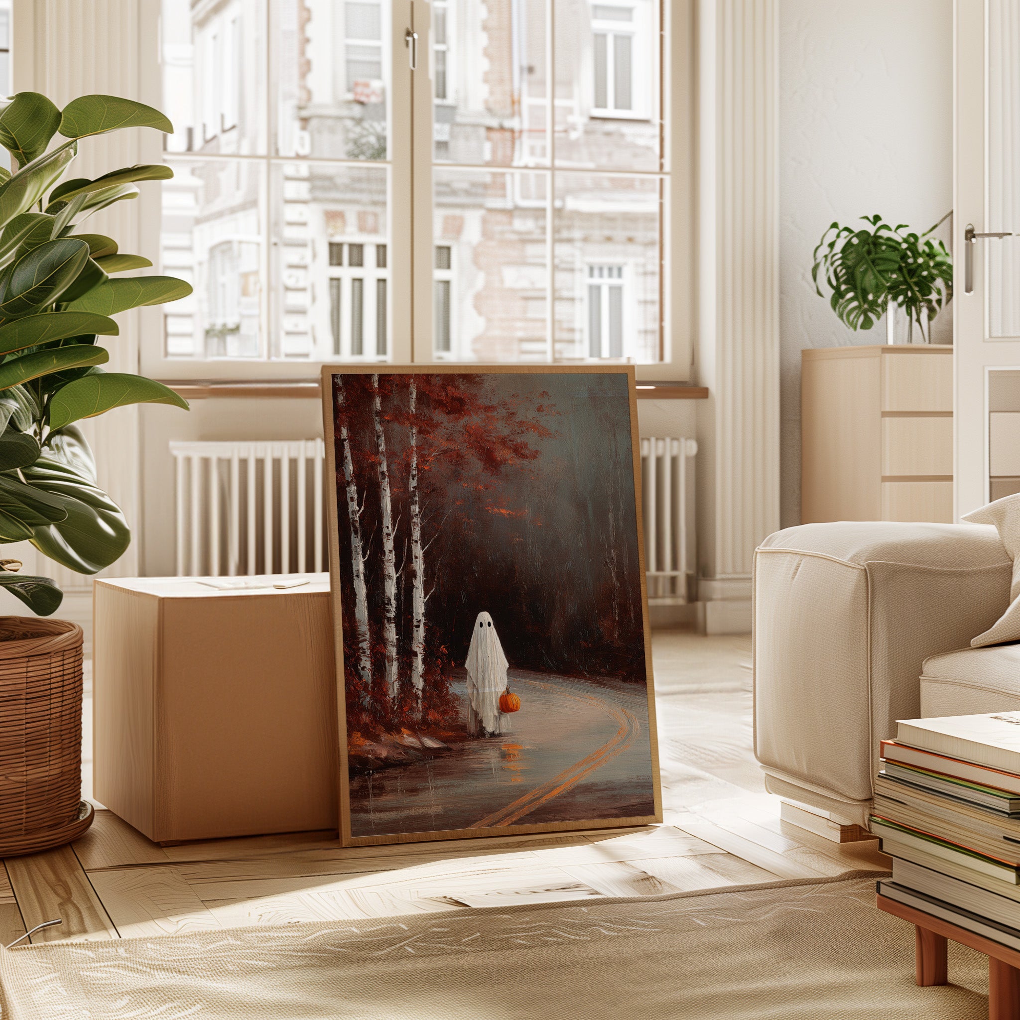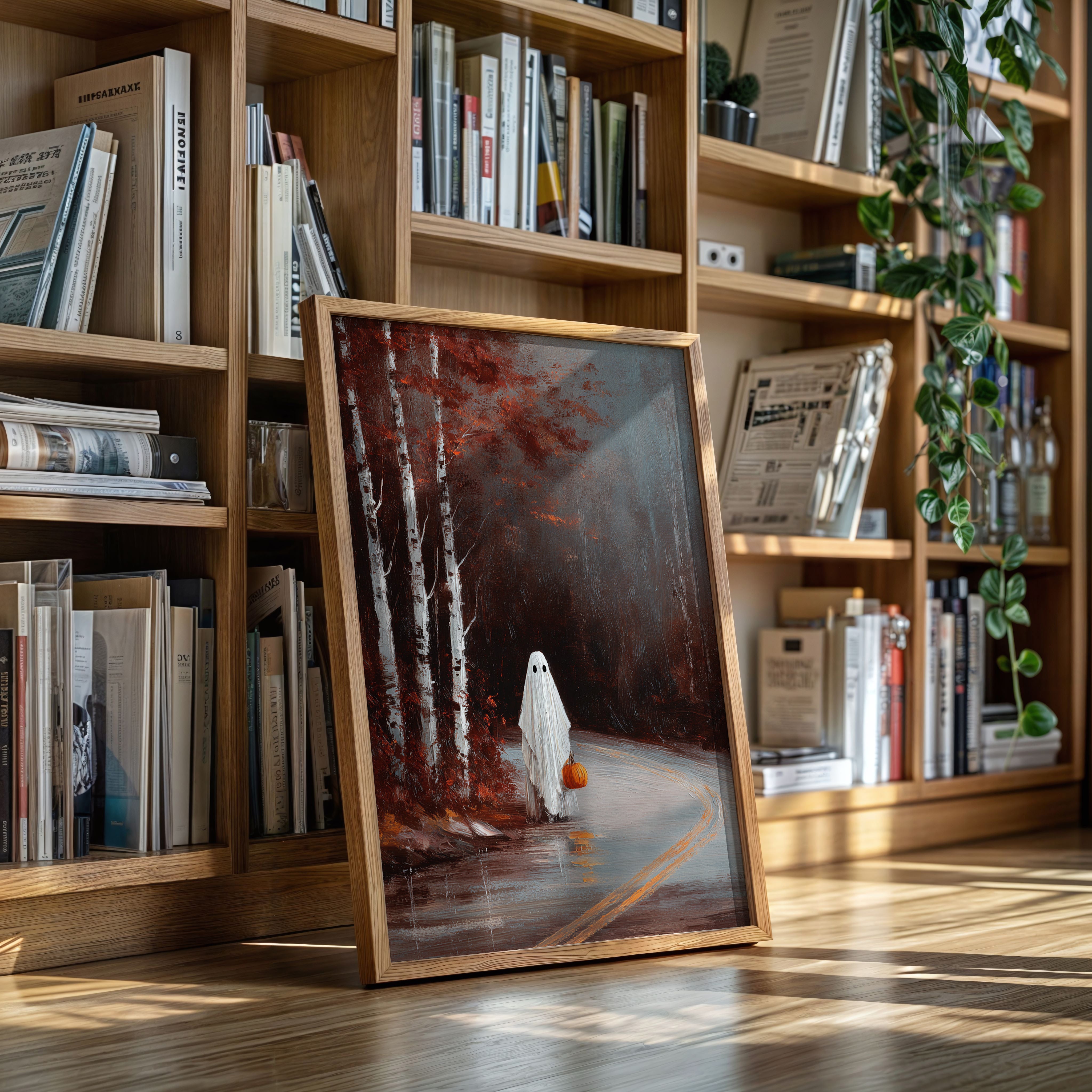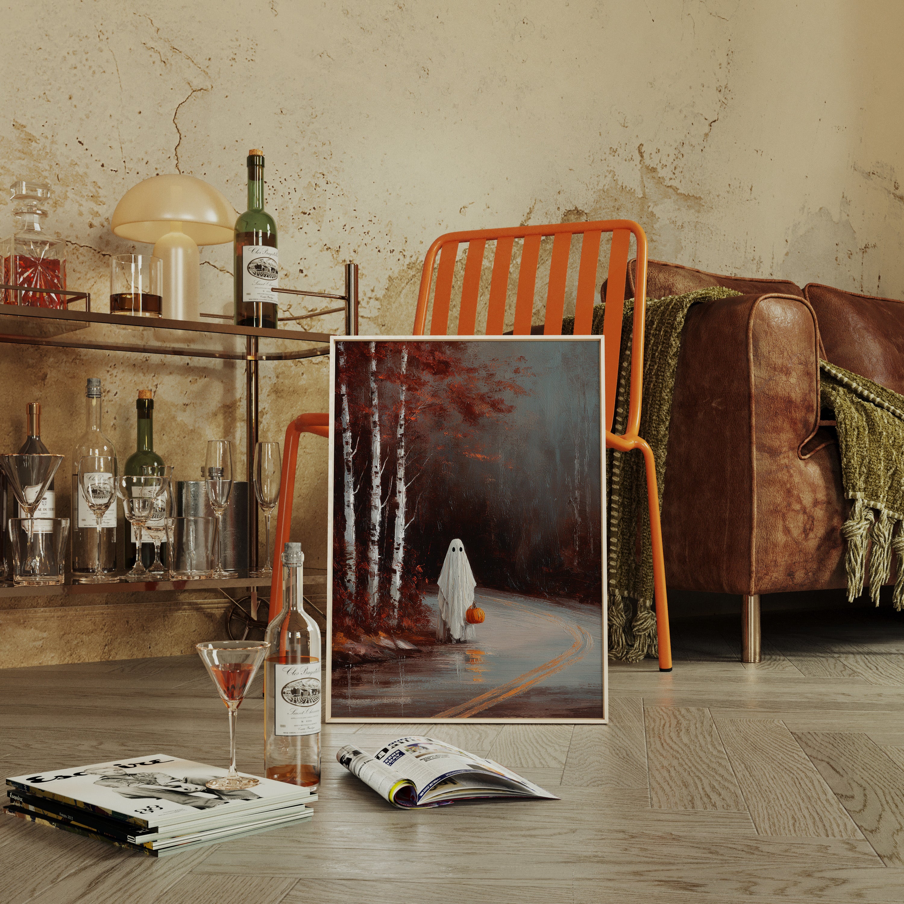 In the stillness of an autumn evening, a playful spirit wanders the winding road, a pumpkin clutched tightly in hand. Part of the Artisanal collection, this piece captures the whimsy of a season steeped in nostalgia. The vibrant reds and oranges of the trees juxtapose against the soft, spectral figure, creating a striking contrast that evokes both warmth and mystery. Perfect for a cozy nook or an inviting hallway, this enchanting scene brings a touch of seasonal charm to any space.