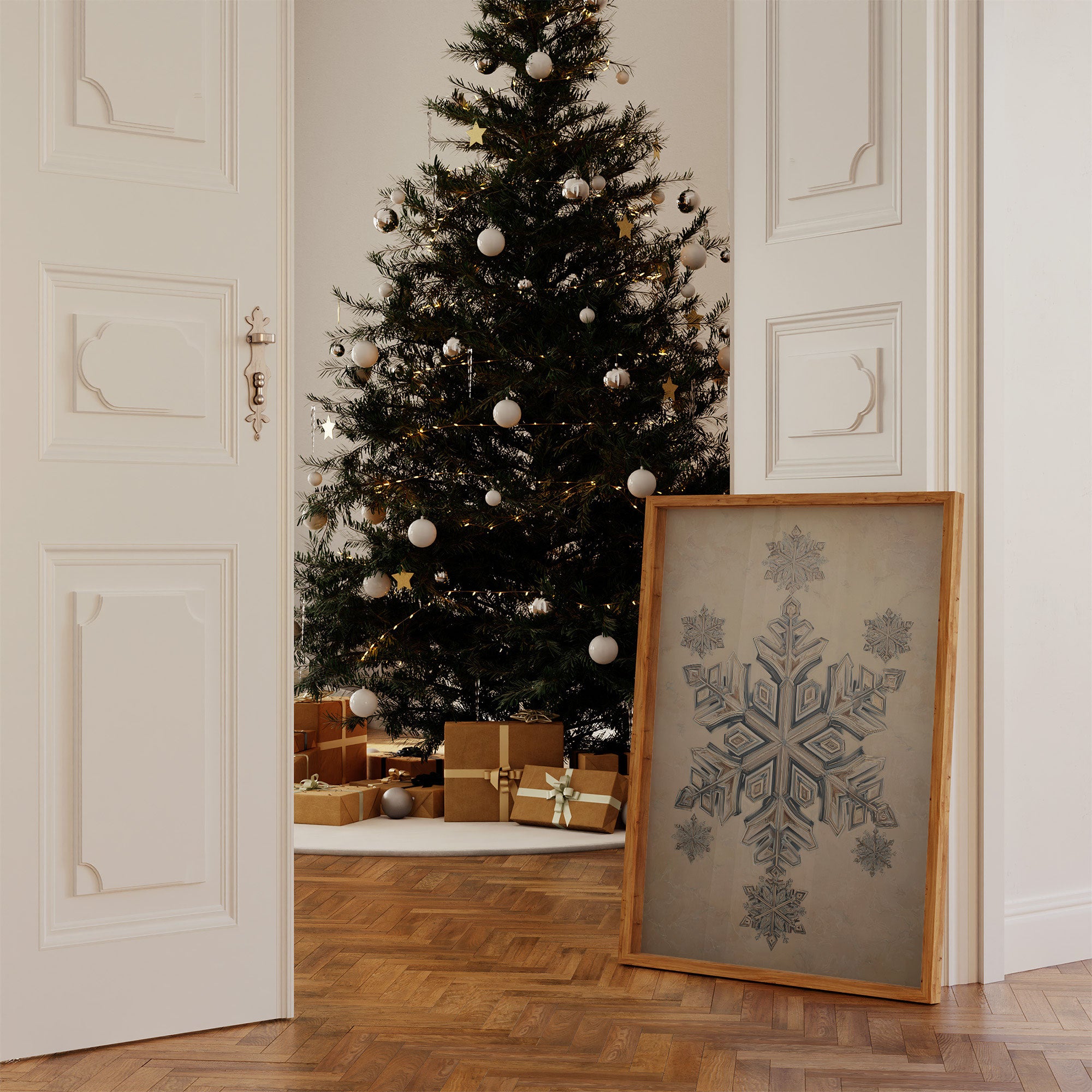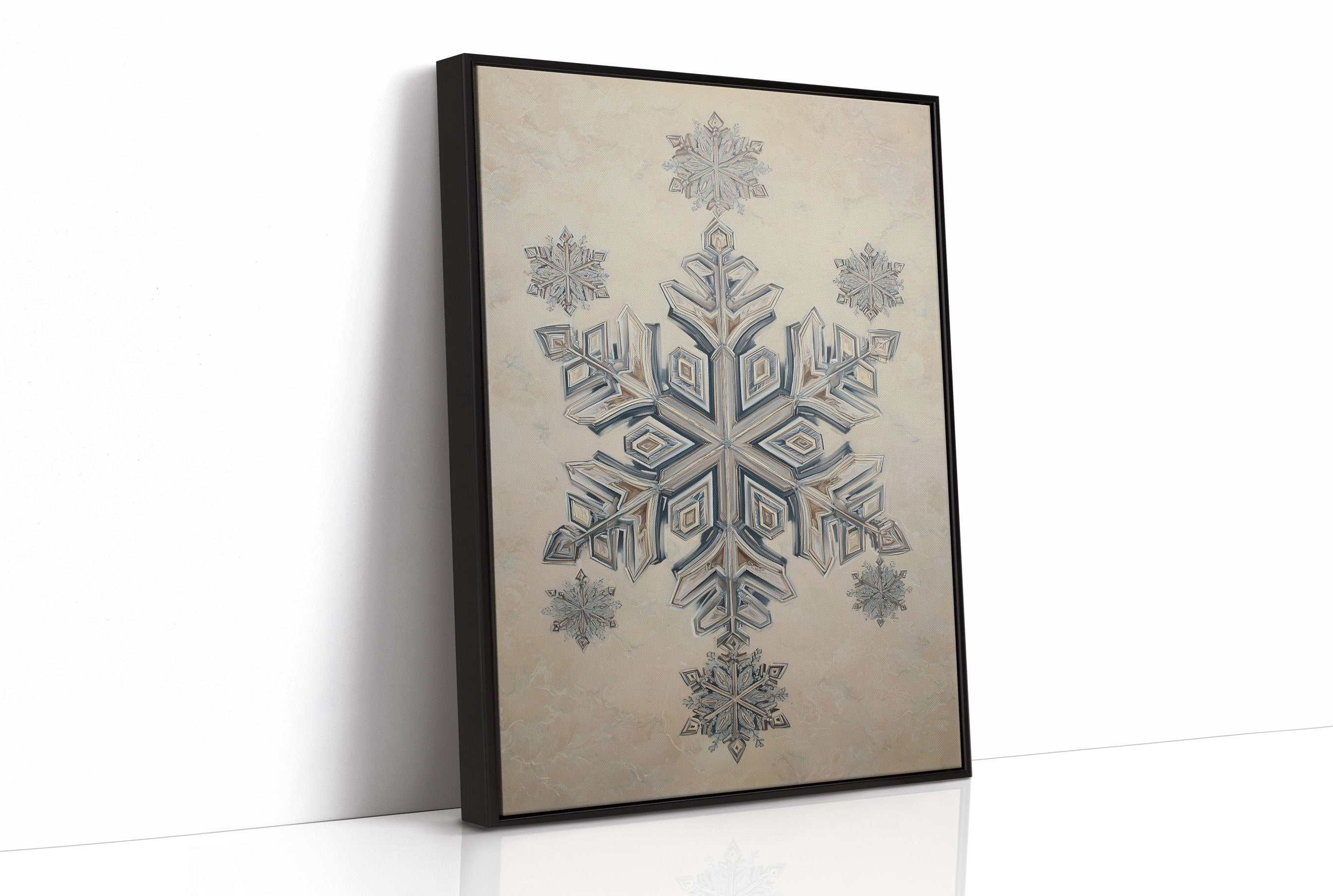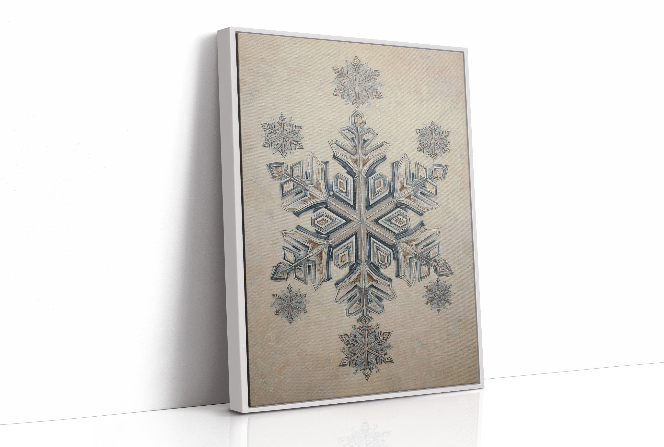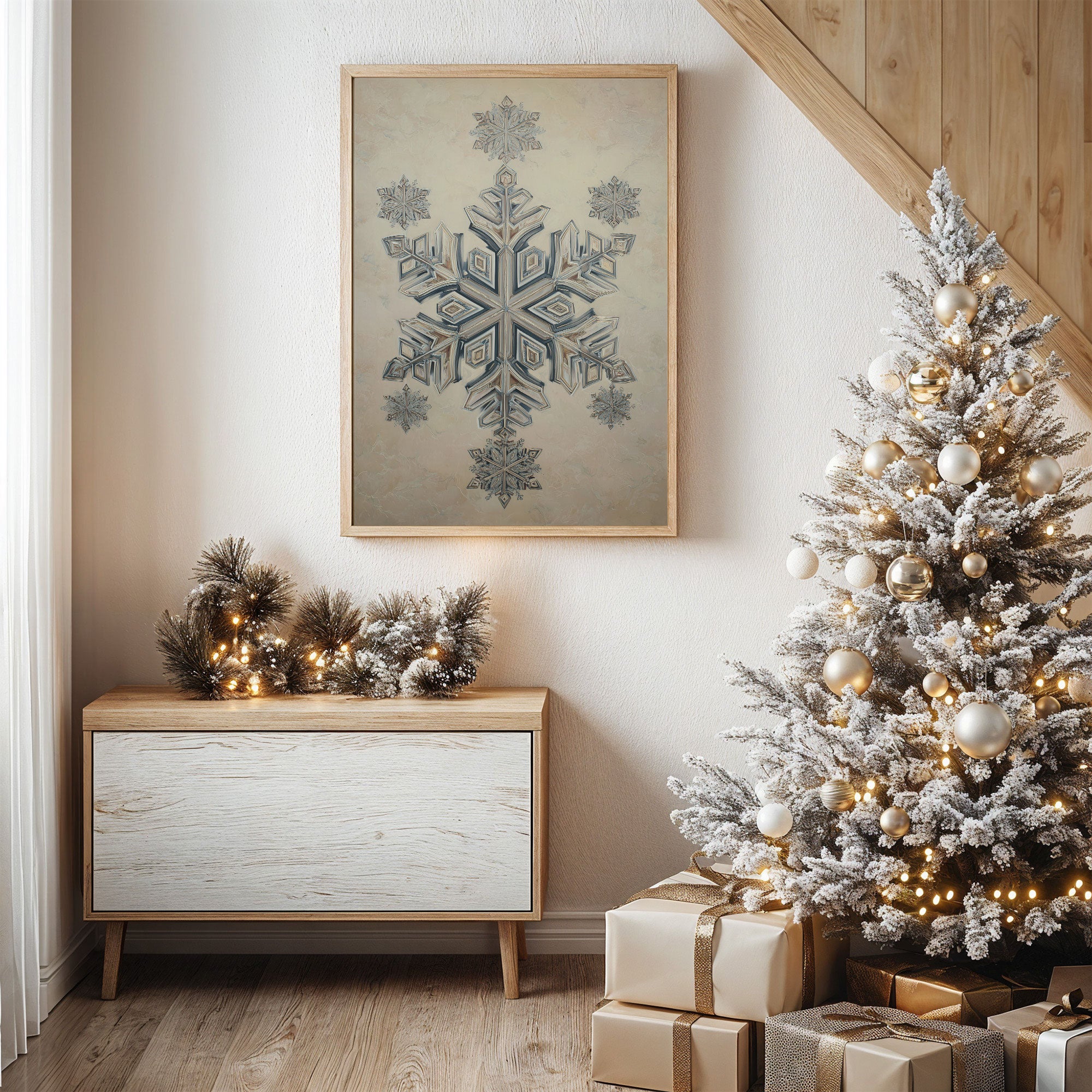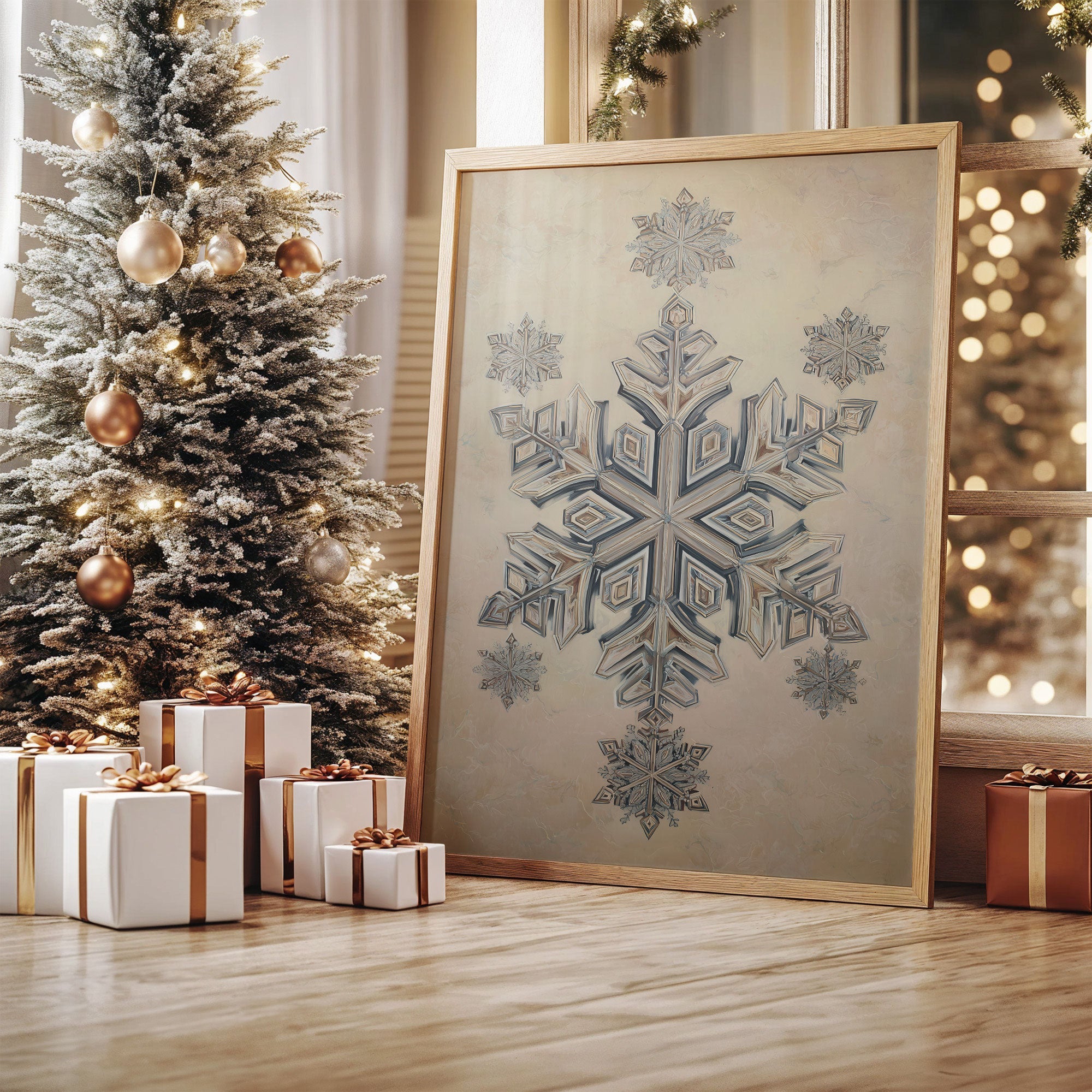 A delicate snowflake illustration captures winter's geometric poetry, rendered in soft blues and silvery whites against a cream background. The intricate crystalline design reveals layers of symmetrical patterns, each angle precisely crafted to reflect nature's mathematical beauty. The piece is photographed in a warm holiday setting, surrounded by the glow of Christmas lights and copper-toned ornaments, creating a harmonious blend of cool artistry and cozy ambiance. Perfect for bringing a touch of refined winter wonder to contemporary spaces, especially in dining rooms or entryways where its subtle elegance can be fully appreciated.