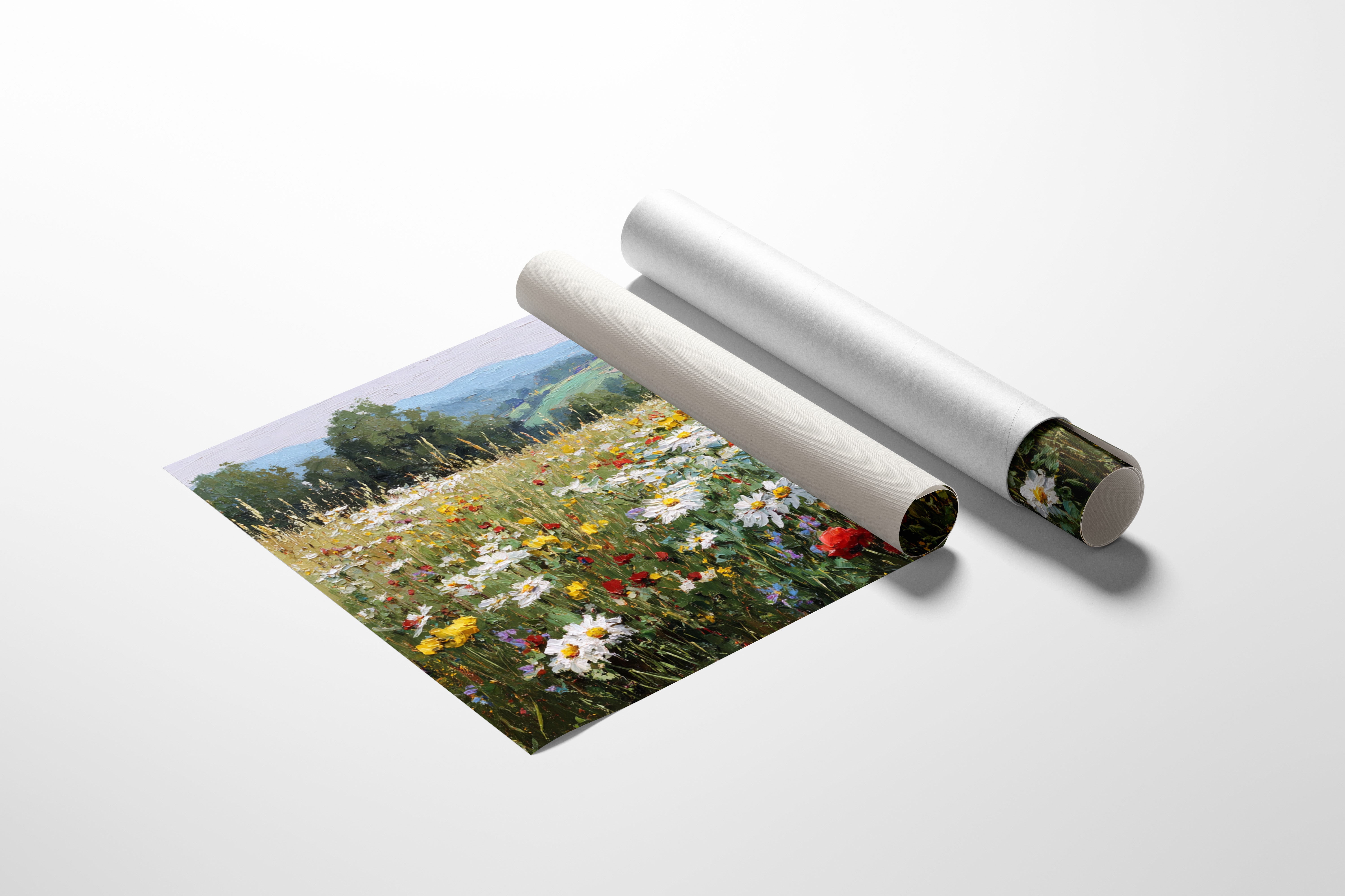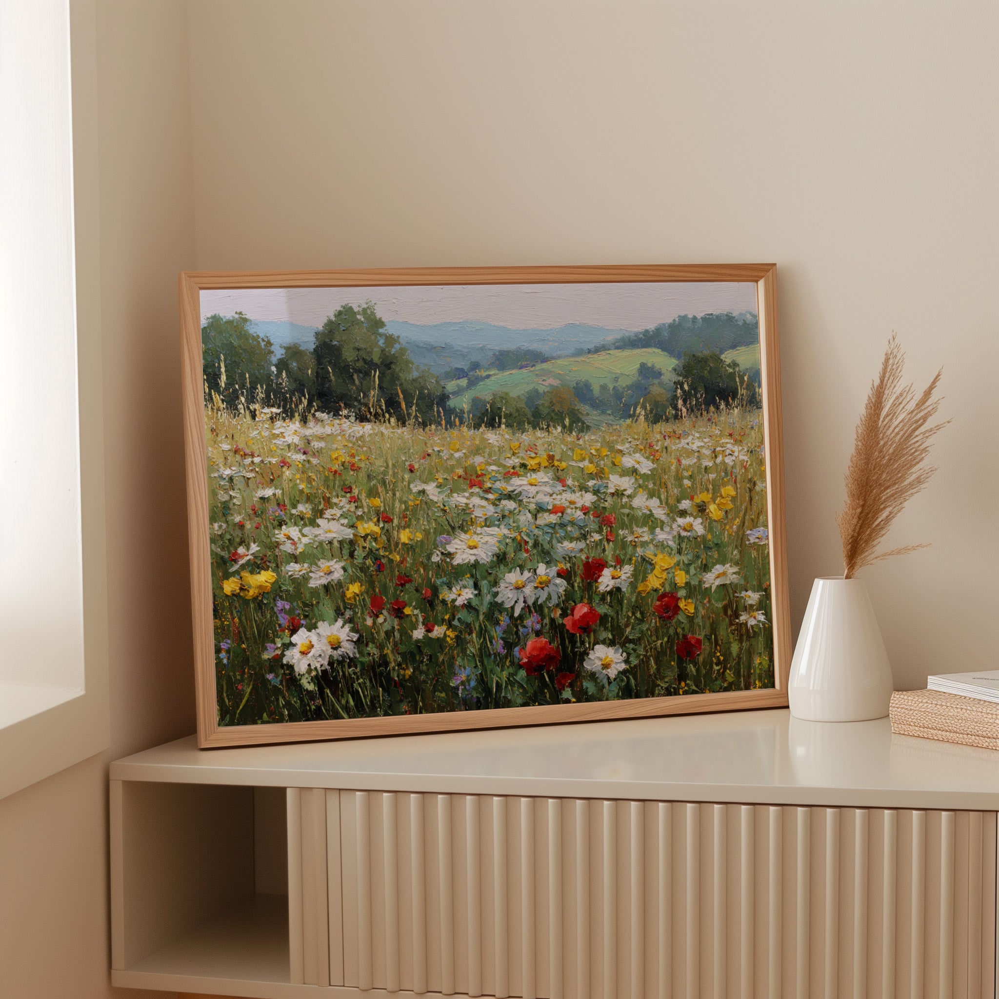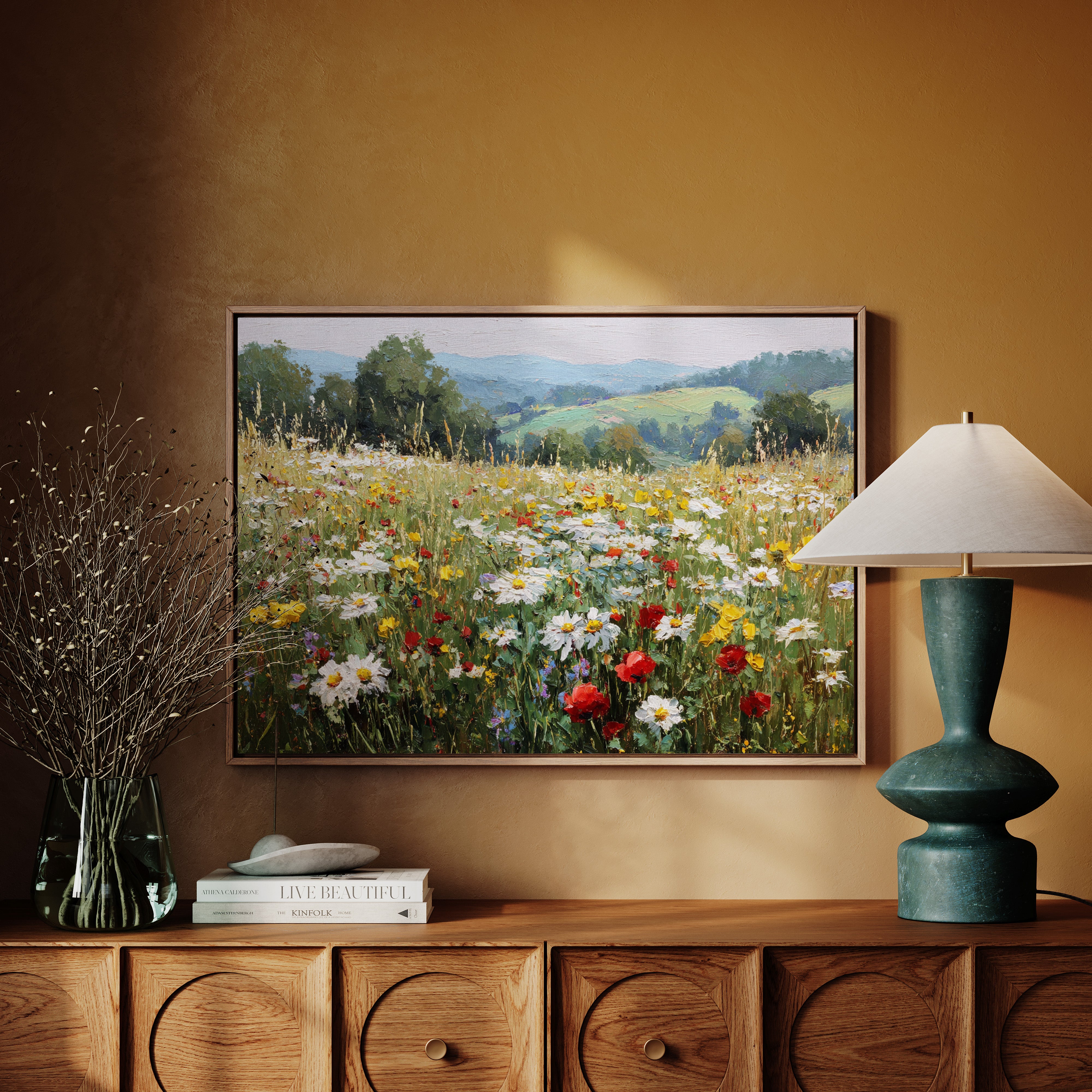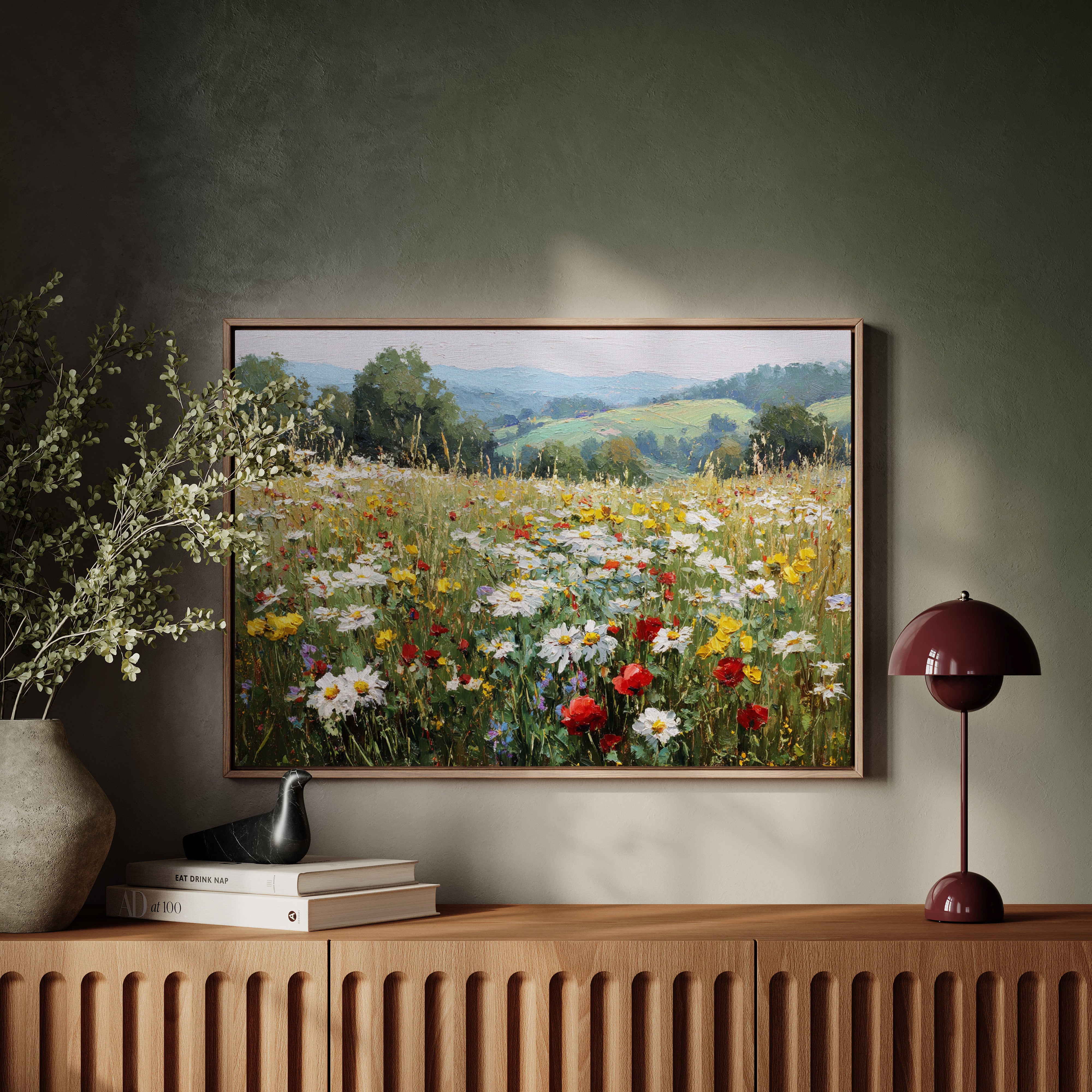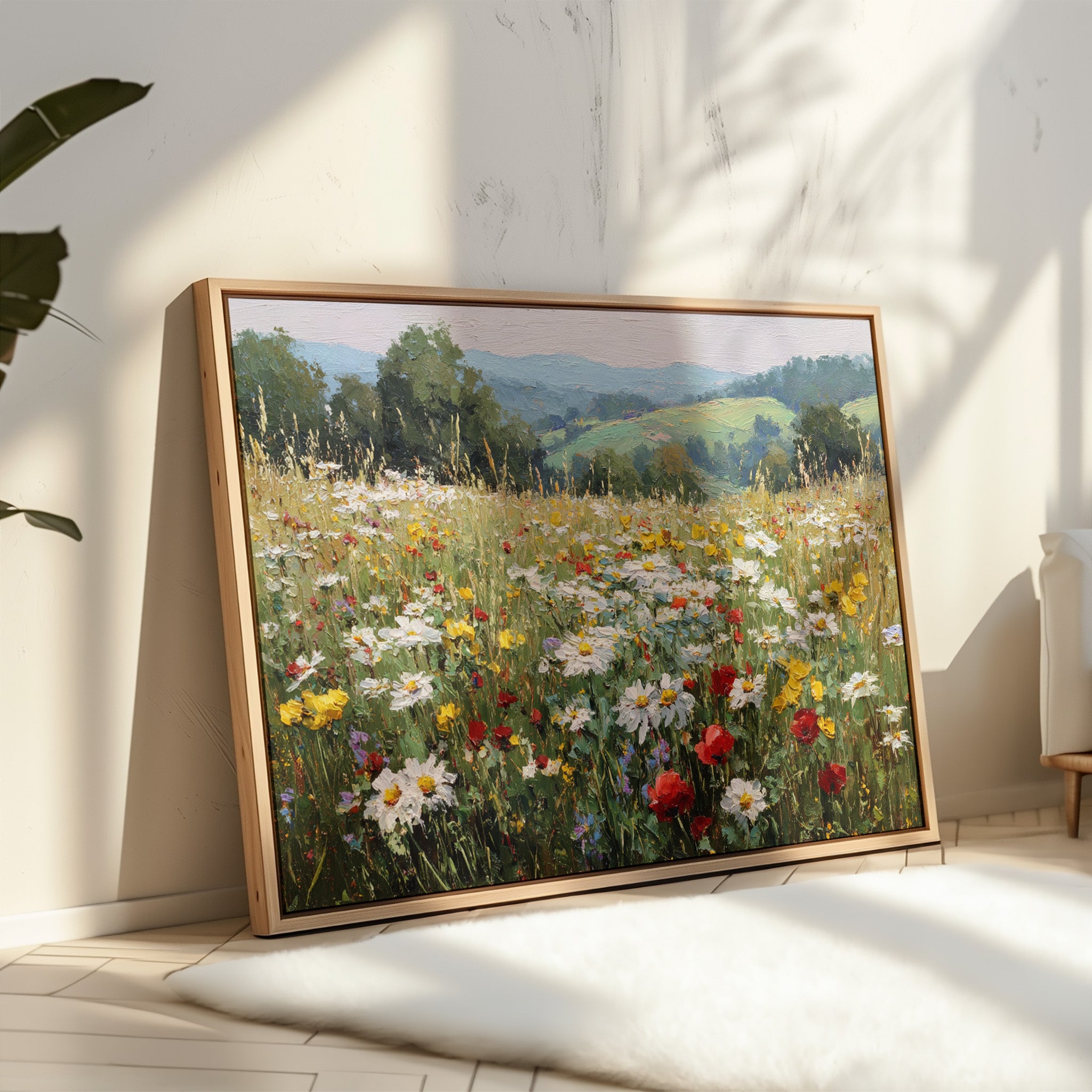 In a sun-drenched meadow, wildflowers sway gently, their vibrant hues painting the landscape with joy. This piece captures the essence of nature's artistry, showcasing a rich tapestry of blooms. Each daisy, poppy, and buttercup tells a story of resilience and beauty, with their colors harmonizing against a backdrop of rolling hills. Ideal for brightening a living room or creating a serene atmosphere in a sunlit hallway.