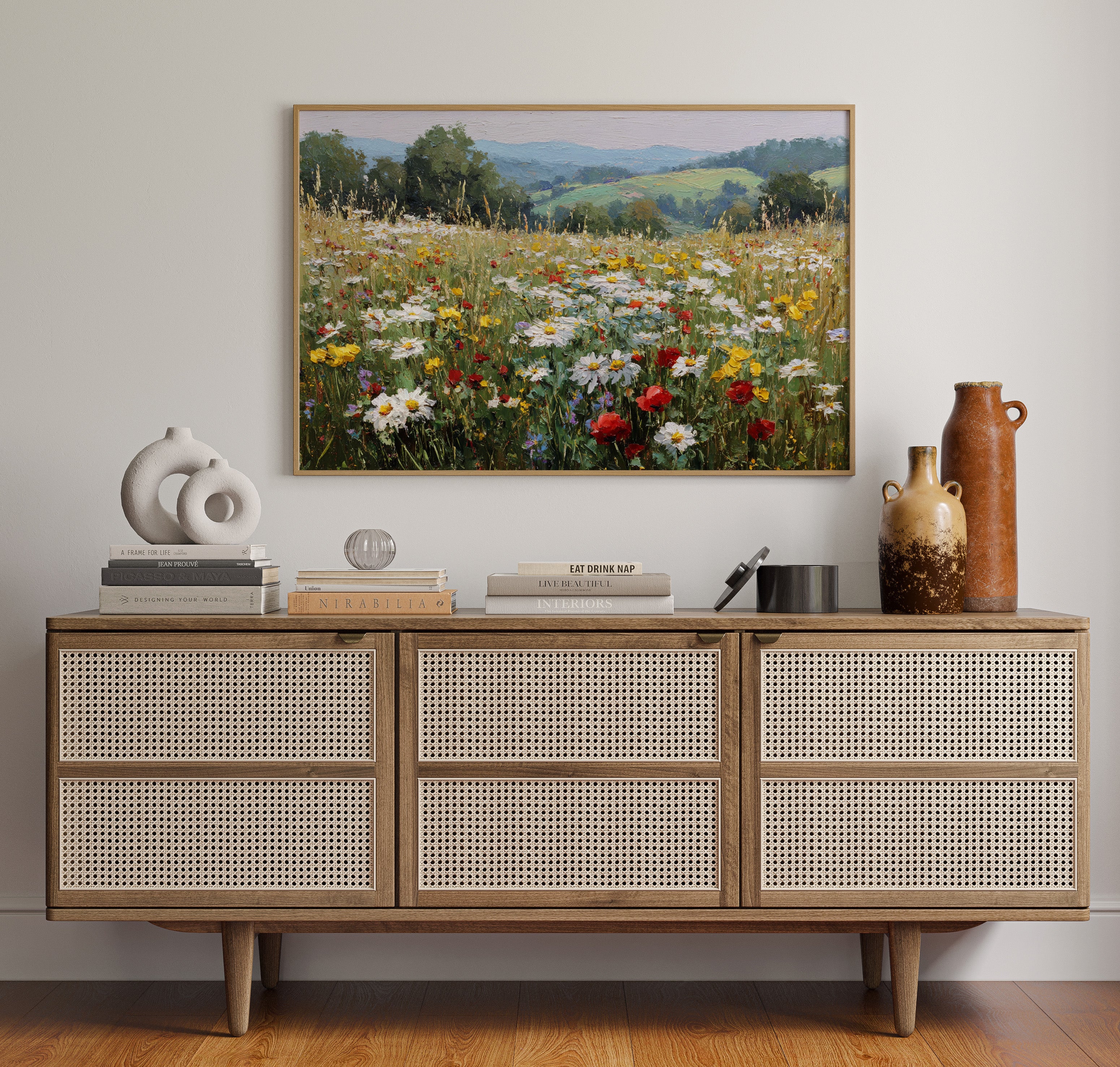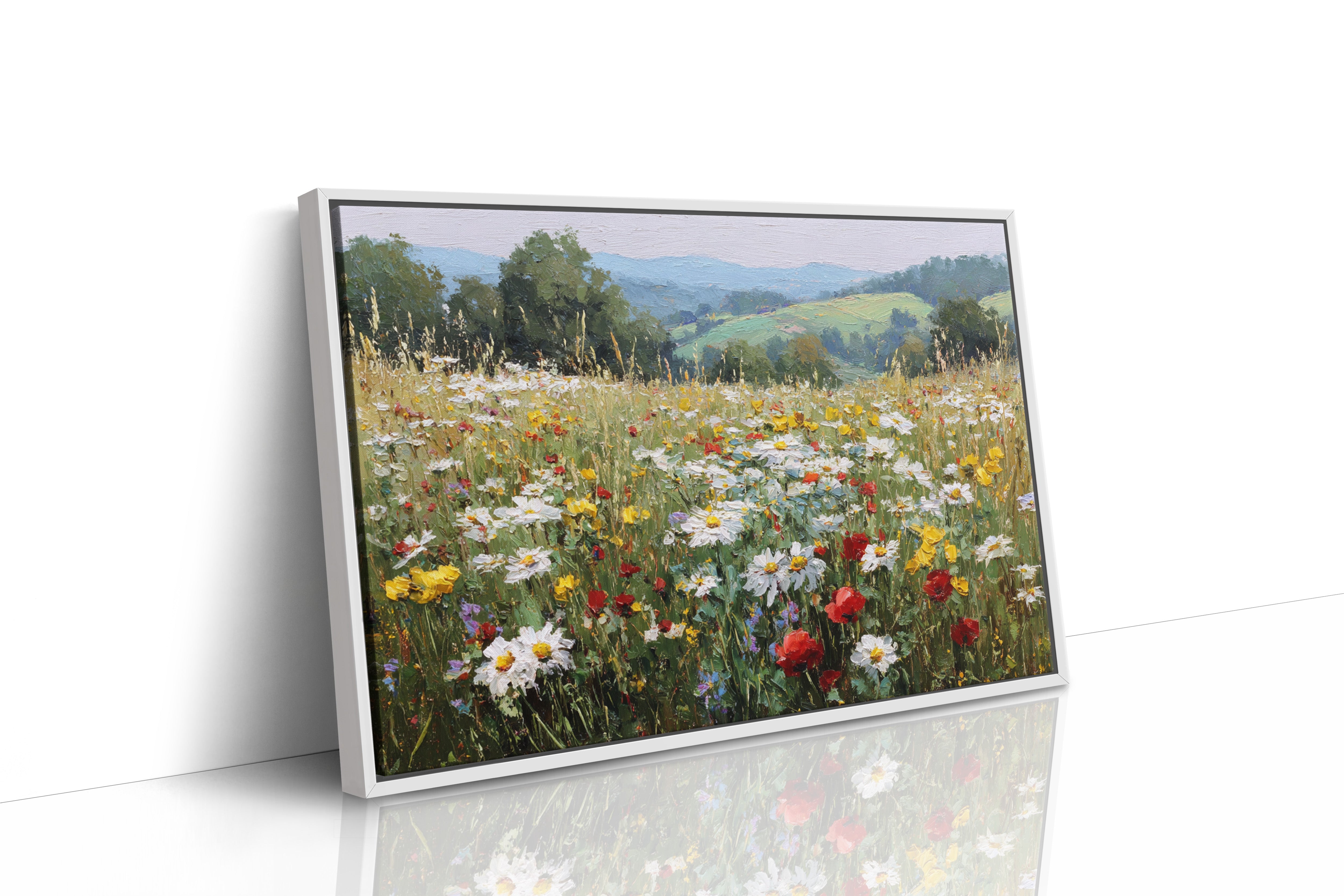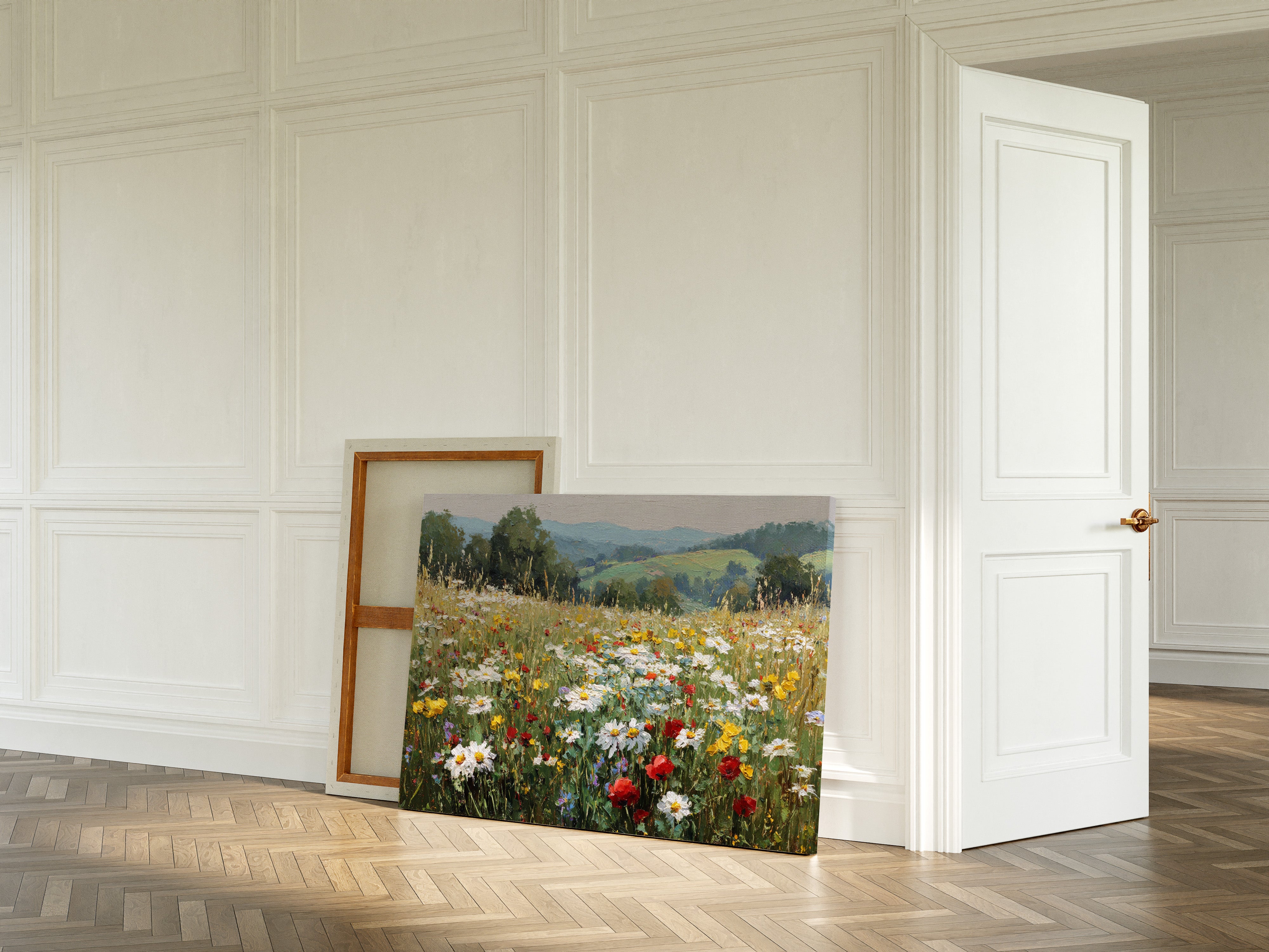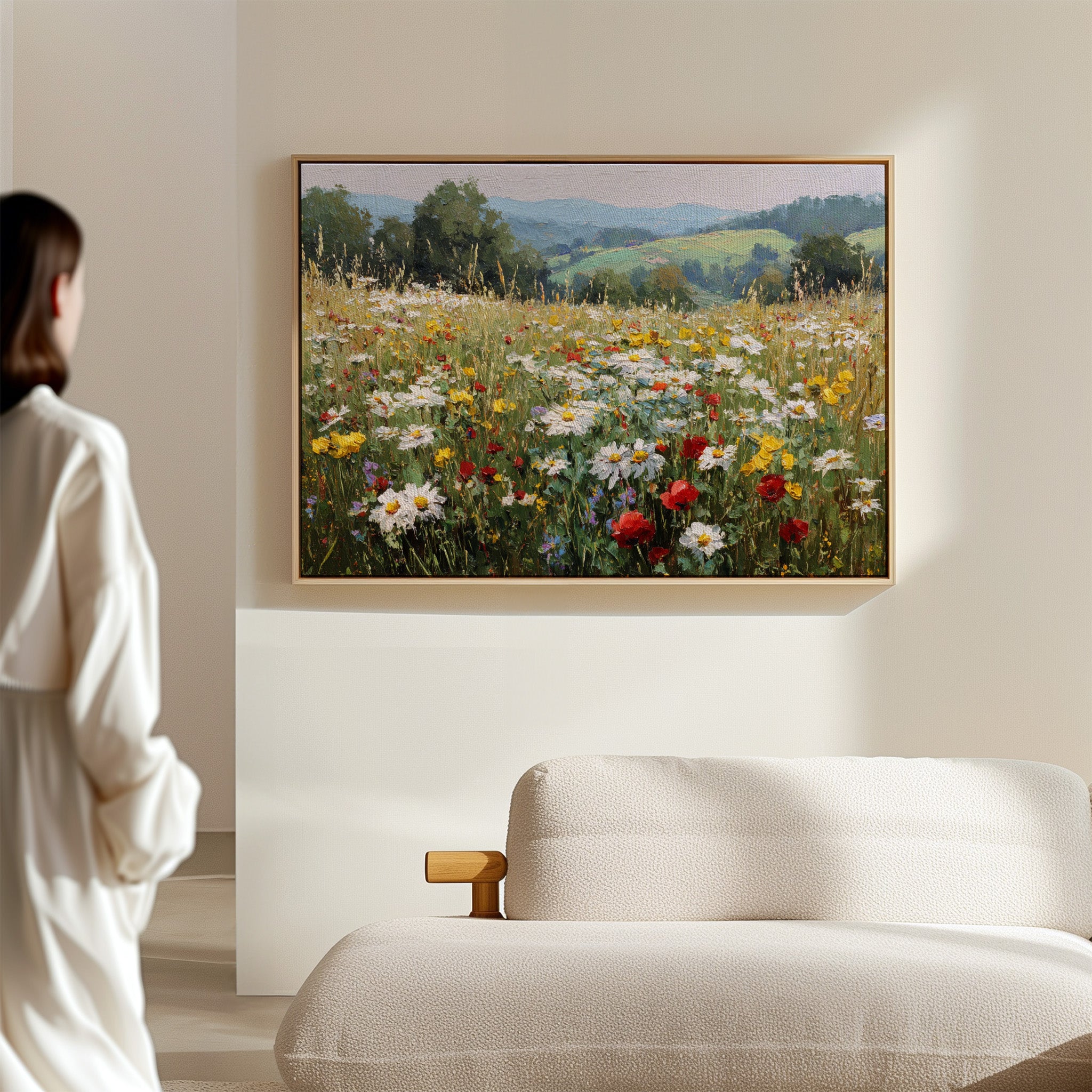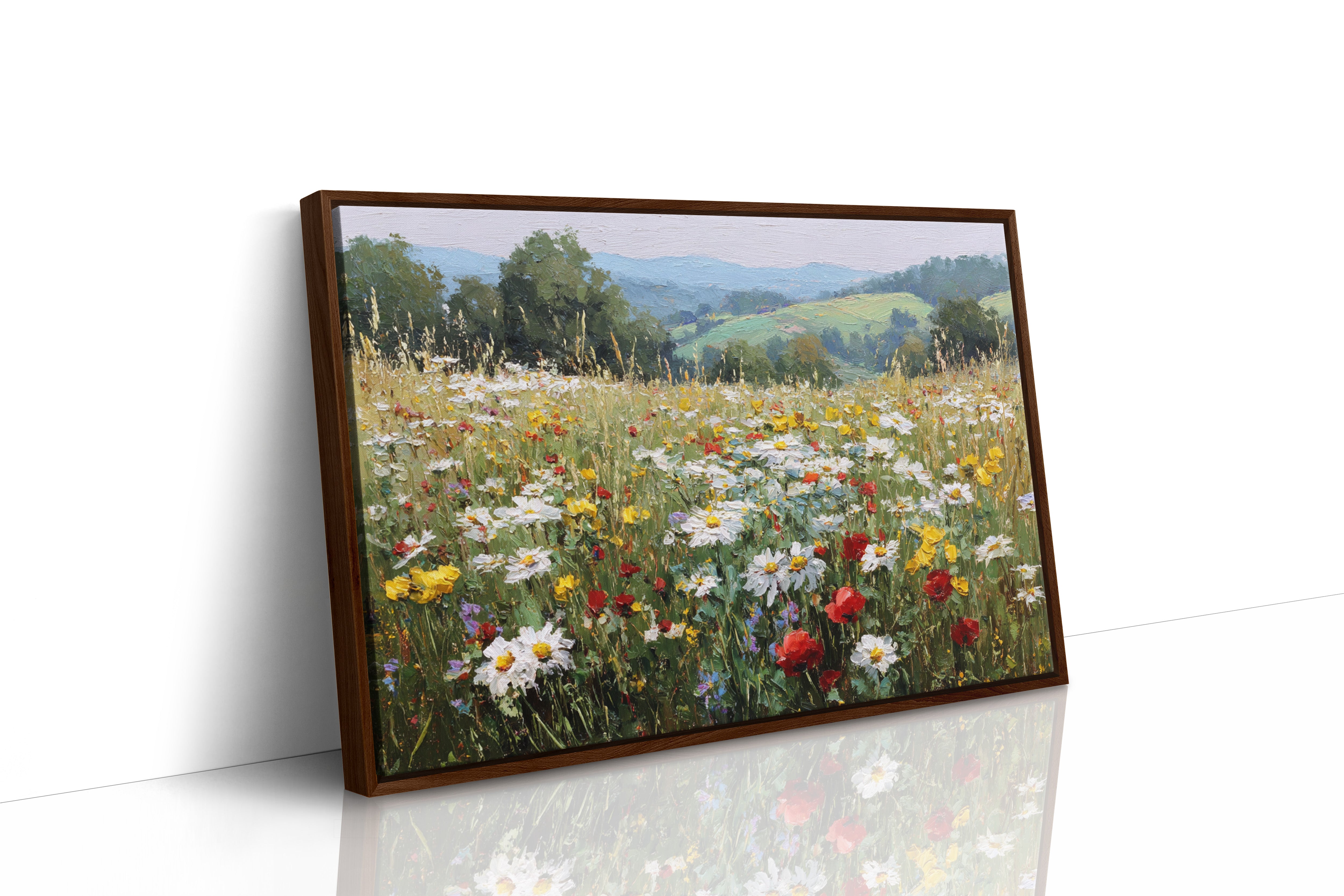 In a sun-drenched meadow, wildflowers sway gently, their vibrant hues painting the landscape with joy. This piece captures the essence of nature's artistry, showcasing a rich tapestry of blooms. Each daisy, poppy, and buttercup tells a story of resilience and beauty, with their colors harmonizing against a backdrop of rolling hills. Ideal for brightening a living room or creating a serene atmosphere in a sunlit hallway.