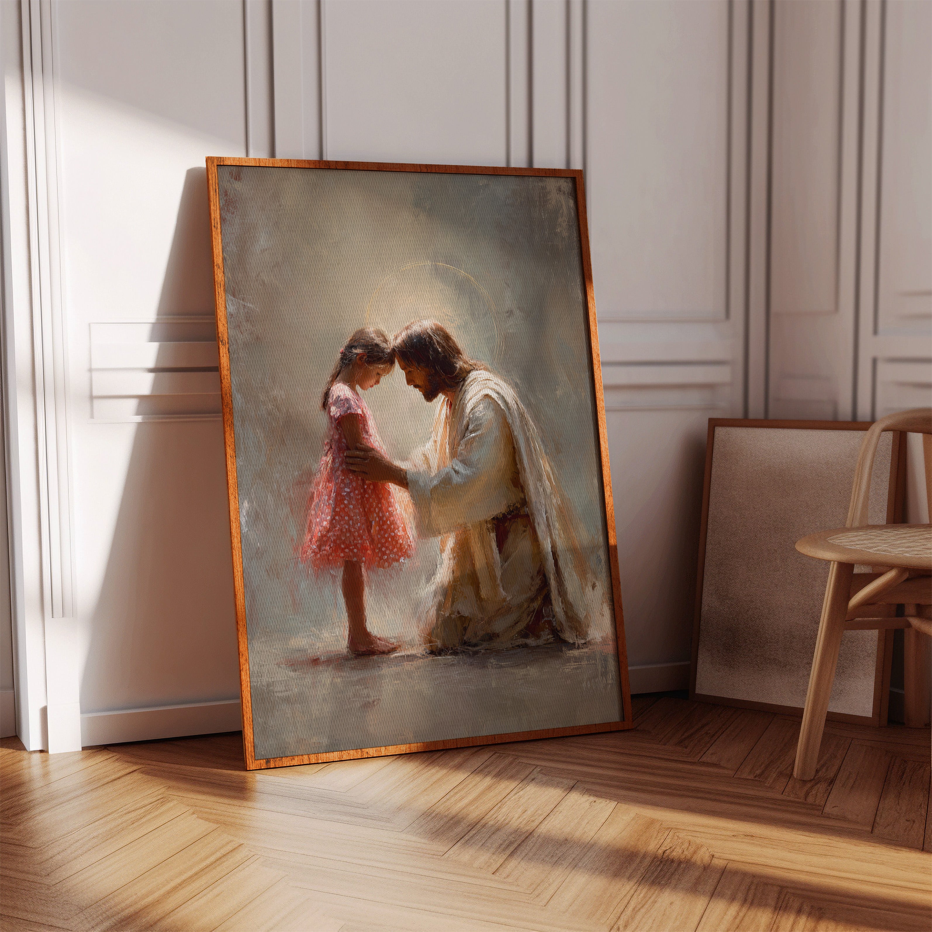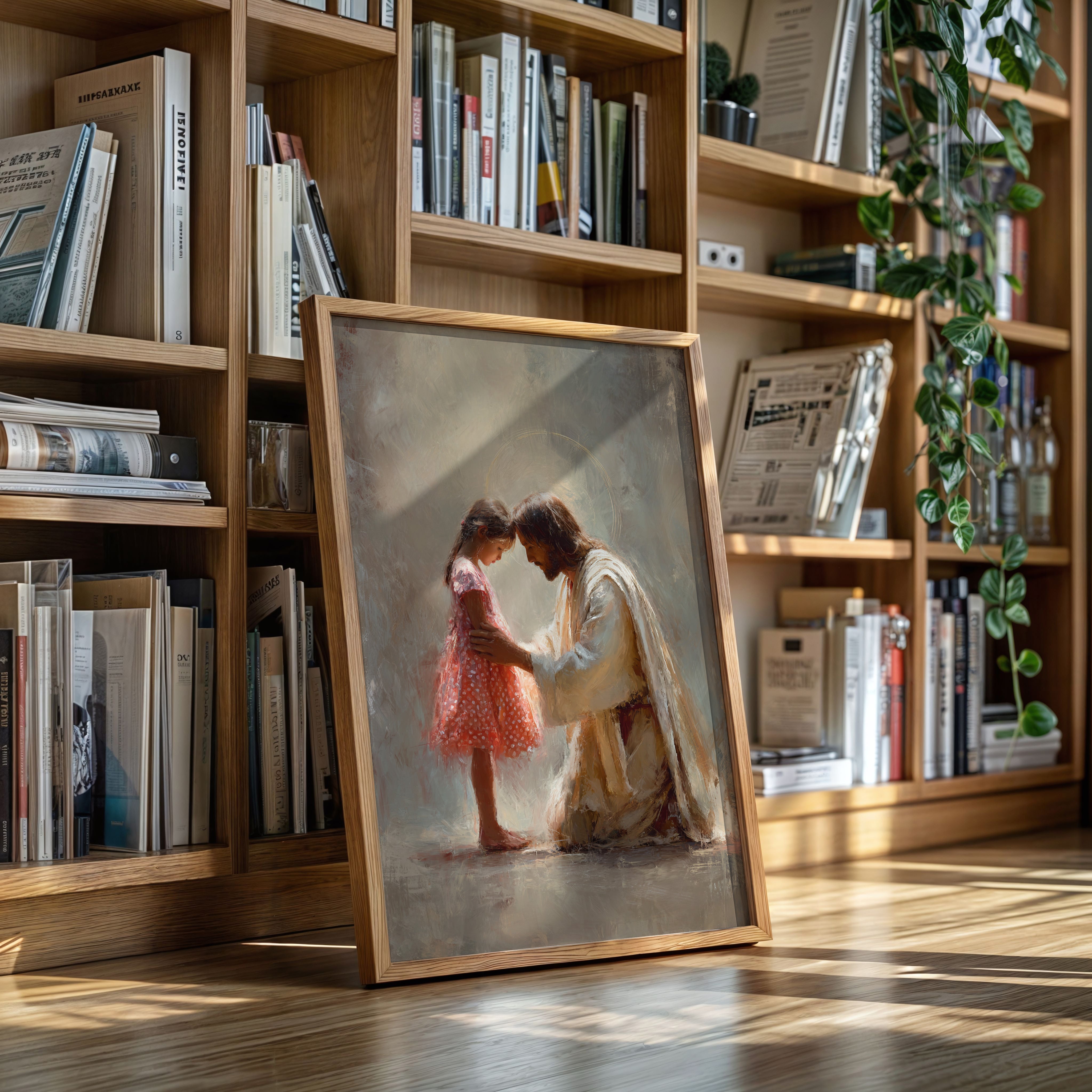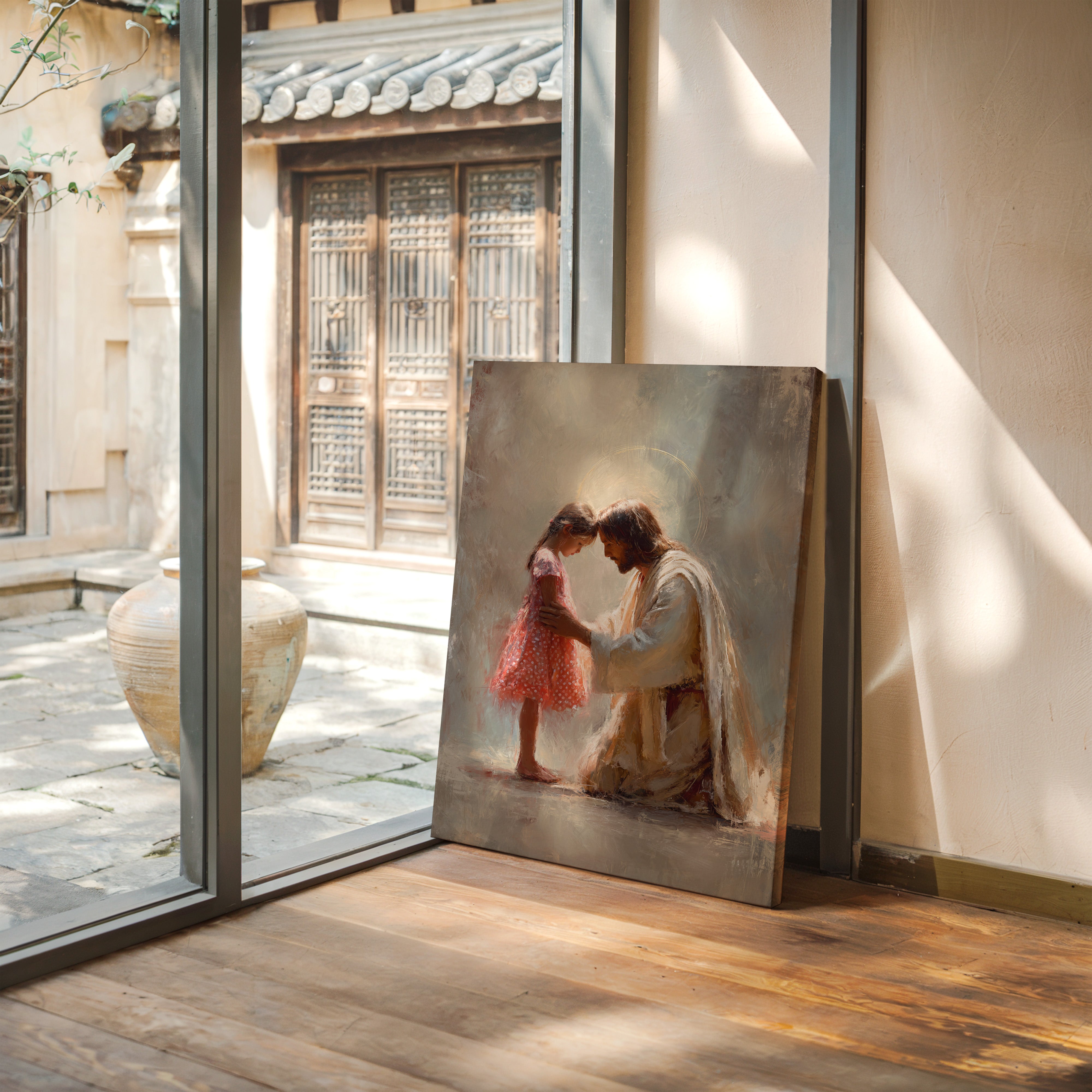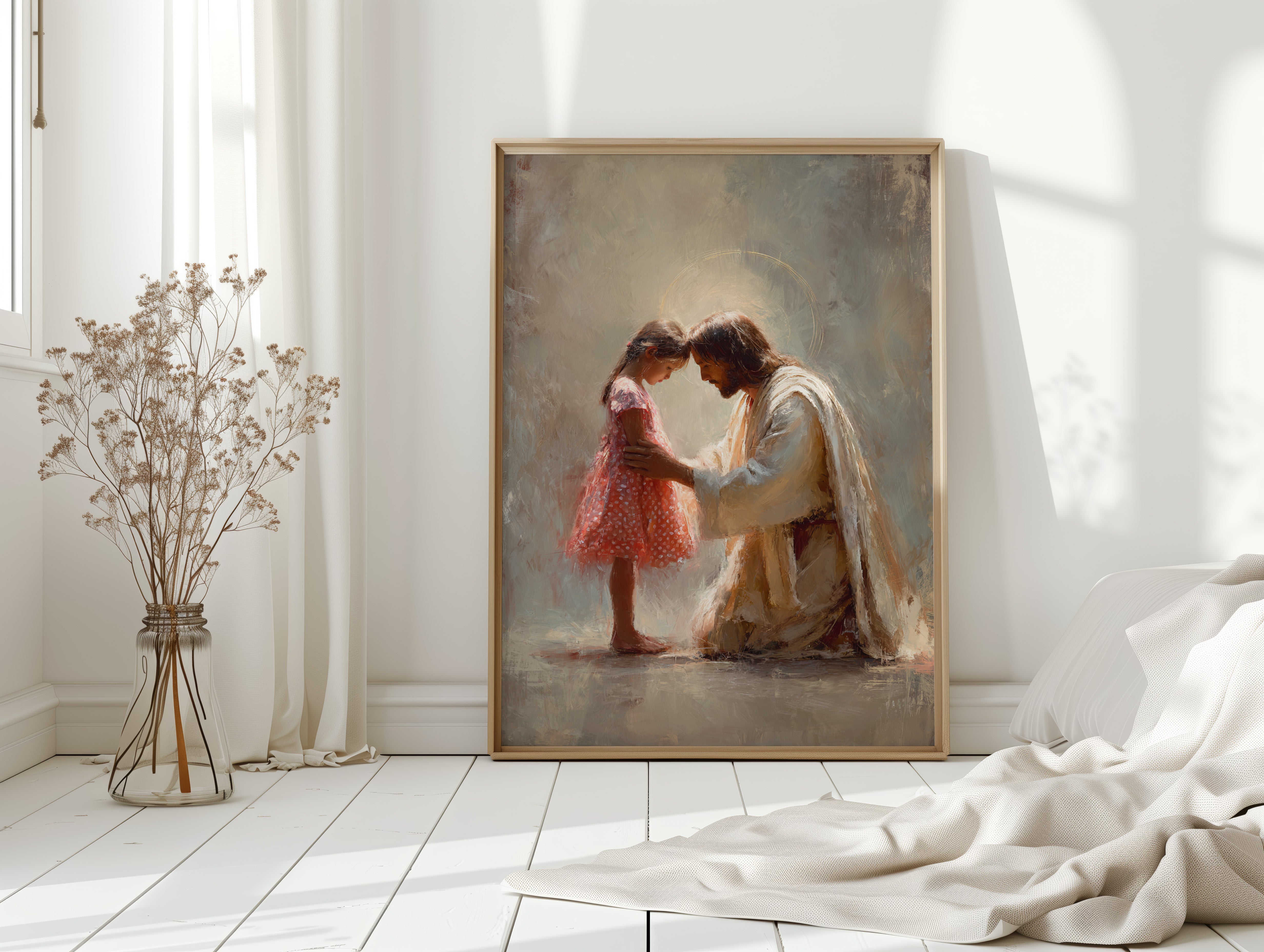 In a moment suspended in time, a figure kneels, embodying compassion as a child gazes down with innocence and wonder. This piece is a heartfelt testament to the bond between the sacred and the vulnerable. The soft hues blend seamlessly, creating a warm atmosphere that invites contemplation and connection. The delicate textures and expressive brushstrokes evoke a sense of peace and hope, inviting viewers to share in this intimate encounter. Ideal for a serene space, this piece brings warmth and inspiration to a child's room or a tranquil reading nook.