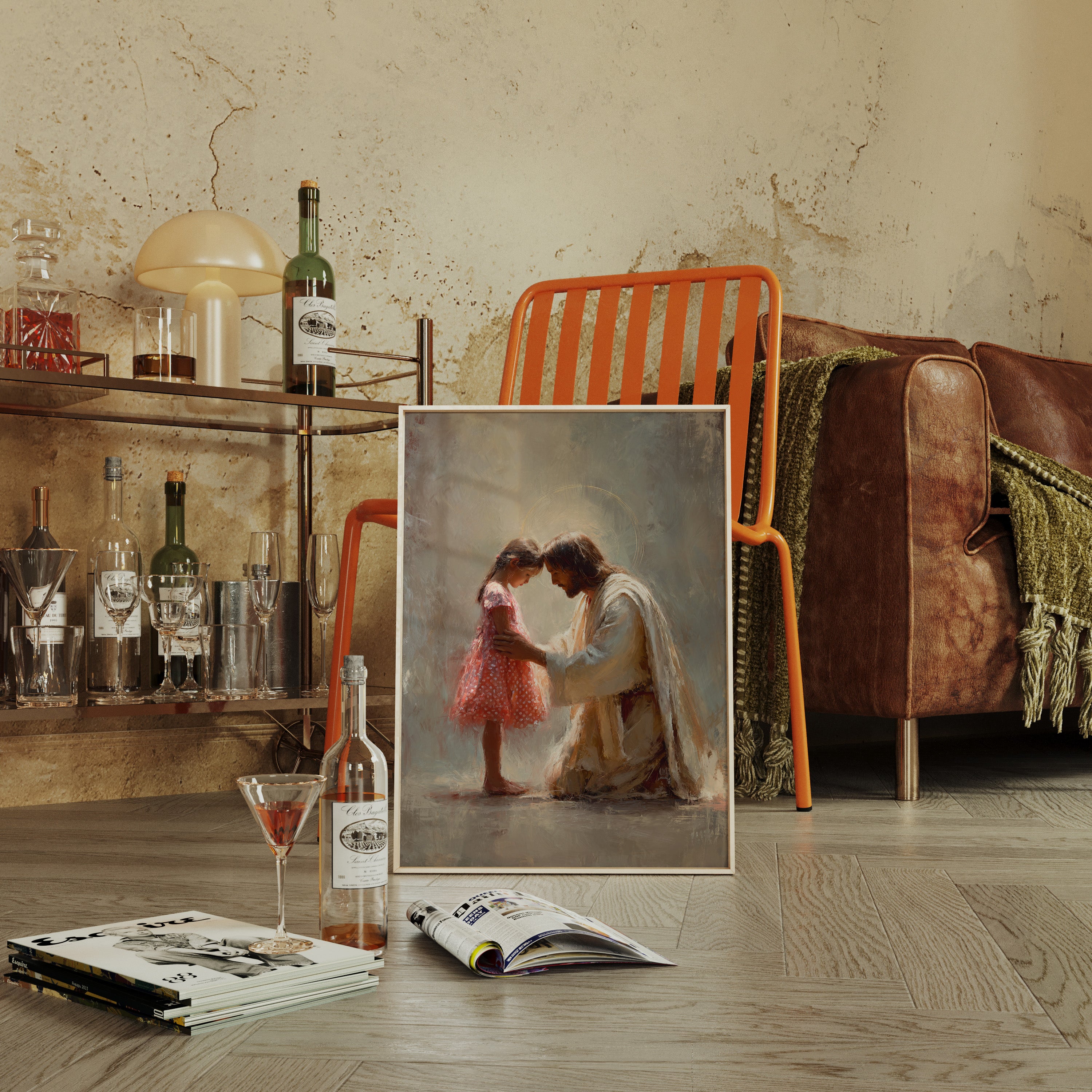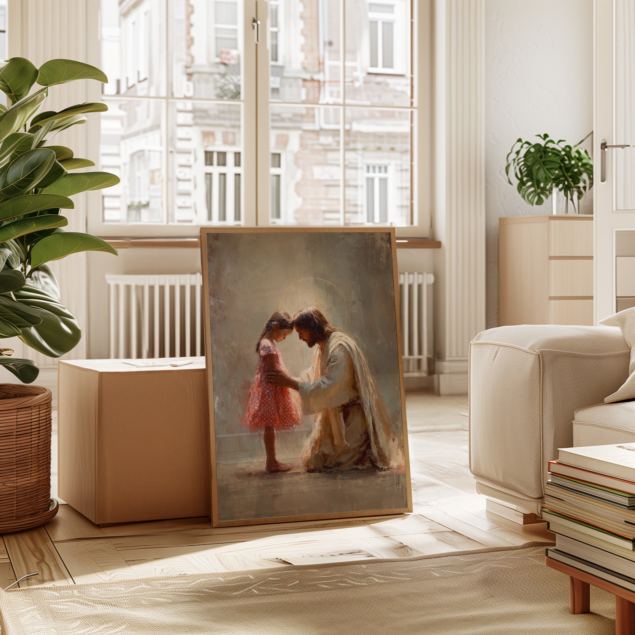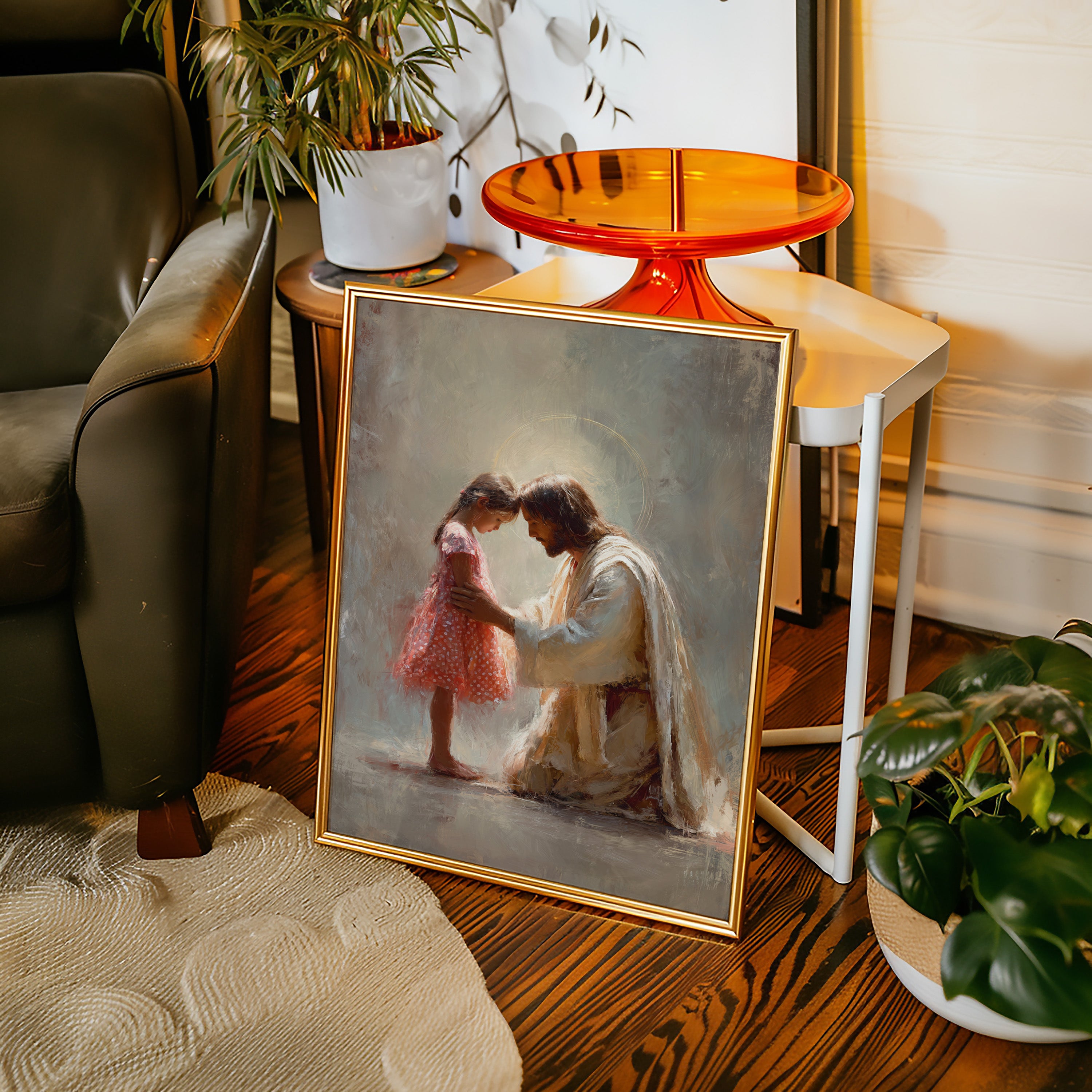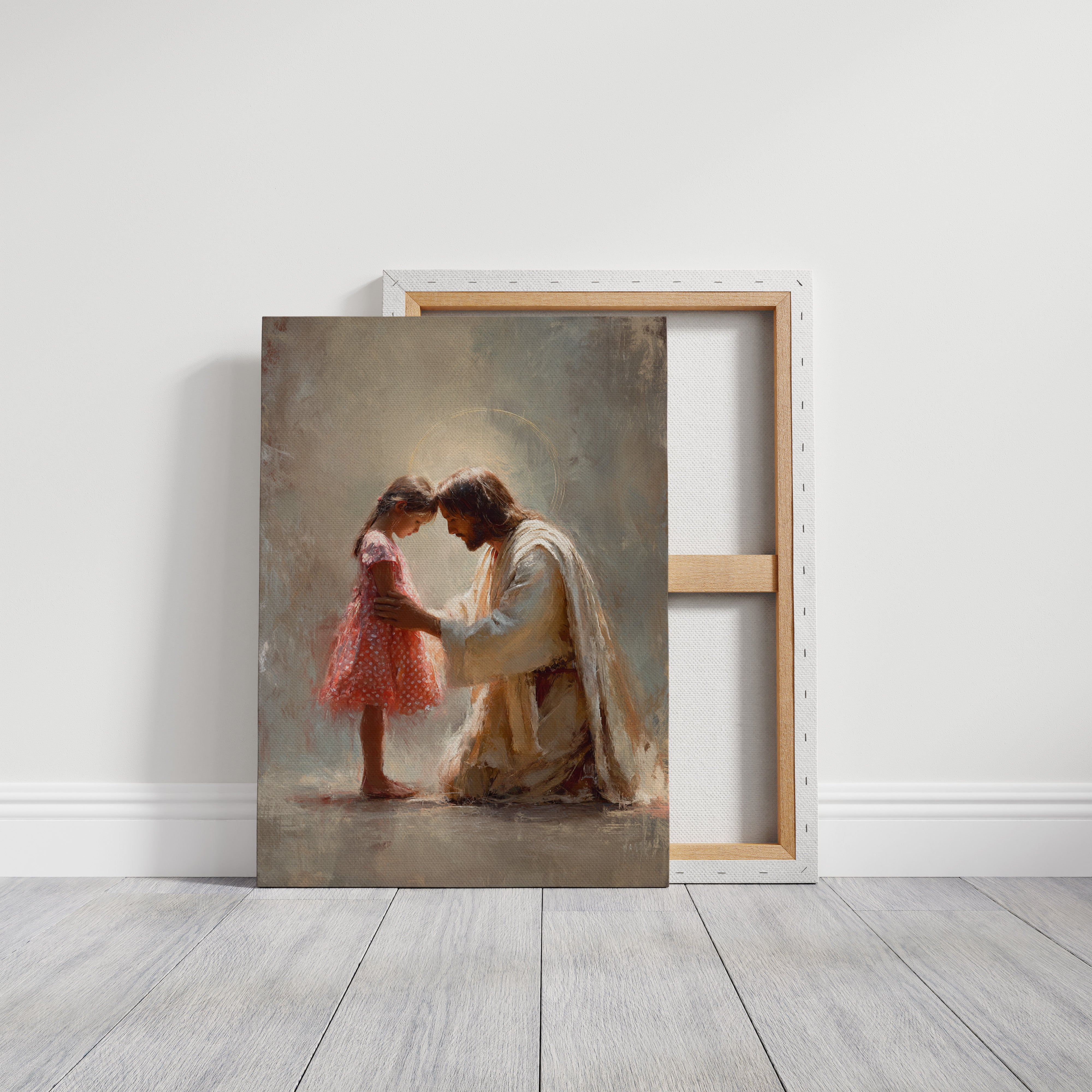 In a moment suspended in time, a figure kneels, embodying compassion as a child gazes down with innocence and wonder. This piece is a heartfelt testament to the bond between the sacred and the vulnerable. The soft hues blend seamlessly, creating a warm atmosphere that invites contemplation and connection. The delicate textures and expressive brushstrokes evoke a sense of peace and hope, inviting viewers to share in this intimate encounter. Ideal for a serene space, this piece brings warmth and inspiration to a child's room or a tranquil reading nook.