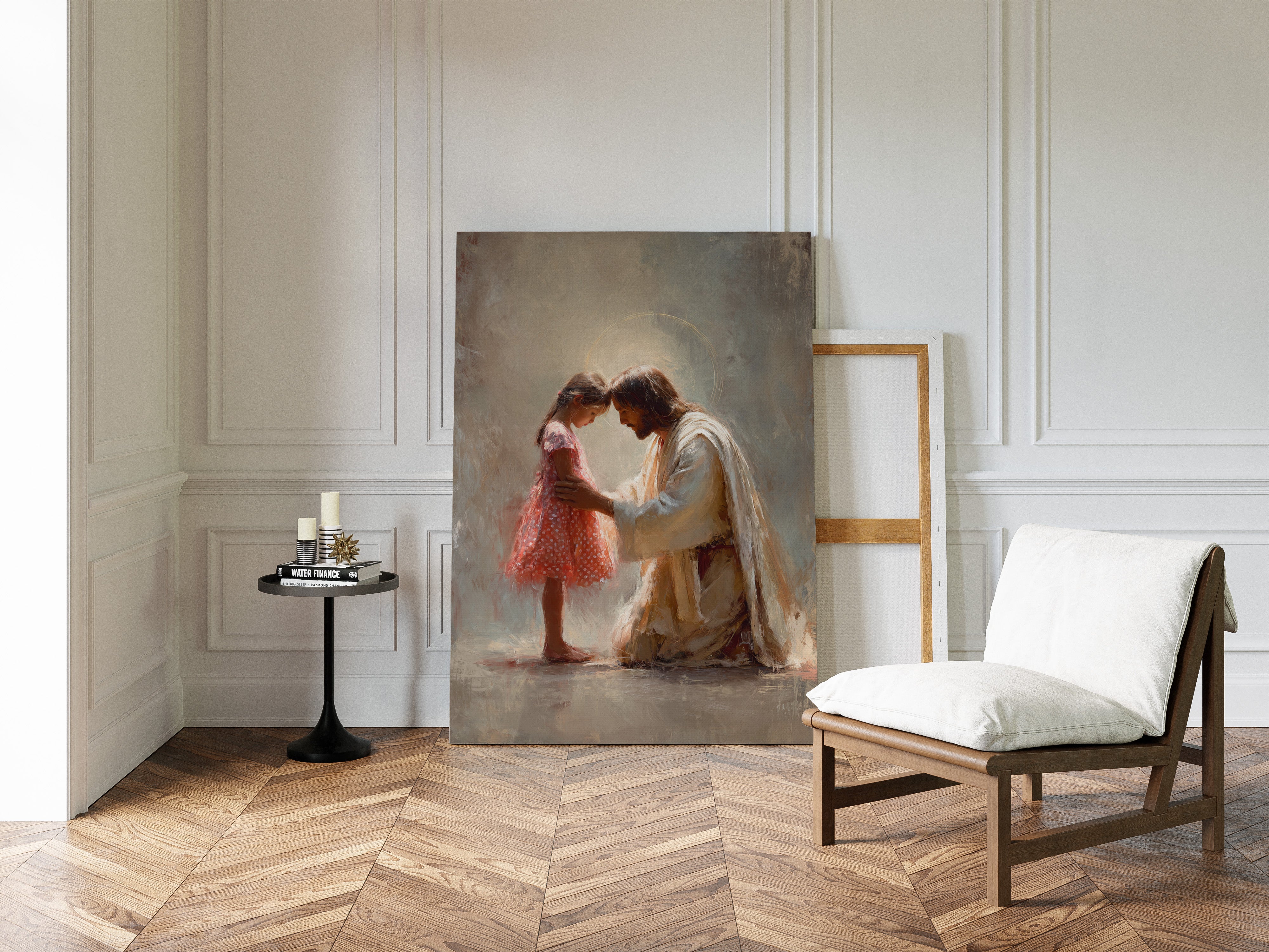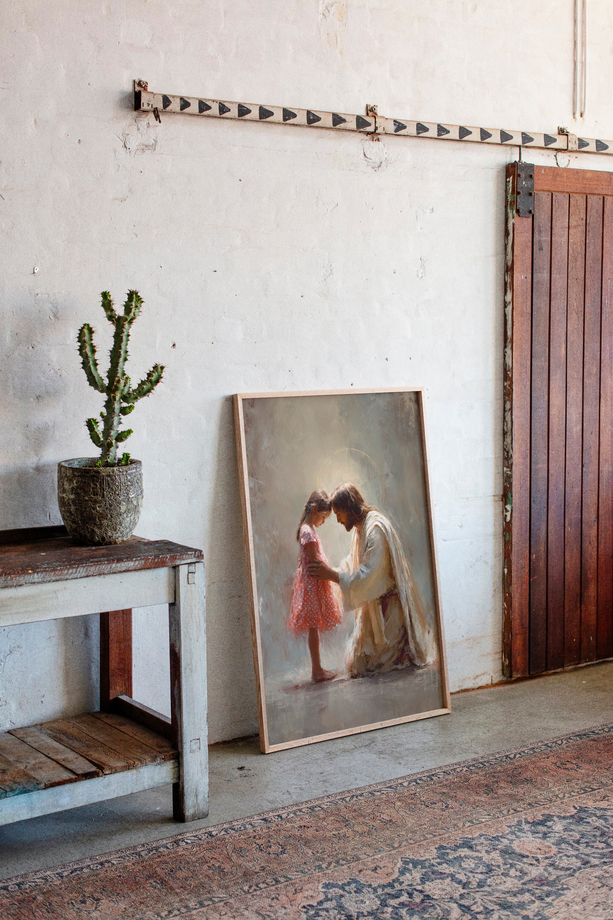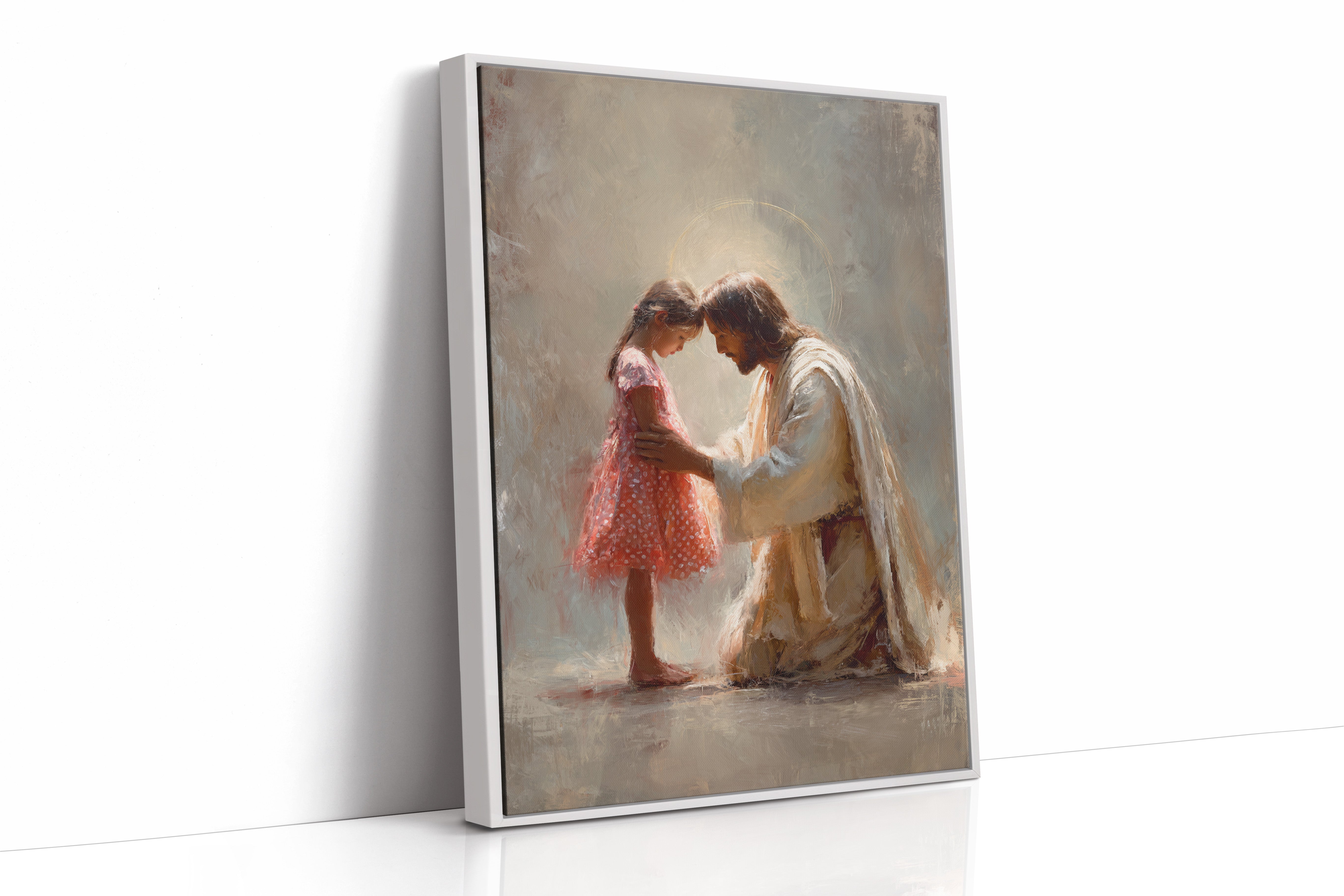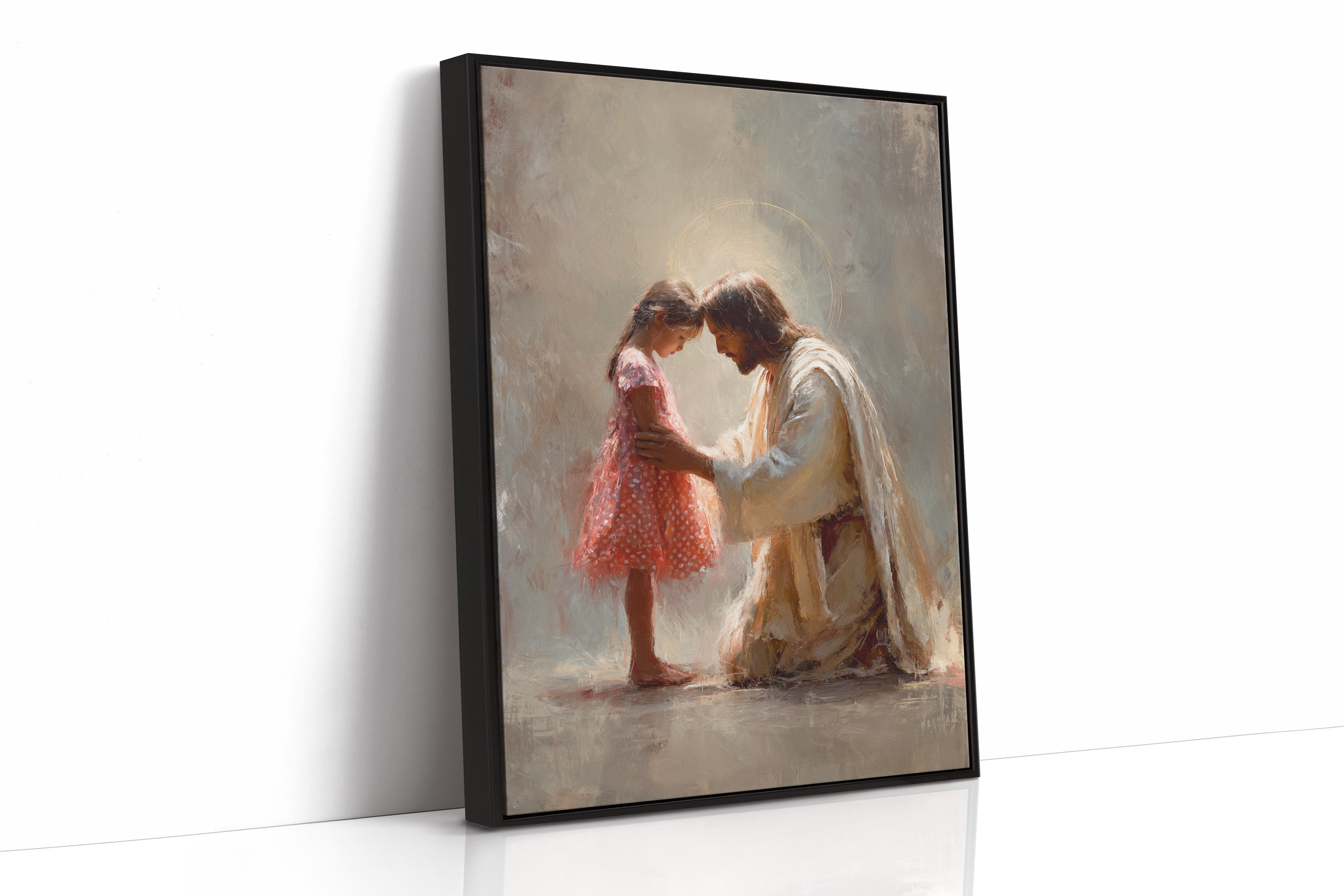 In a moment suspended in time, a figure kneels, embodying compassion as a child gazes down with innocence and wonder. This piece is a heartfelt testament to the bond between the sacred and the vulnerable. The soft hues blend seamlessly, creating a warm atmosphere that invites contemplation and connection. The delicate textures and expressive brushstrokes evoke a sense of peace and hope, inviting viewers to share in this intimate encounter. Ideal for a serene space, this piece brings warmth and inspiration to a child's room or a tranquil reading nook.