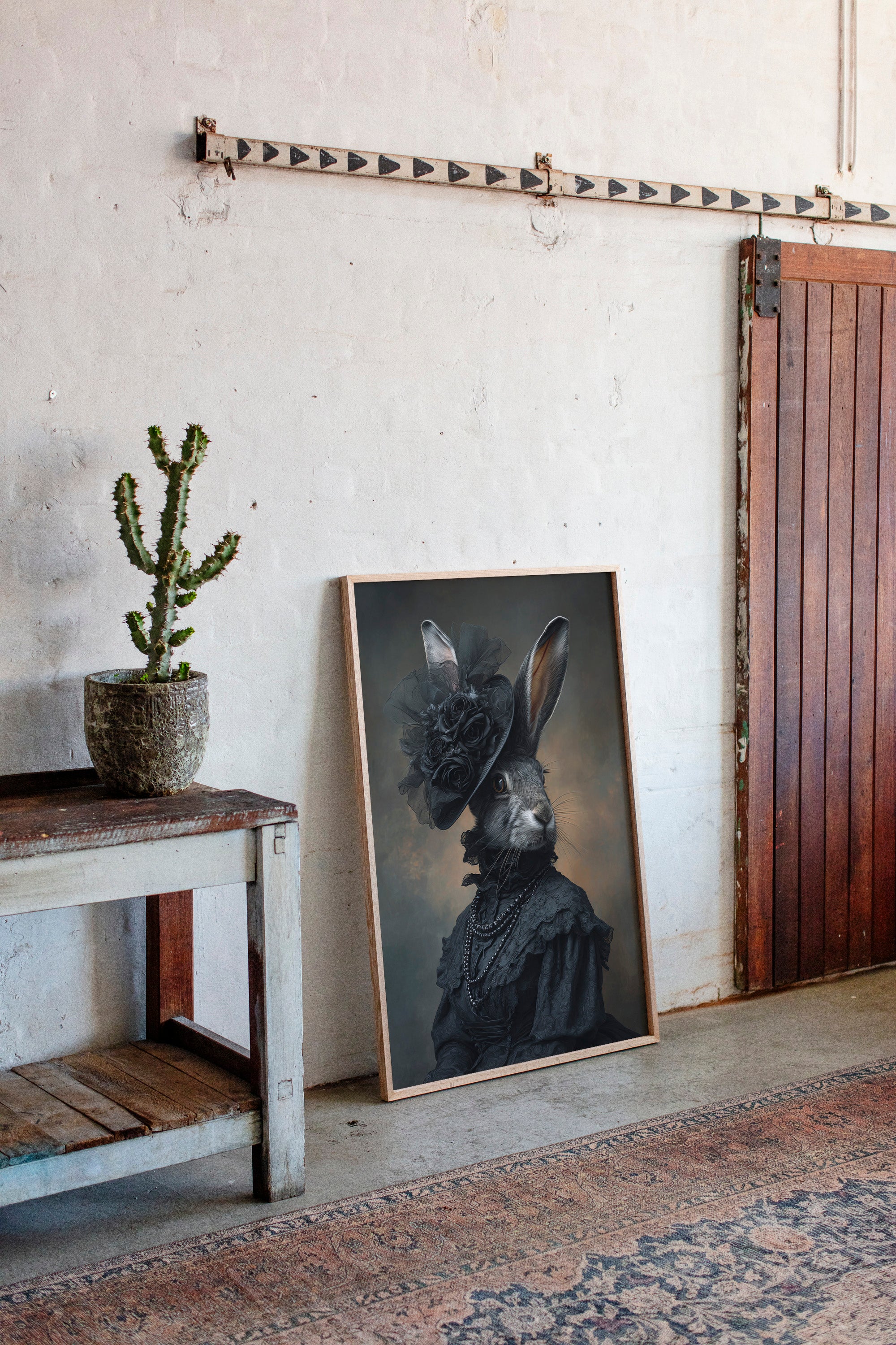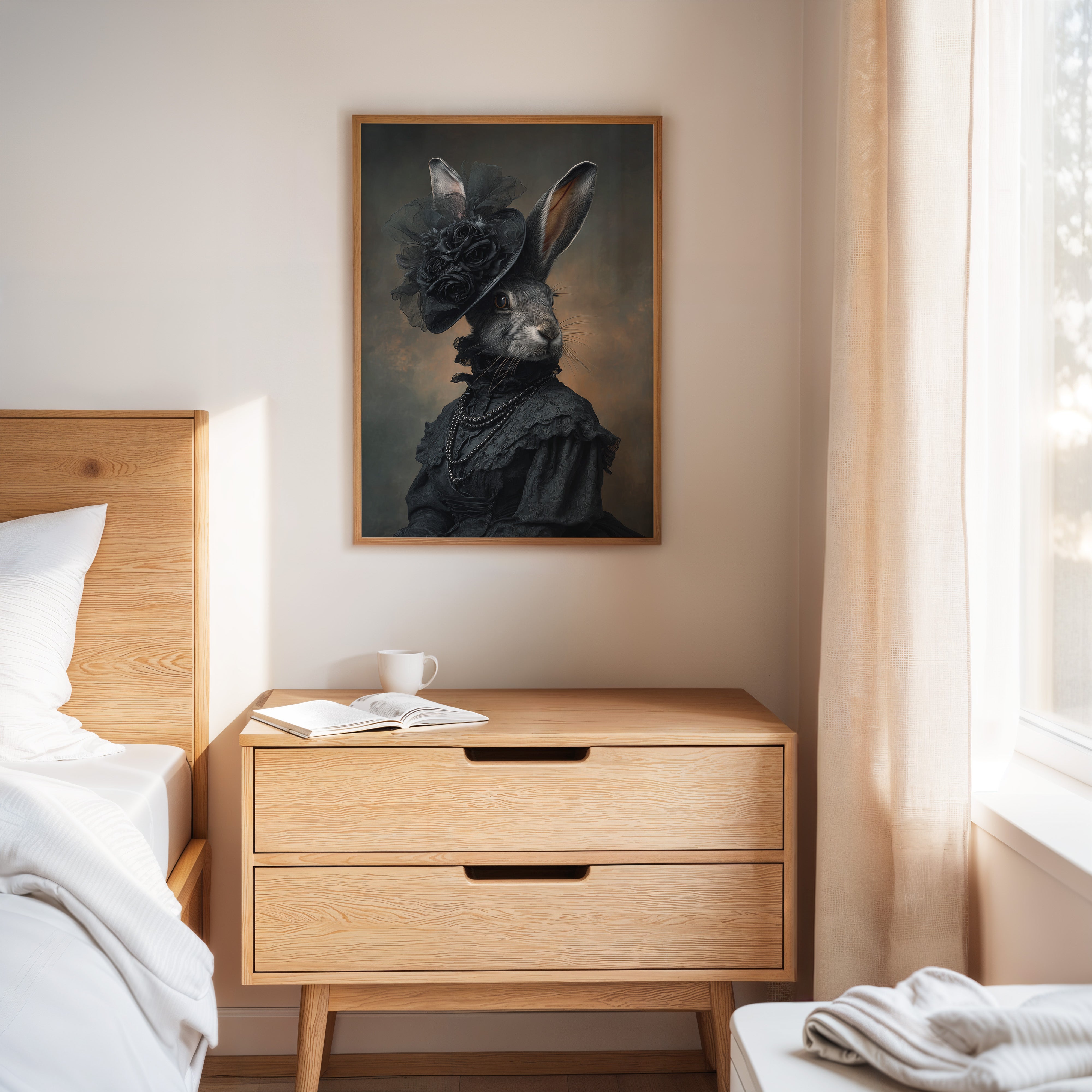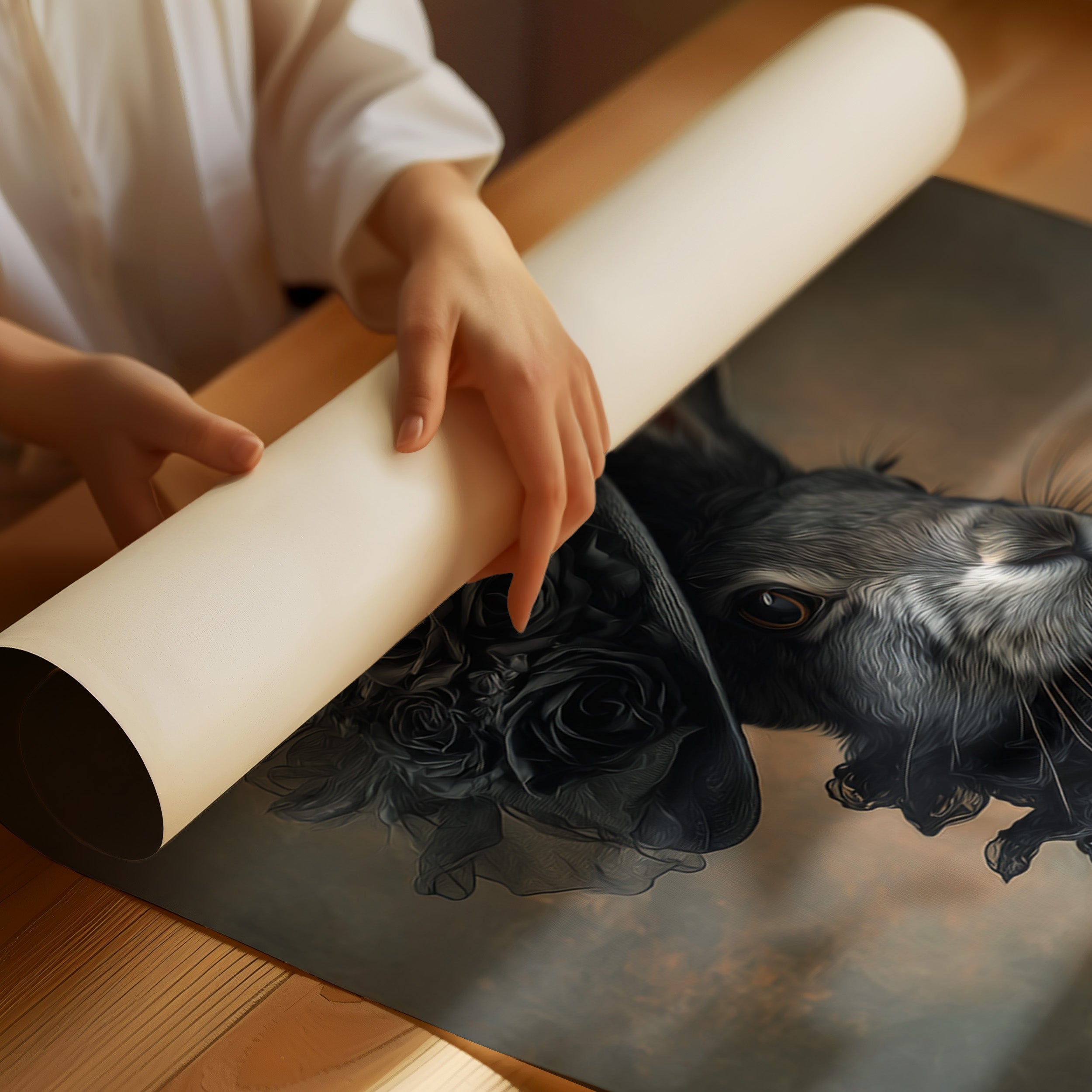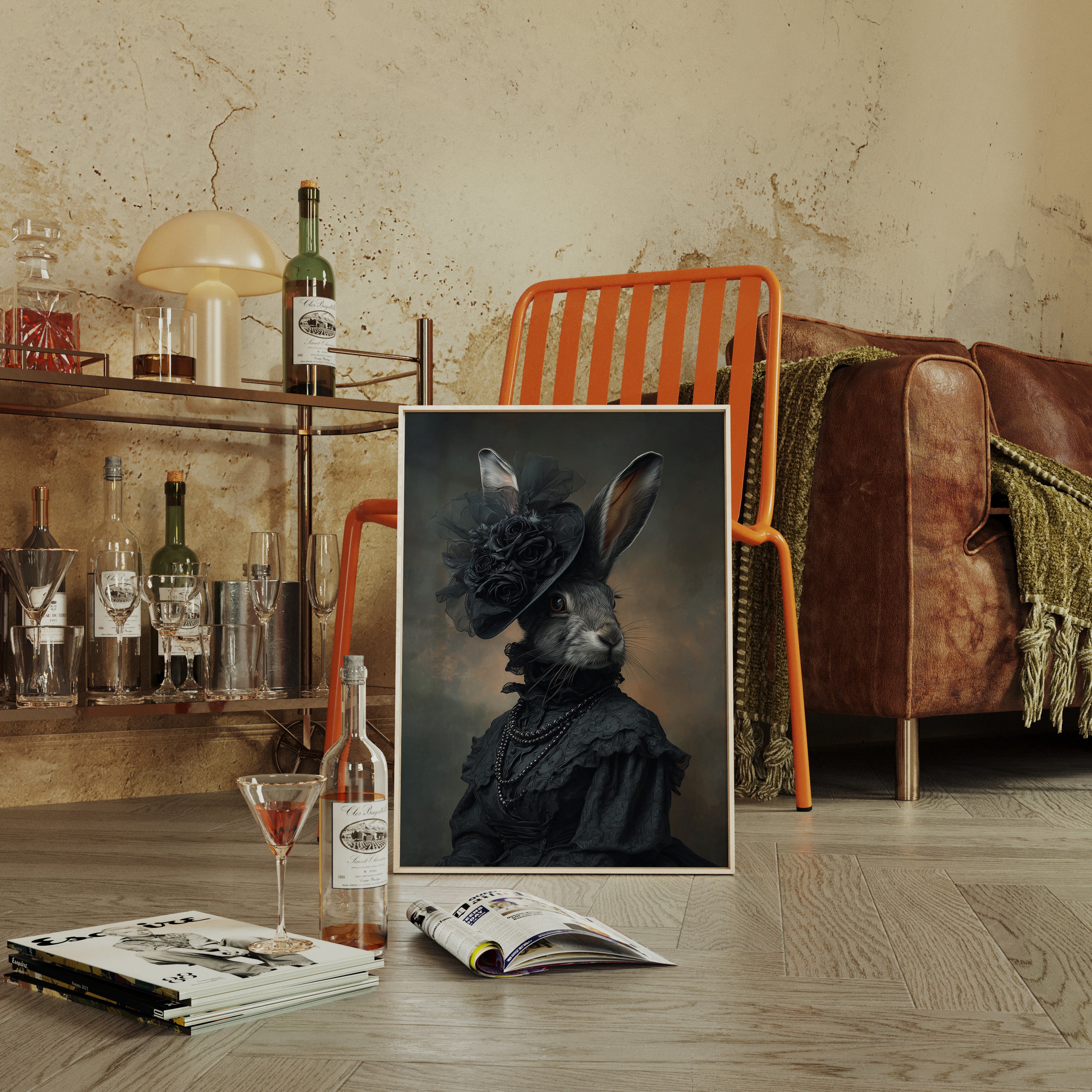 In the soft glow of twilight, a rabbit dons its finest attire, exuding an air of regal charm. This piece captures the whimsical essence of the Artisanal collection, blending fantasy with refined artistry. Adorned in layers of lace and pearls, the creature gazes confidently, its floral hat a striking statement against the muted backdrop. Perfect for a cozy reading nook or a stylish hallway, this artwork invites a touch of whimsy into your home.