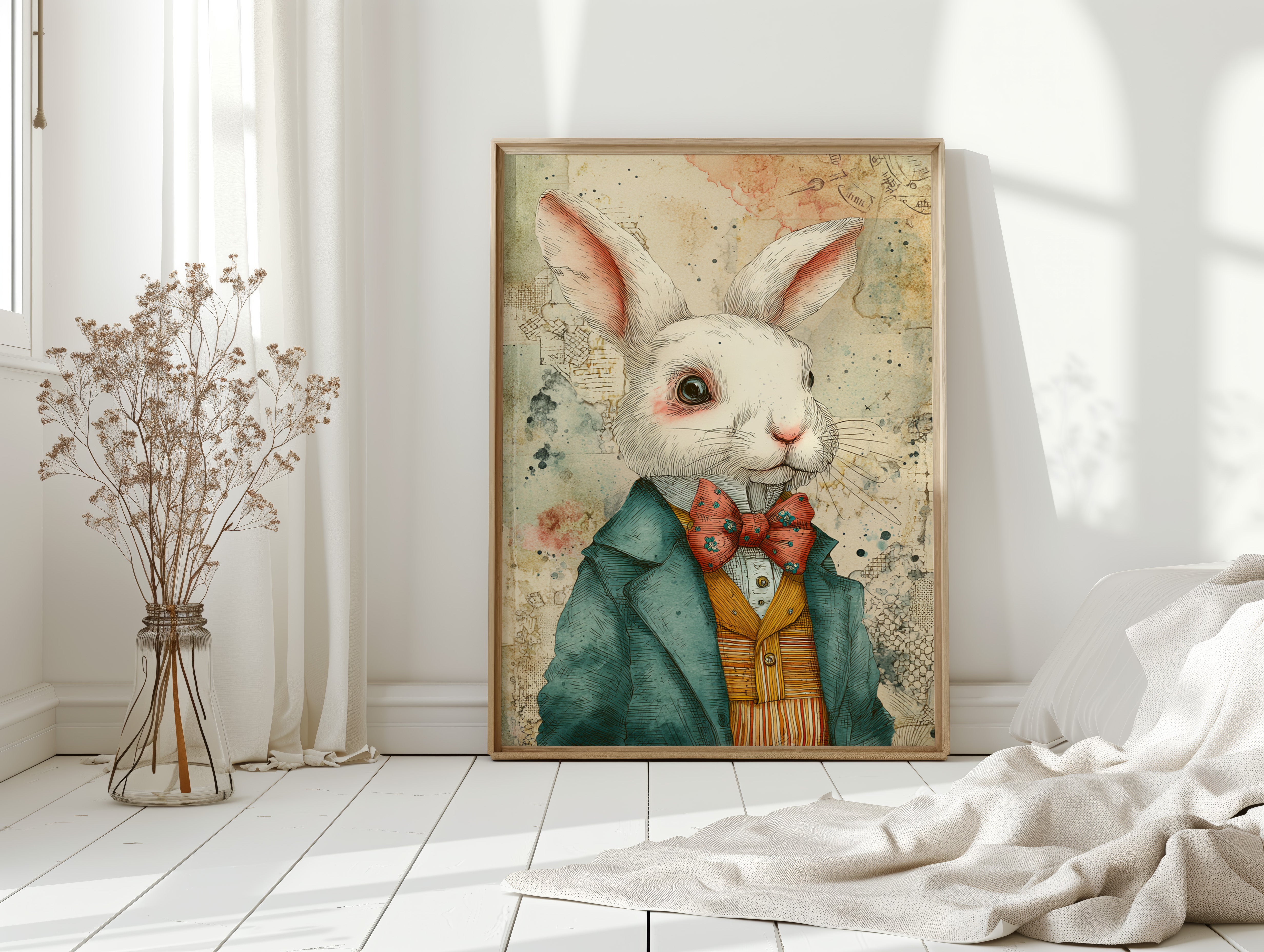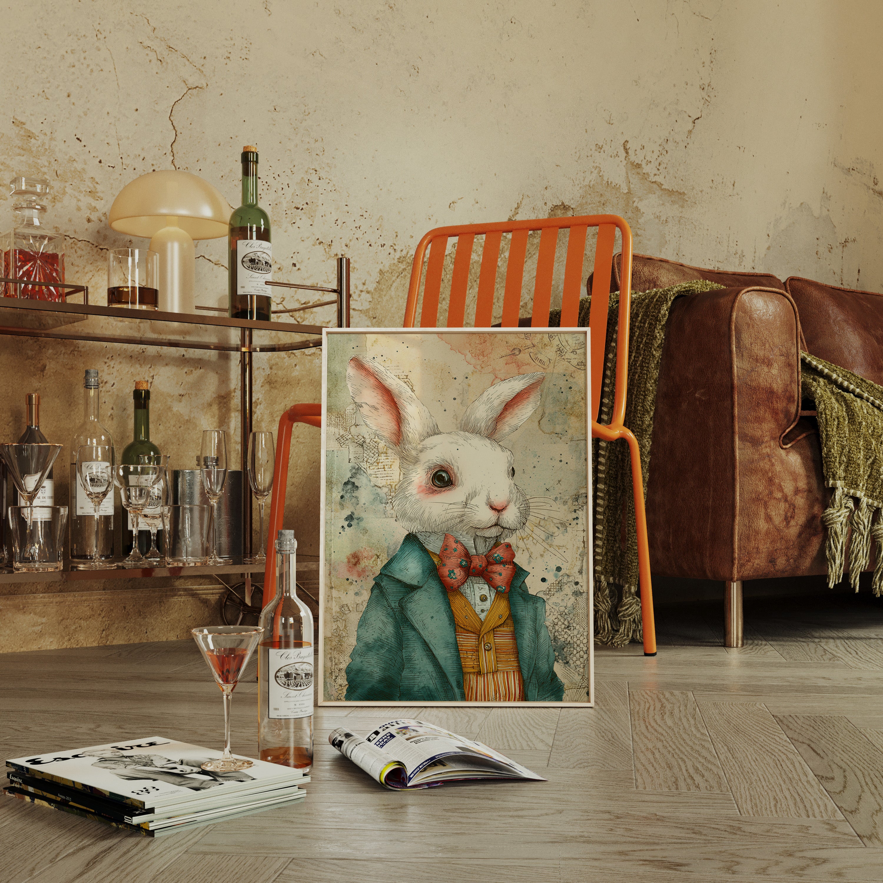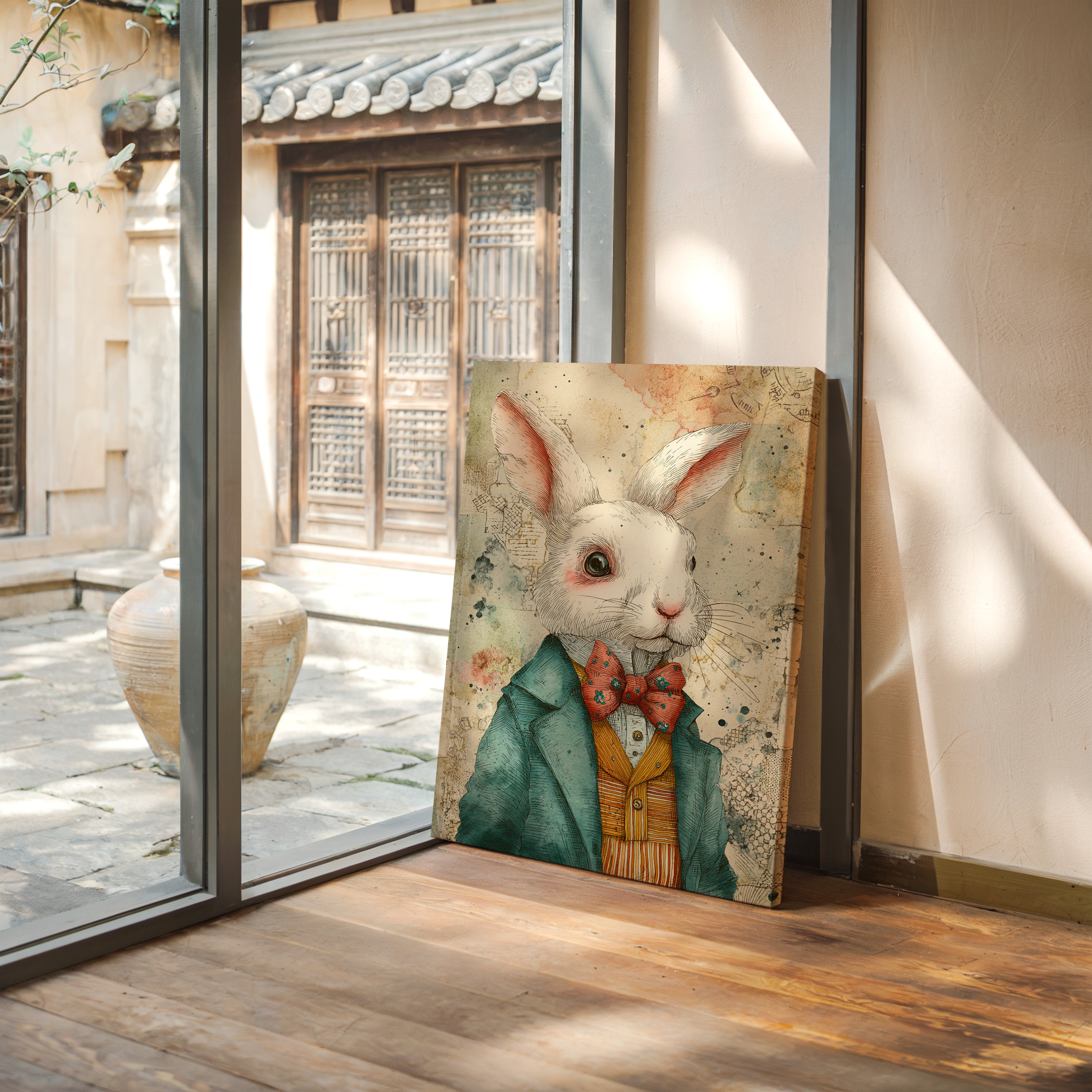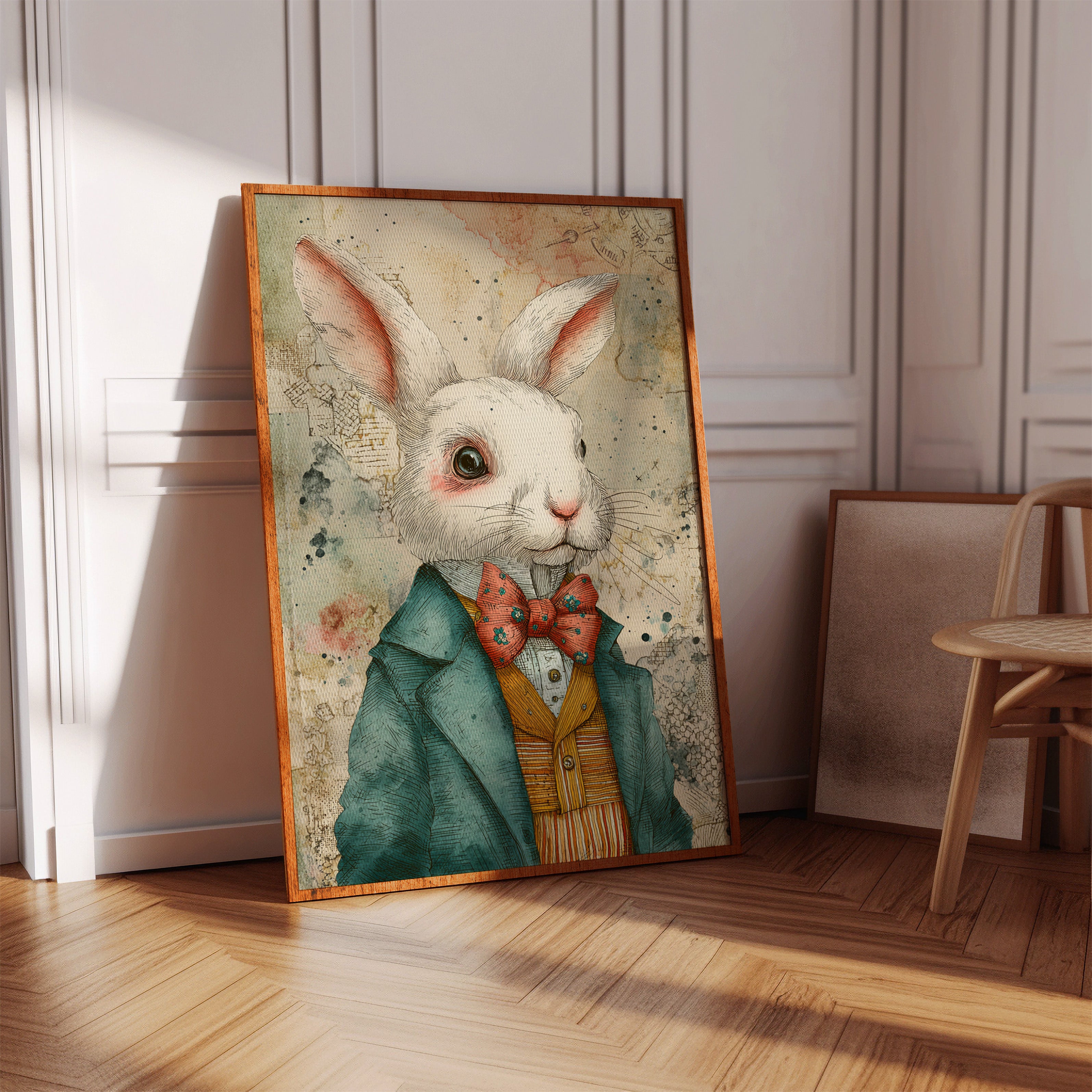 In a world where charm meets whimsy, a dapper rabbit dons a vibrant bowtie, poised for an enchanting evening. This piece captures the playful essence of the artisanal collection, inviting imagination and delight. The intricate details of the rabbit's attire, combined with a backdrop of faded maps and soft hues, evoke a sense of nostalgia and curiosity, as if the rabbit is about to share tales of adventures past. Perfectly suited for a cozy reading nook or a child's playroom, this artwork sparks joy and wonder in any space.
