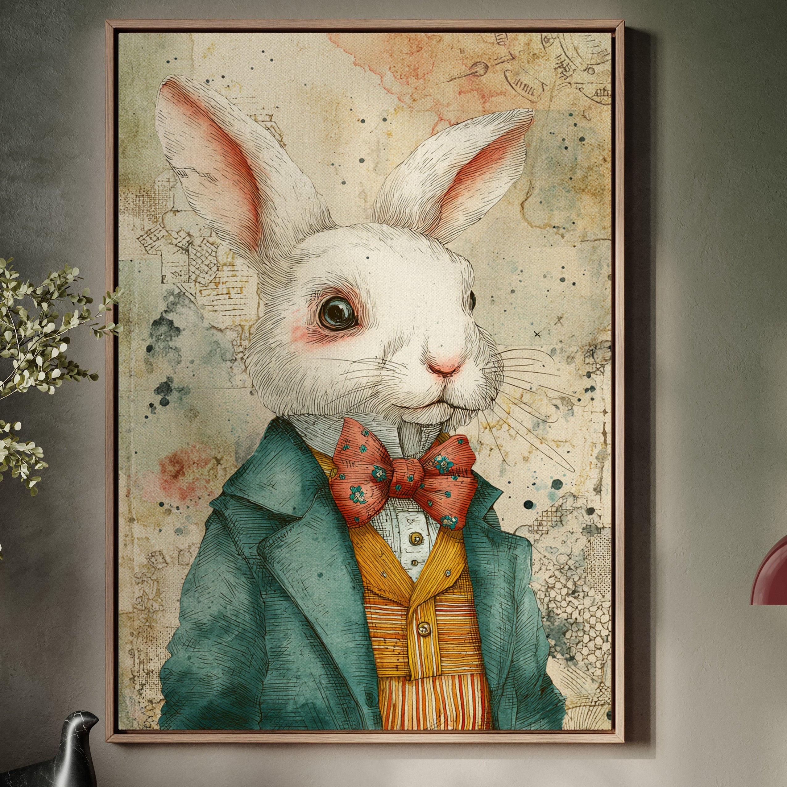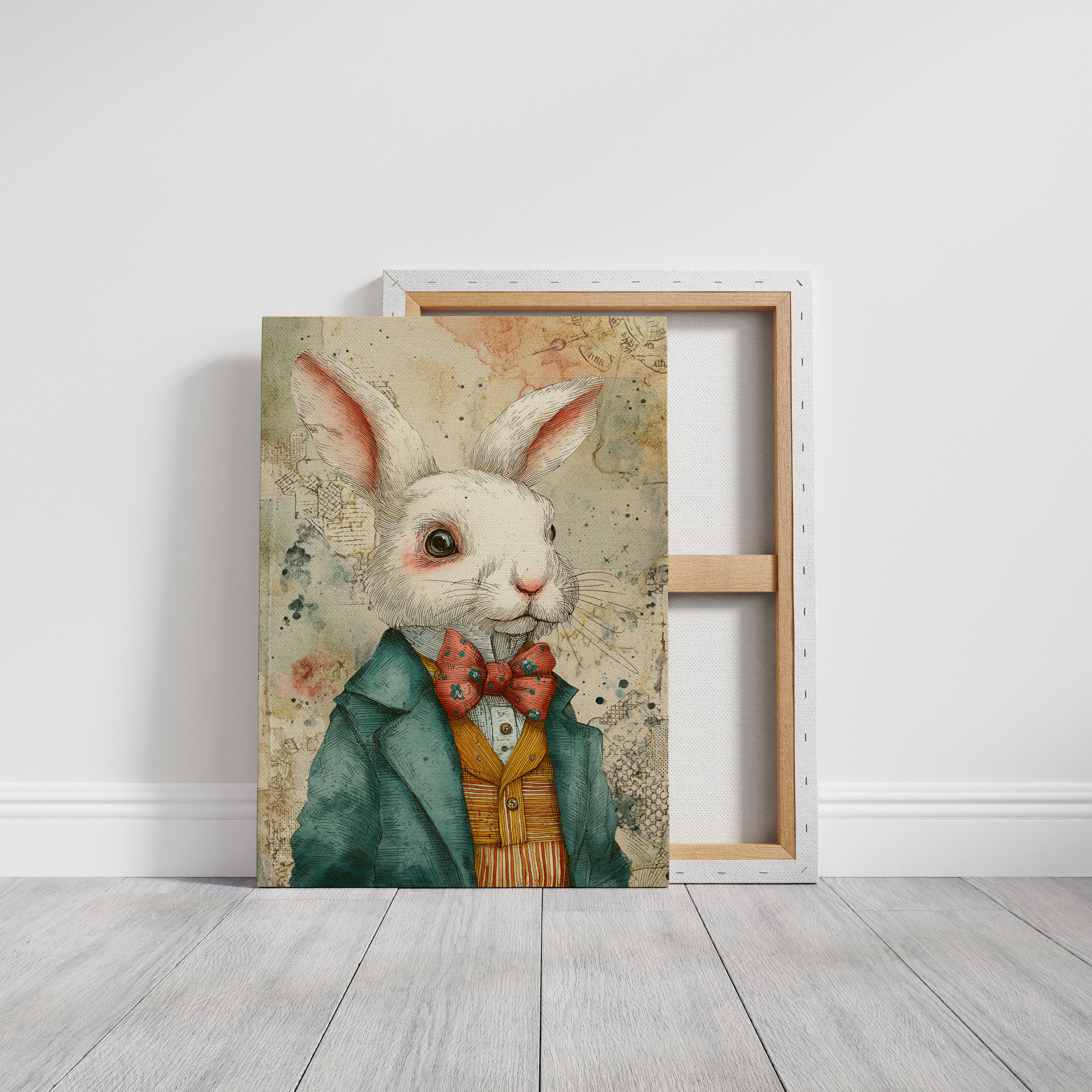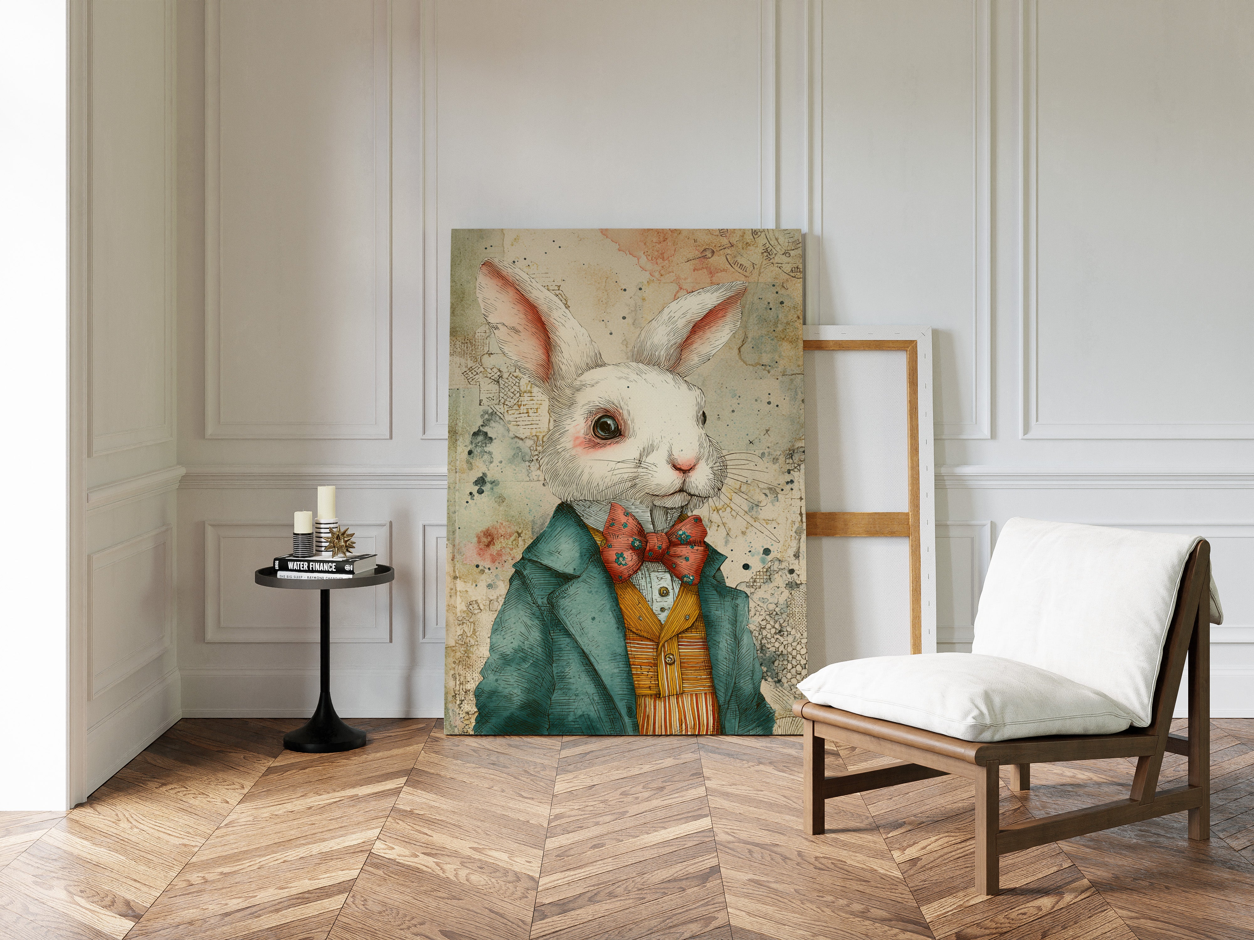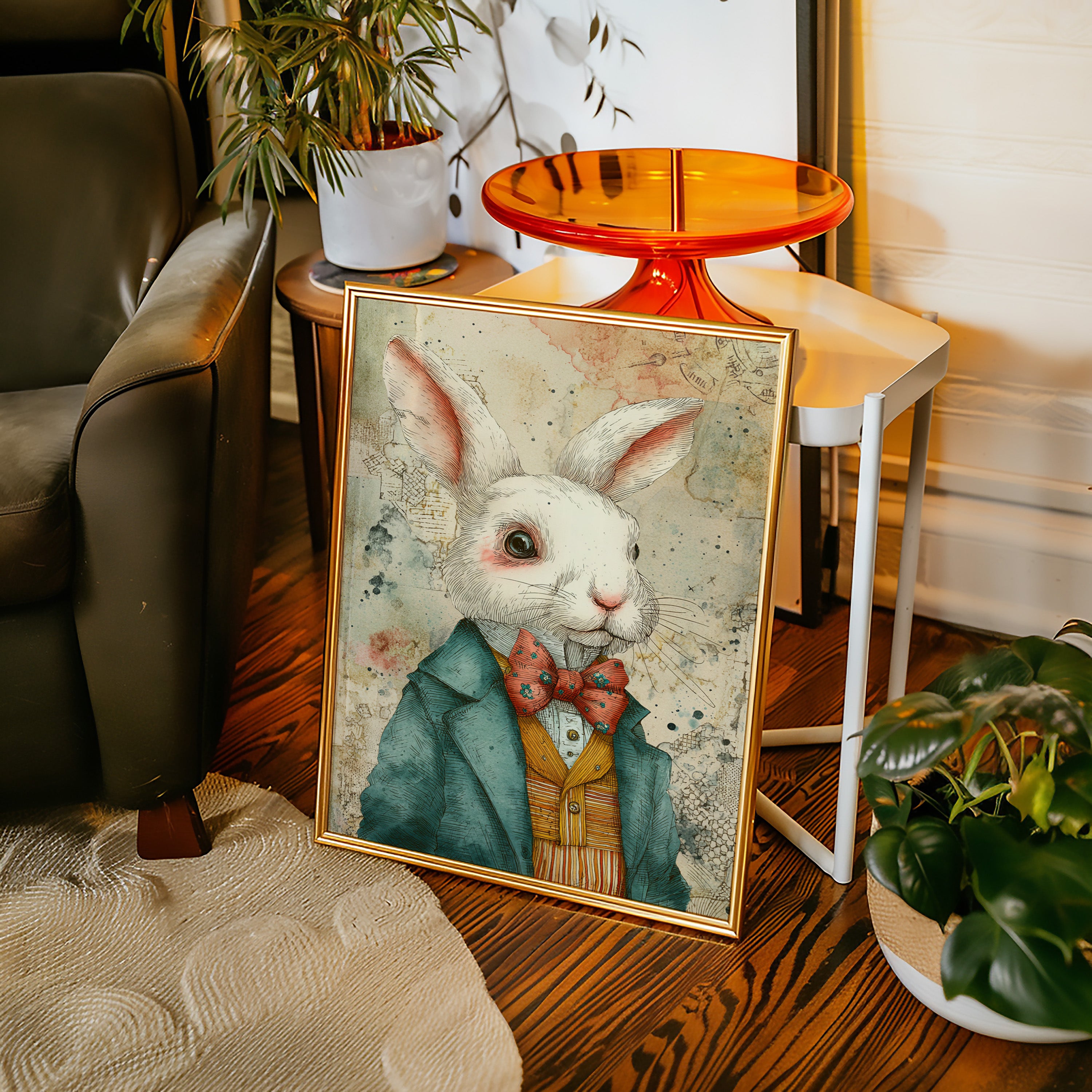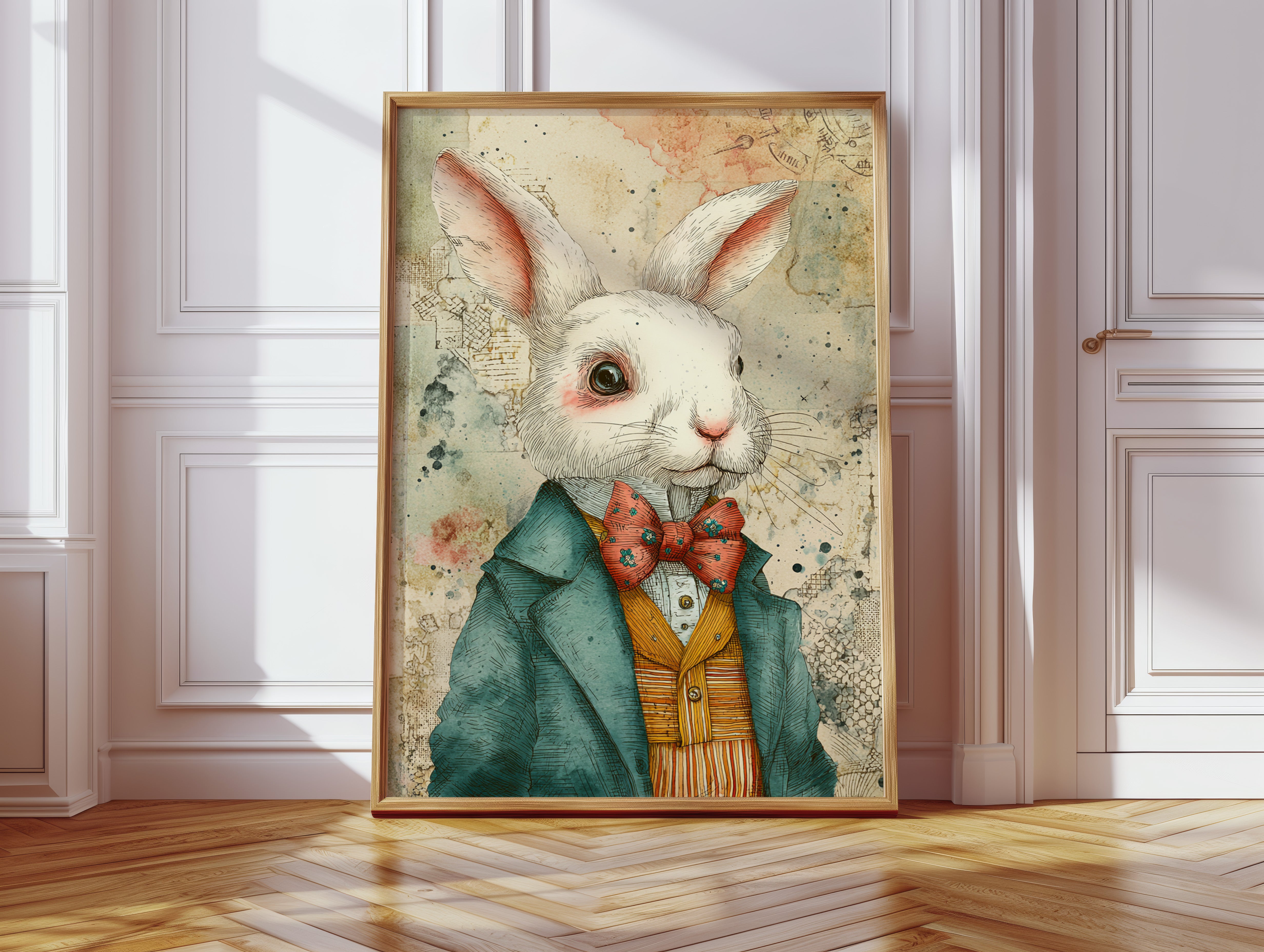 In a world where charm meets whimsy, a dapper rabbit dons a vibrant bowtie, poised for an enchanting evening. This piece captures the playful essence of the artisanal collection, inviting imagination and delight. The intricate details of the rabbit's attire, combined with a backdrop of faded maps and soft hues, evoke a sense of nostalgia and curiosity, as if the rabbit is about to share tales of adventures past. Perfectly suited for a cozy reading nook or a child's playroom, this artwork sparks joy and wonder in any space.