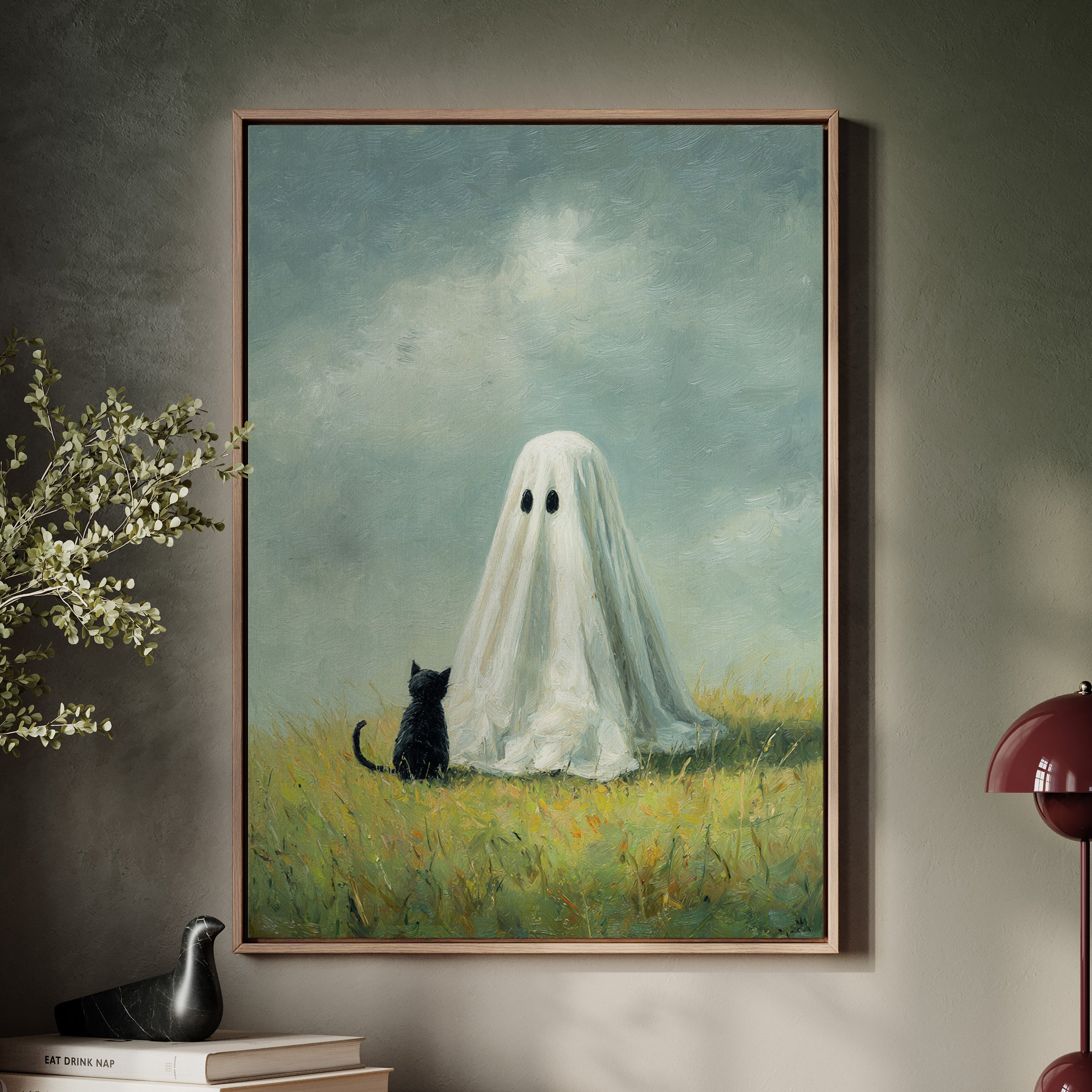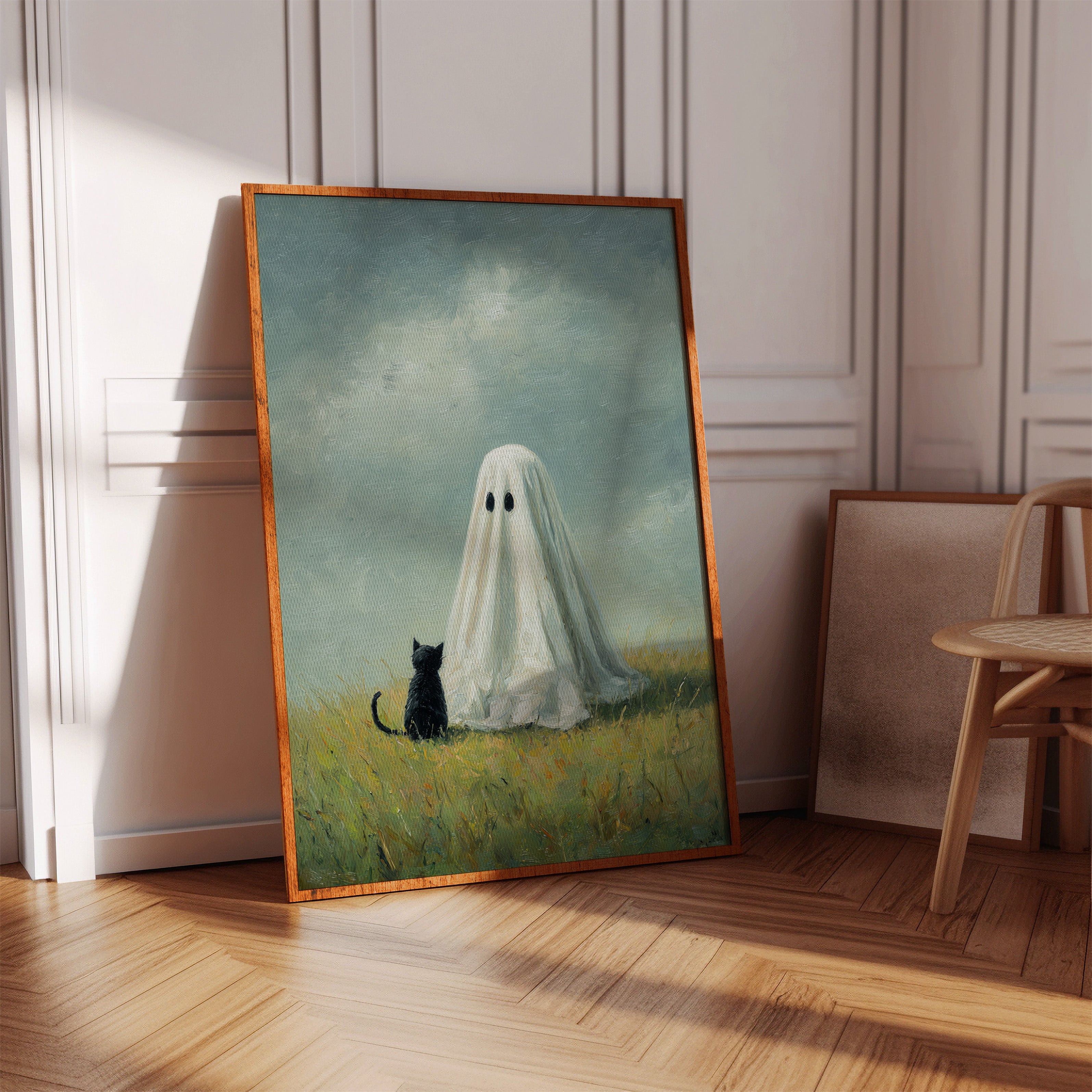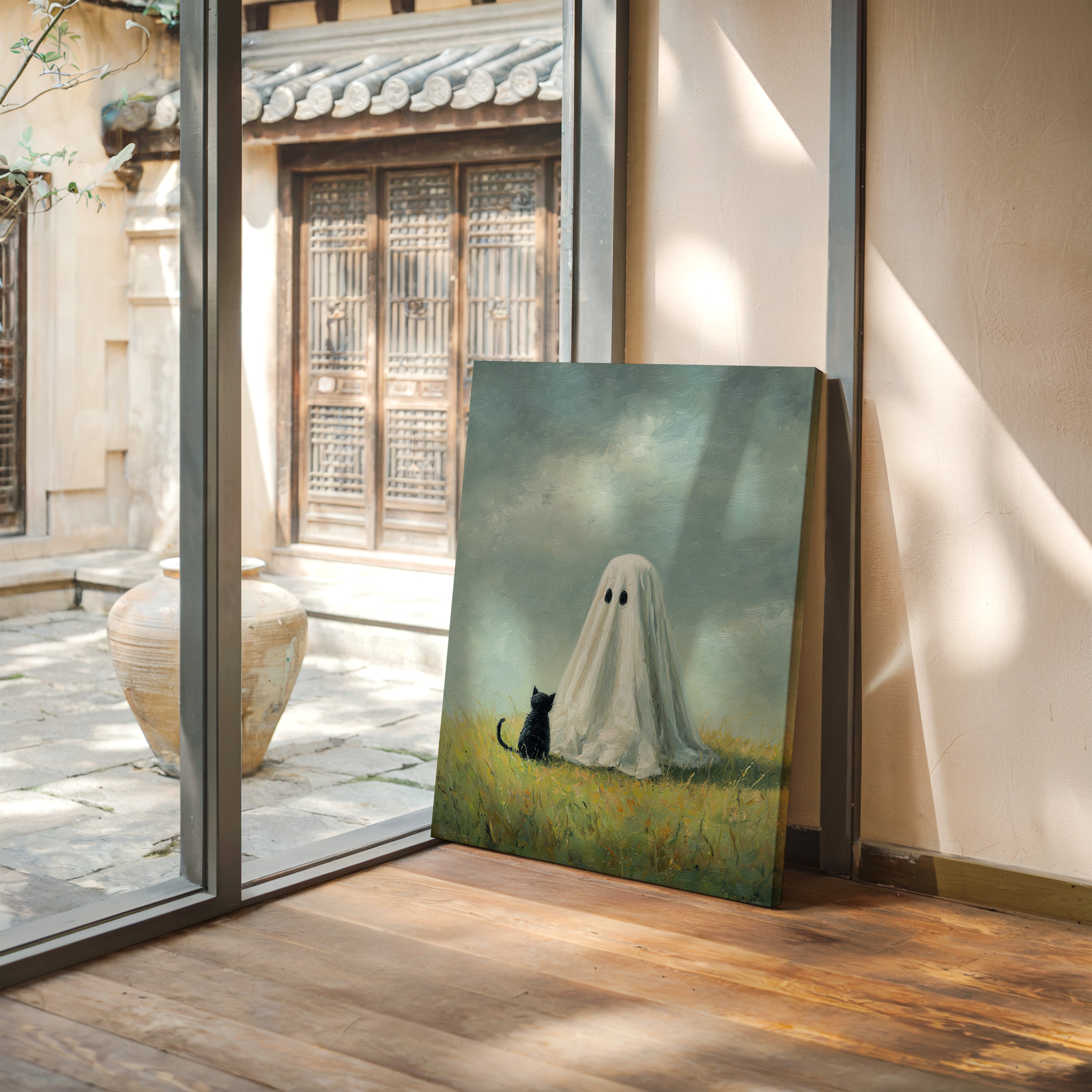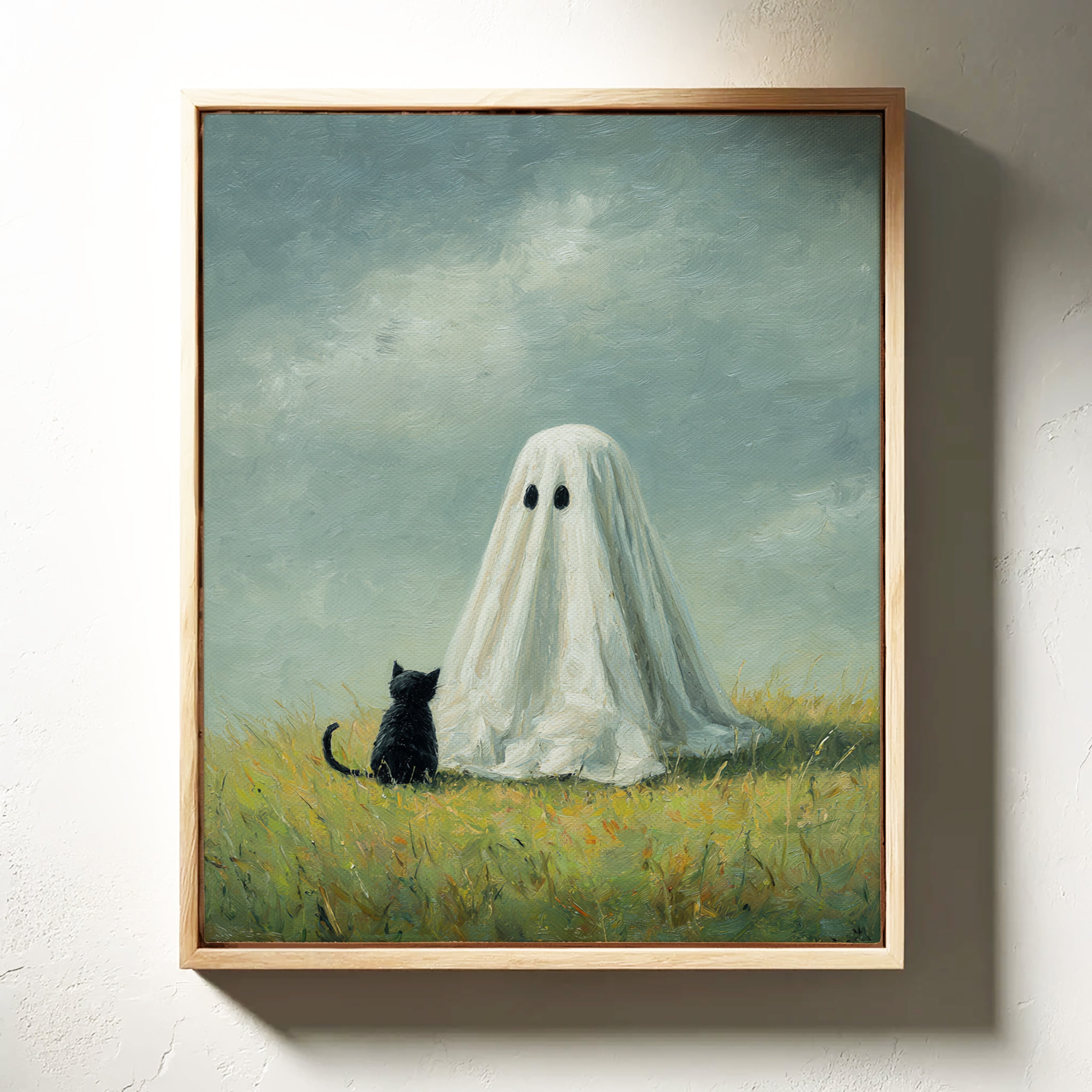 In a field where the wind carries secrets, a curious cat gazes up at a gentle spirit cloaked in white. Nestled between the earth and sky, this moment is a tender connection between the seen and unseen. The soft brushstrokes capture the warmth of companionship, inviting you to ponder the stories that linger in the air. Imagine this piece gracing a cozy nook, a whimsical reminder of the bonds that transcend the ordinary.