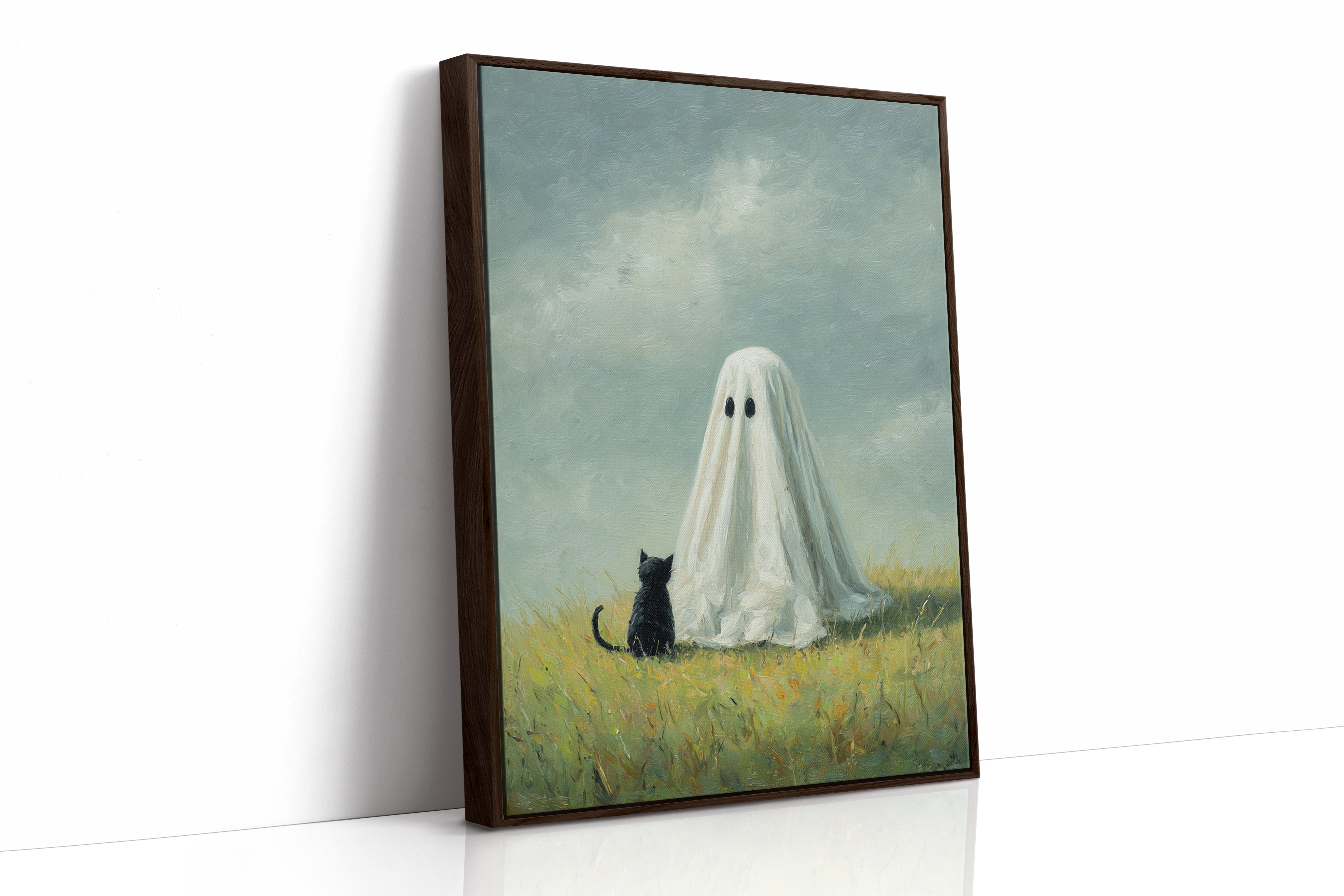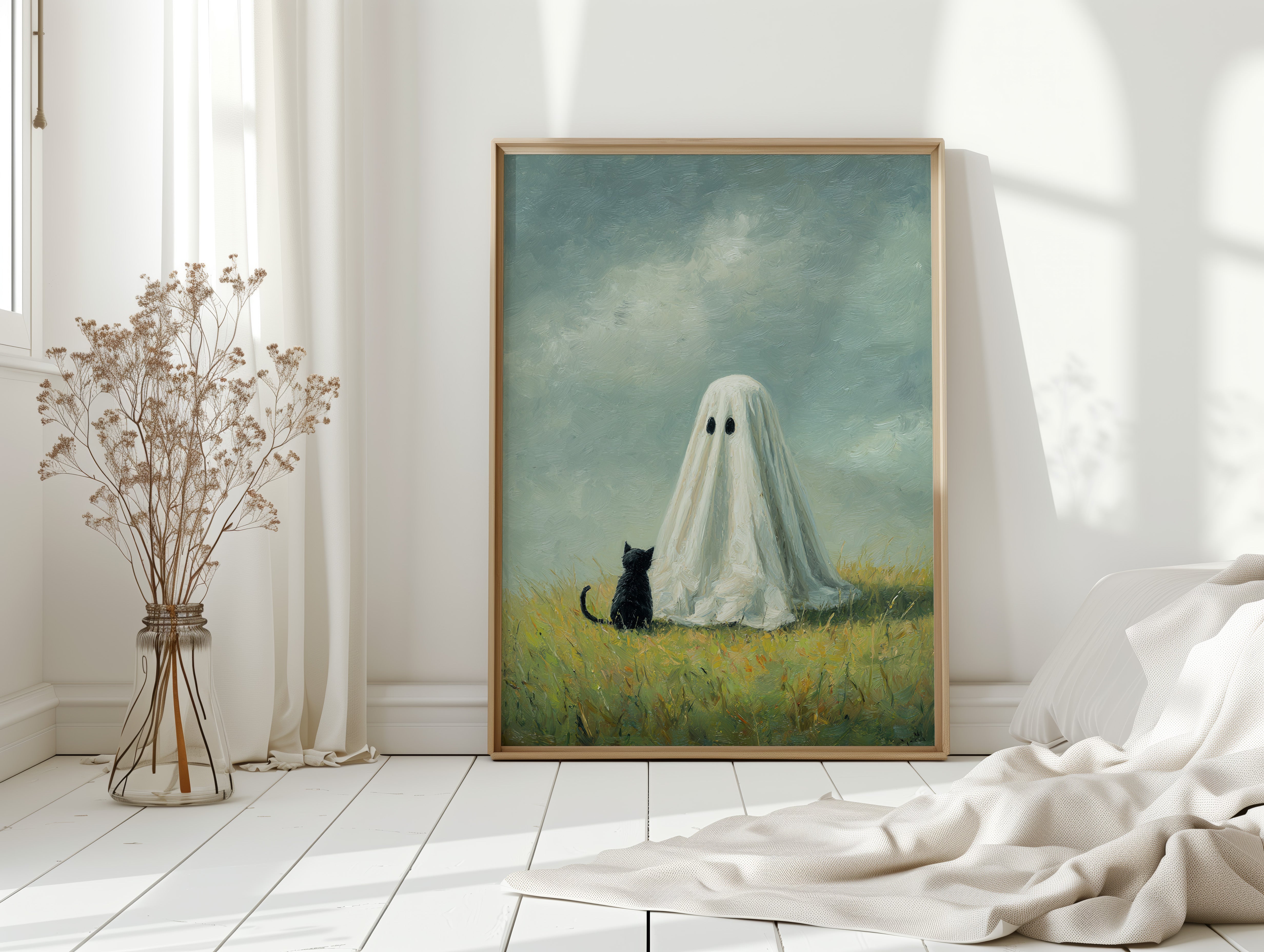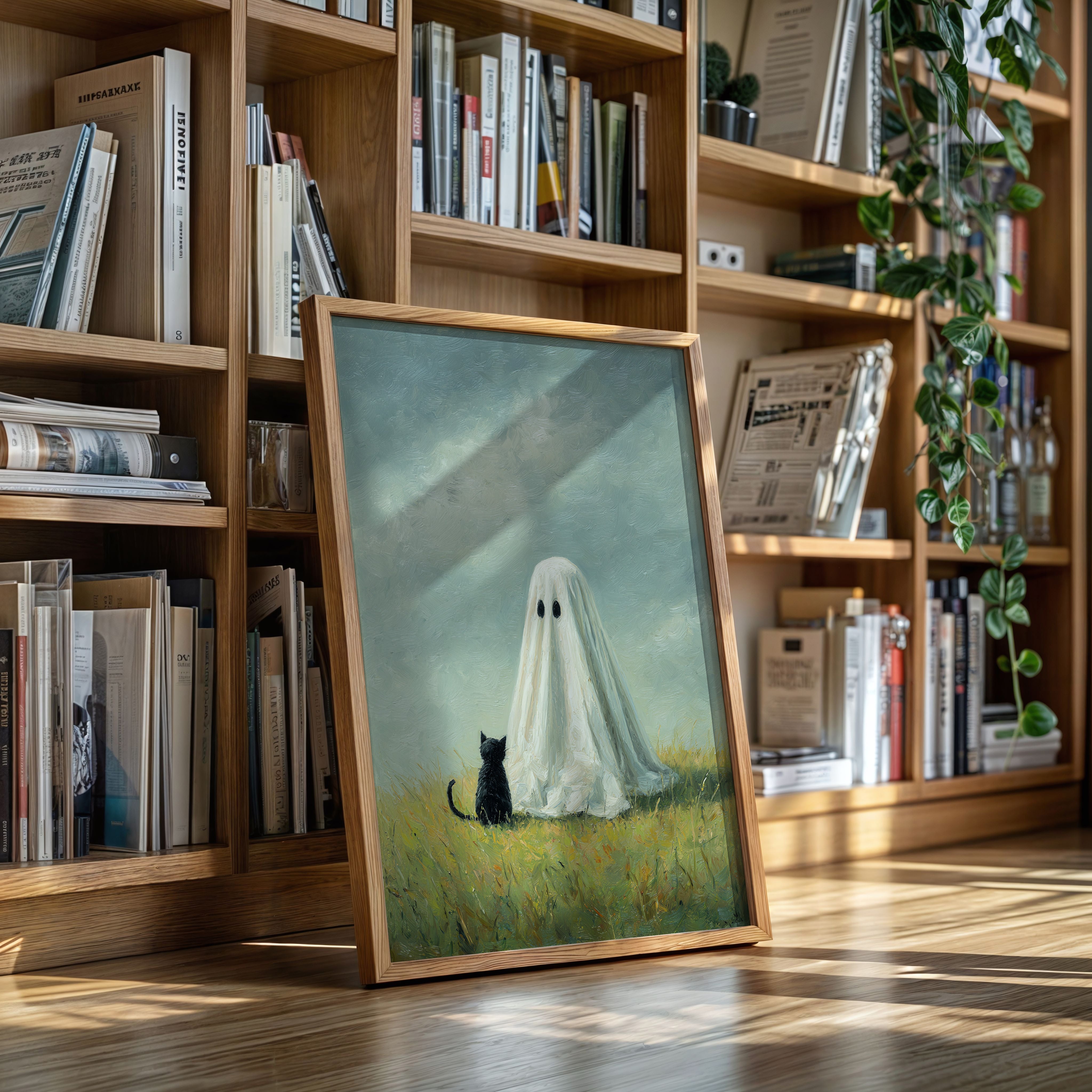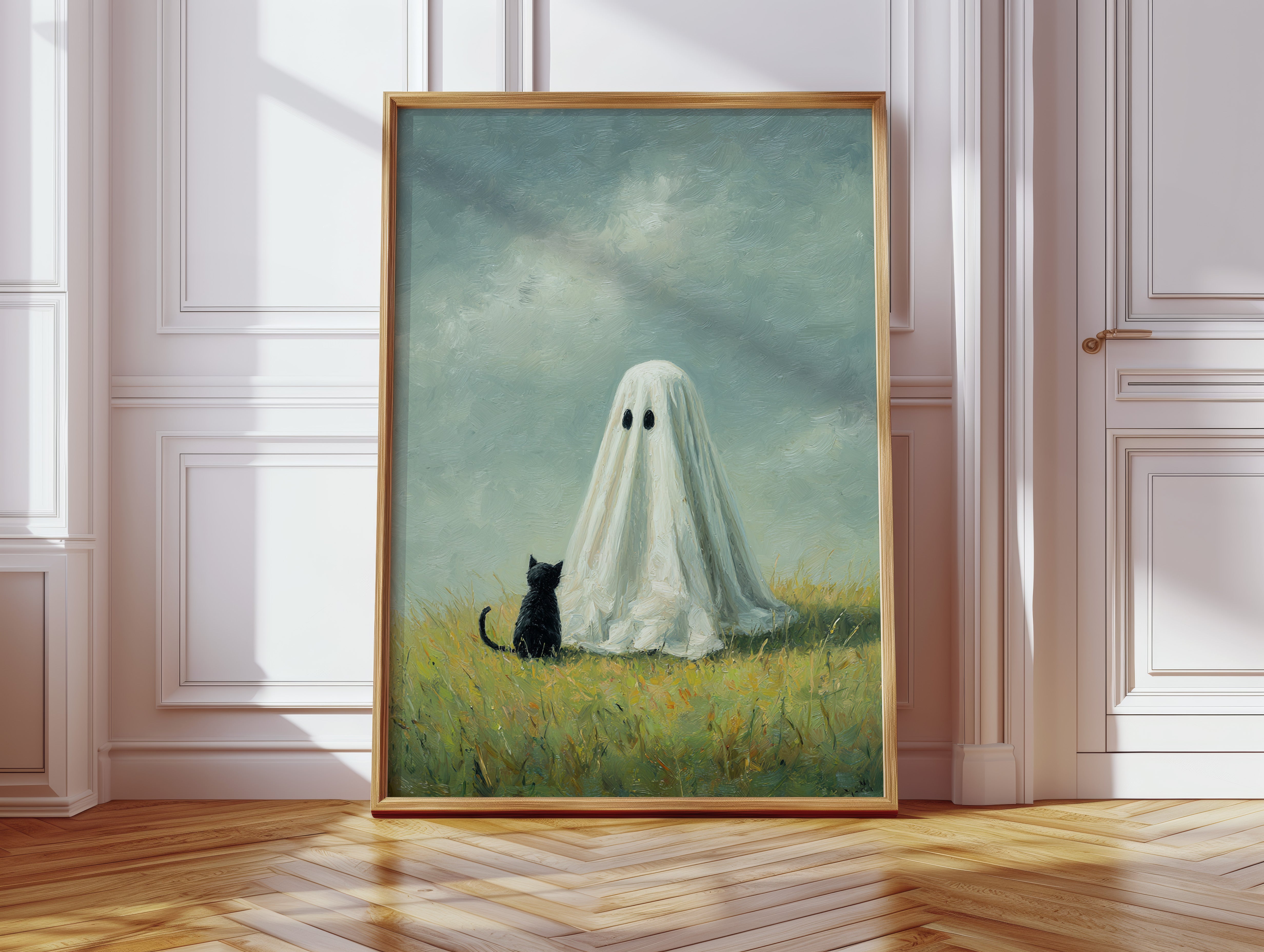 In a field where the wind carries secrets, a curious cat gazes up at a gentle spirit cloaked in white. Nestled between the earth and sky, this moment is a tender connection between the seen and unseen. The soft brushstrokes capture the warmth of companionship, inviting you to ponder the stories that linger in the air. Imagine this piece gracing a cozy nook, a whimsical reminder of the bonds that transcend the ordinary.