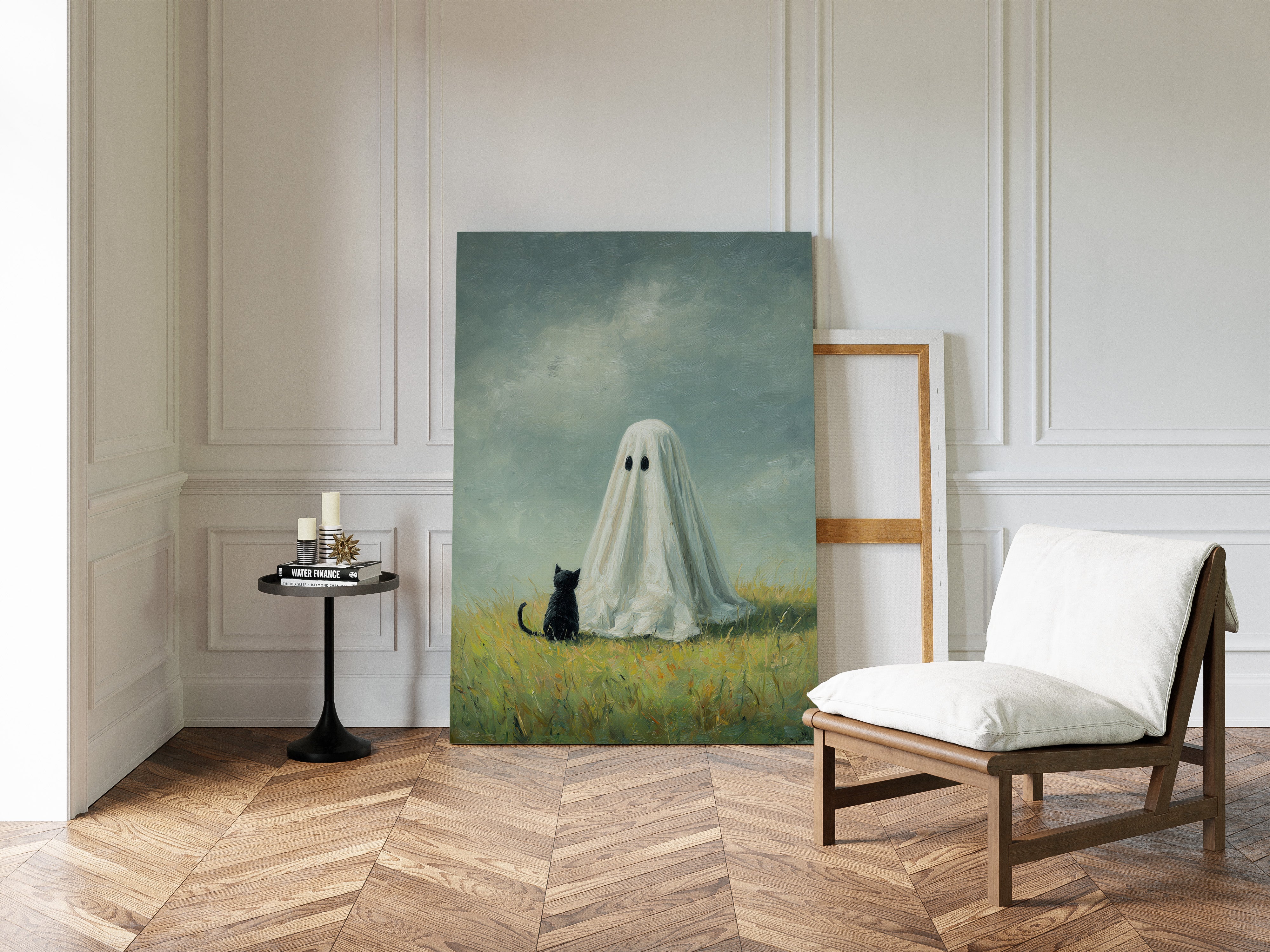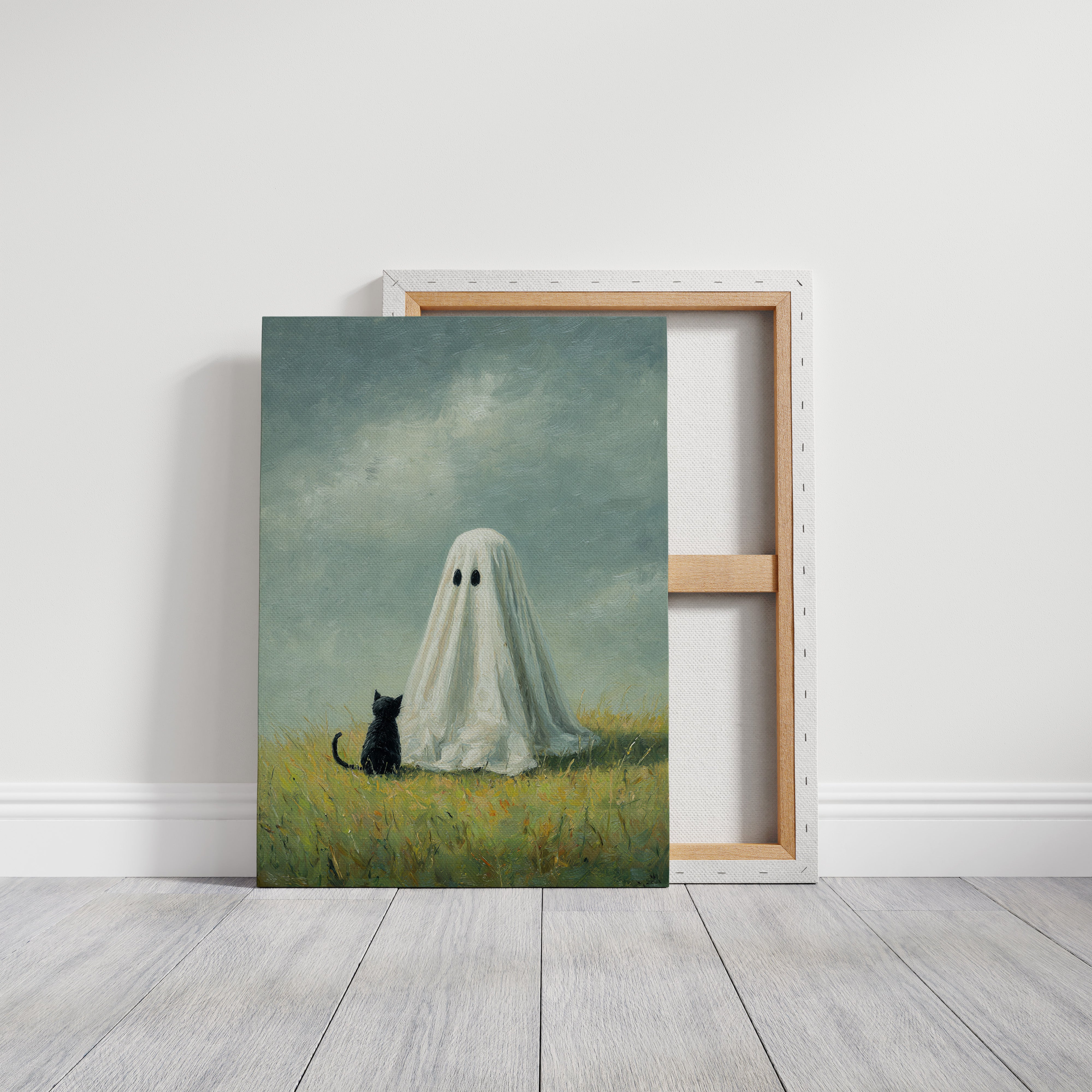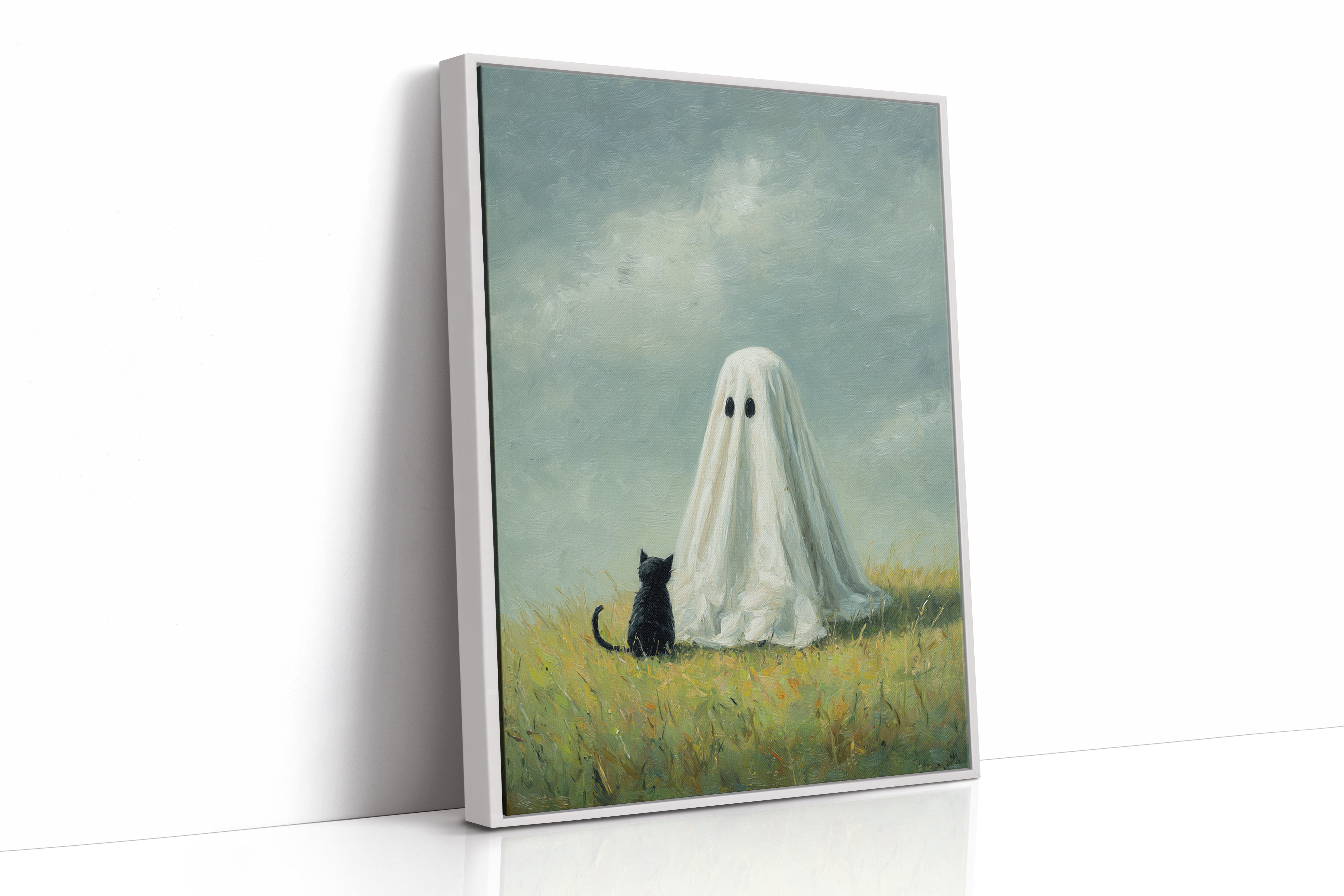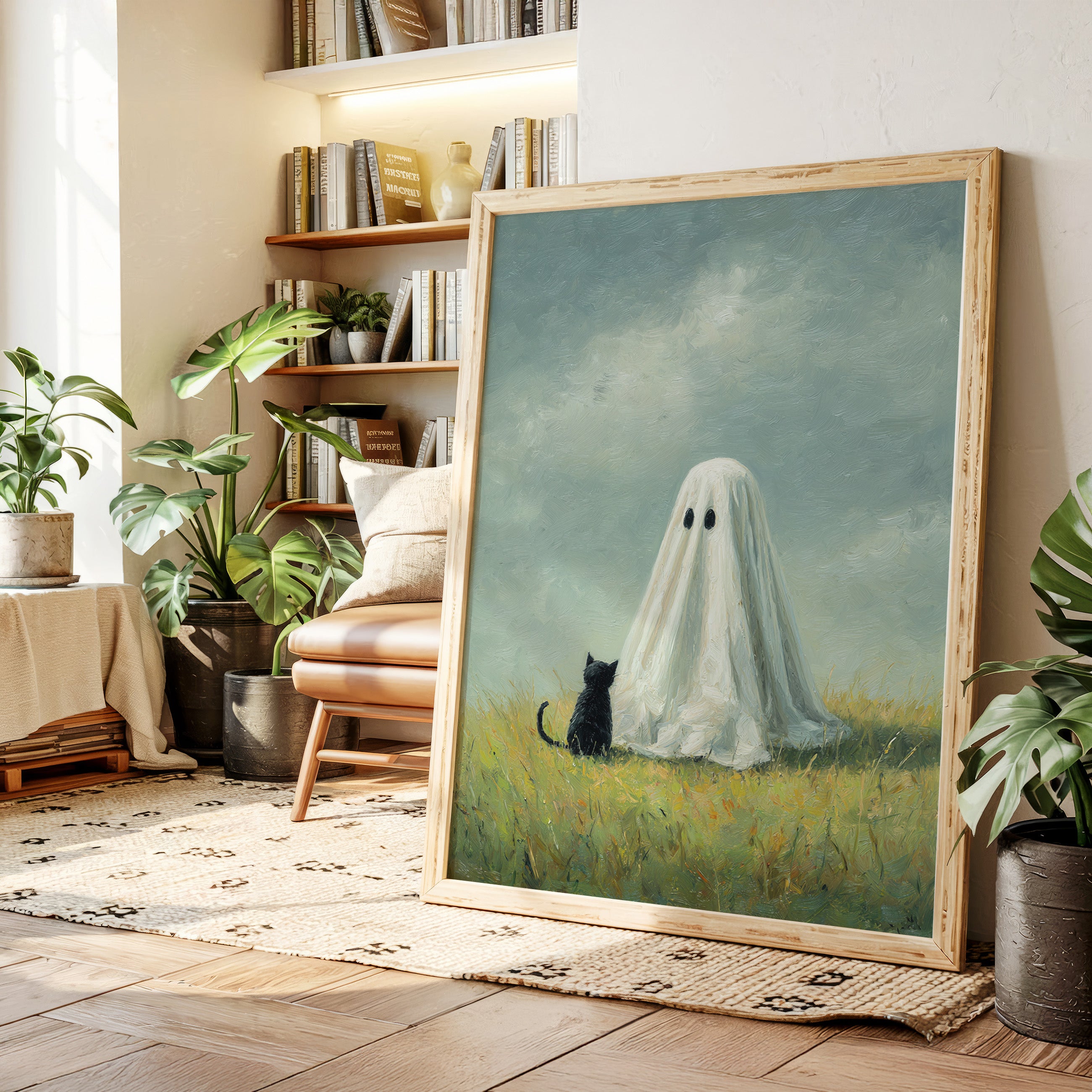 In a field where the wind carries secrets, a curious cat gazes up at a gentle spirit cloaked in white. Nestled between the earth and sky, this moment is a tender connection between the seen and unseen. The soft brushstrokes capture the warmth of companionship, inviting you to ponder the stories that linger in the air. Imagine this piece gracing a cozy nook, a whimsical reminder of the bonds that transcend the ordinary.