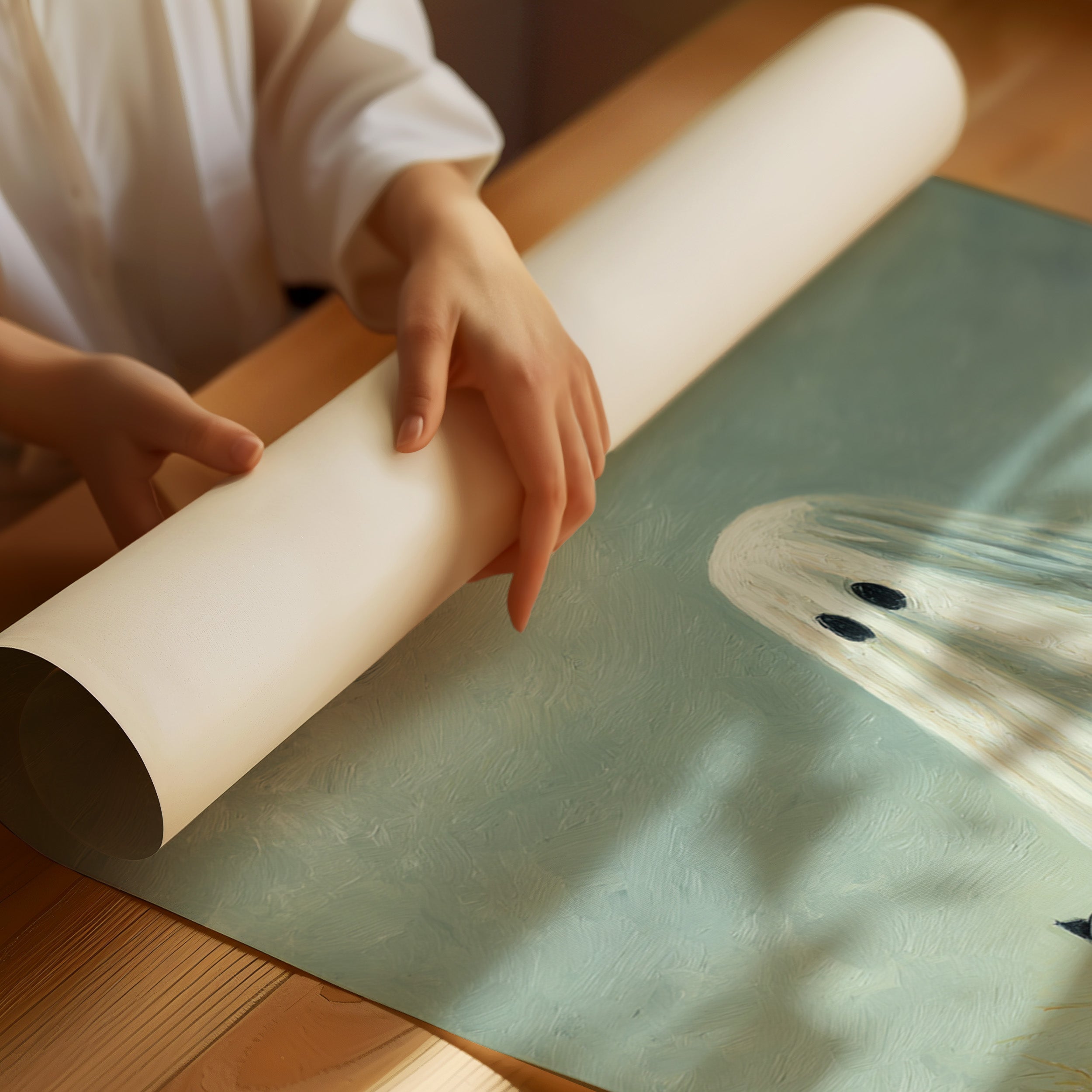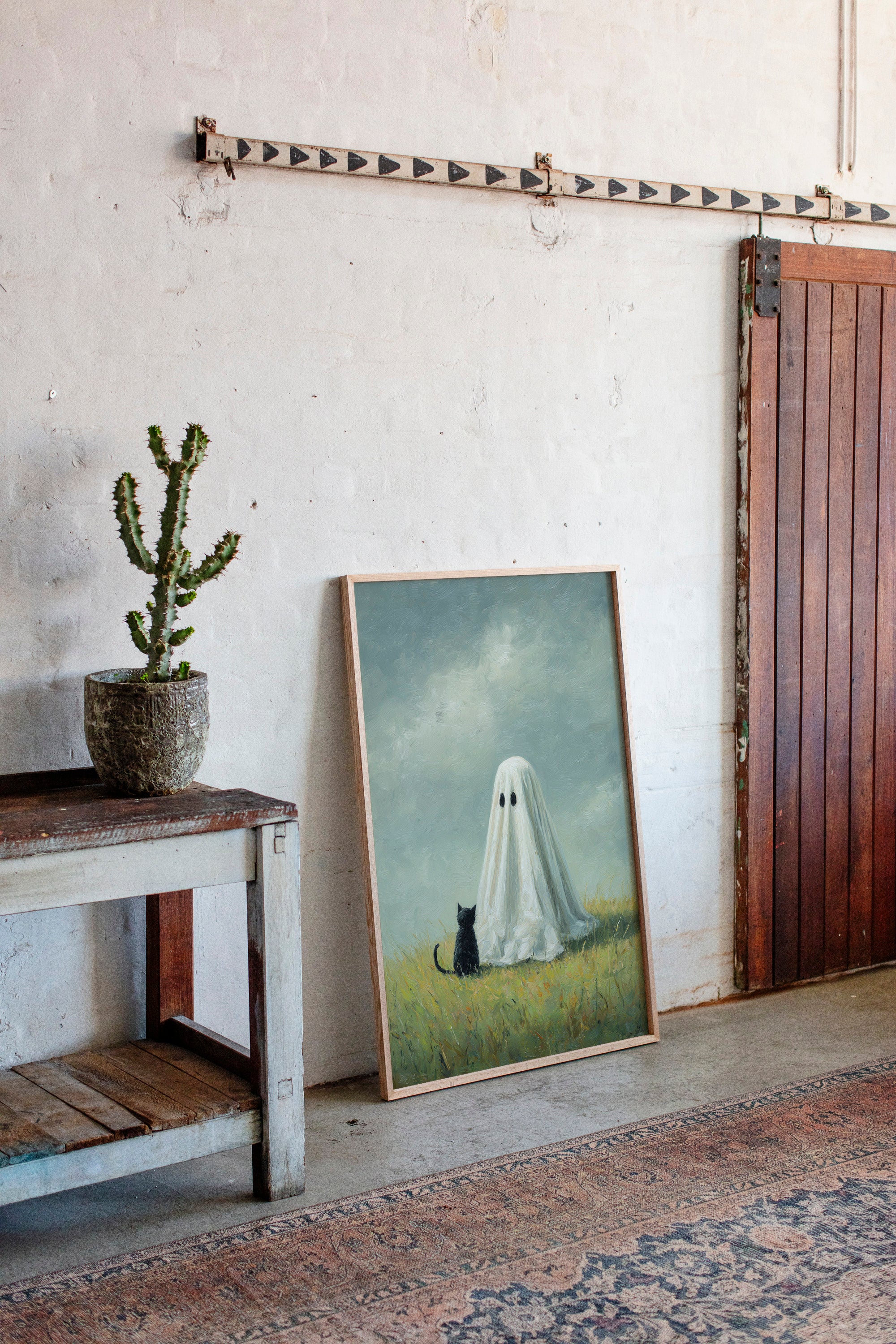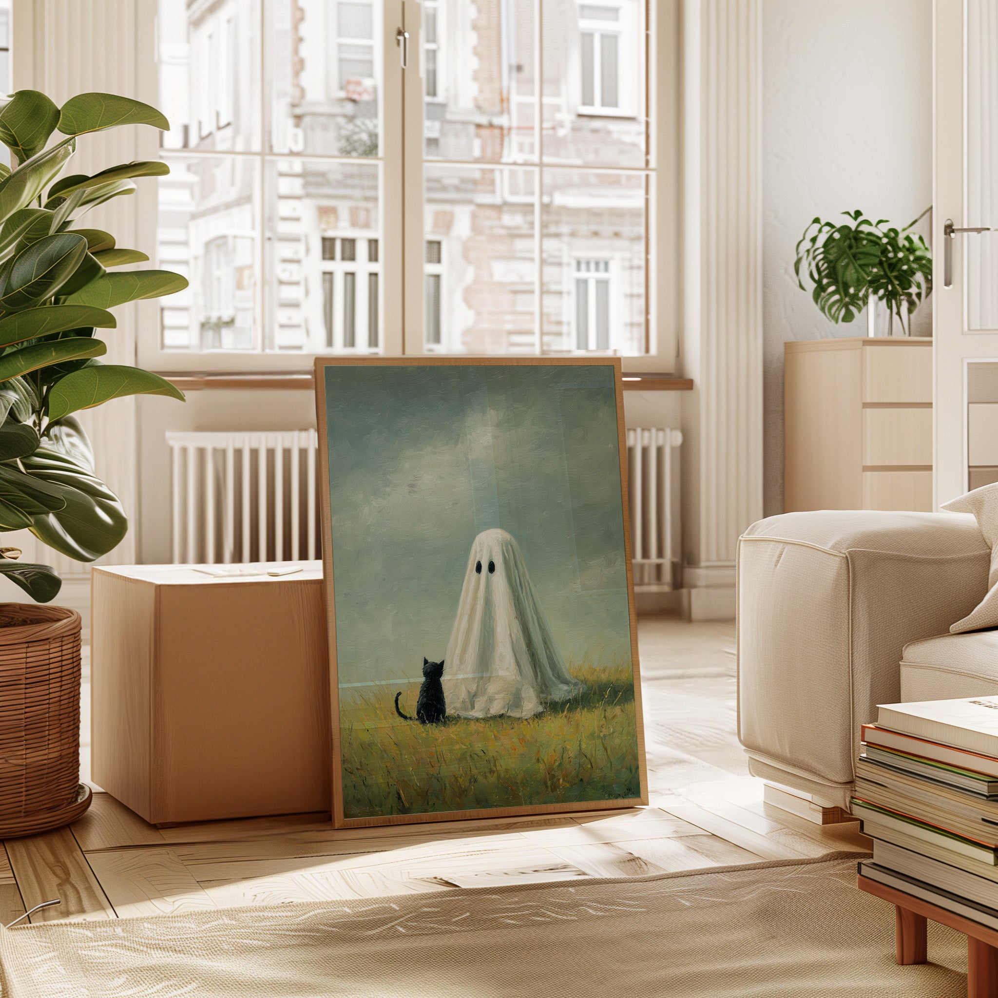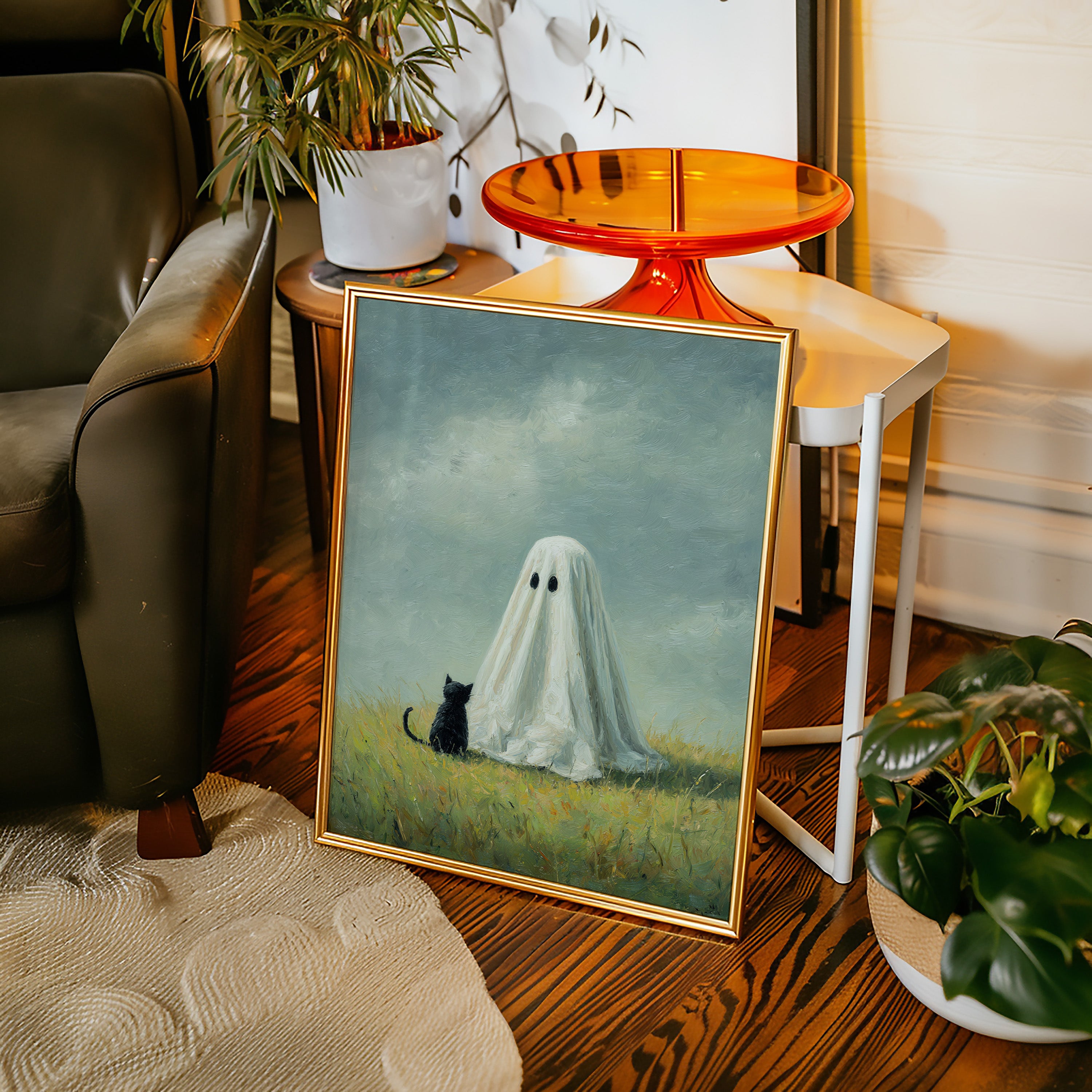 In a field where the wind carries secrets, a curious cat gazes up at a gentle spirit cloaked in white. Nestled between the earth and sky, this moment is a tender connection between the seen and unseen. The soft brushstrokes capture the warmth of companionship, inviting you to ponder the stories that linger in the air. Imagine this piece gracing a cozy nook, a whimsical reminder of the bonds that transcend the ordinary.