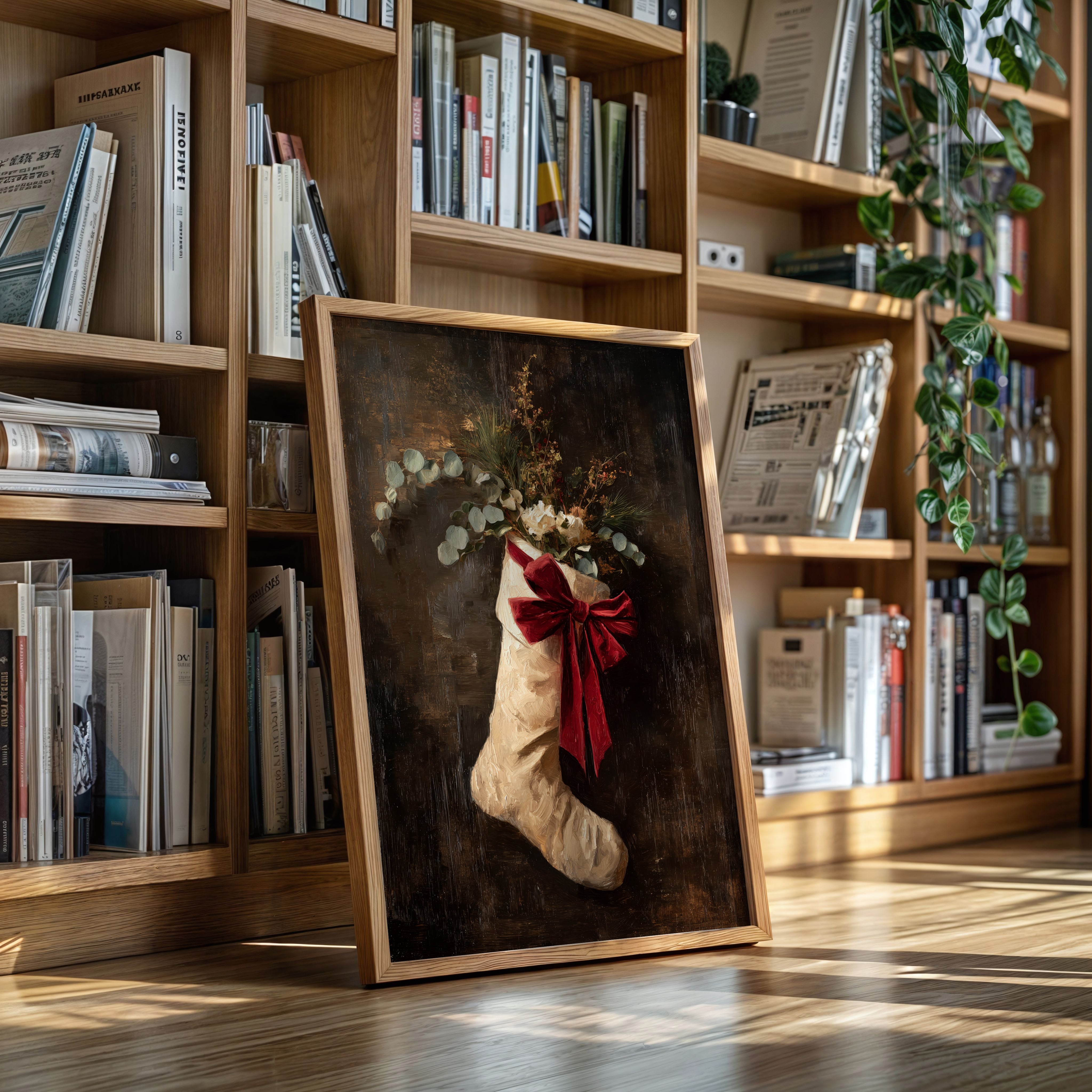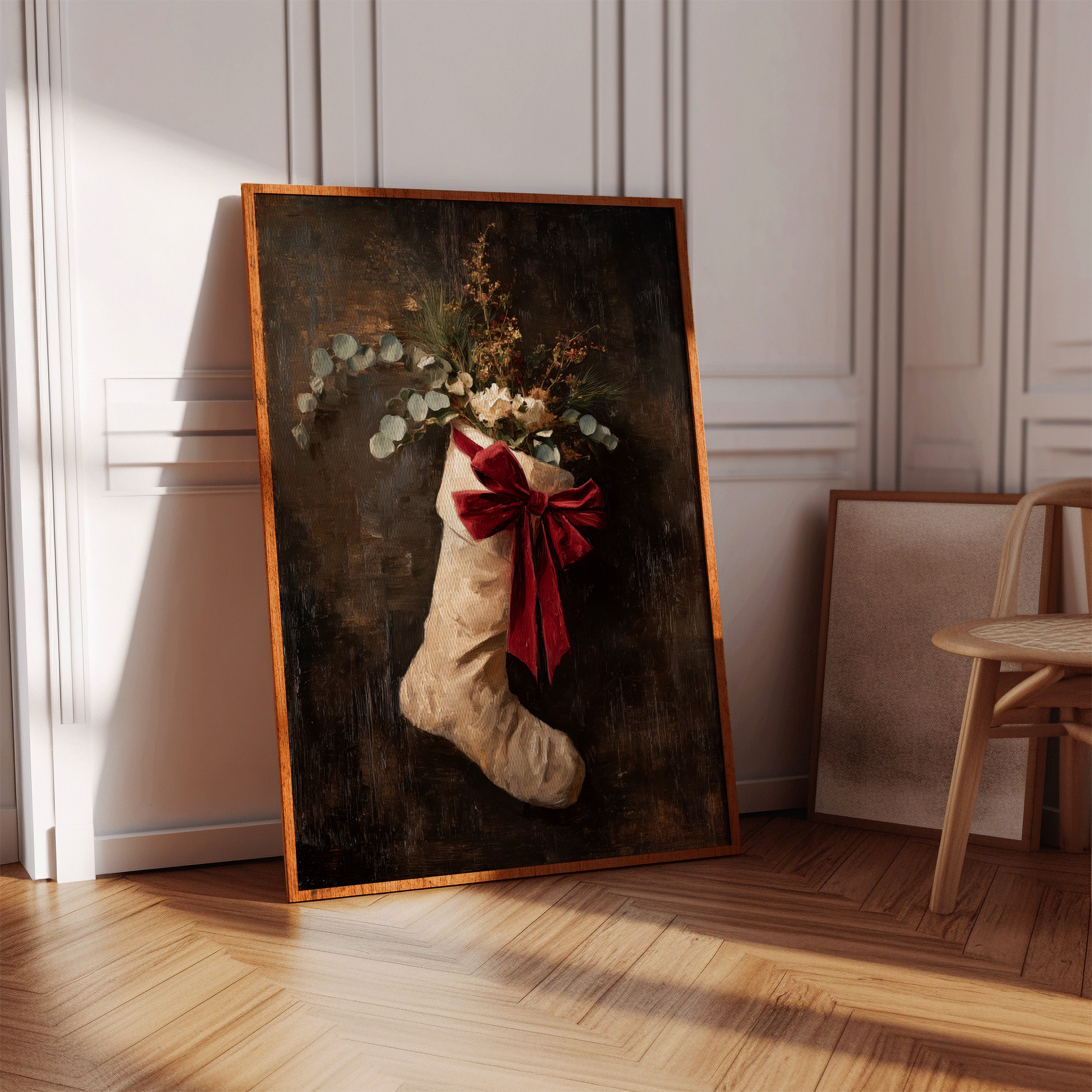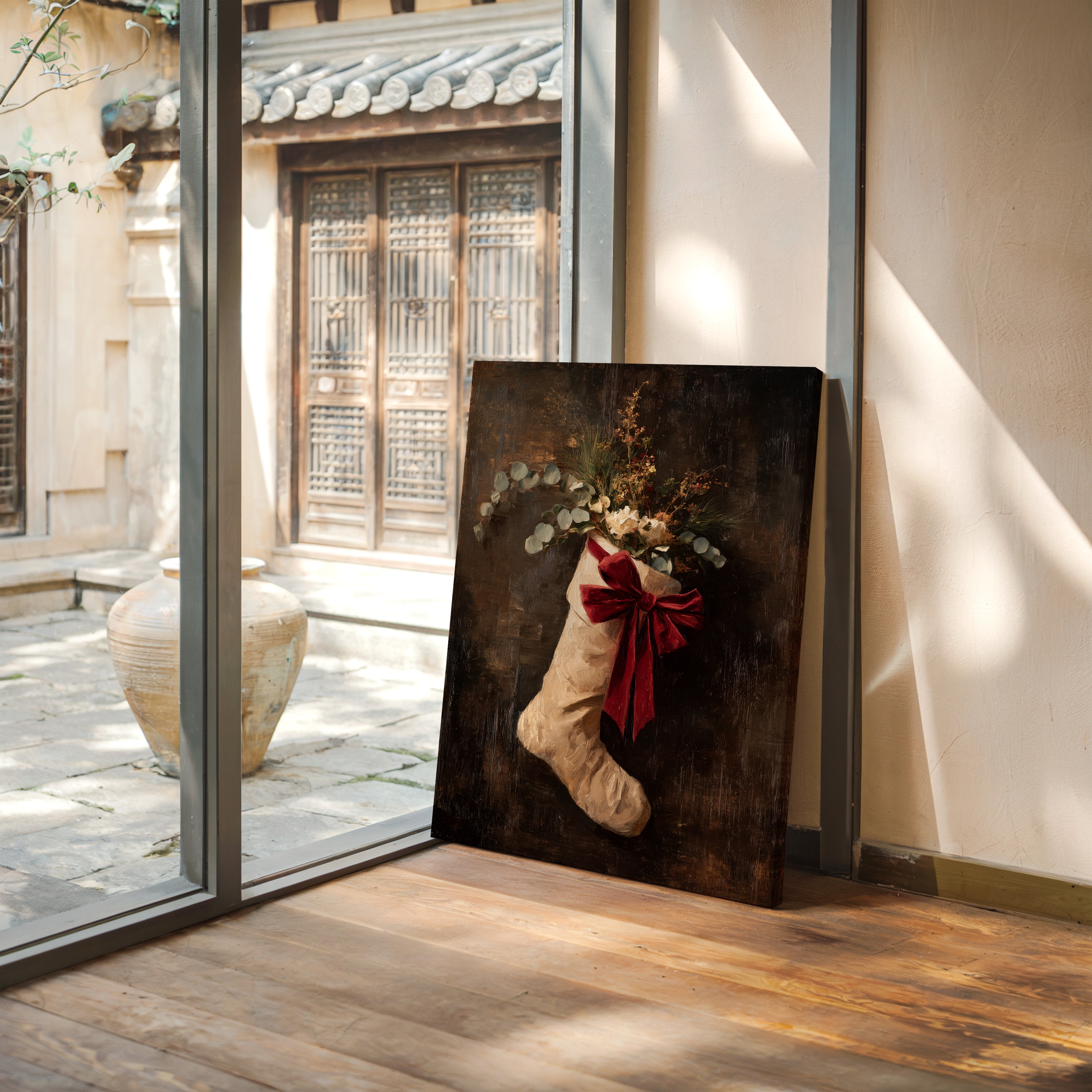 In a cozy corner, a festive stocking bursts with the vibrant hues of dried blooms and greens, inviting warmth and nostalgia. This piece embodies the artisanal spirit, celebrating the beauty of handcrafted decor. The soft textures of the stocking contrast with the delicate foliage, creating a harmonious blend of colors and feelings. Ideal for a living room or entryway, it brings a touch of seasonal charm and natural elegance.