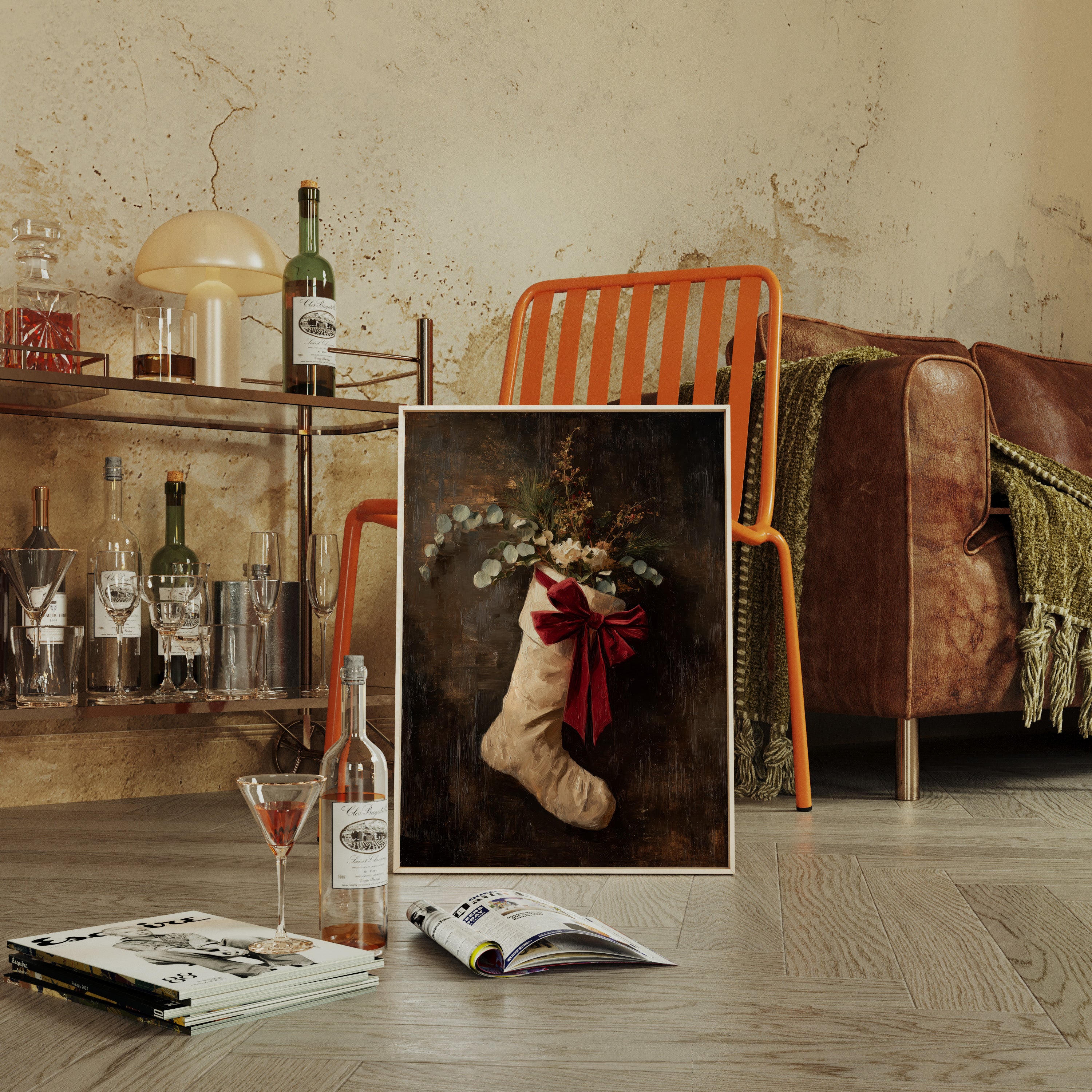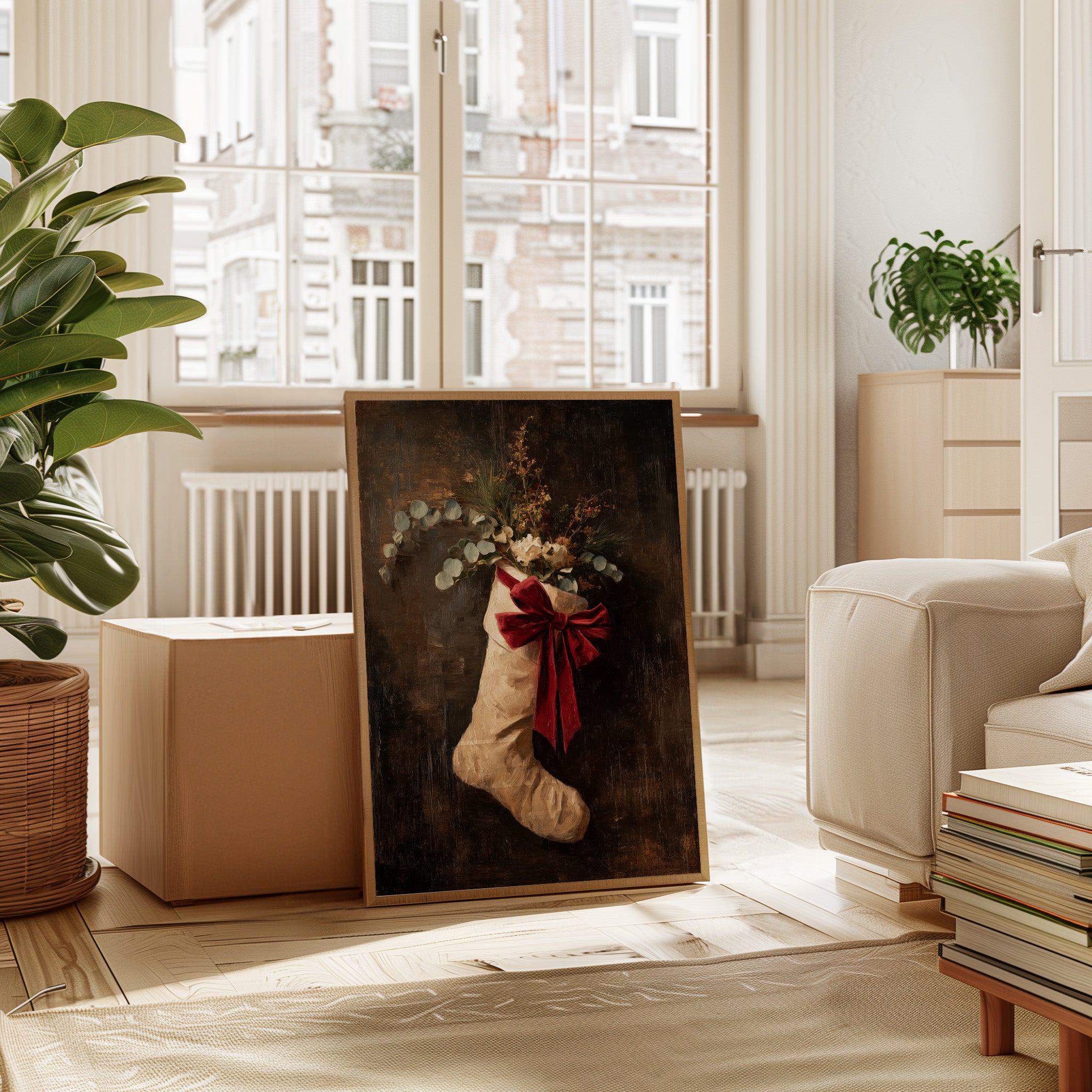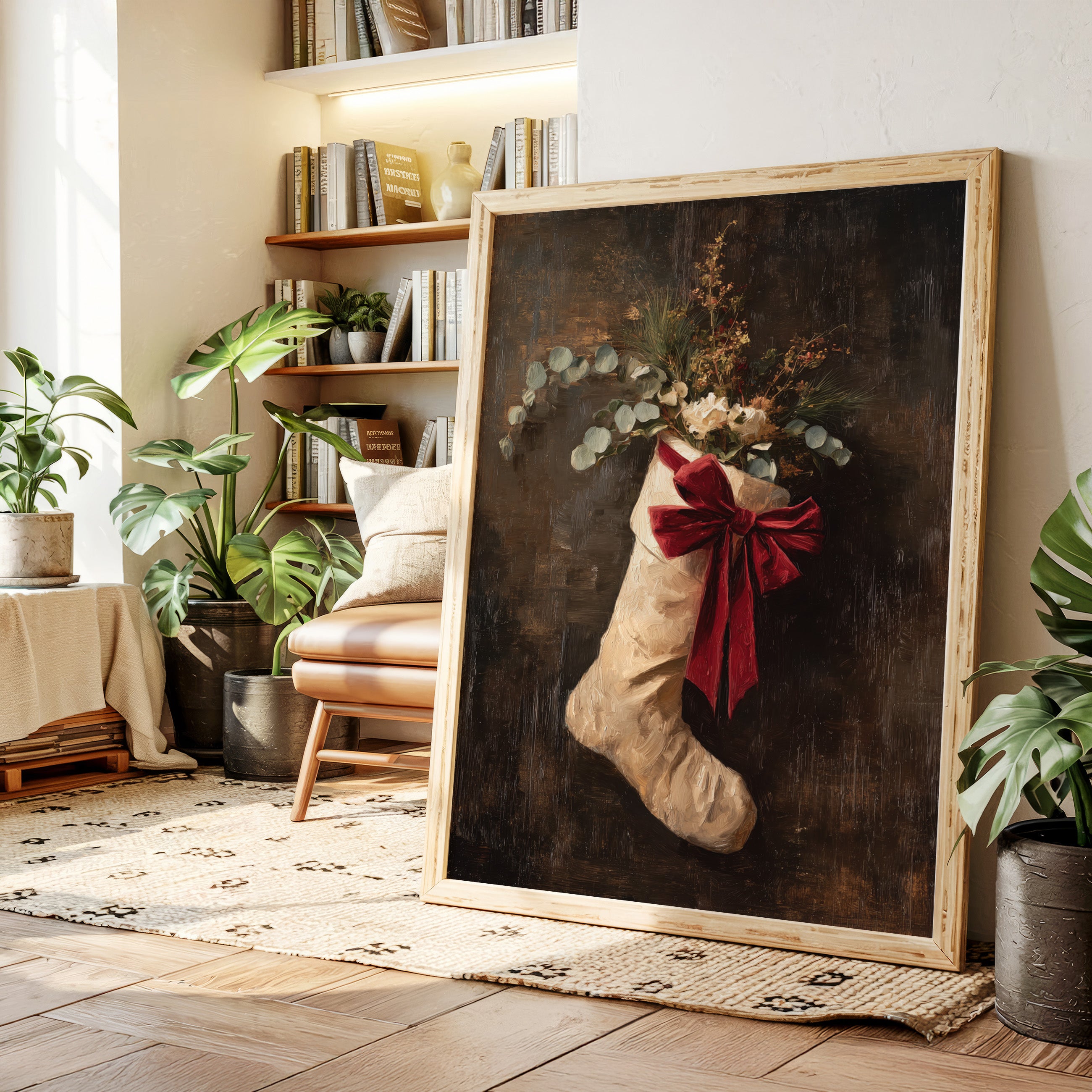 In a cozy corner, a festive stocking bursts with the vibrant hues of dried blooms and greens, inviting warmth and nostalgia. This piece embodies the artisanal spirit, celebrating the beauty of handcrafted decor. The soft textures of the stocking contrast with the delicate foliage, creating a harmonious blend of colors and feelings. Ideal for a living room or entryway, it brings a touch of seasonal charm and natural elegance.