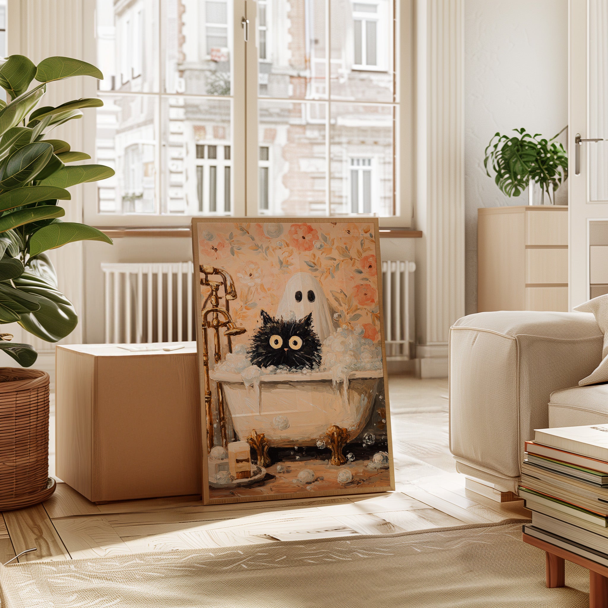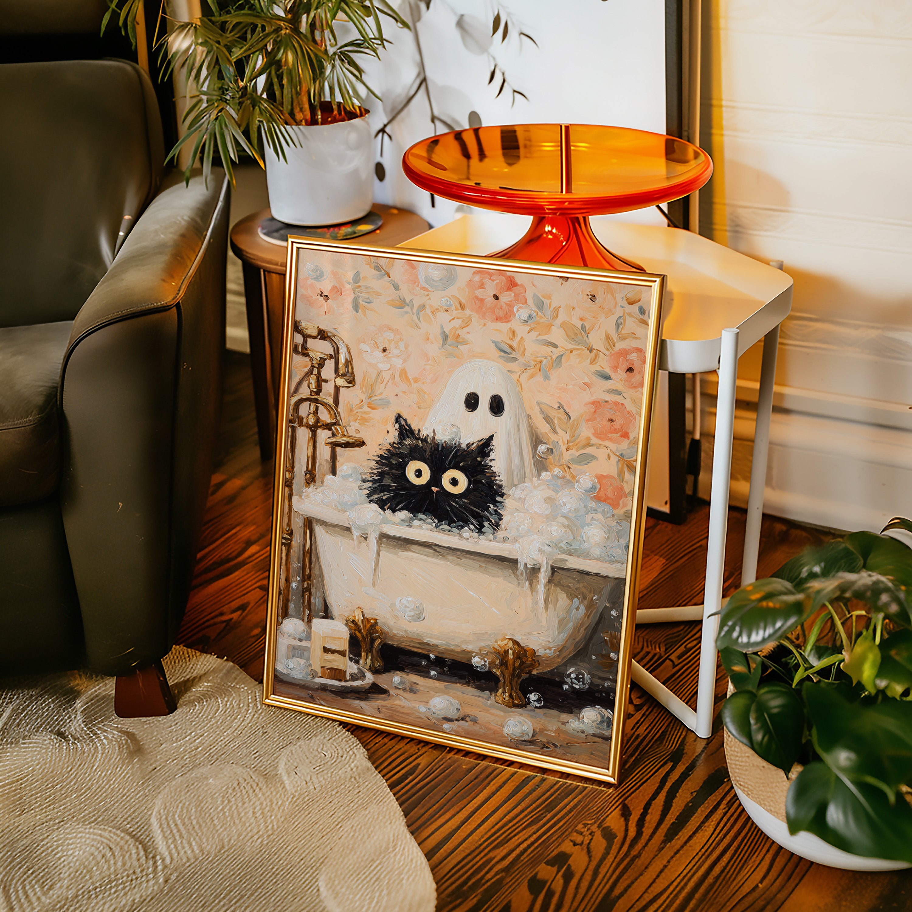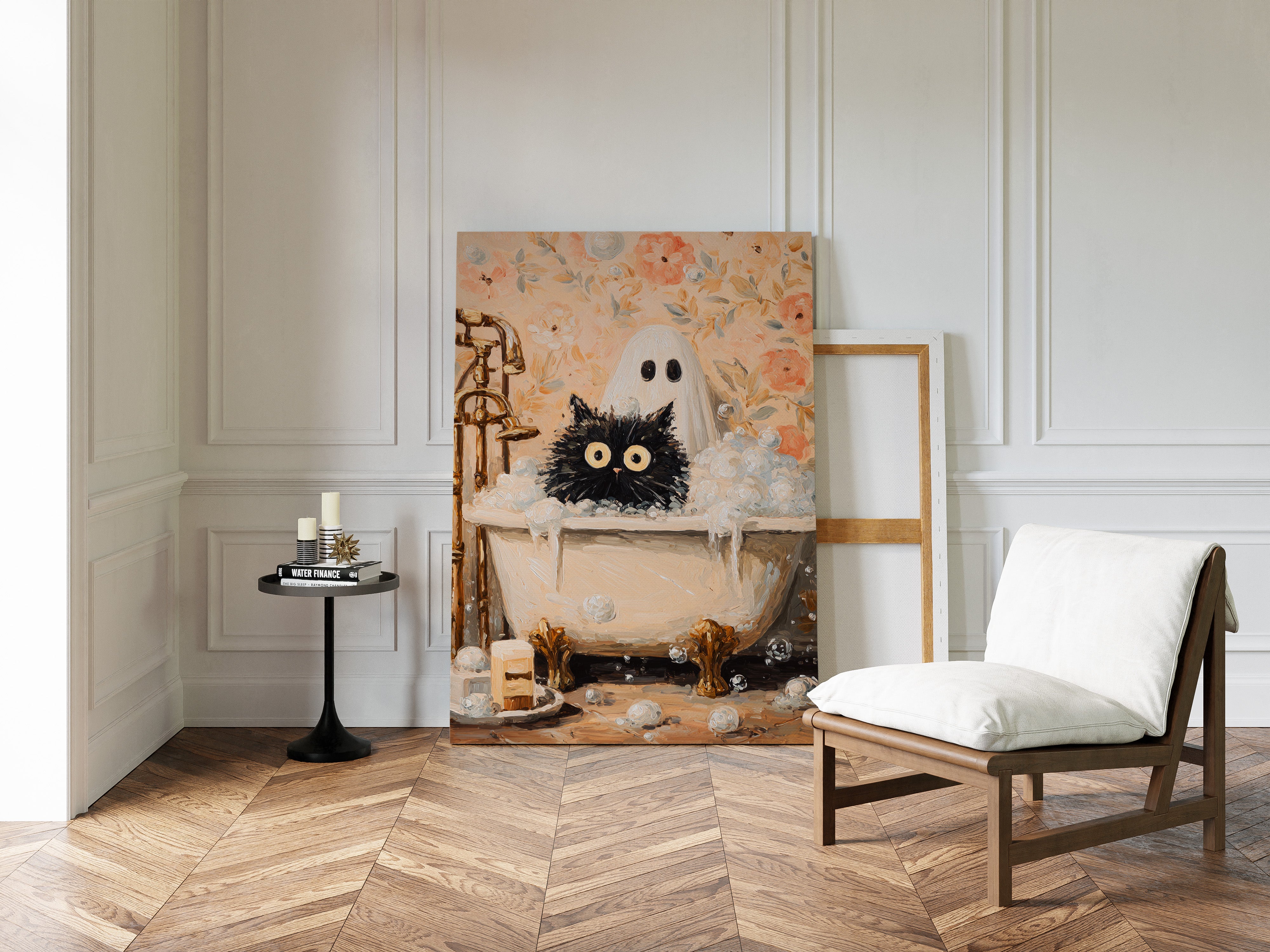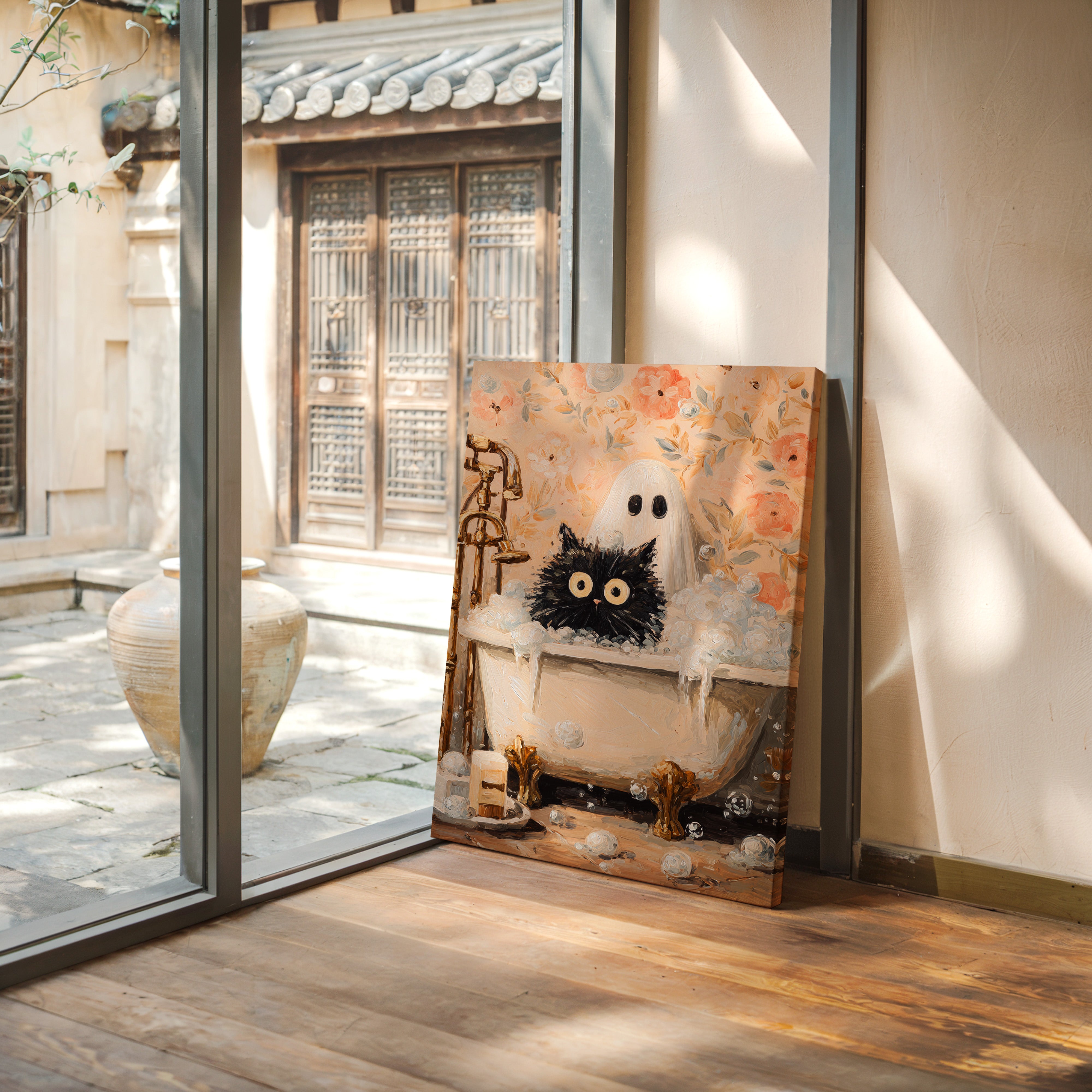 In a cozy corner of a whimsical bathroom, a fluffy black cat with wide eyes sits contentedly among frothy bubbles, while a playful ghost peers curiously from behind. This piece captures the quirky charm of the Artisanal collection, blending humor with warmth. The gentle hues of peach and floral patterns contrast with the boldness of the cat's fur, inviting viewers into a lighthearted moment of unexpected companionship. Perfect for a playful touch in a child's room or a cozy nook, this scene brings joy and whimsy to any space.