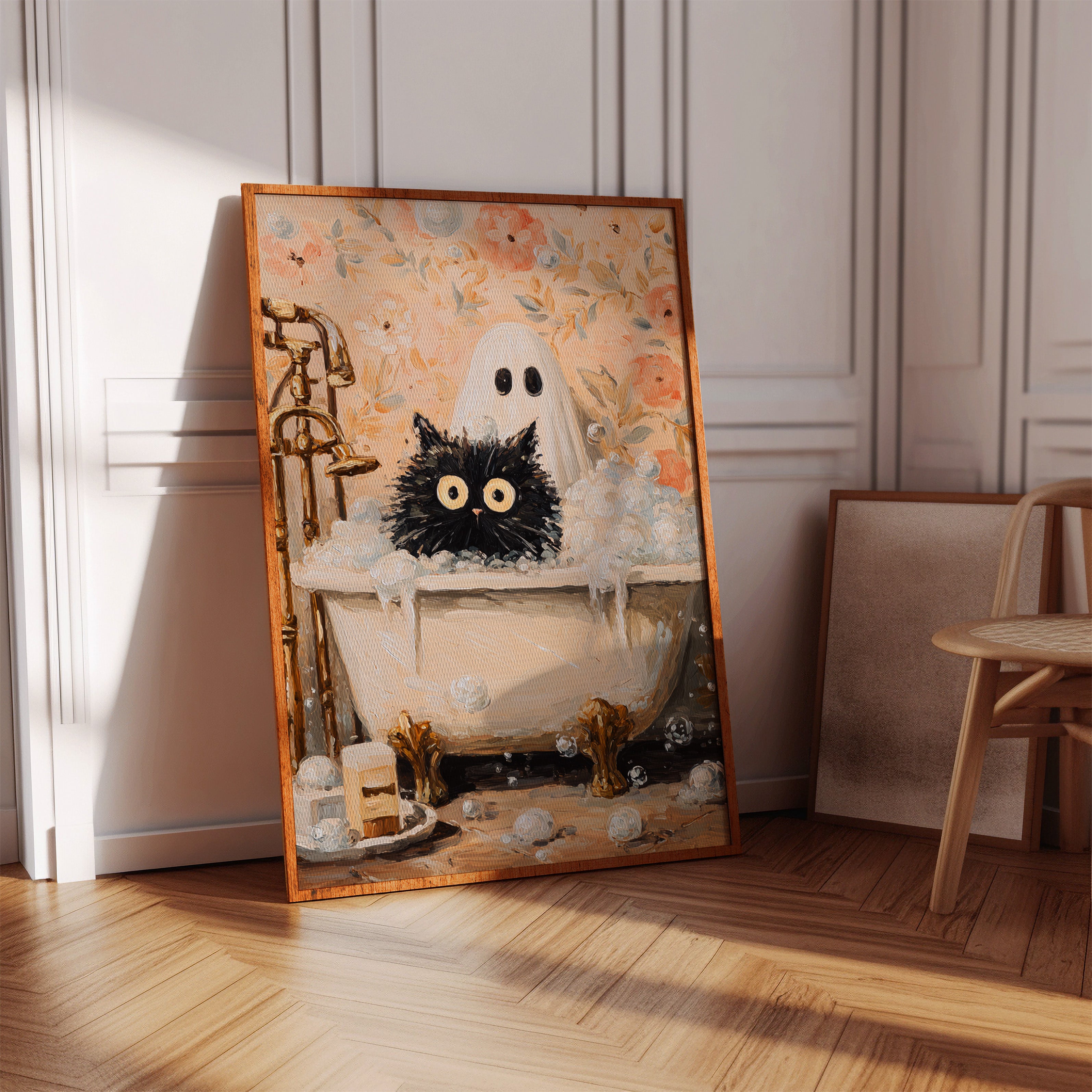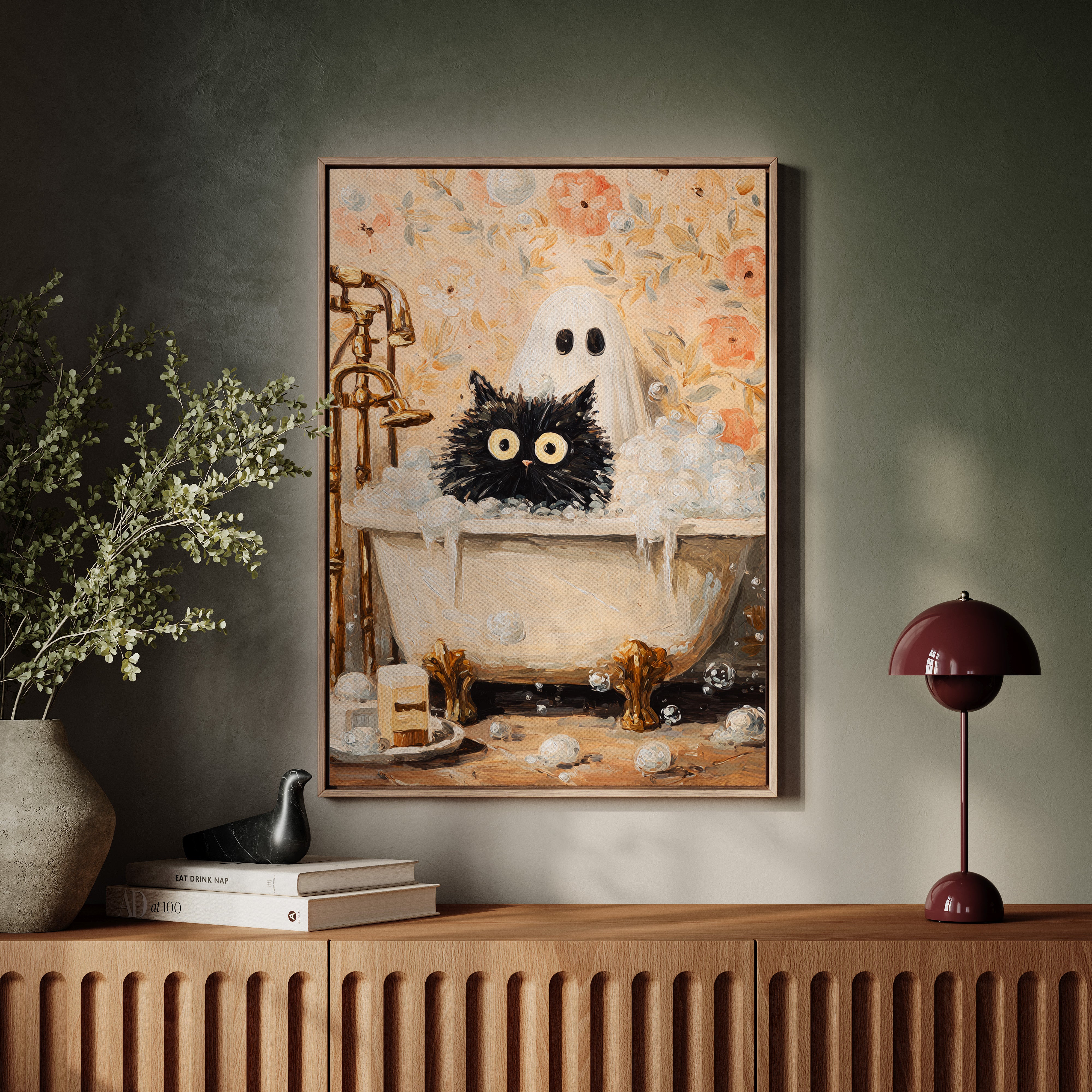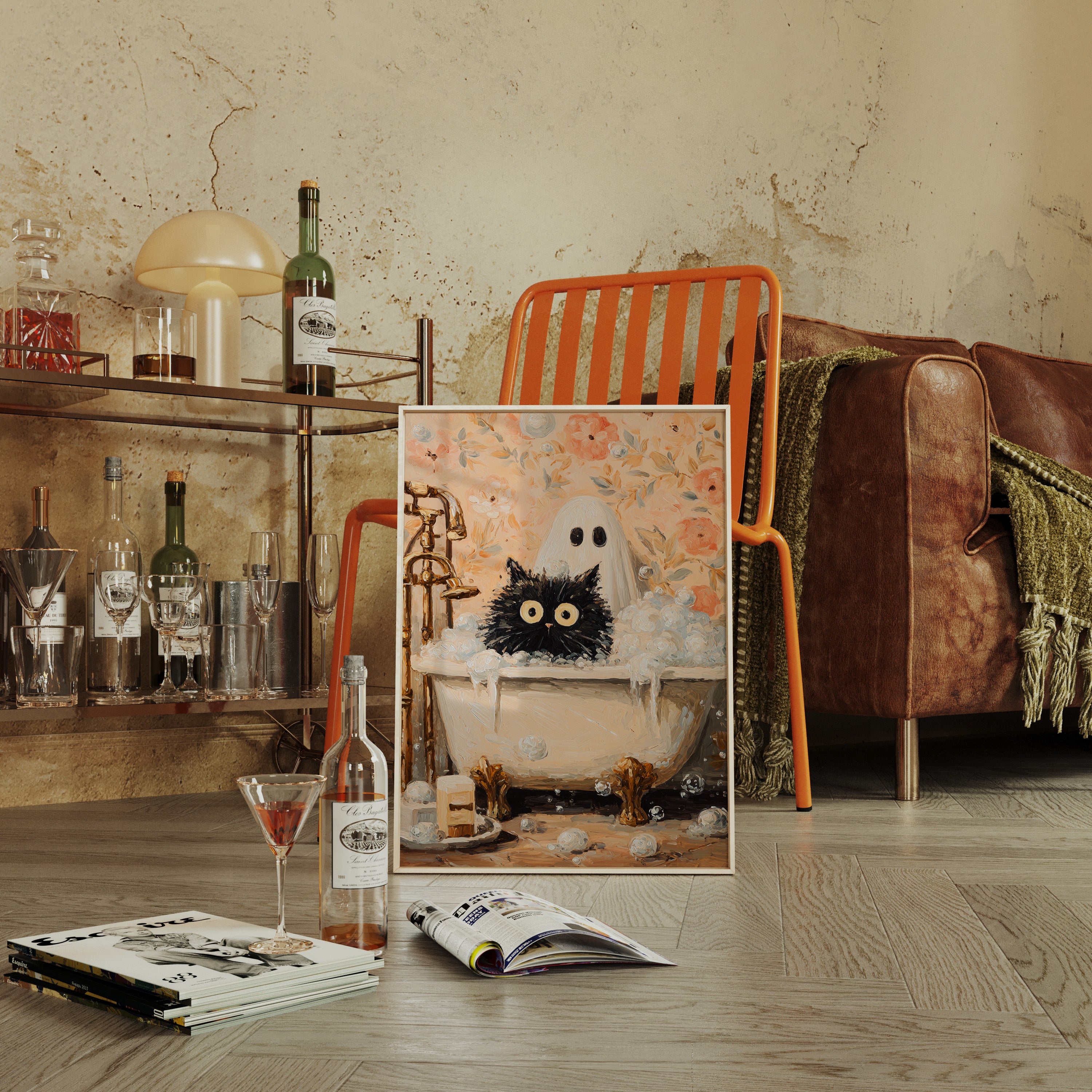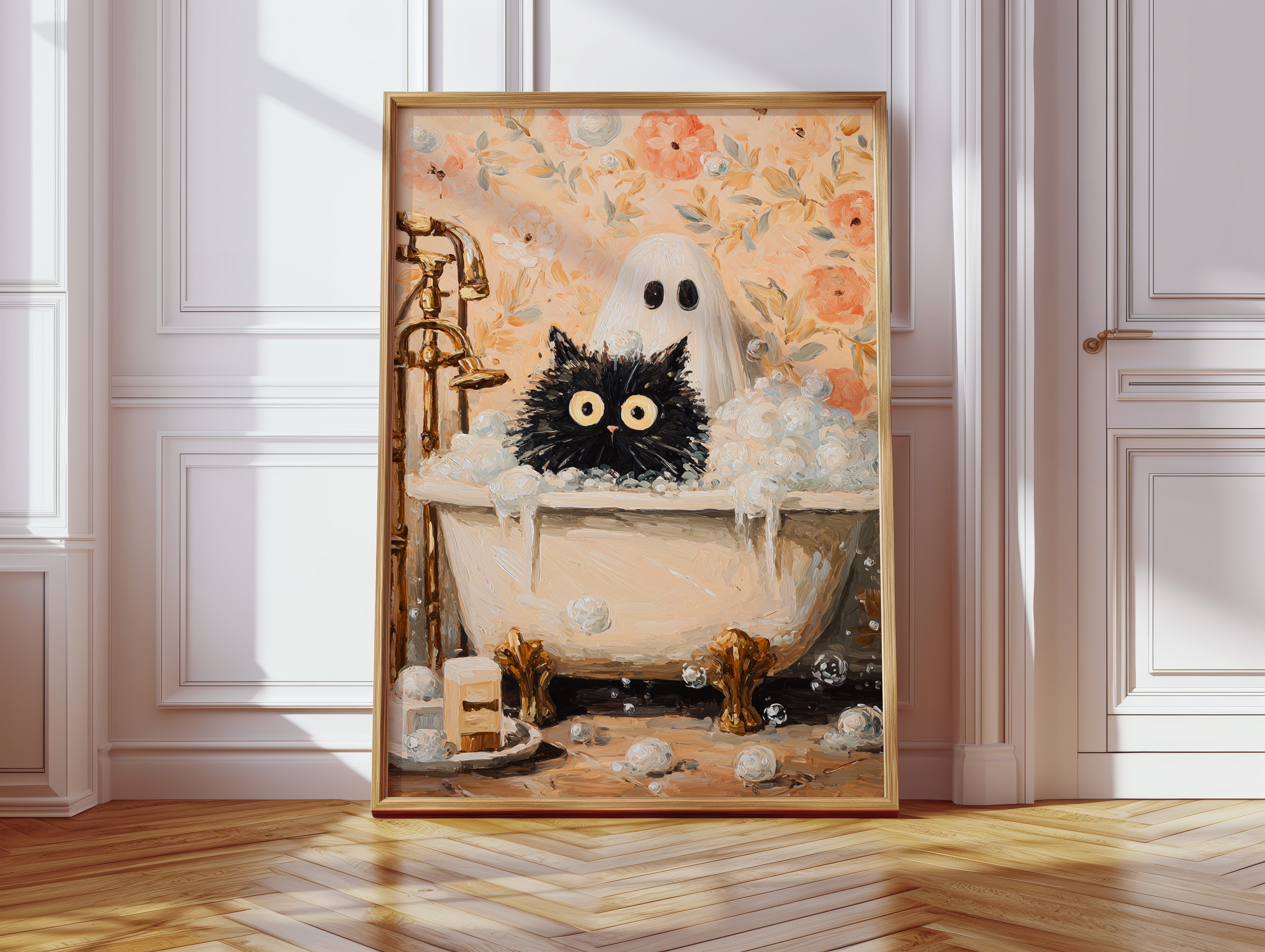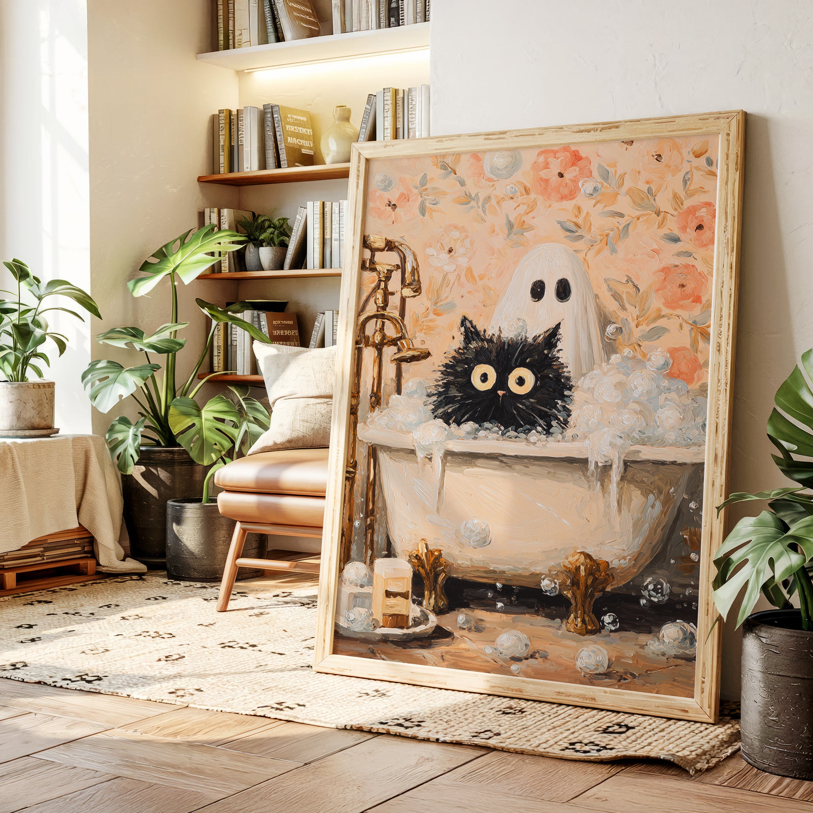In a cozy corner of a whimsical bathroom, a fluffy black cat with wide eyes sits contentedly among frothy bubbles, while a playful ghost peers curiously from behind. This piece captures the quirky charm of the Artisanal collection, blending humor with warmth. The gentle hues of peach and floral patterns contrast with the boldness of the cat's fur, inviting viewers into a lighthearted moment of unexpected companionship. Perfect for a playful touch in a child's room or a cozy nook, this scene brings joy and whimsy to any space.