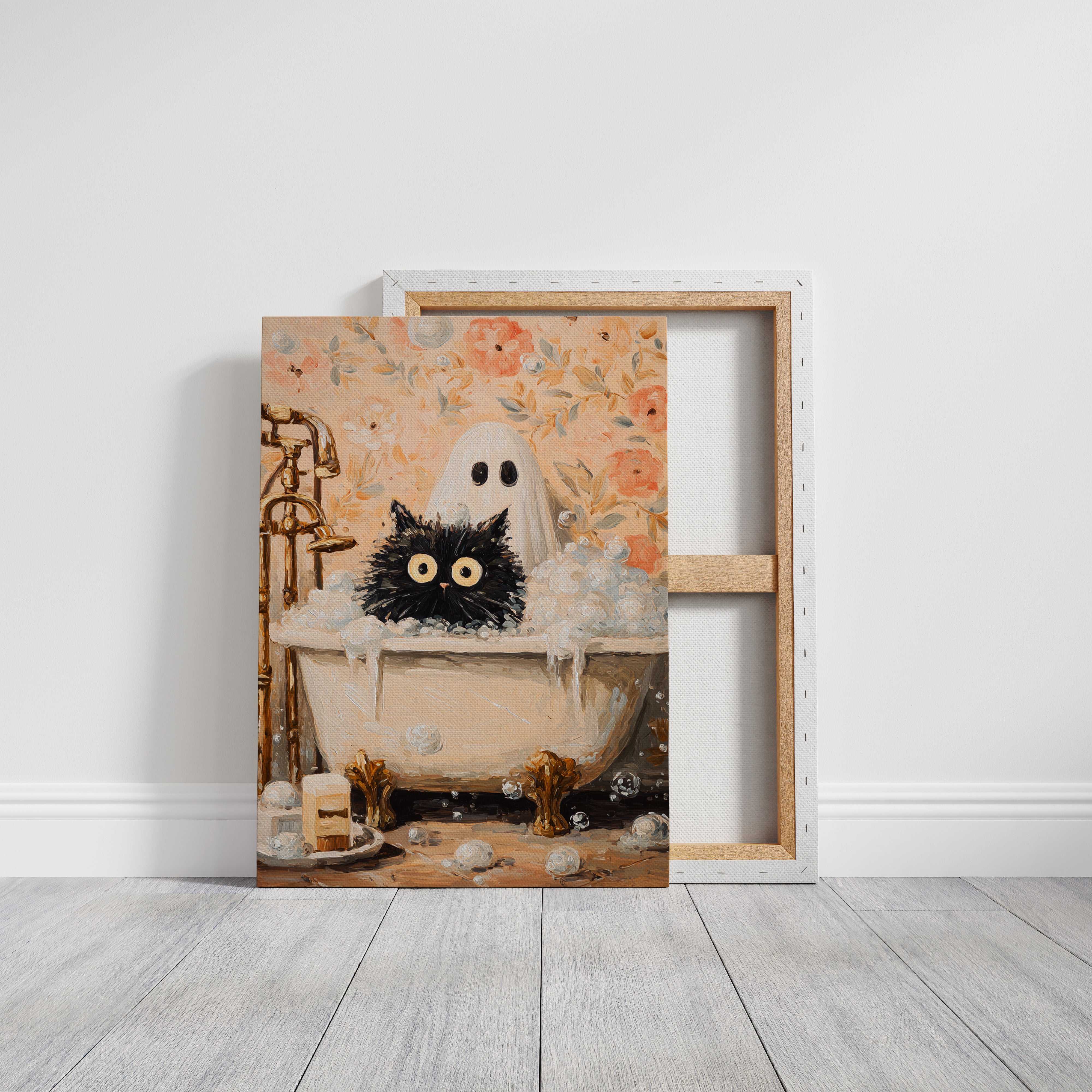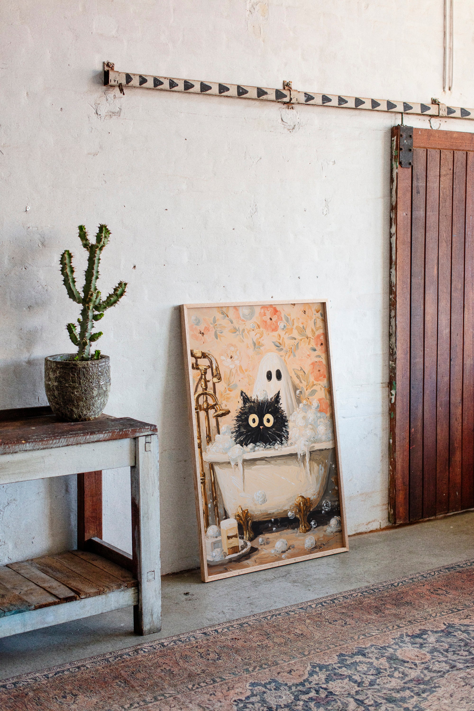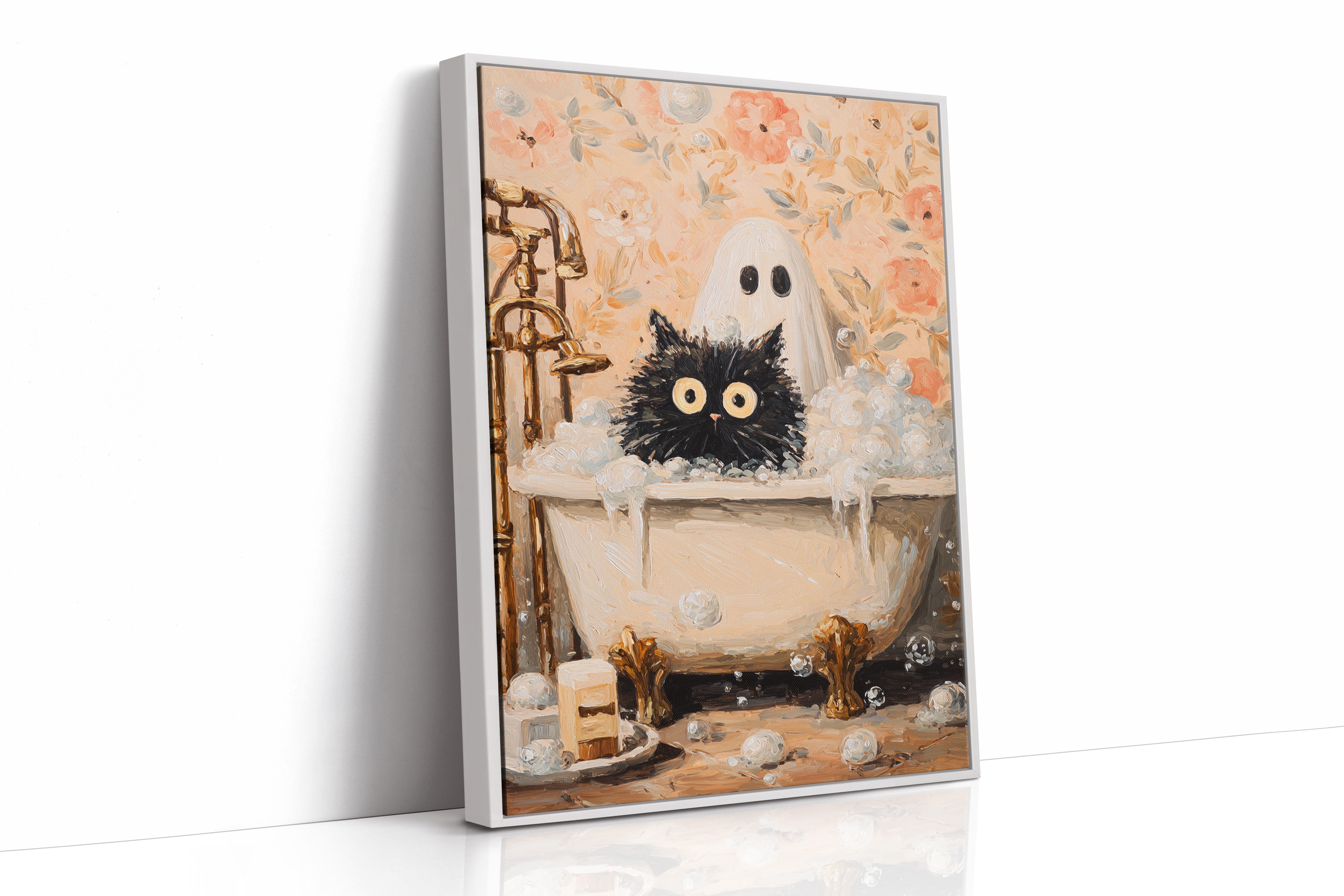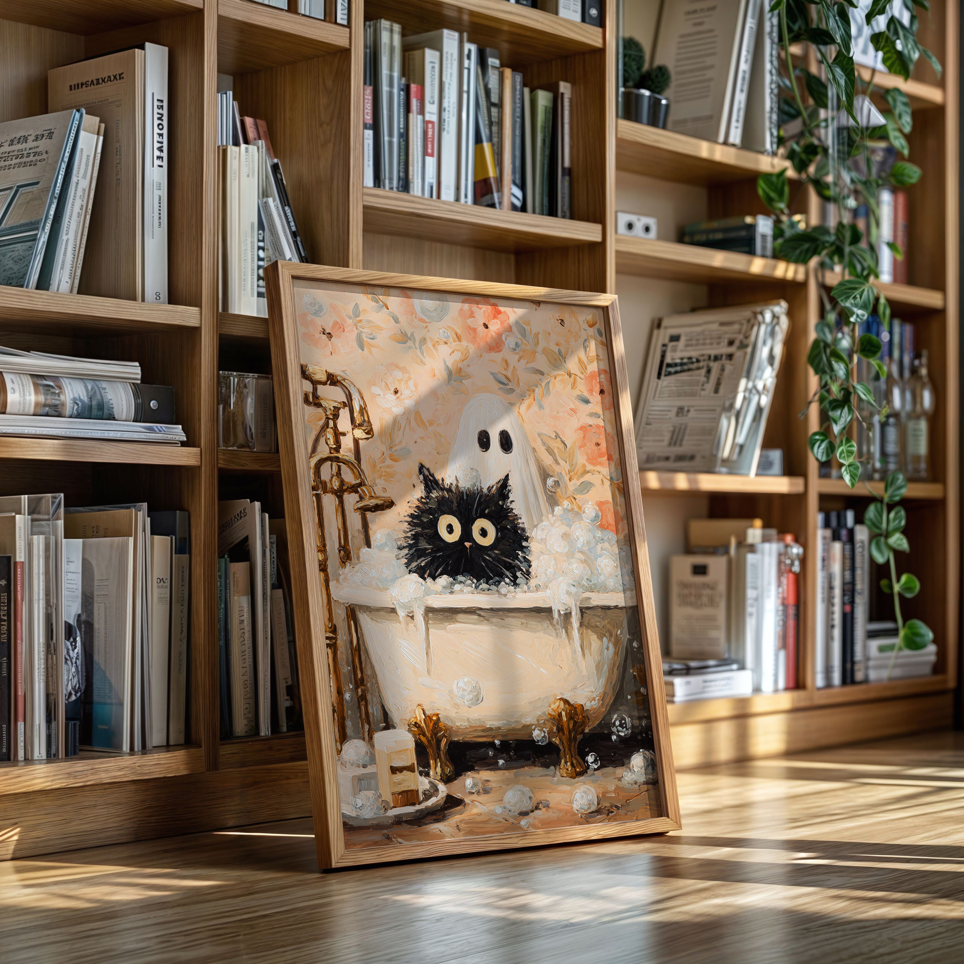 In a cozy corner of a whimsical bathroom, a fluffy black cat with wide eyes sits contentedly among frothy bubbles, while a playful ghost peers curiously from behind. This piece captures the quirky charm of the Artisanal collection, blending humor with warmth. The gentle hues of peach and floral patterns contrast with the boldness of the cat's fur, inviting viewers into a lighthearted moment of unexpected companionship. Perfect for a playful touch in a child's room or a cozy nook, this scene brings joy and whimsy to any space.
