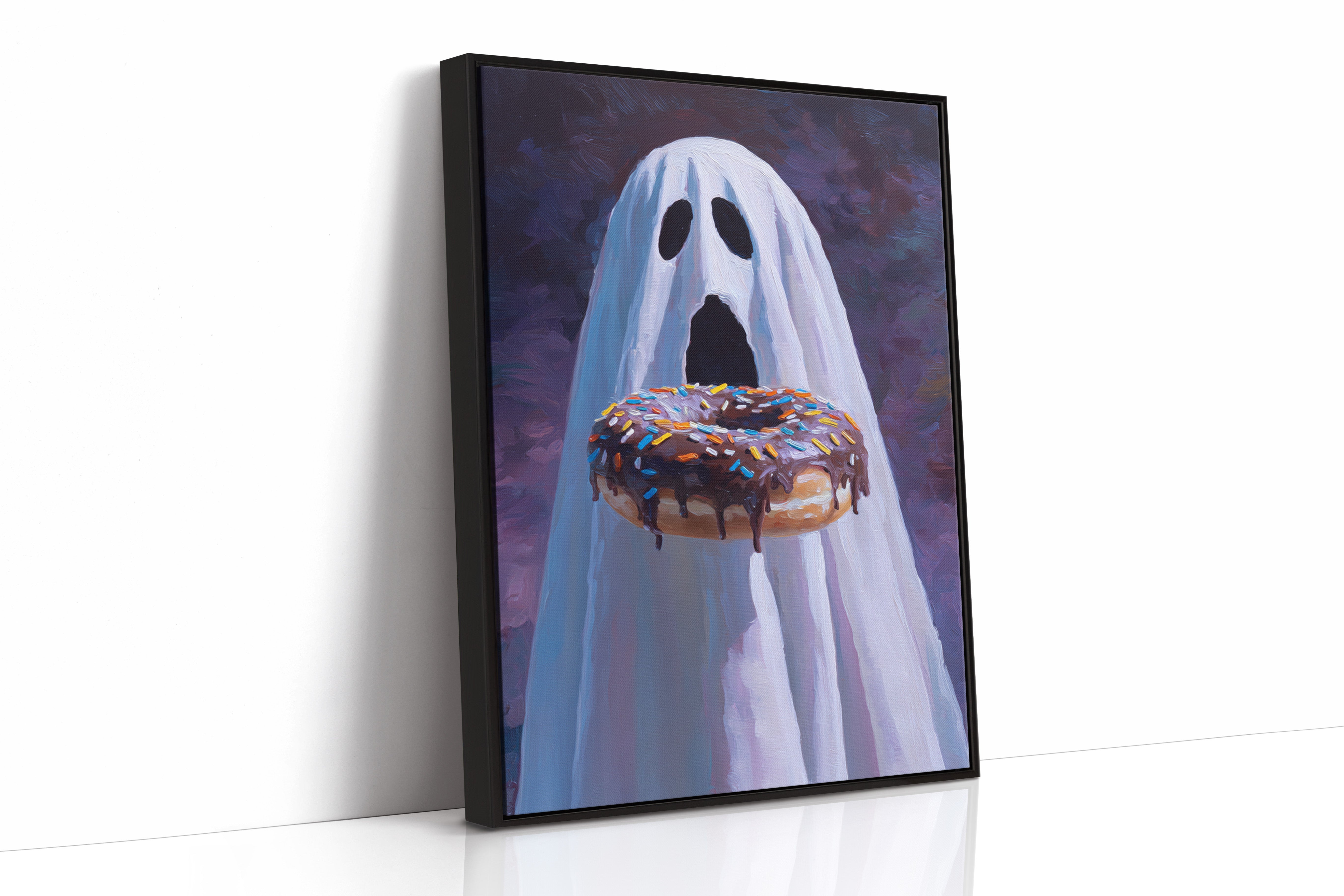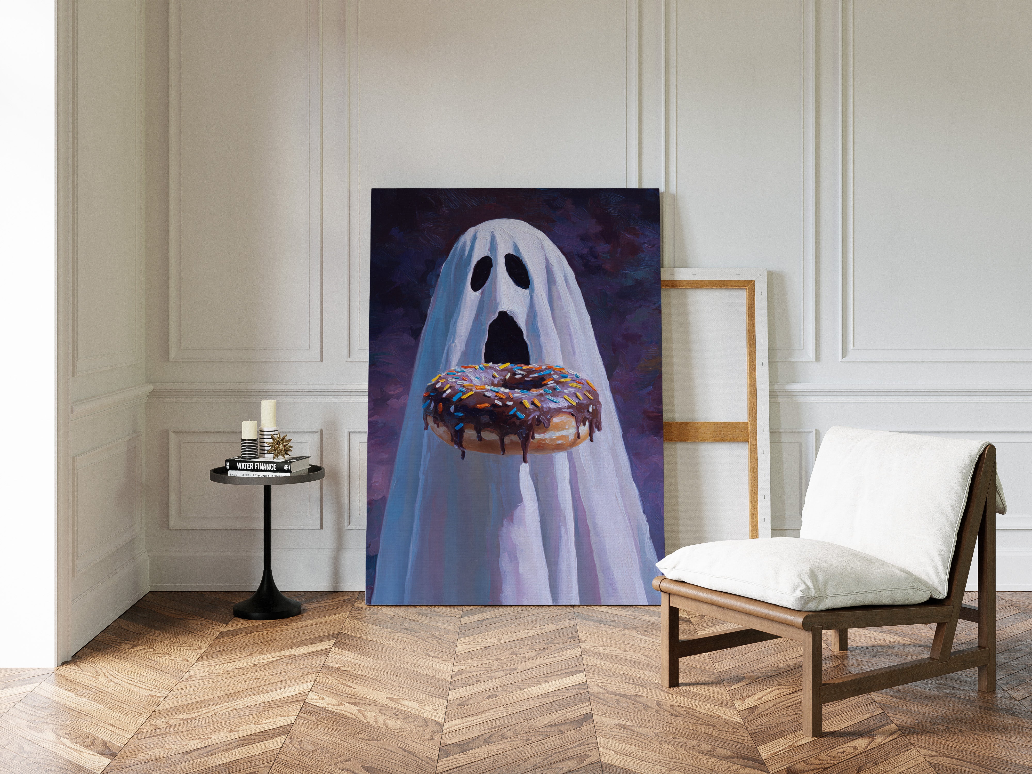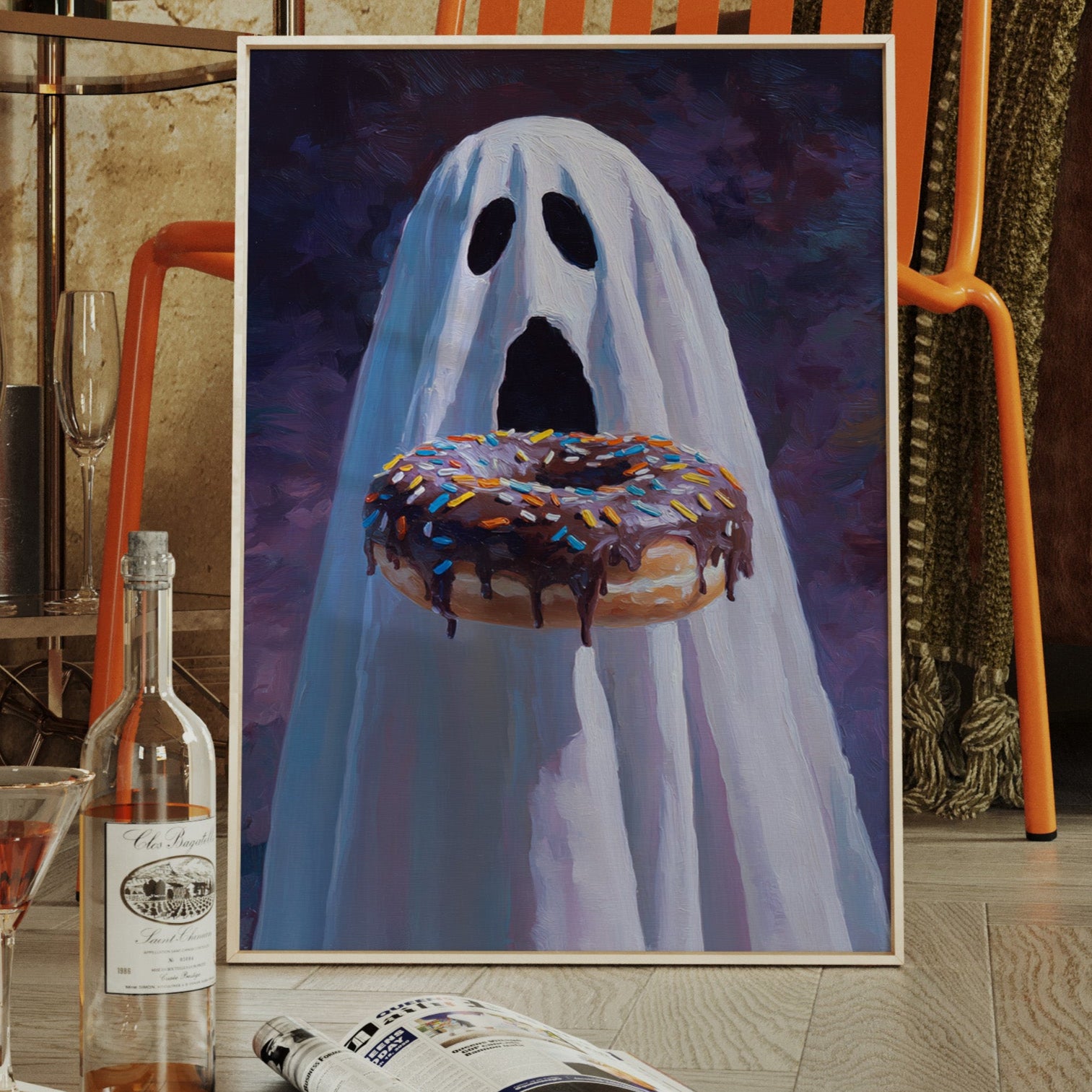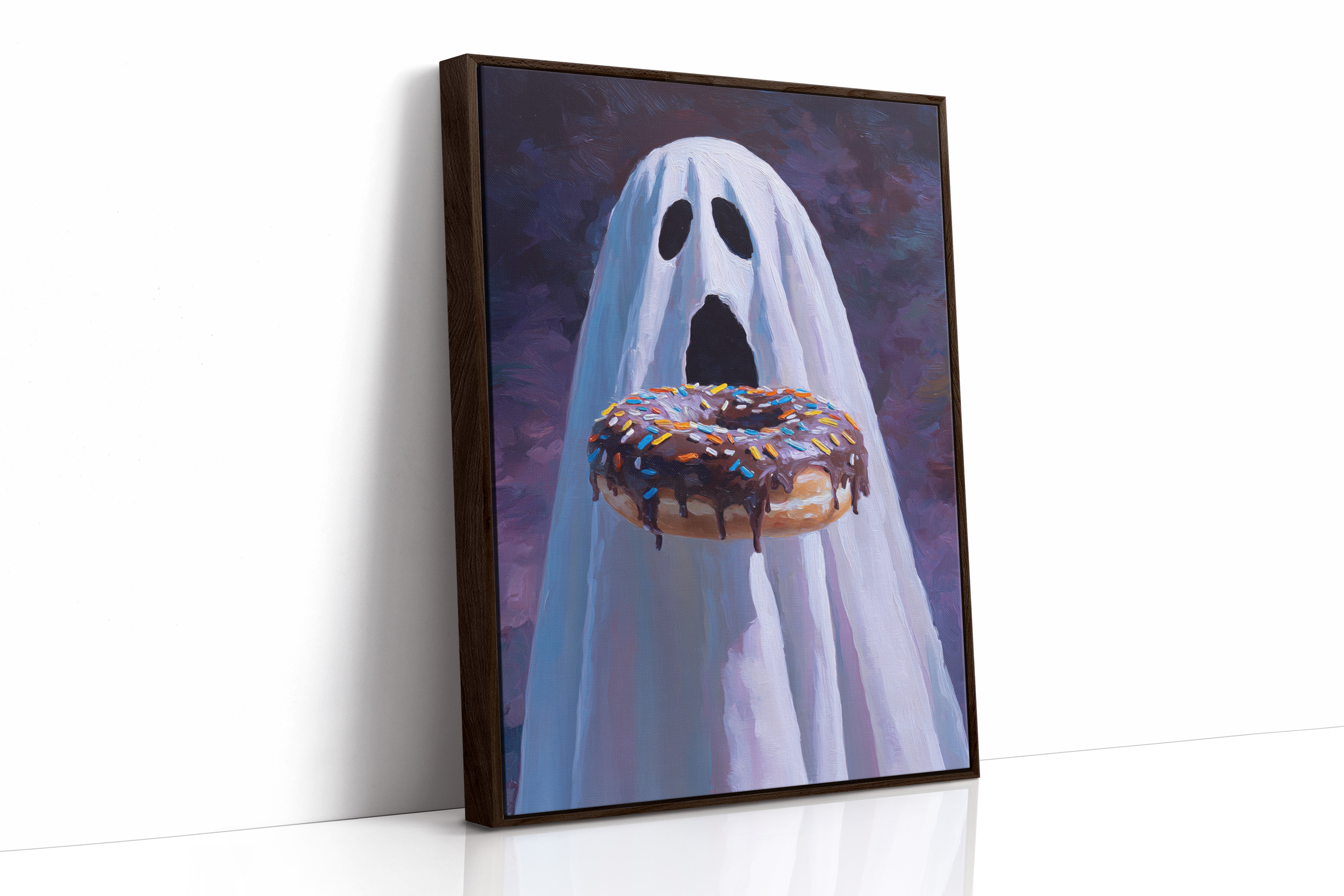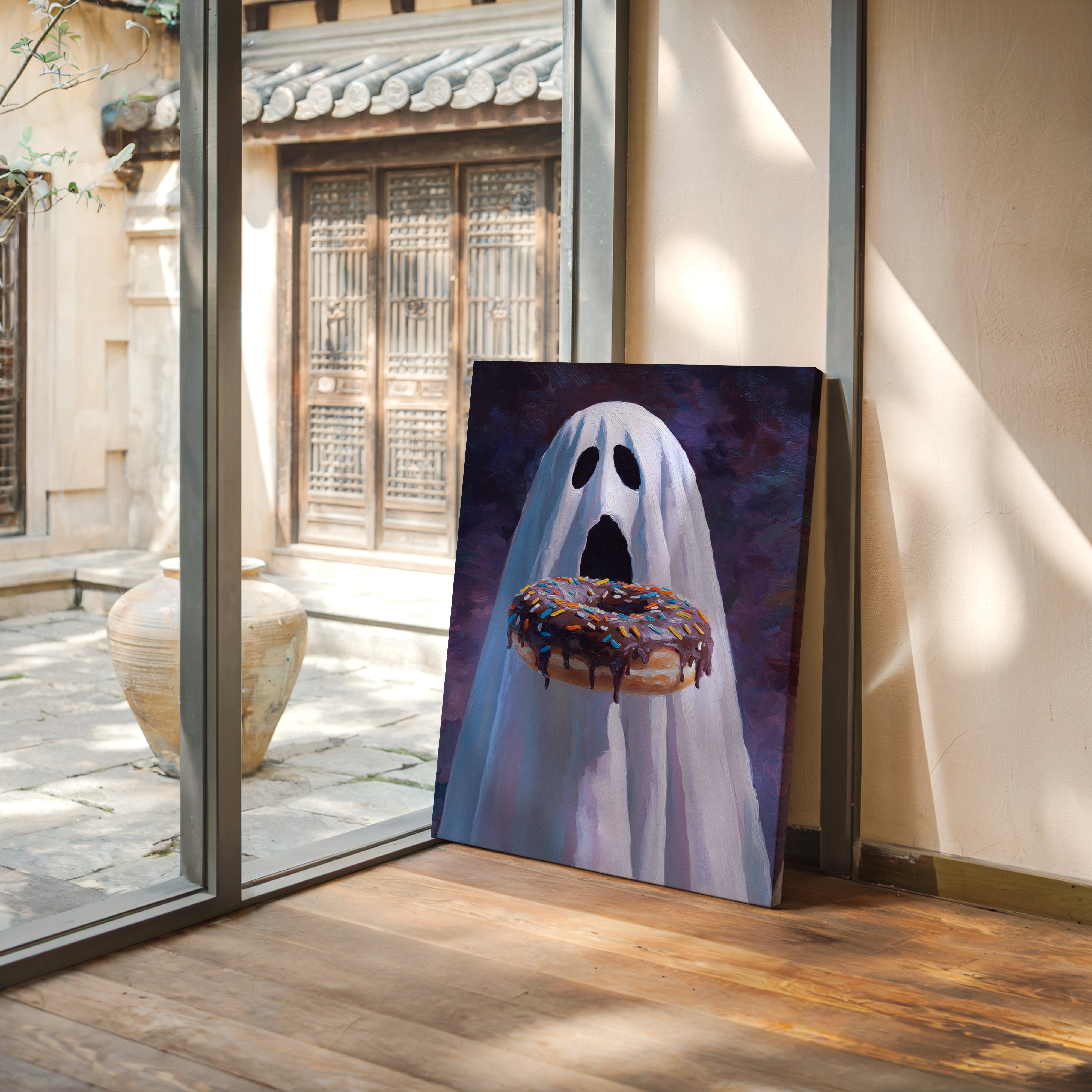 In a moment both whimsical and eerie, a ghostly figure stands poised, cradling a decadent donut drizzled in chocolate and adorned with colorful sprinkles. This piece captures the playful spirit of the Artisanal collection, blending humor with artistry. As the luminous colors dance across the canvas, the ghost's expression evokes a blend of mischief and longing, inviting viewers to ponder the delightful intersection of treat and trickery. Perfect for a kitchen nook or playful dining area, this artwork sparks conversation and joy.