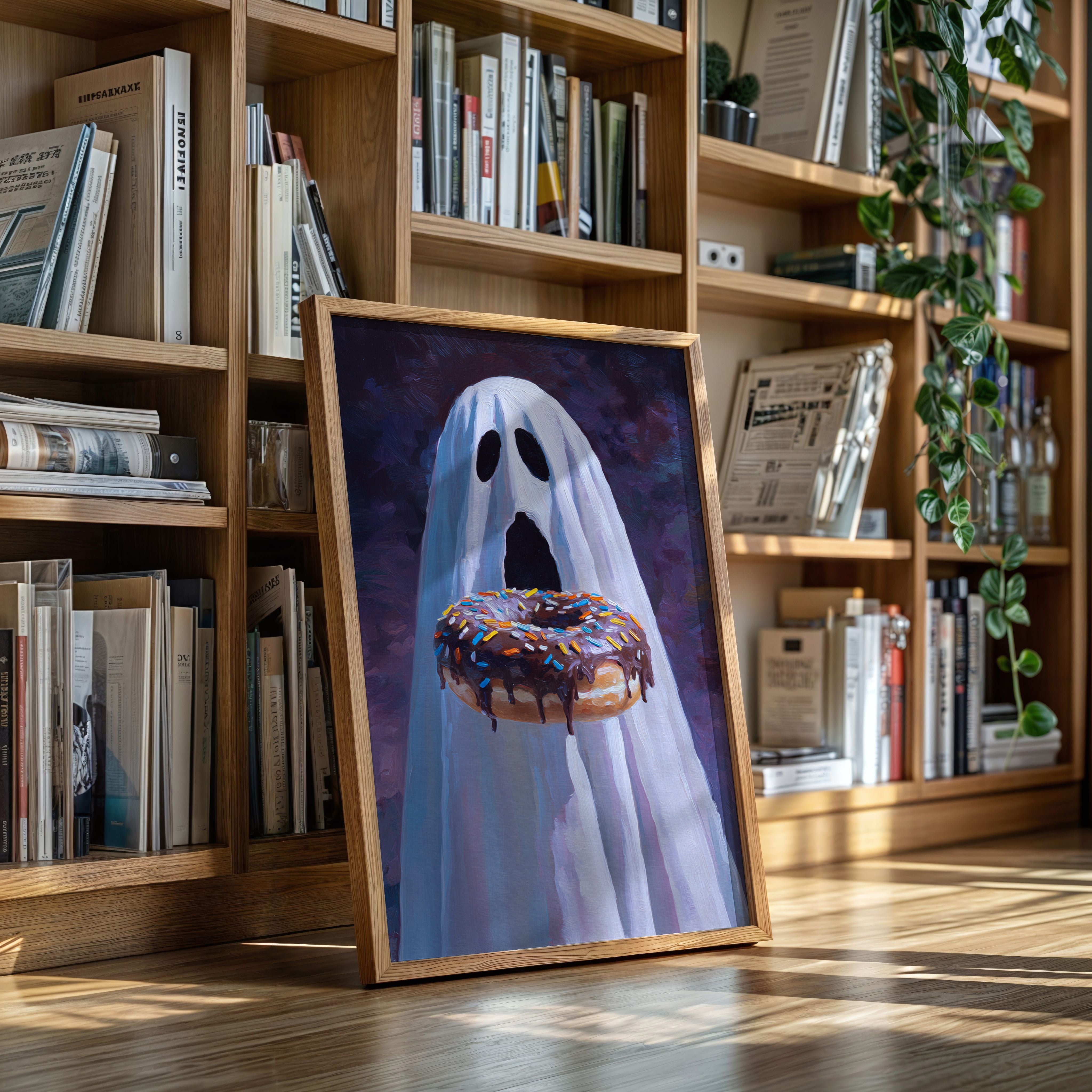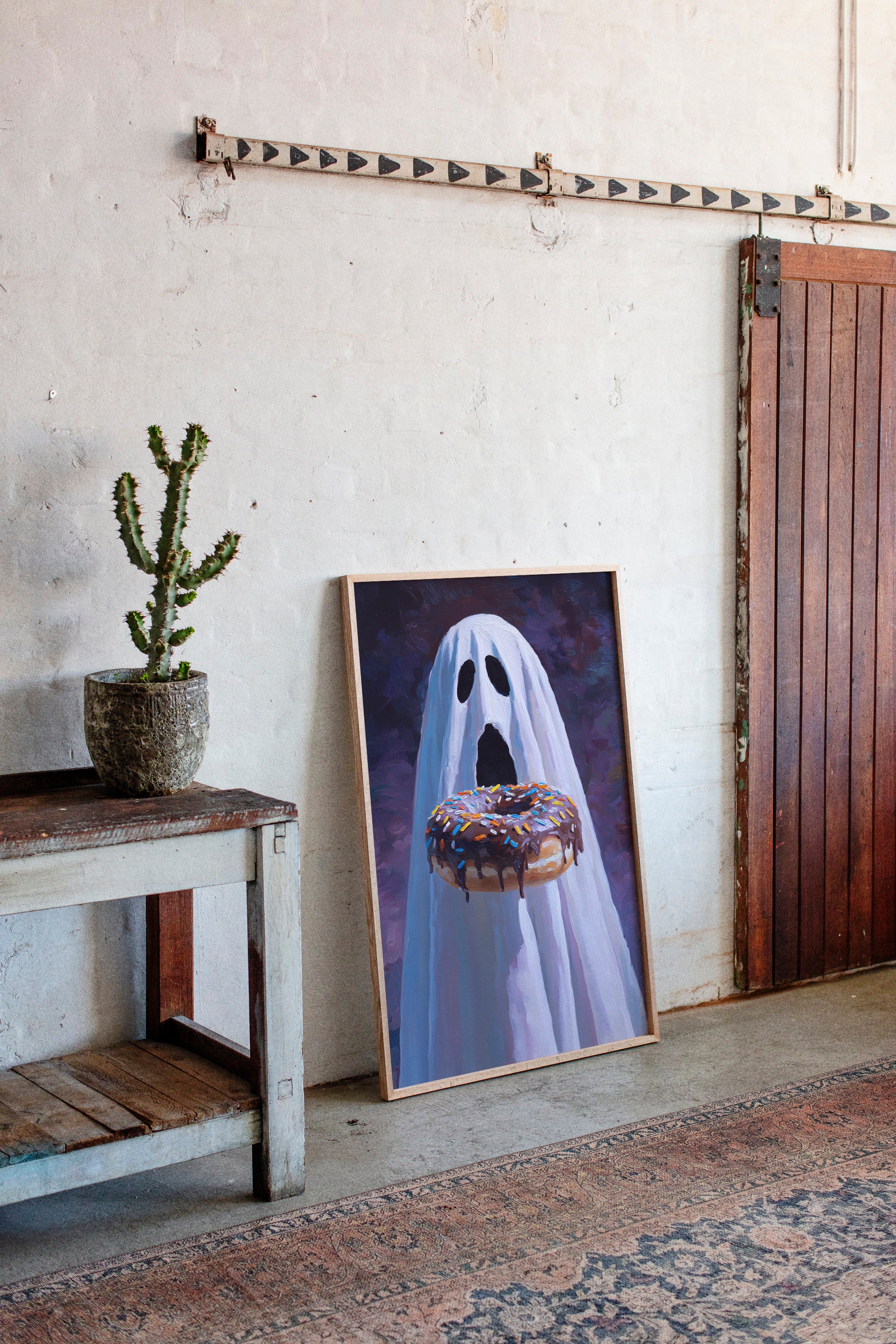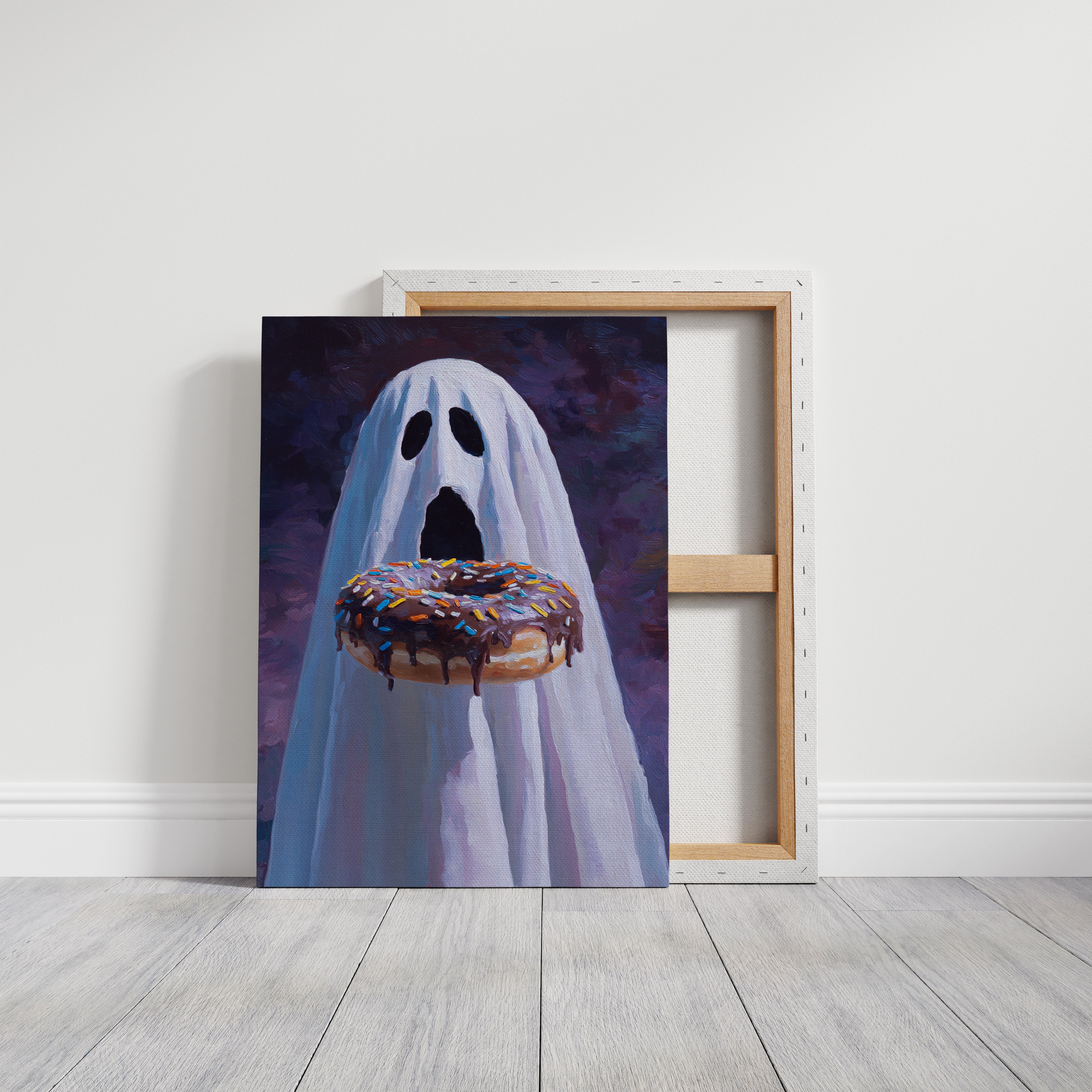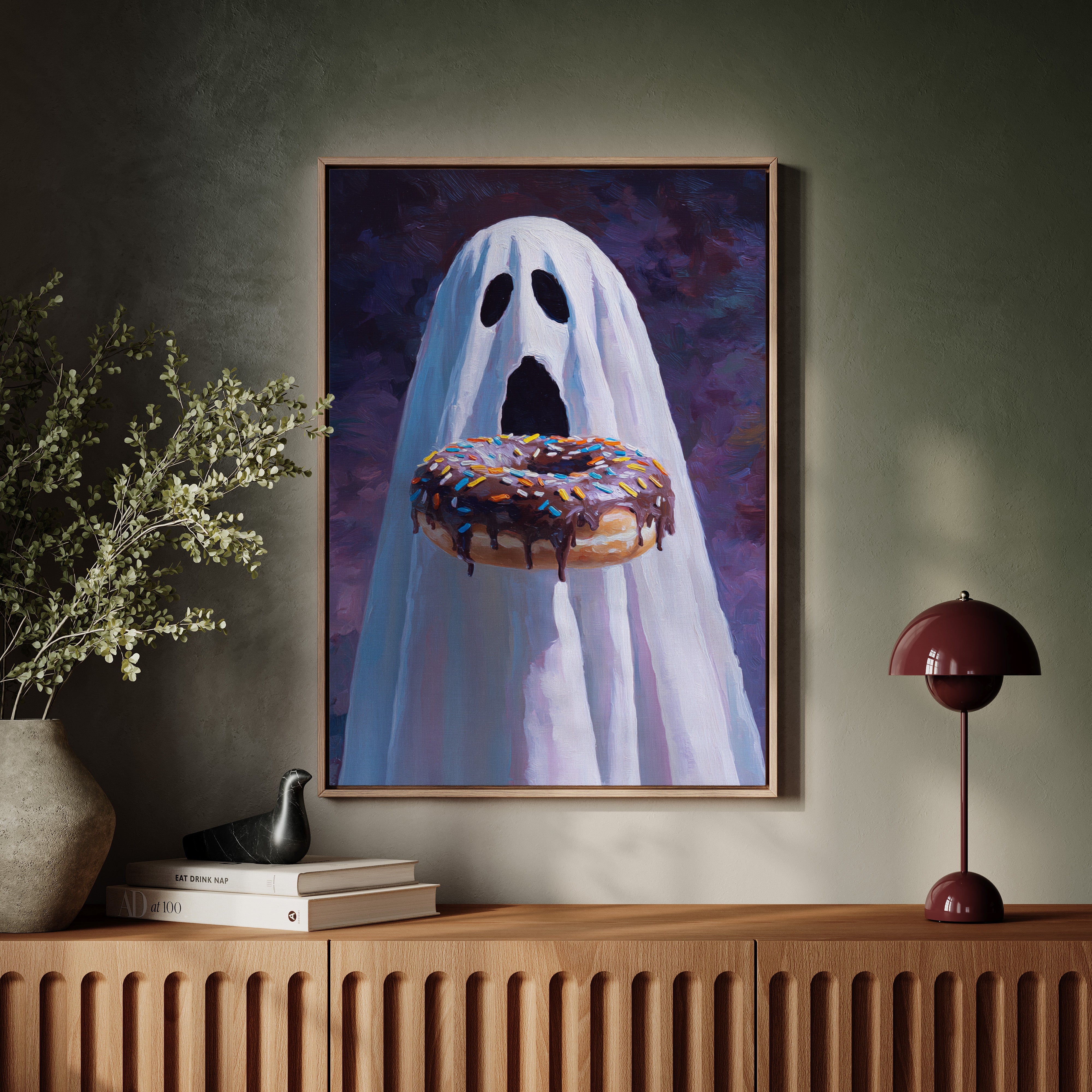 In a moment both whimsical and eerie, a ghostly figure stands poised, cradling a decadent donut drizzled in chocolate and adorned with colorful sprinkles. This piece captures the playful spirit of the Artisanal collection, blending humor with artistry. As the luminous colors dance across the canvas, the ghost's expression evokes a blend of mischief and longing, inviting viewers to ponder the delightful intersection of treat and trickery. Perfect for a kitchen nook or playful dining area, this artwork sparks conversation and joy.