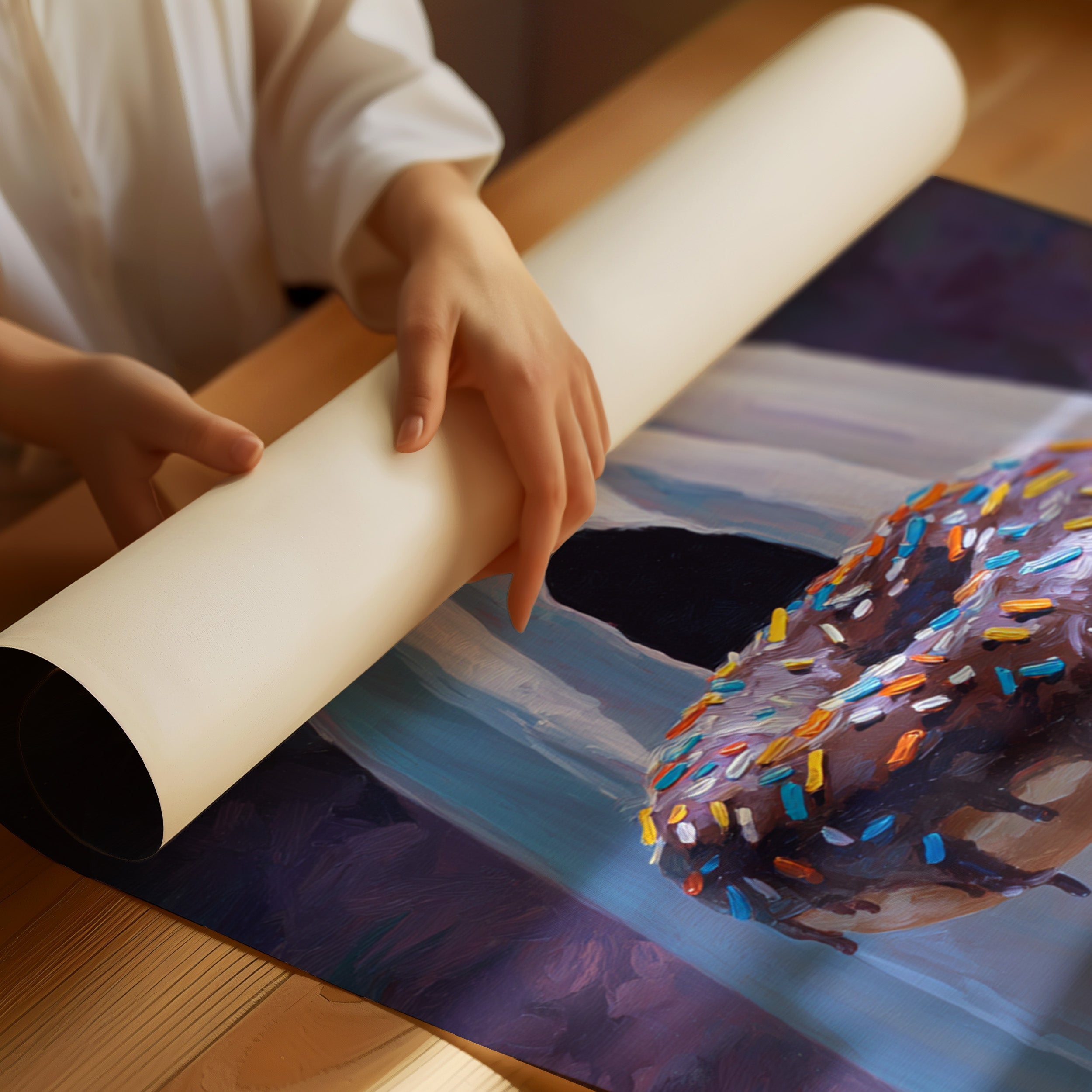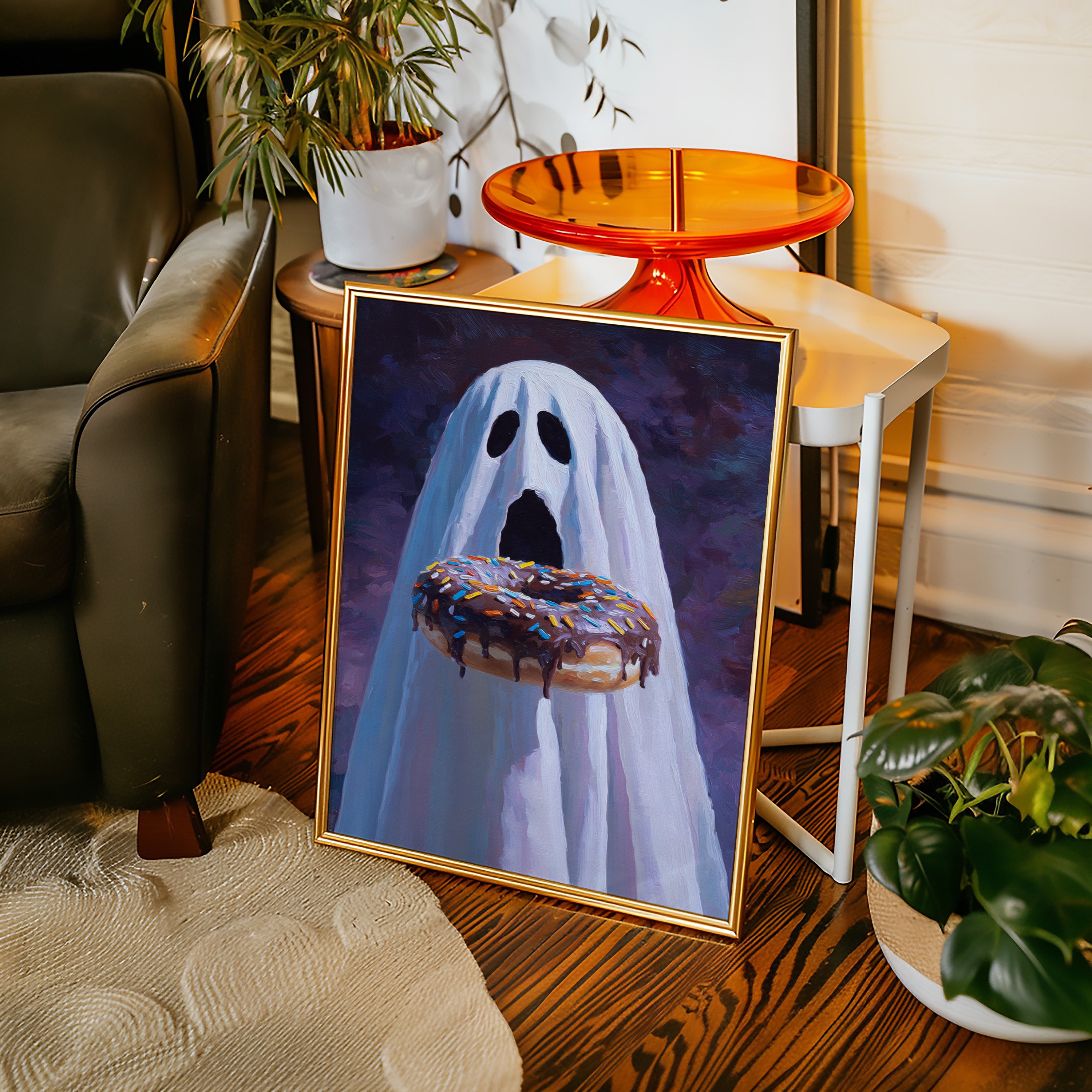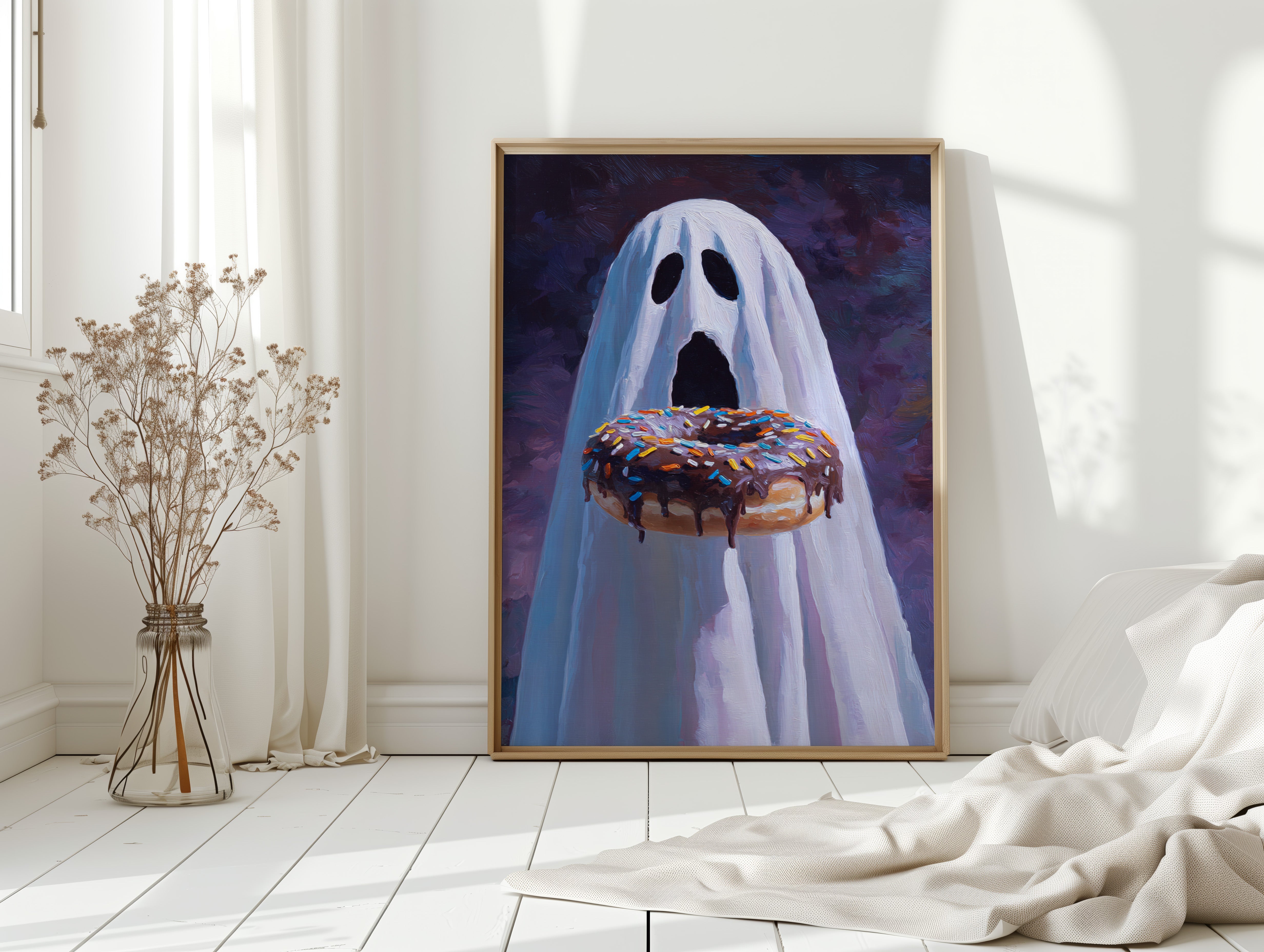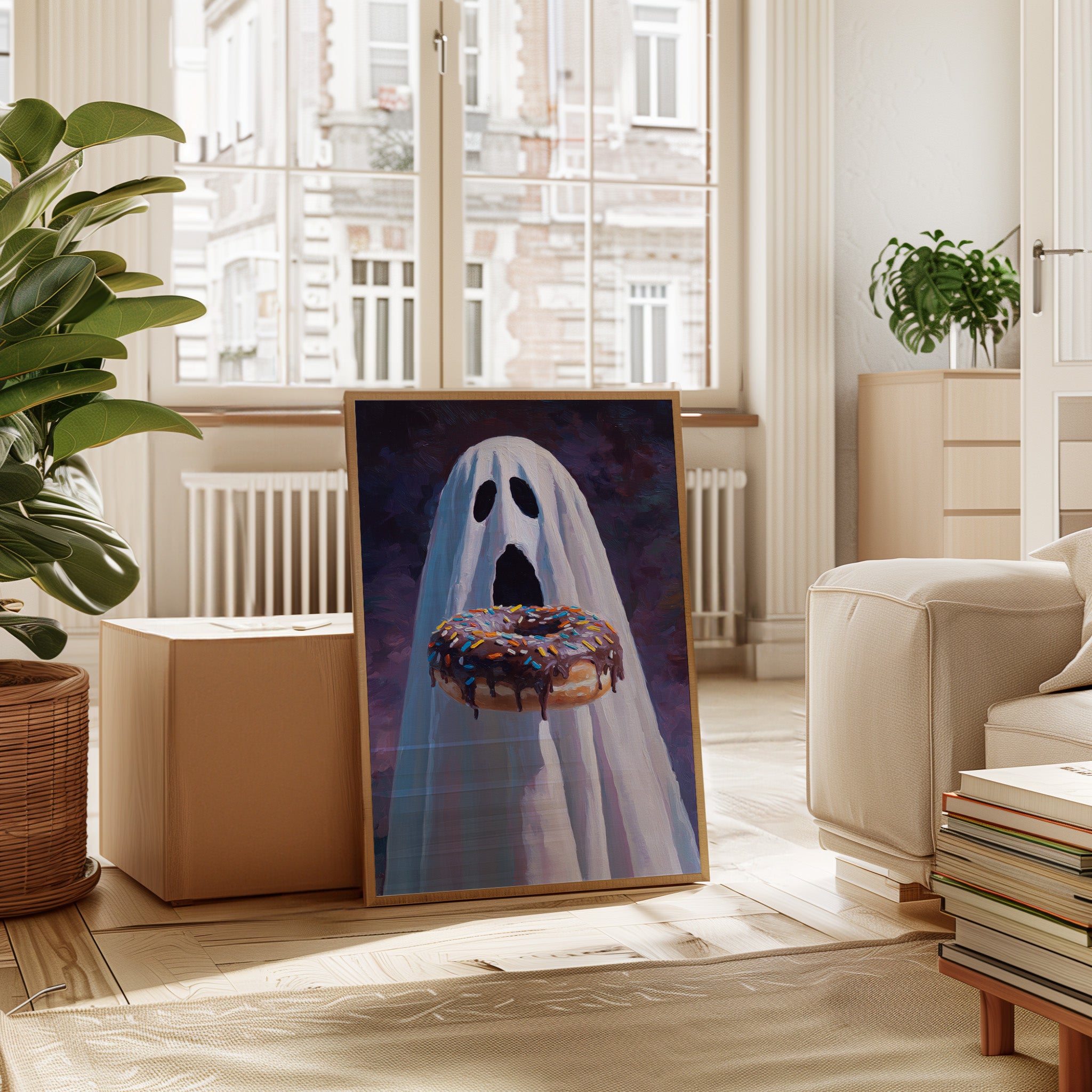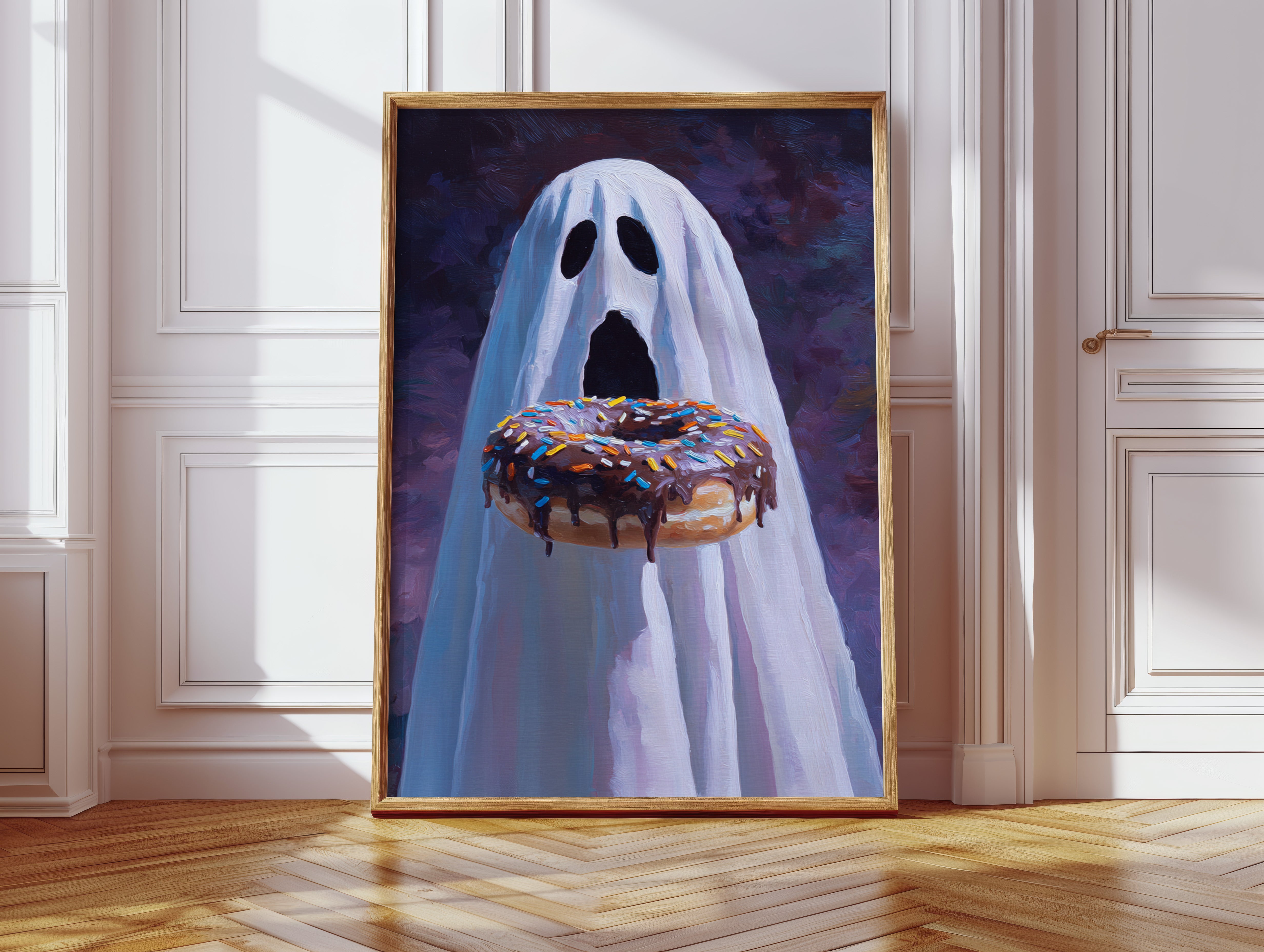 In a moment both whimsical and eerie, a ghostly figure stands poised, cradling a decadent donut drizzled in chocolate and adorned with colorful sprinkles. This piece captures the playful spirit of the Artisanal collection, blending humor with artistry. As the luminous colors dance across the canvas, the ghost's expression evokes a blend of mischief and longing, inviting viewers to ponder the delightful intersection of treat and trickery. Perfect for a kitchen nook or playful dining area, this artwork sparks conversation and joy.