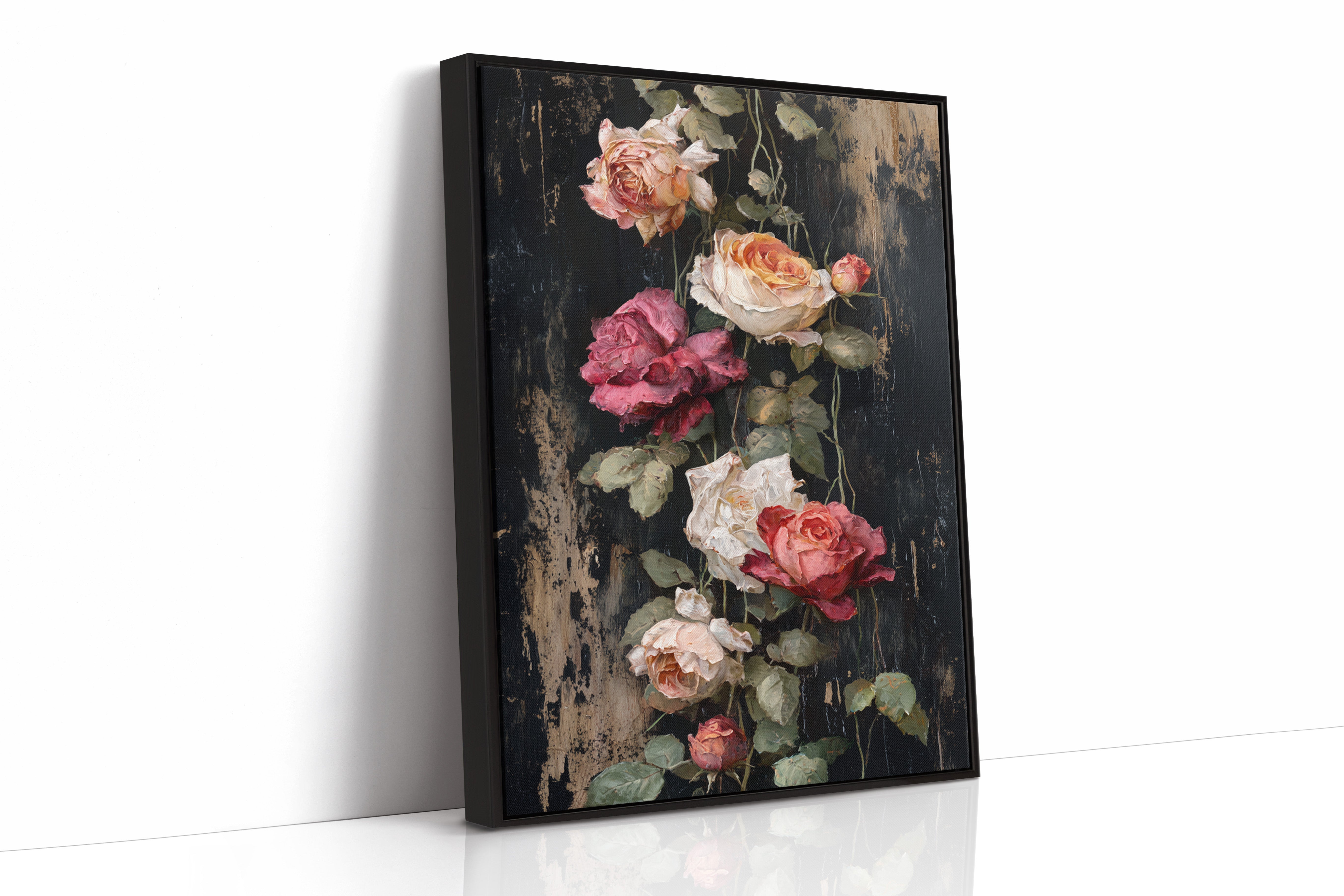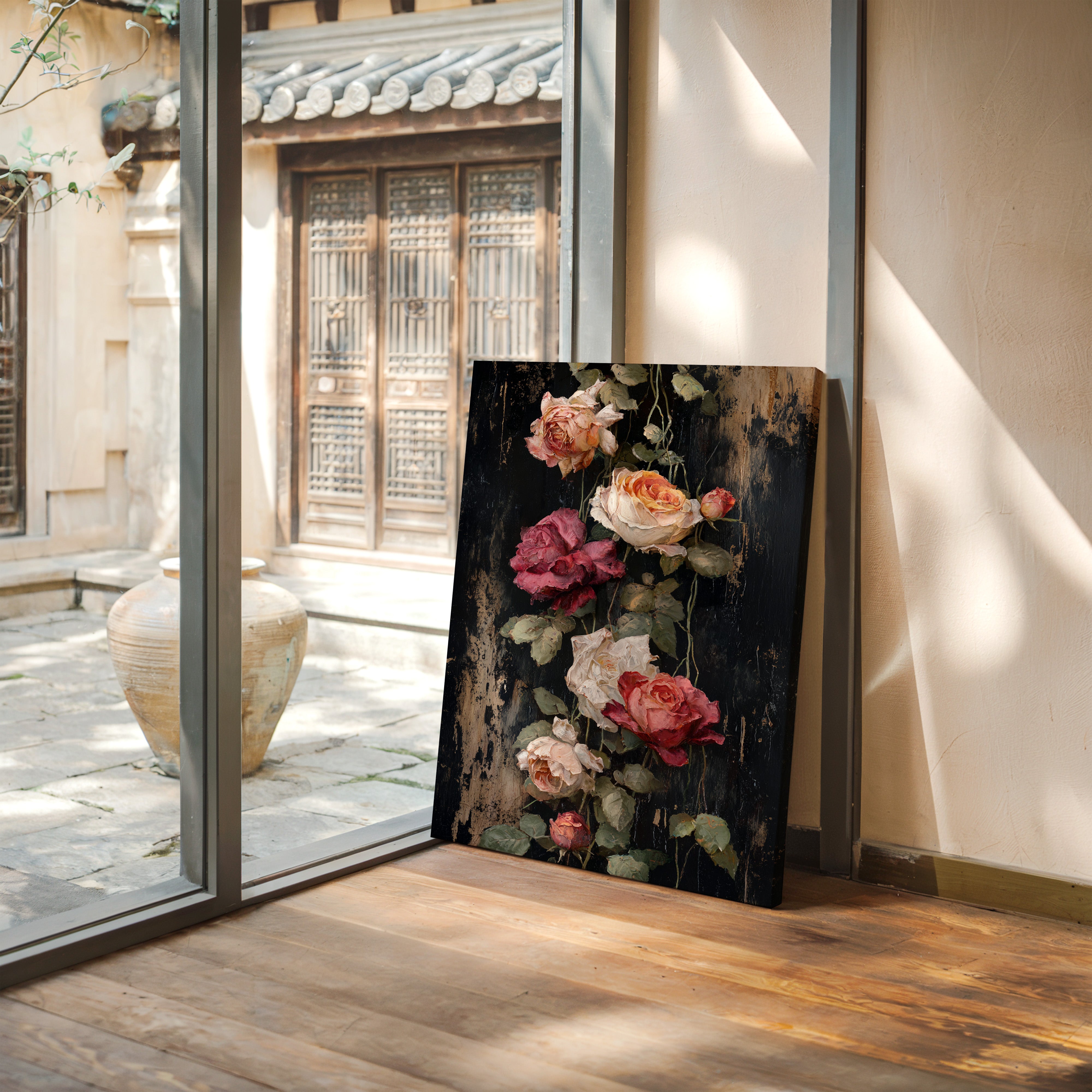 In a quiet embrace, roses unfurl their stories, each petal a chapter in a tale of love and longing. This piece captures the essence of artisanal beauty, where nature and craftsmanship intertwine. Rich hues of crimson, blush, and ivory dance against a backdrop of aged textures, evoking a sense of nostalgia and warmth. Imagine this floral symphony adorning your living space, inviting the charm of a garden in full bloom.