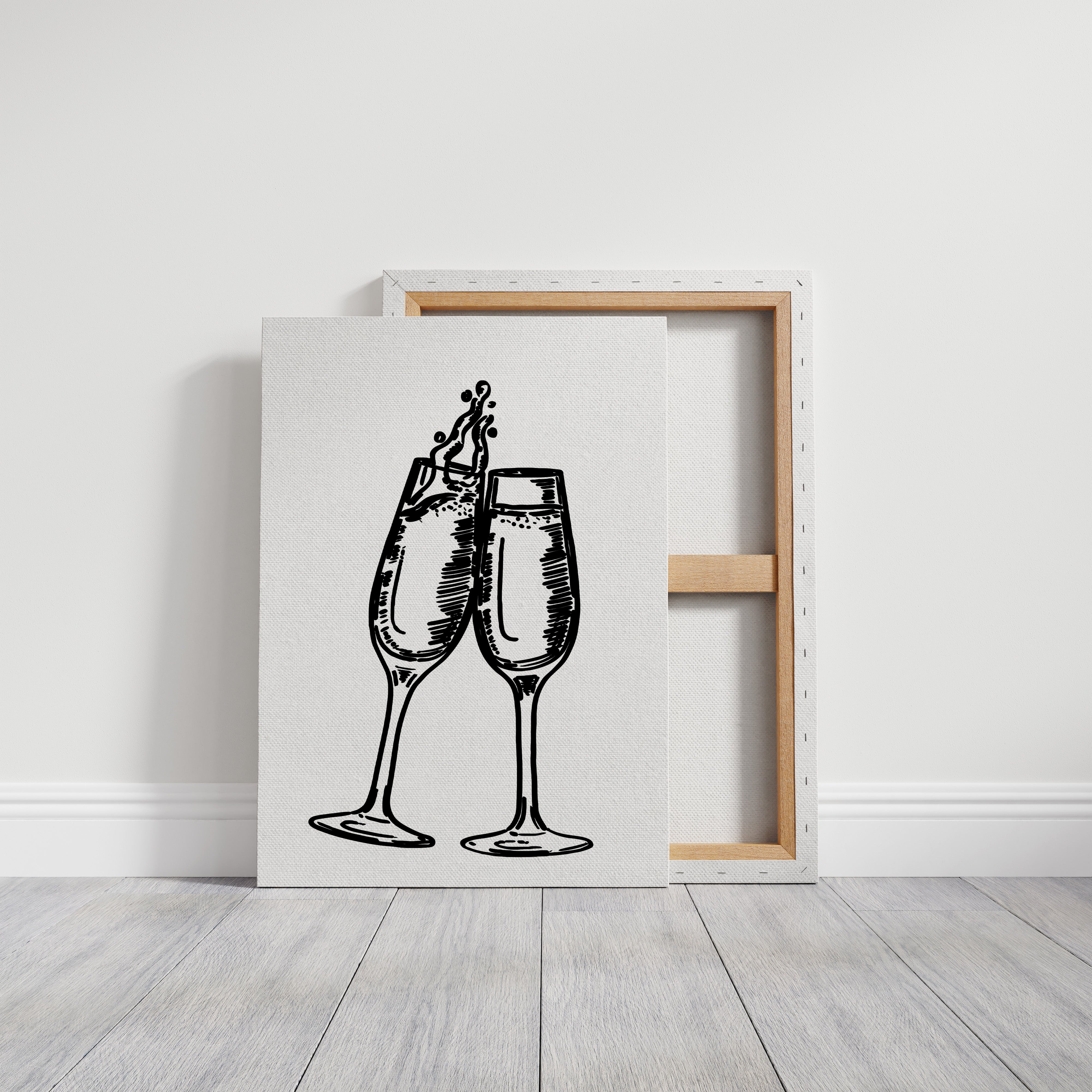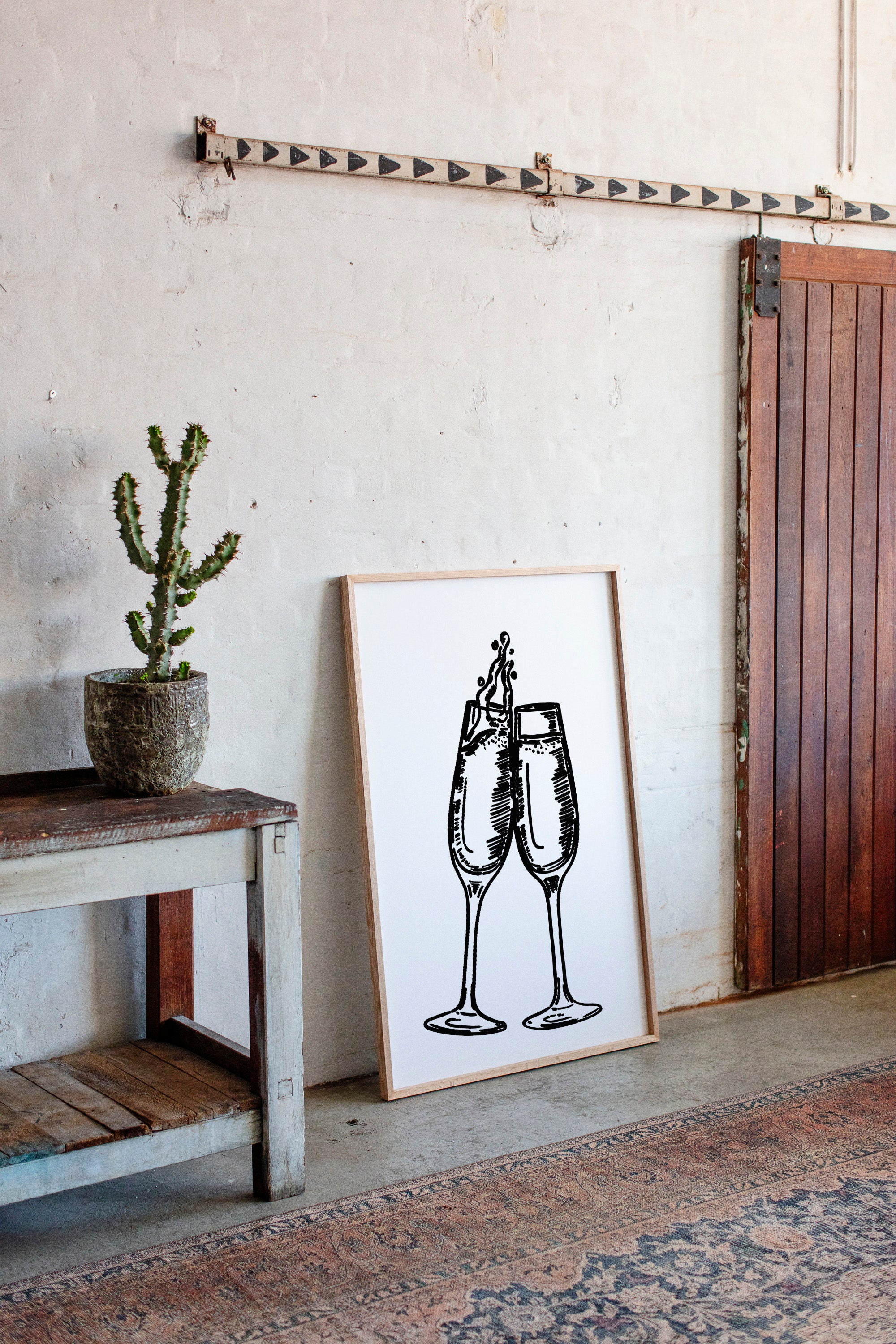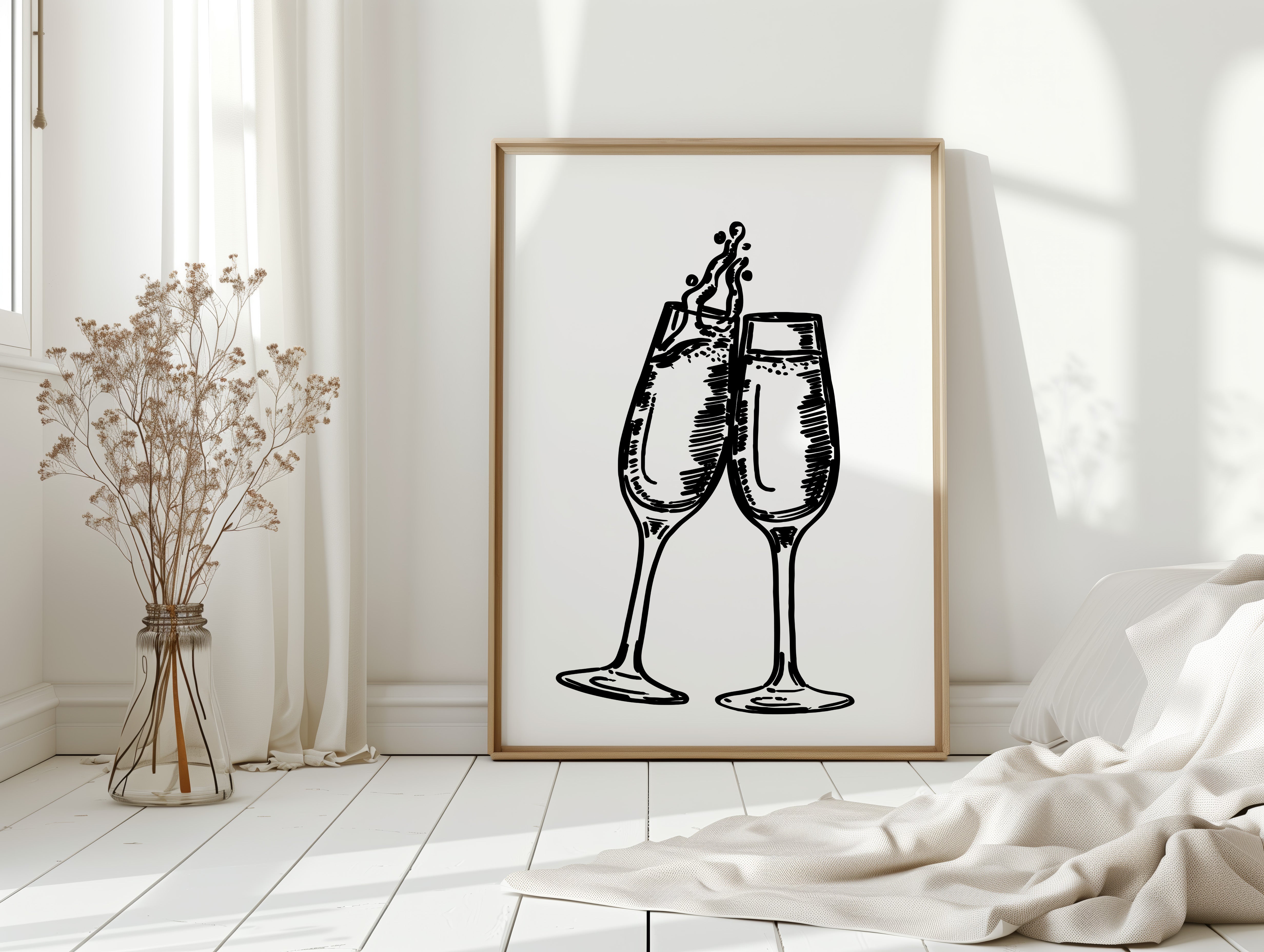 Crystal stems cross paths in celebration, their effervescent contents sparkling with possibility and joy. This minimalist black and white sketch captures the essence of life's most cherished moments in the Contemporary collection. Bold, confident strokes define the elegant champagne flutes, while playful bubbles rise upward in a dance of celebration, creating a perfect balance of sophistication and whimsy. The composition invites viewers to pause and reflect on their own memorable toasts and celebrations. This piece adds a touch of understated elegance to dining rooms, home bars, or any space where life's special moments deserve recognition.