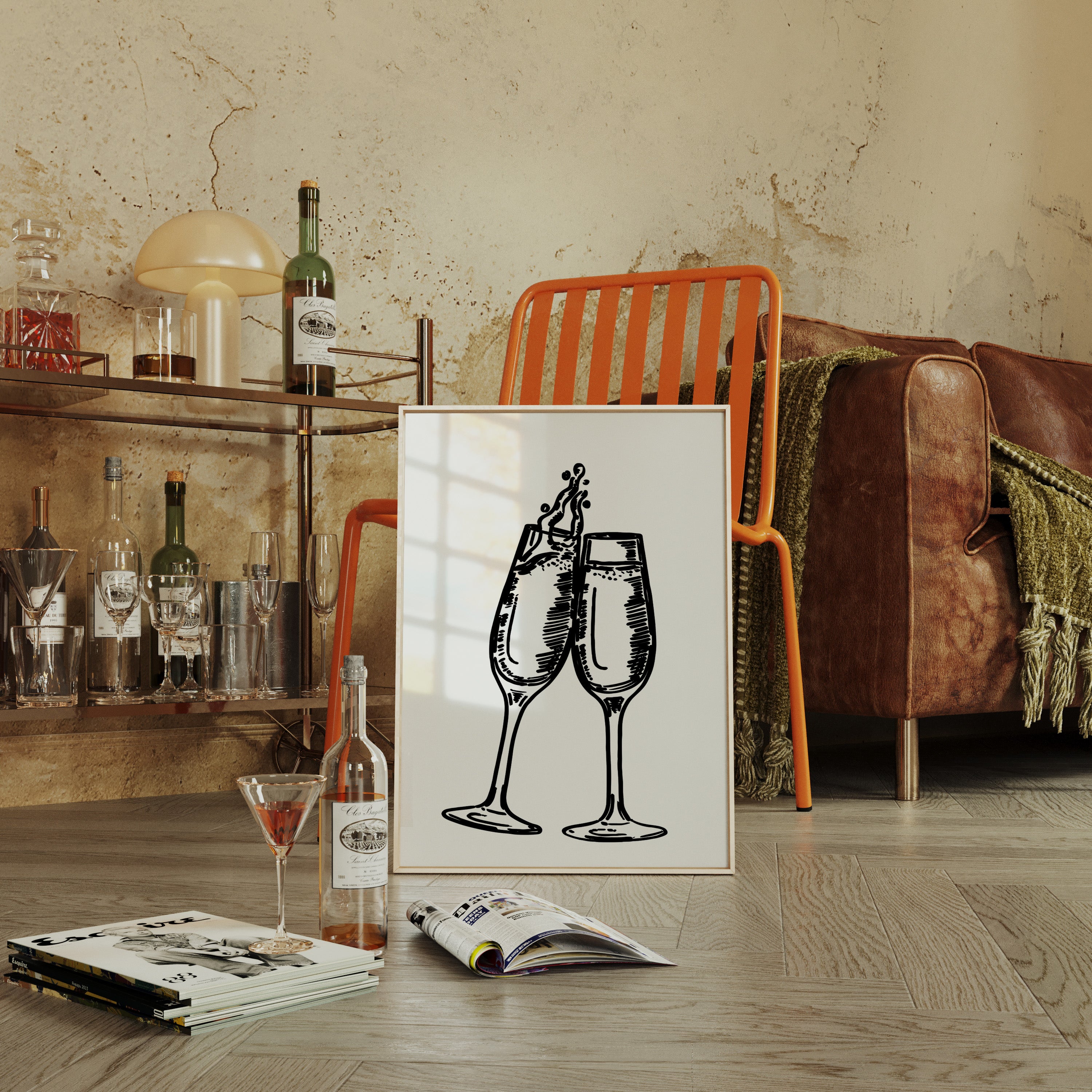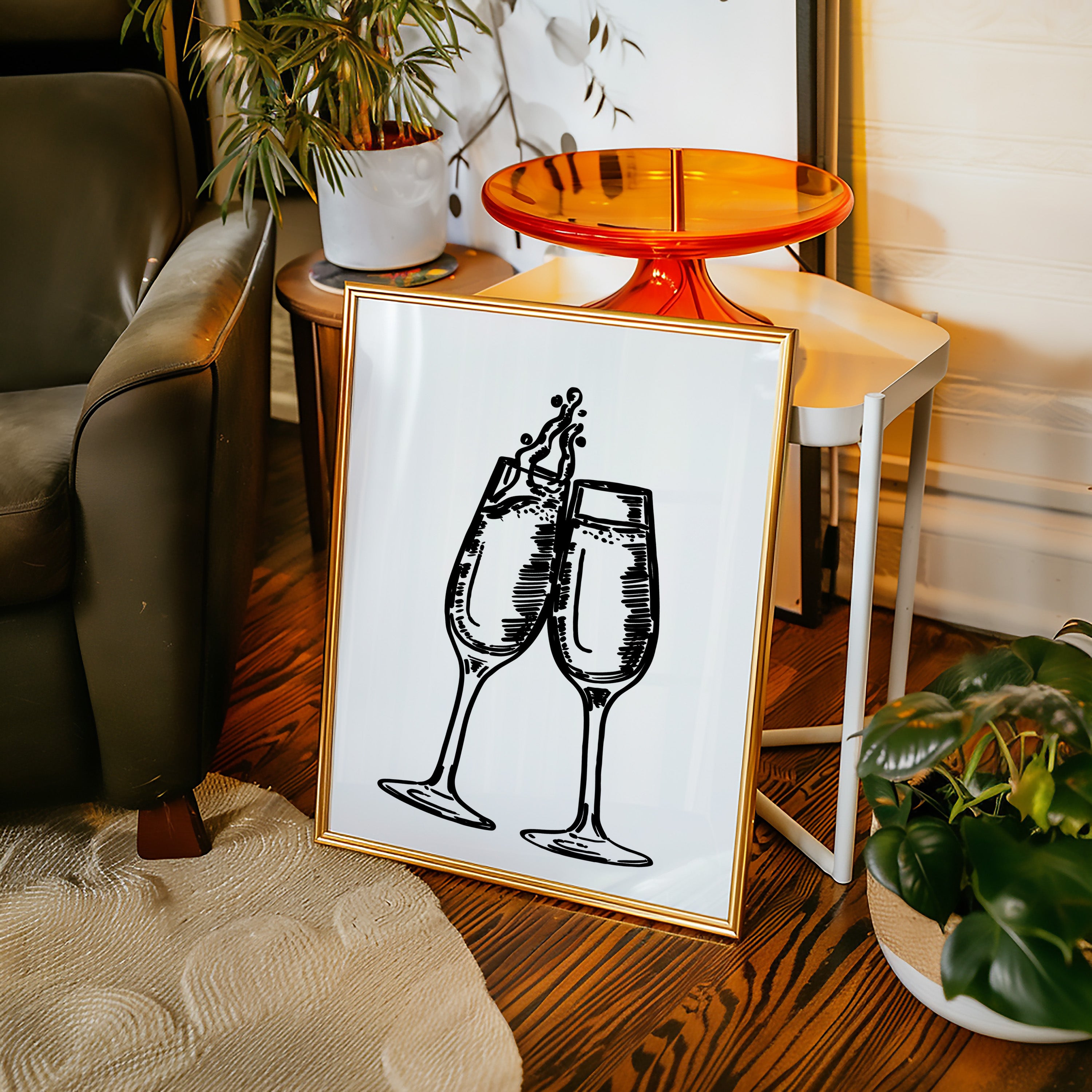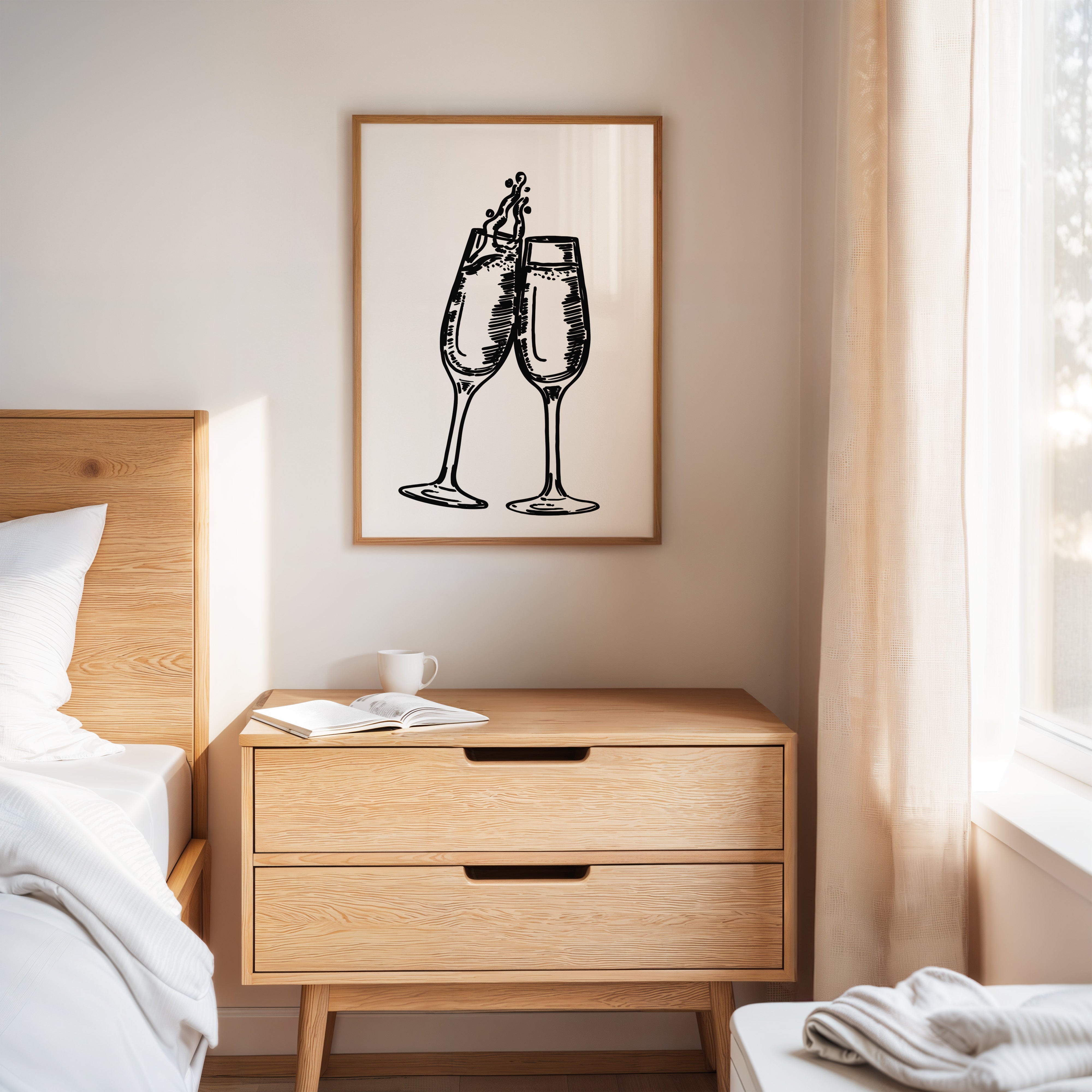 Crystal stems cross paths in celebration, their effervescent contents sparkling with possibility and joy. This minimalist black and white sketch captures the essence of life's most cherished moments in the Contemporary collection. Bold, confident strokes define the elegant champagne flutes, while playful bubbles rise upward in a dance of celebration, creating a perfect balance of sophistication and whimsy. The composition invites viewers to pause and reflect on their own memorable toasts and celebrations. This piece adds a touch of understated elegance to dining rooms, home bars, or any space where life's special moments deserve recognition.