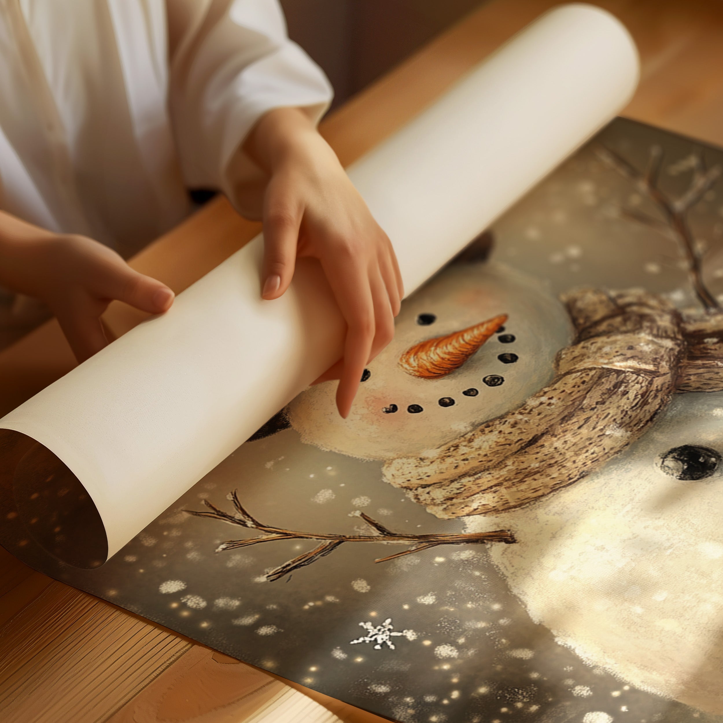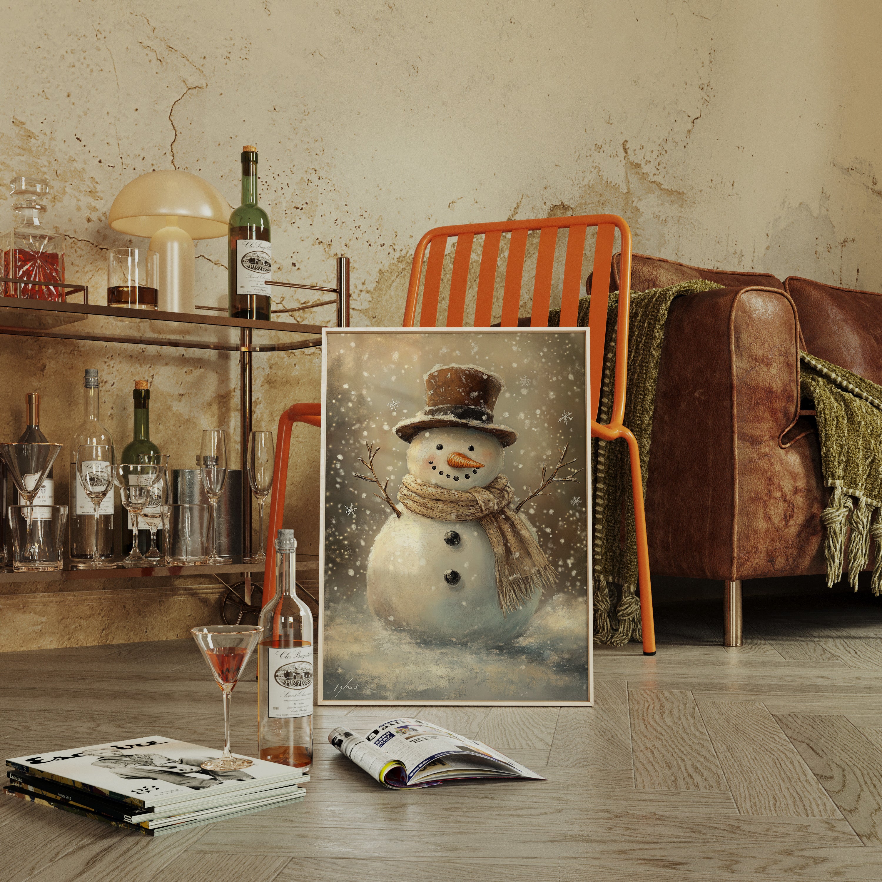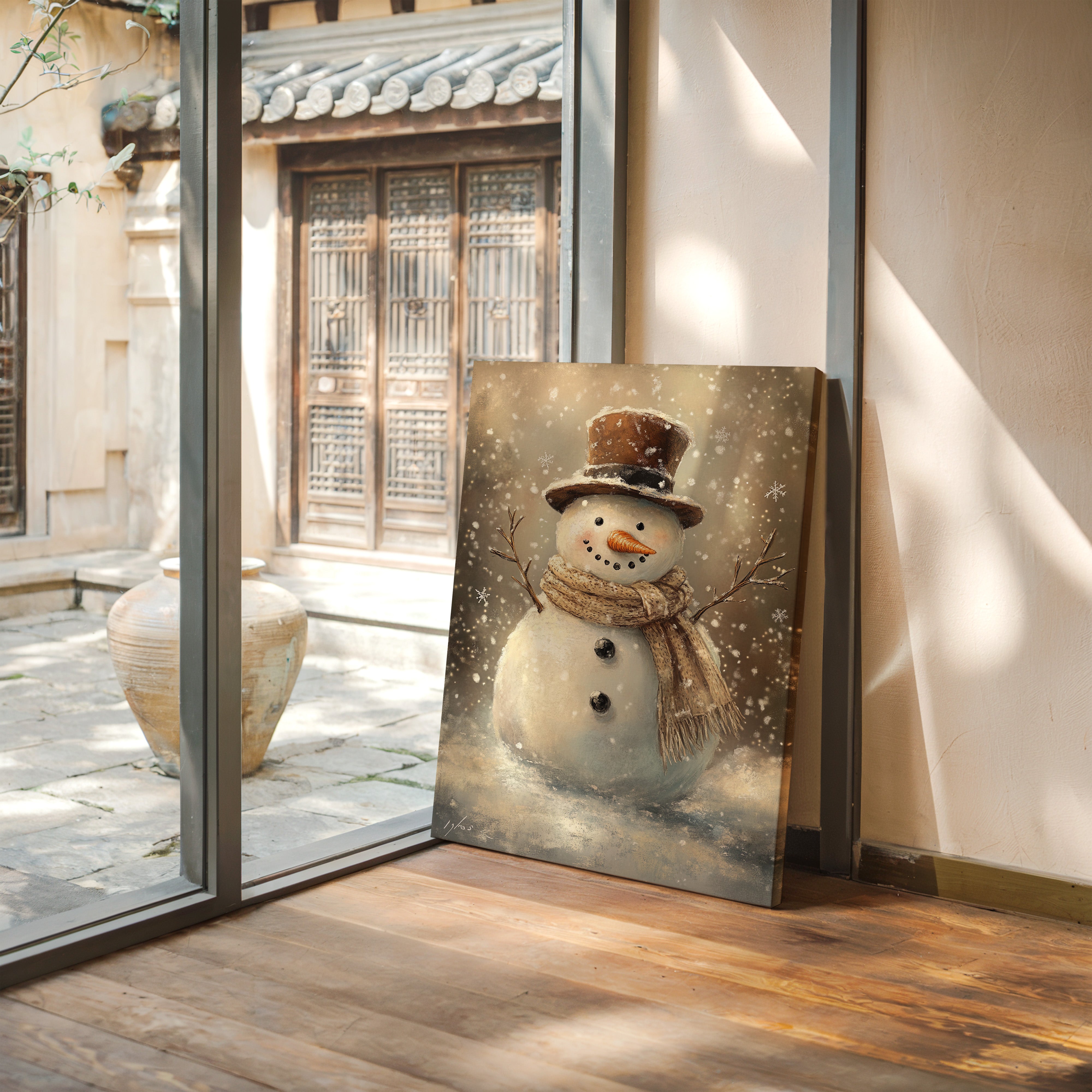 In the gentle hush of falling snow, a cheerful figure stands tall, dressed in warmth and whimsy. This piece embodies the spirit of the season, capturing a moment of playful joy amidst winter's embrace. Clad in a cozy scarf and a charming hat, the snowman beckons with outstretched arms, inviting you into a realm of frosty wonder. Subtle hues of white and brown dance together, crafting a serene backdrop that whispers of cozy fires and festive cheer.