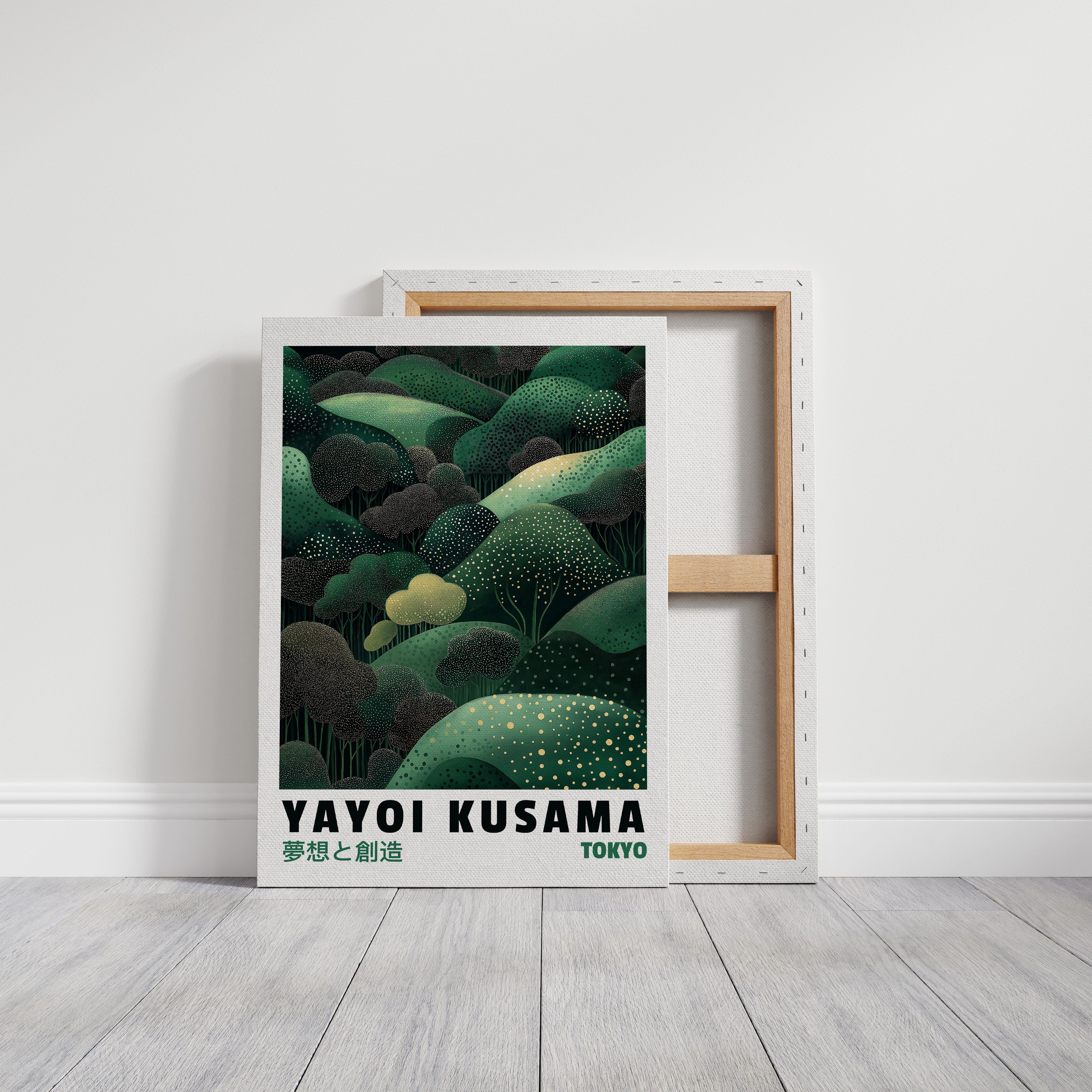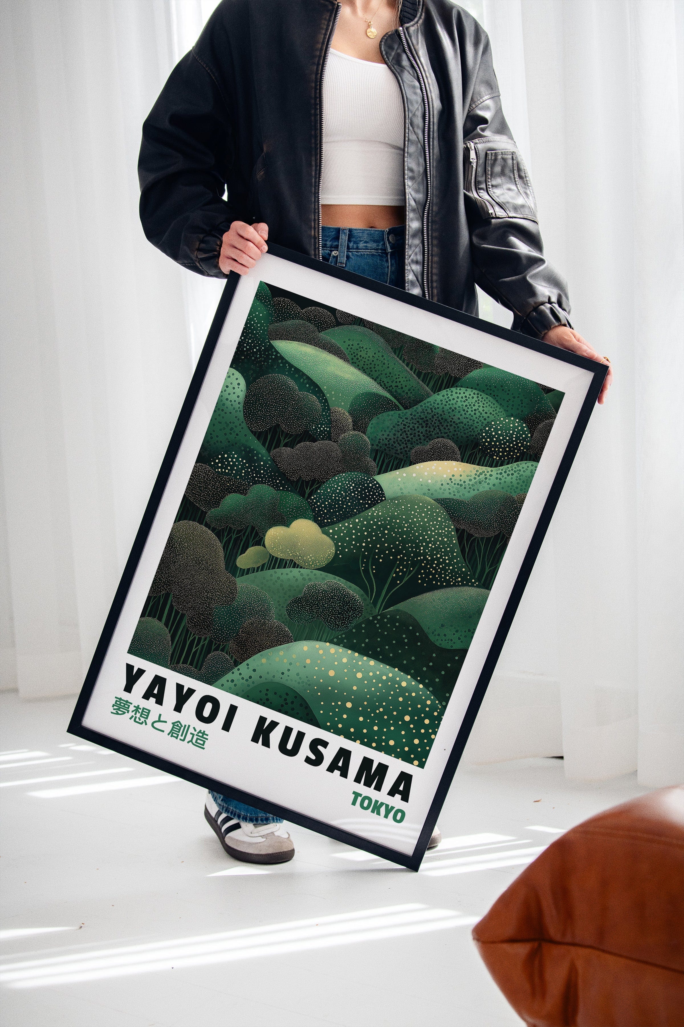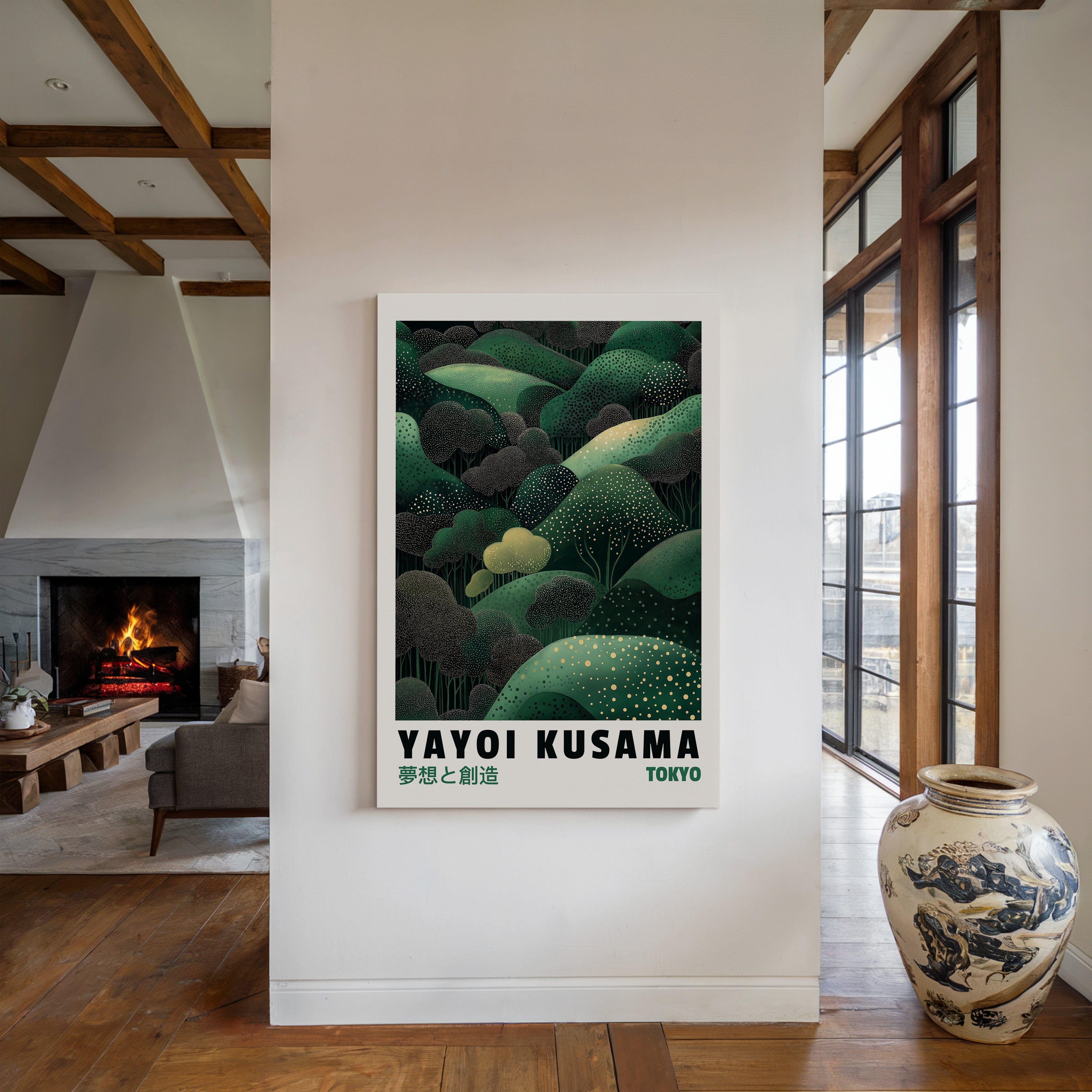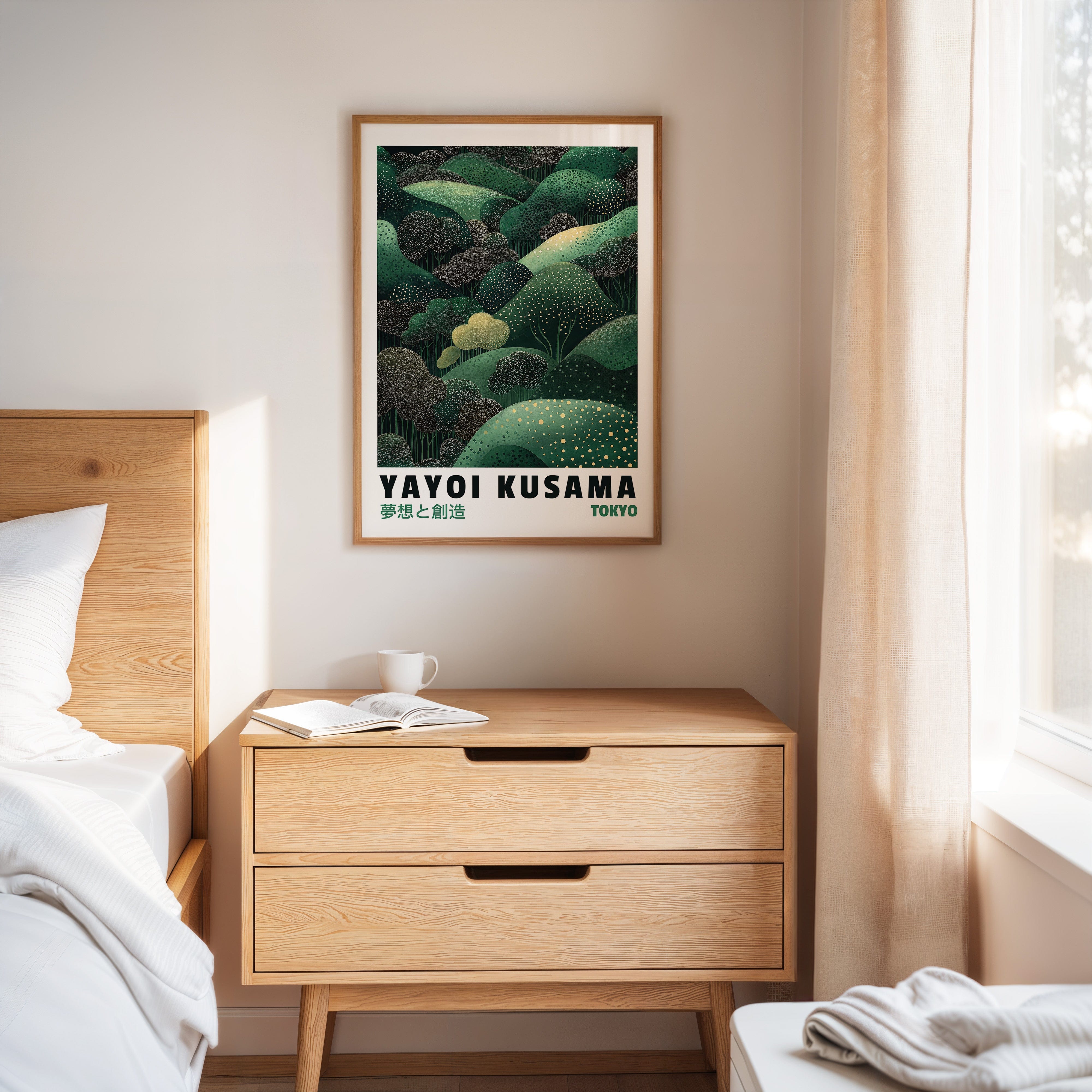 A mesmerizing forest landscape filled with lush green hills and dotted textures, inspired by the iconic Yayoi Kusama aesthetic. This abstract composition evokes a sense of dreamlike serenity, where nature and imagination merge in a beautifully stylized form. Perfect for lovers of modern Japanese art, bold patterns, and contemporary decor, this print brings a unique avant-garde elegance to any space.