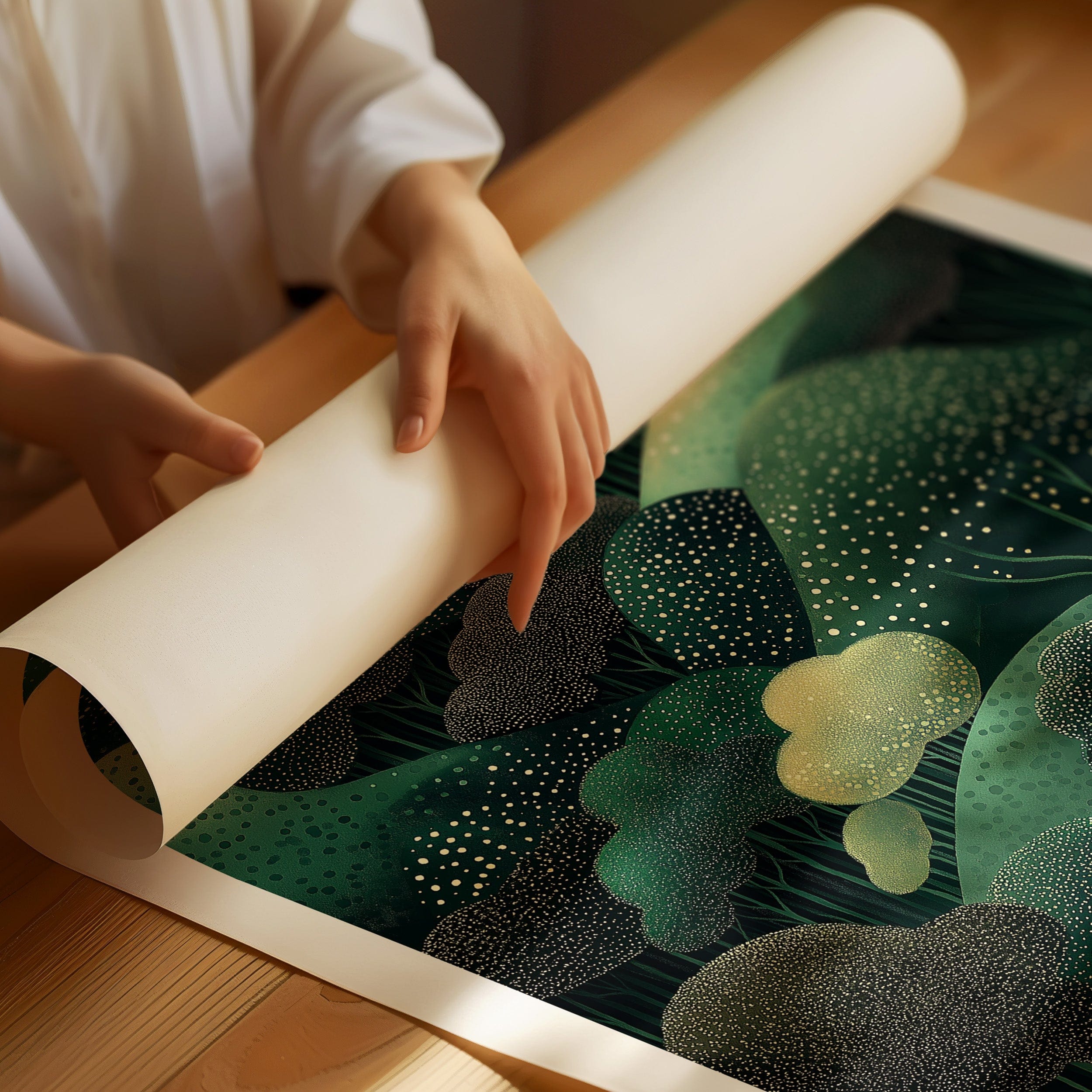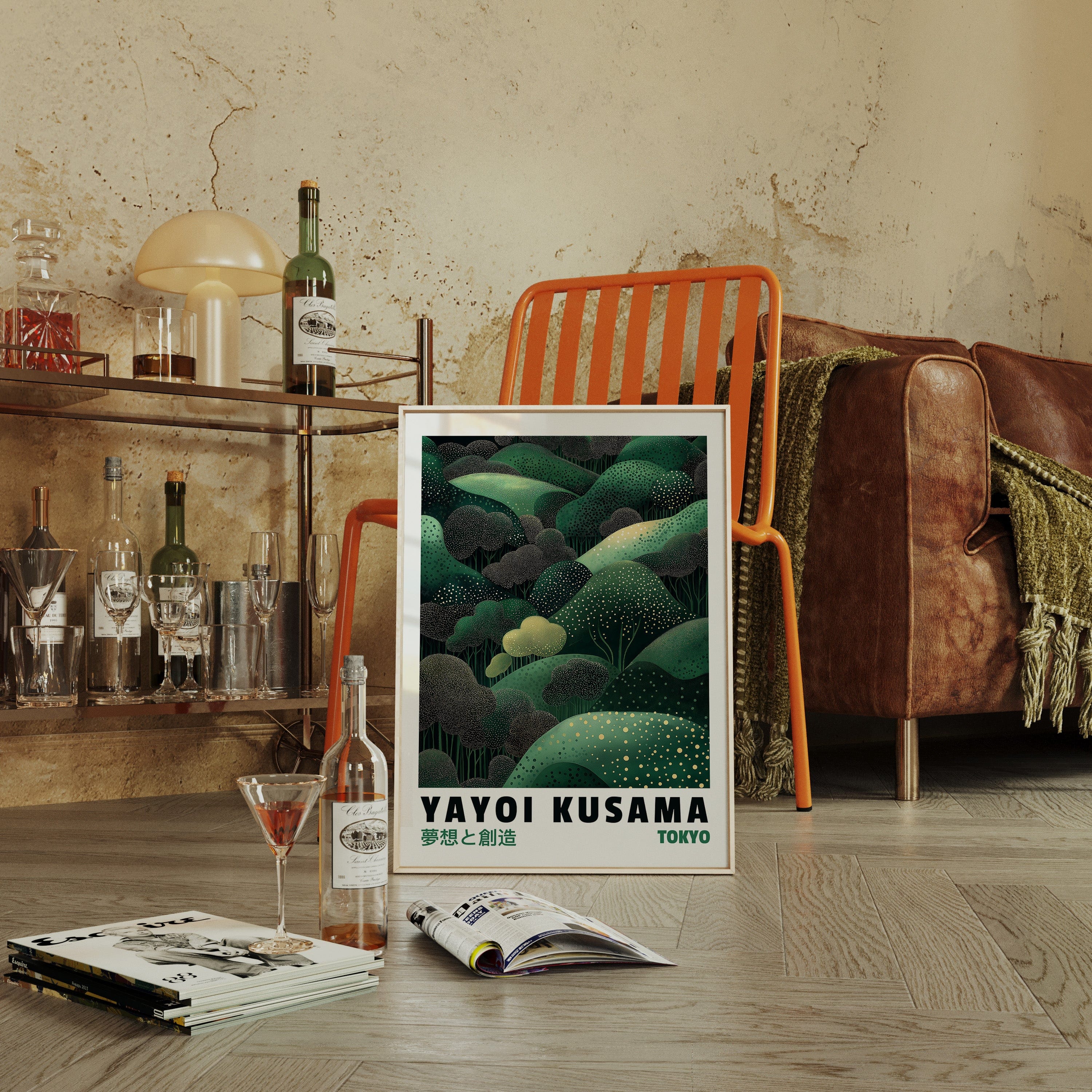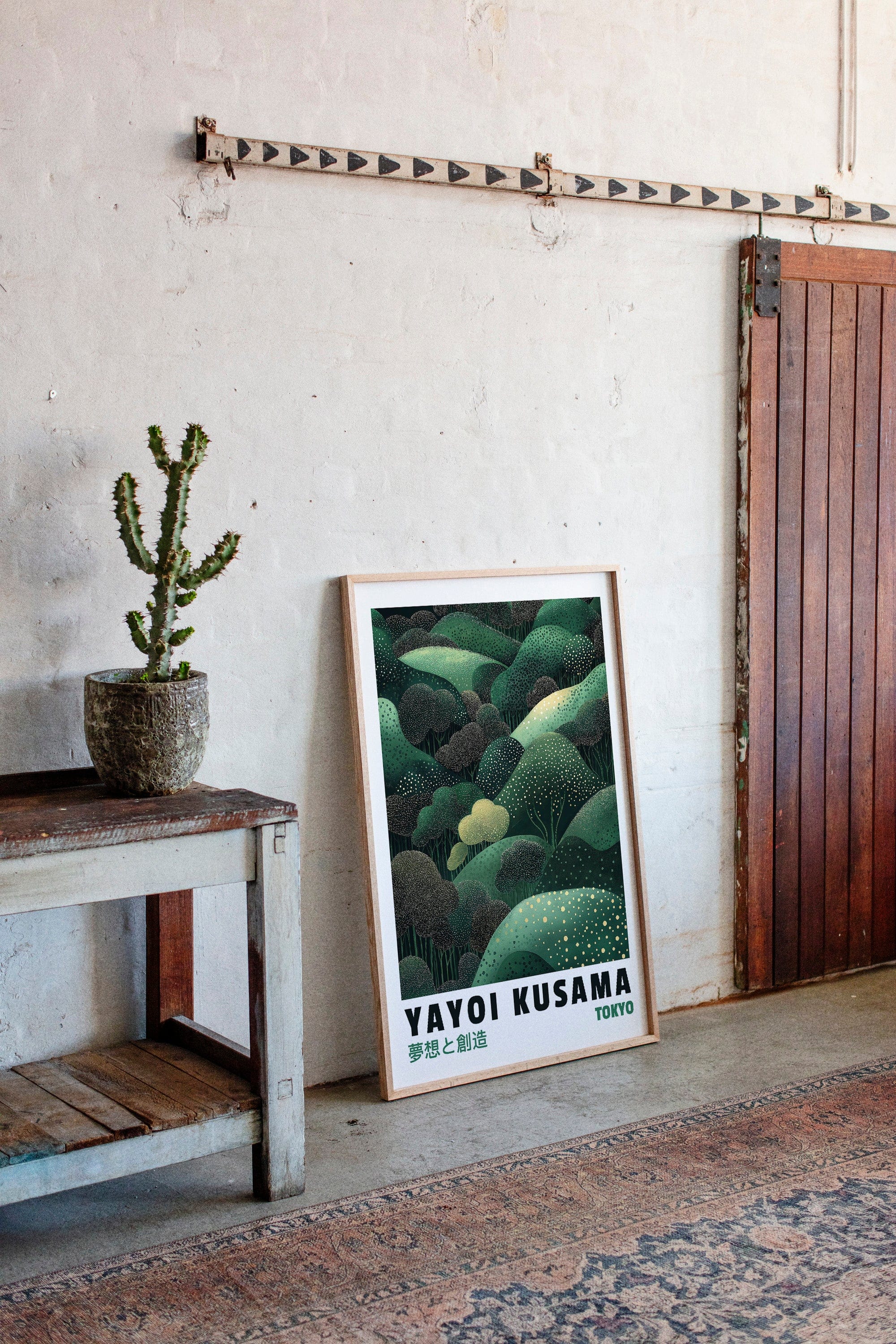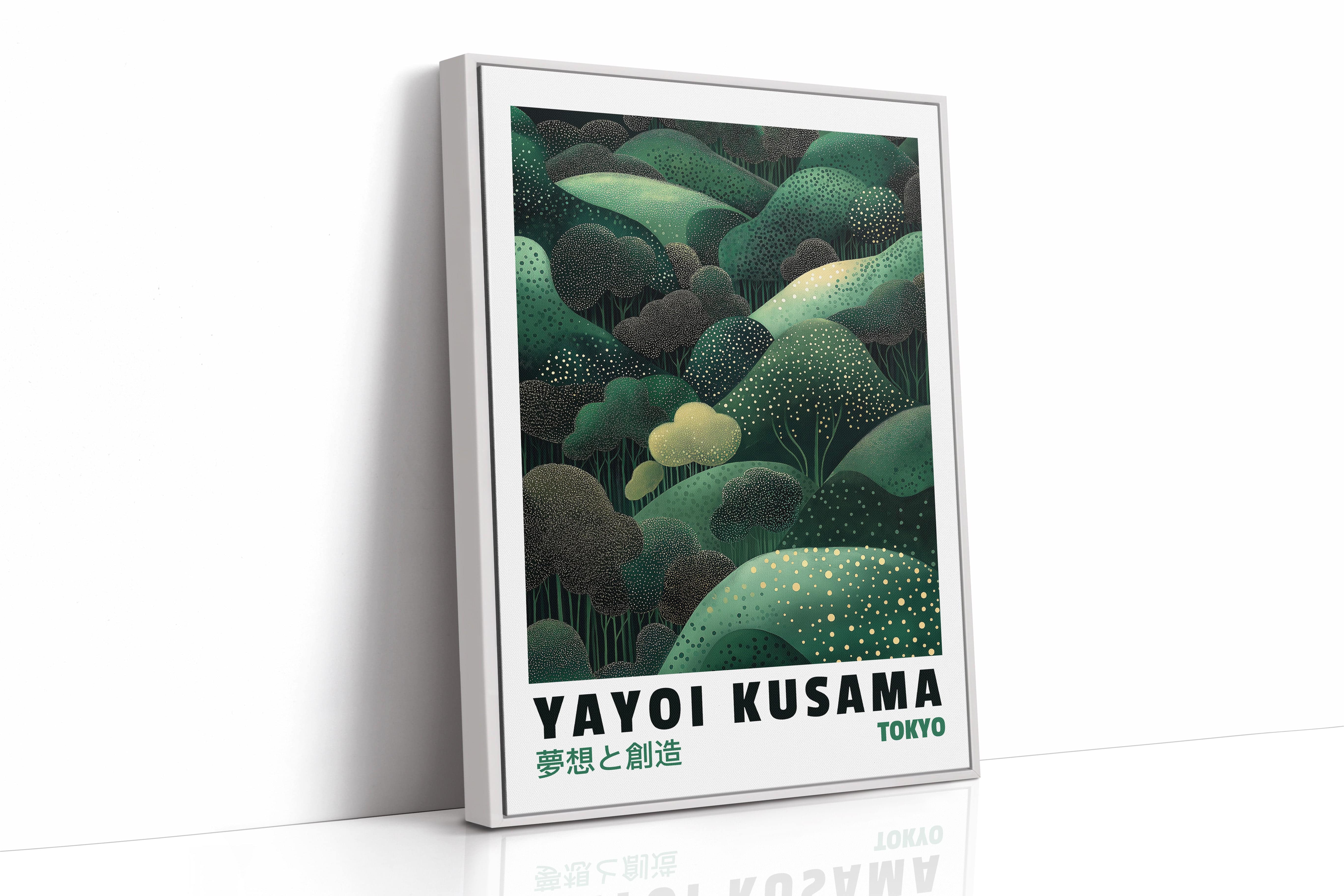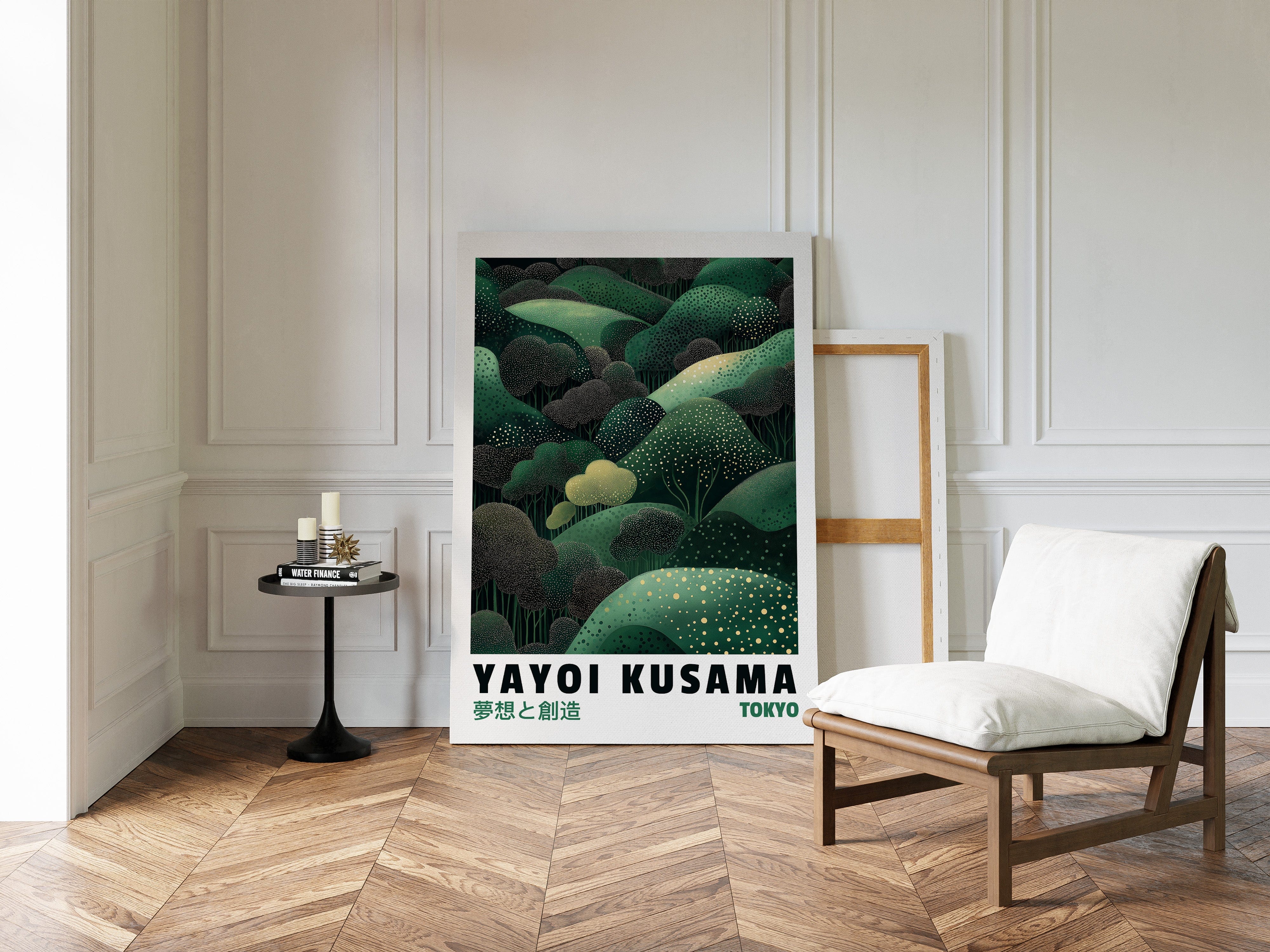 A mesmerizing forest landscape filled with lush green hills and dotted textures, inspired by the iconic Yayoi Kusama aesthetic. This abstract composition evokes a sense of dreamlike serenity, where nature and imagination merge in a beautifully stylized form. Perfect for lovers of modern Japanese art, bold patterns, and contemporary decor, this print brings a unique avant-garde elegance to any space.