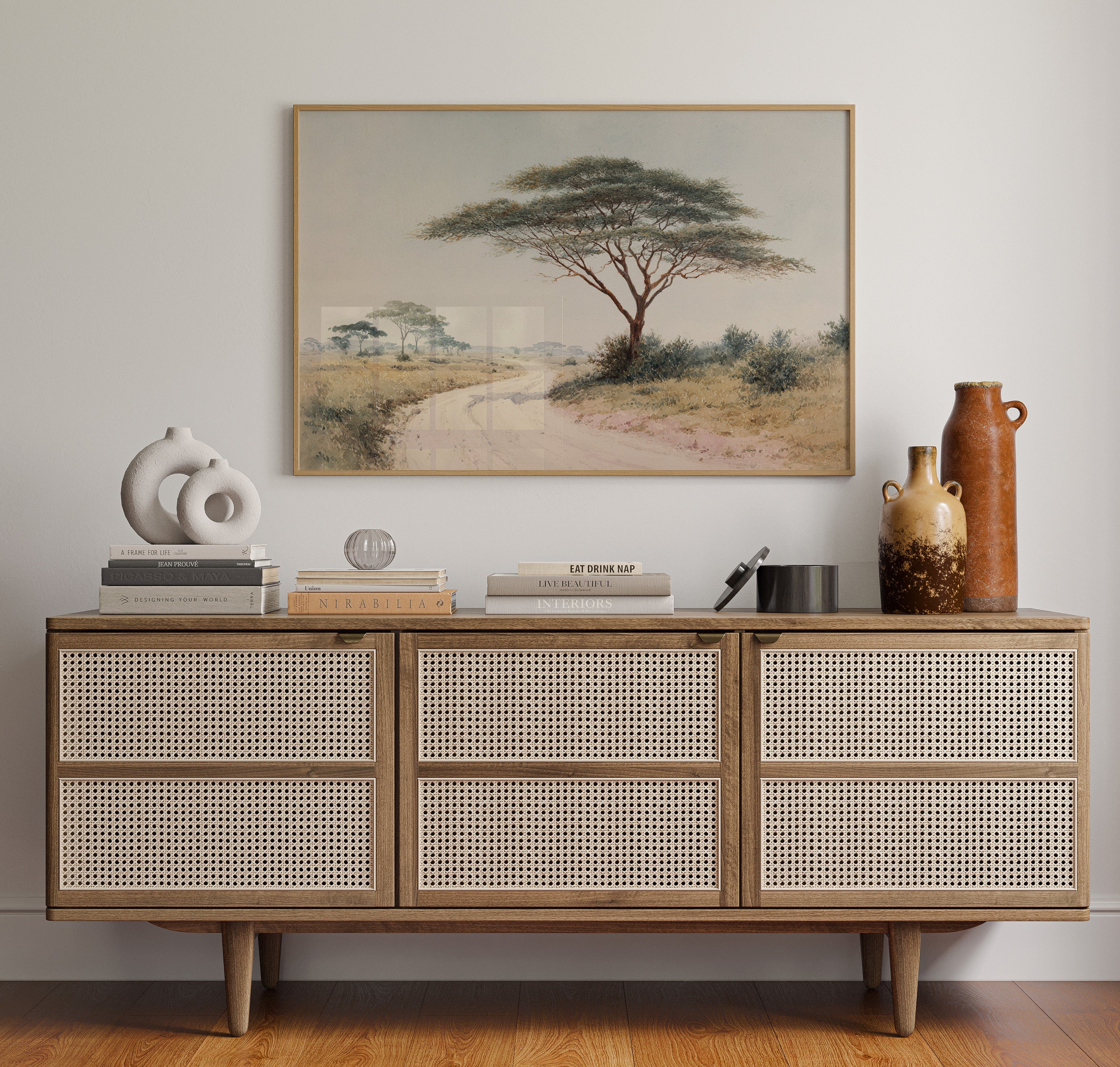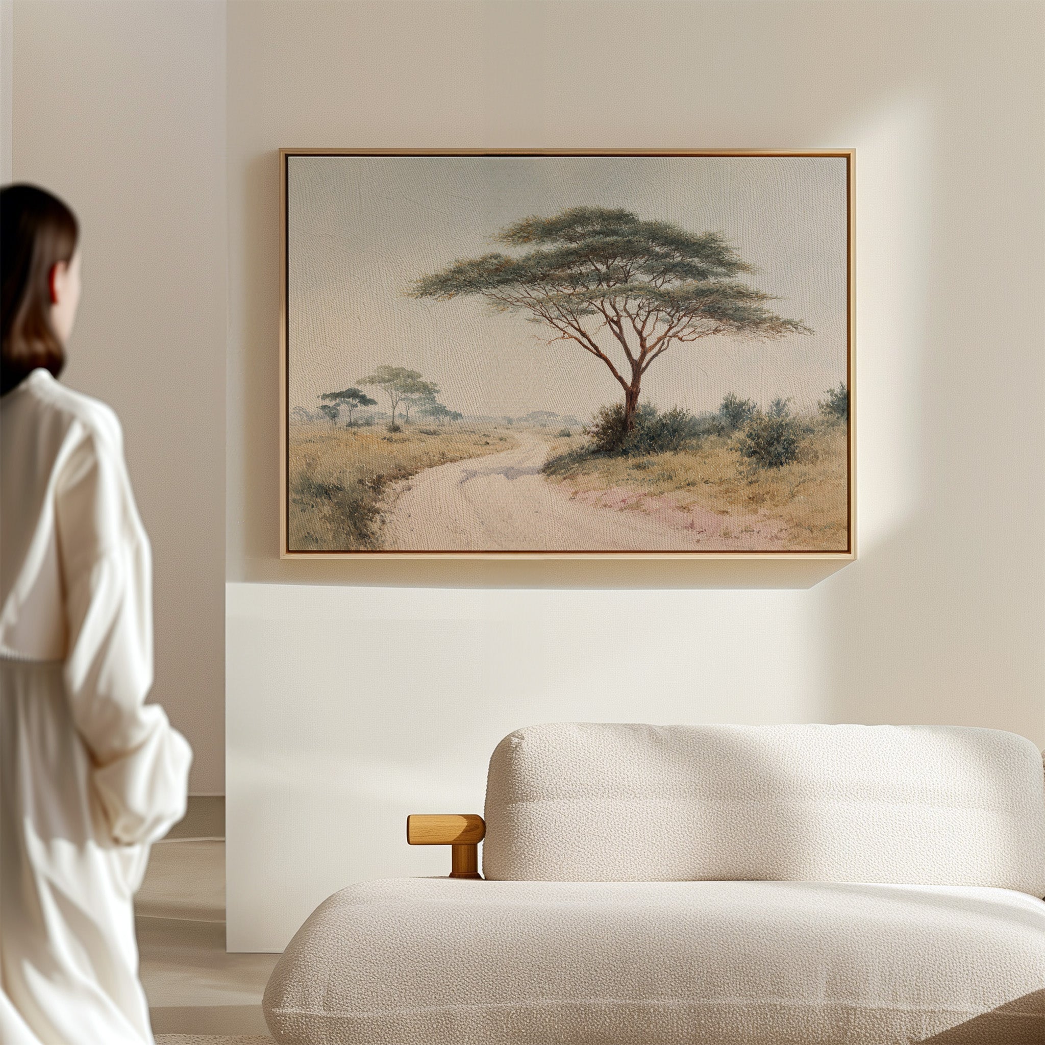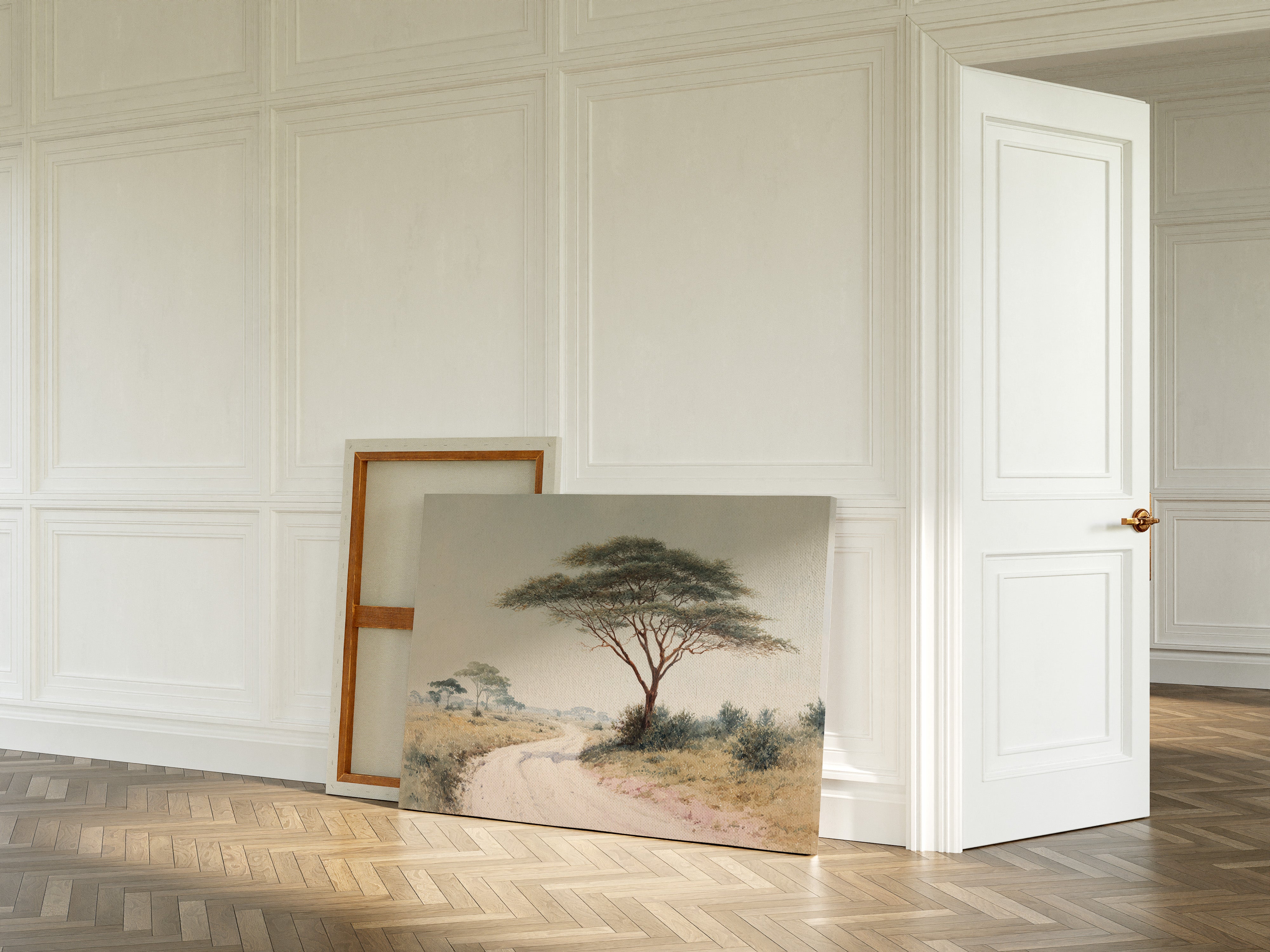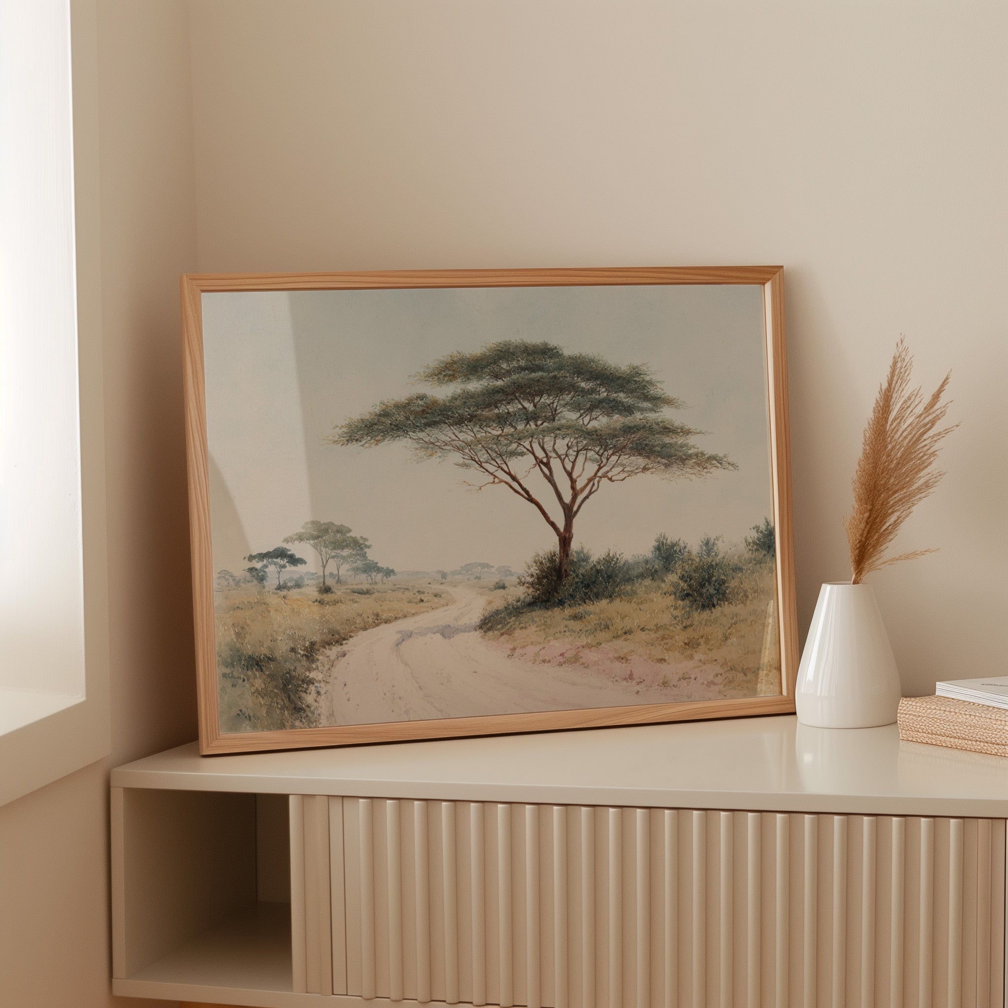 A gentle breeze rustles through the delicate leaves of a majestic acacia tree, casting dappled shadows on the dusty path below. The tree stands sentinel over the winding road, its umbrella-like canopy spreading wide against the soft, pastel sky. Golden savanna grasses stretch toward the horizon where distant trees blur into misty silhouettes, creating a serene African landscape painted in subtle earth tones and muted greens. This tranquil scene captures the quiet dignity of the African plains, where time seems to slow and nature writes its own story. Perfect for bringing a sense of peaceful wanderlust to a living room or study, creating a window to distant lands.