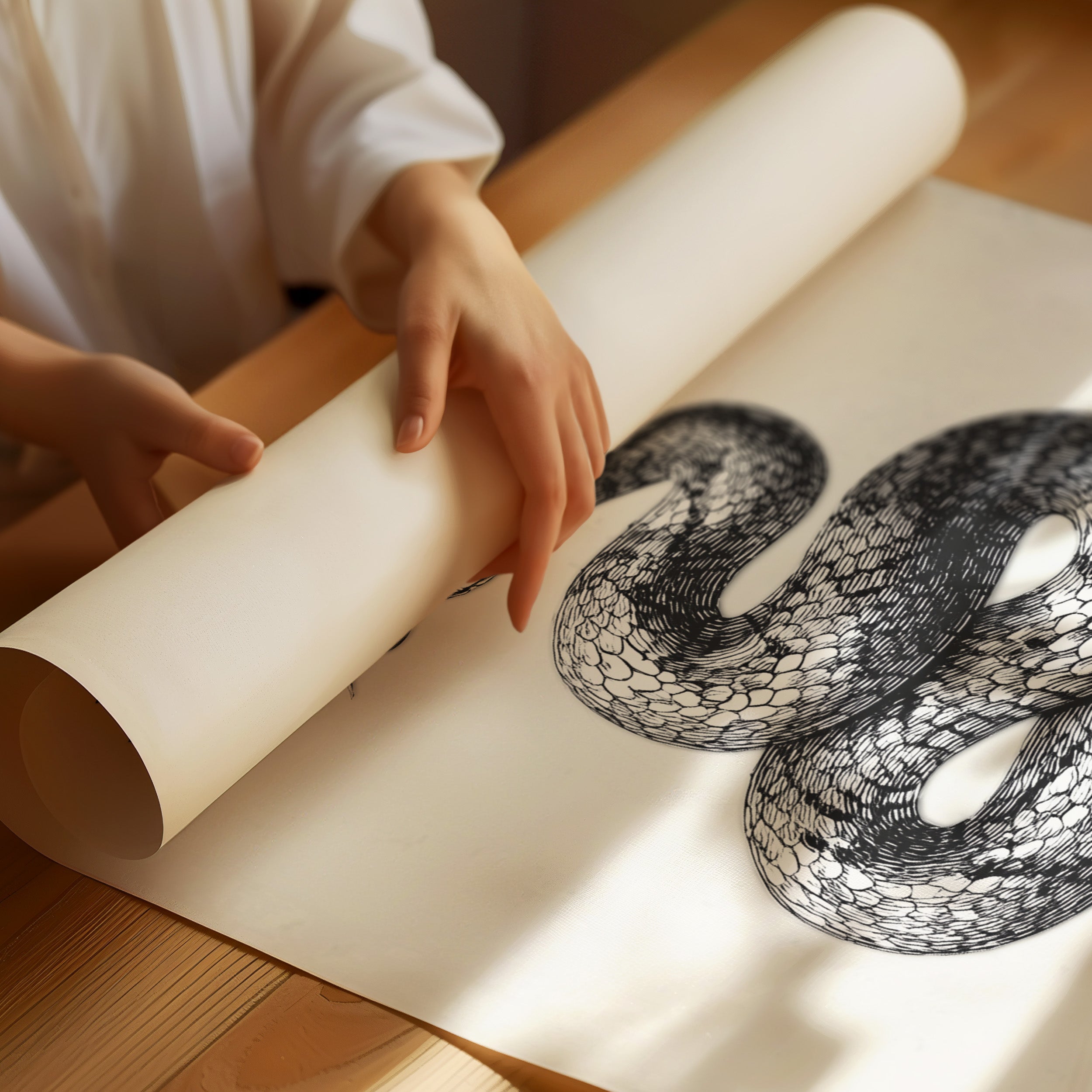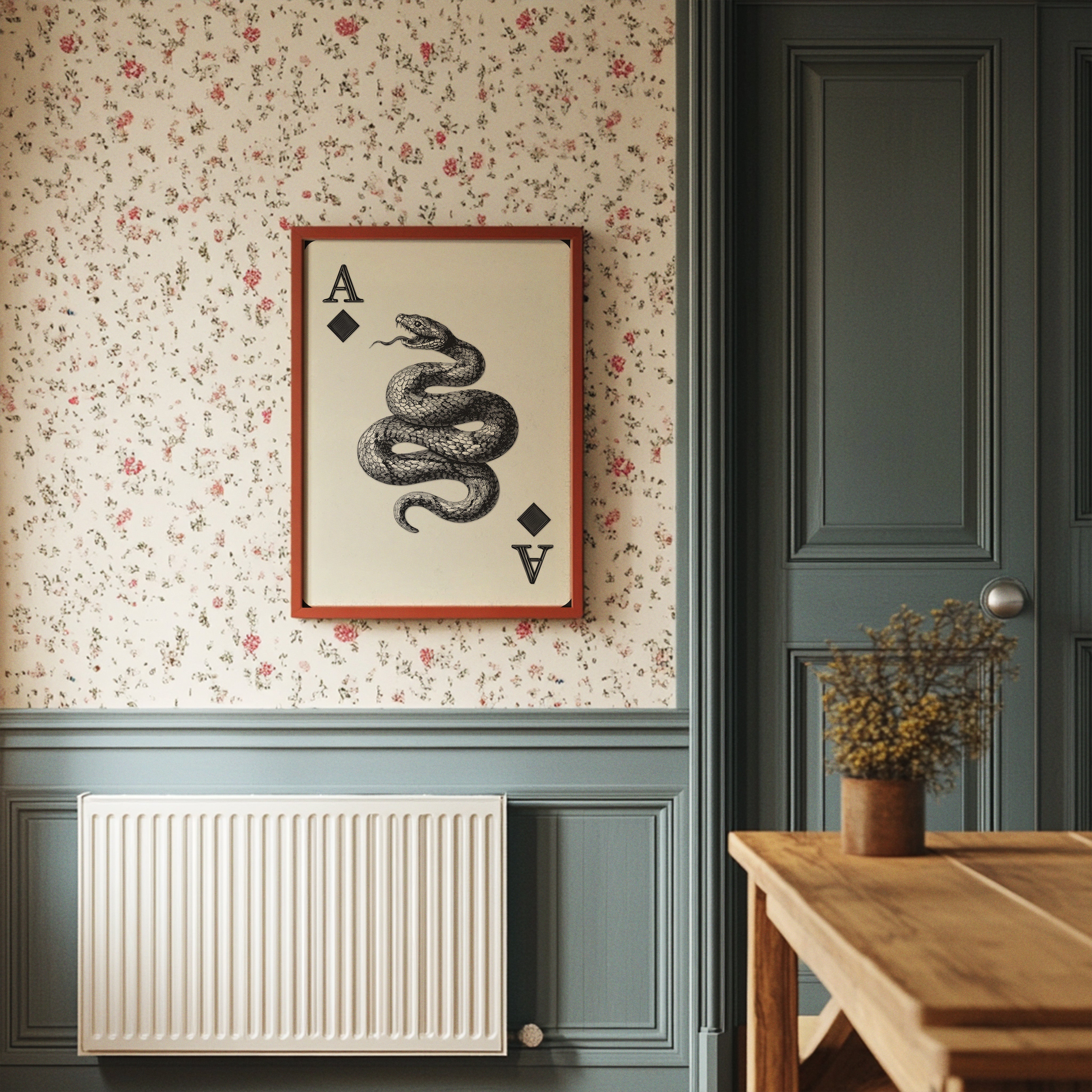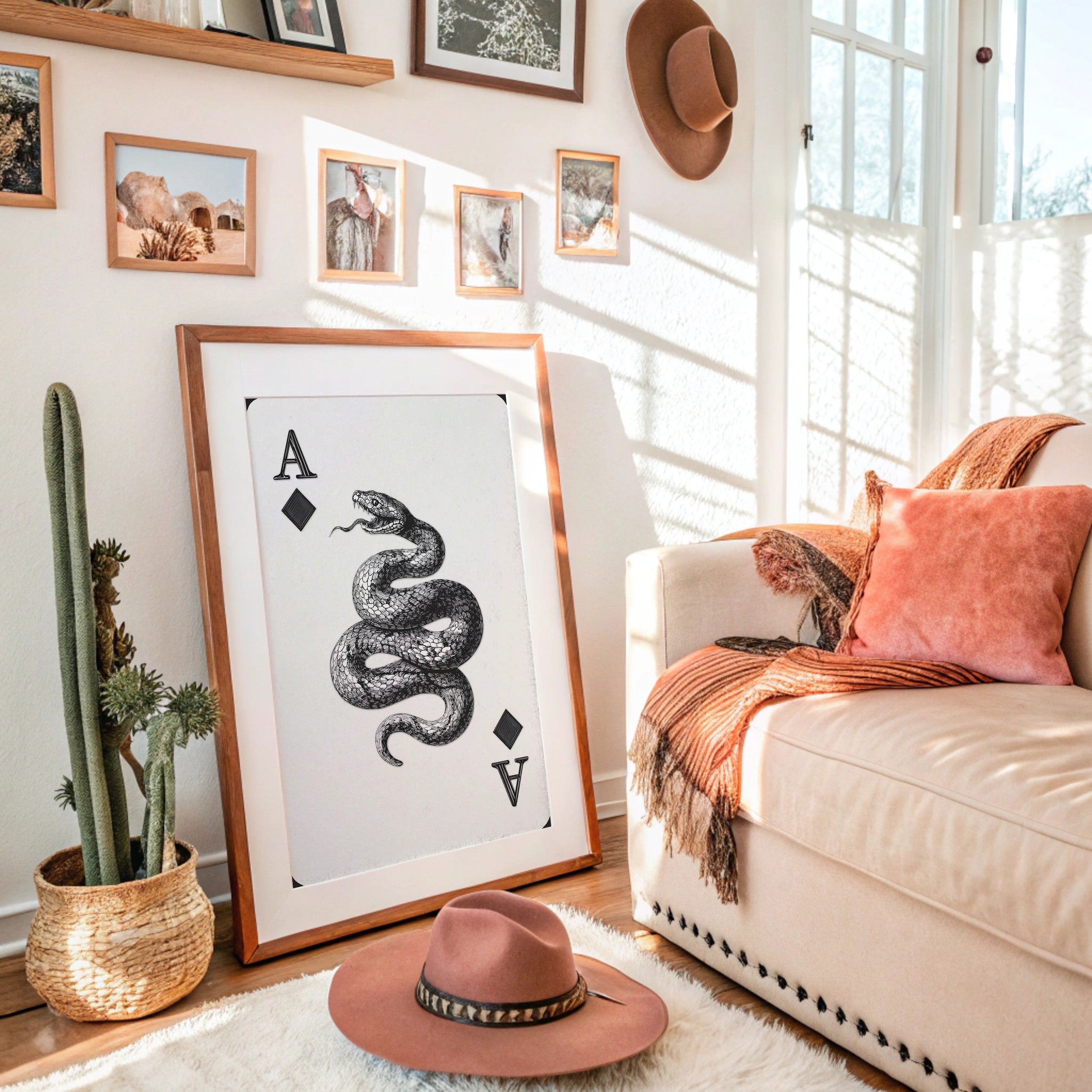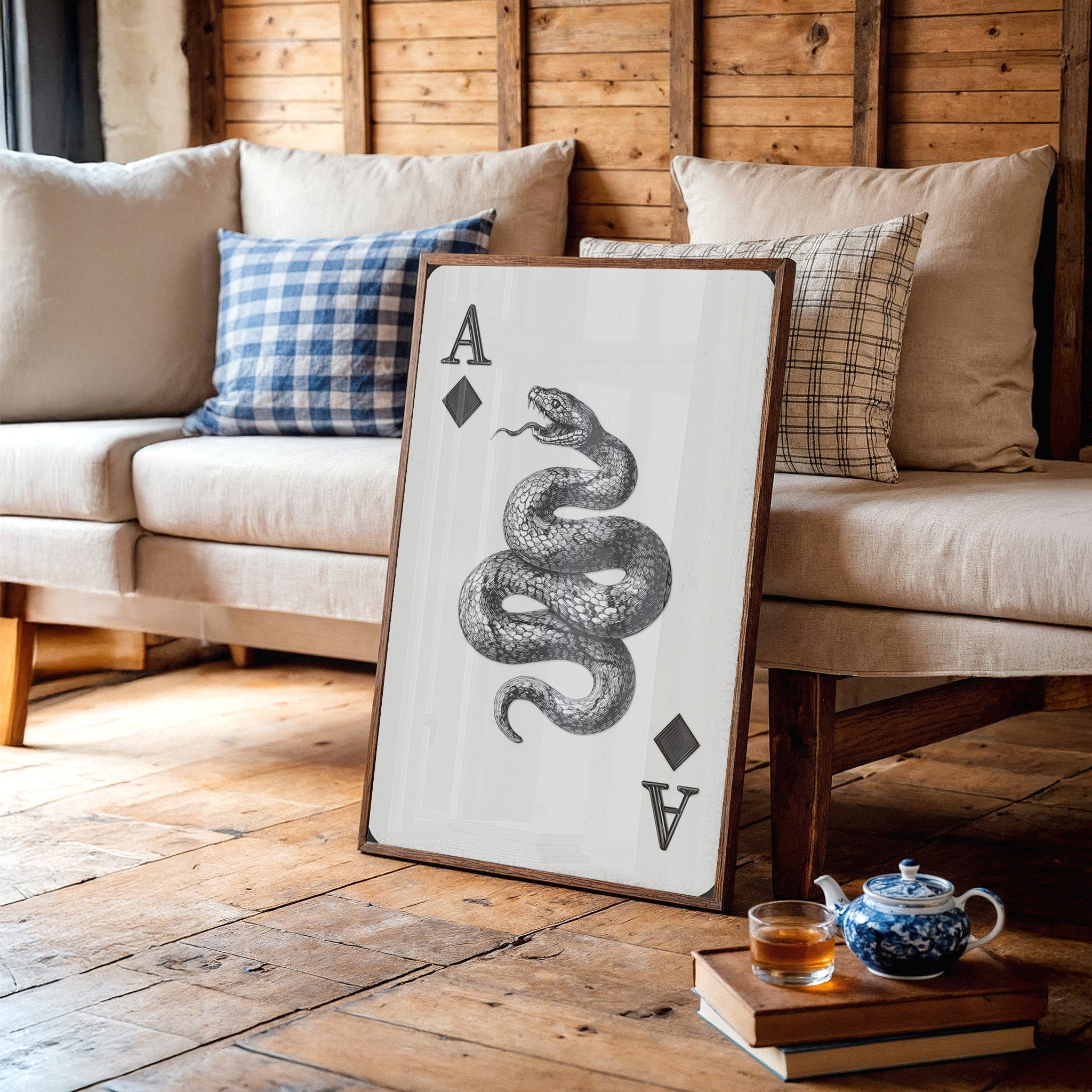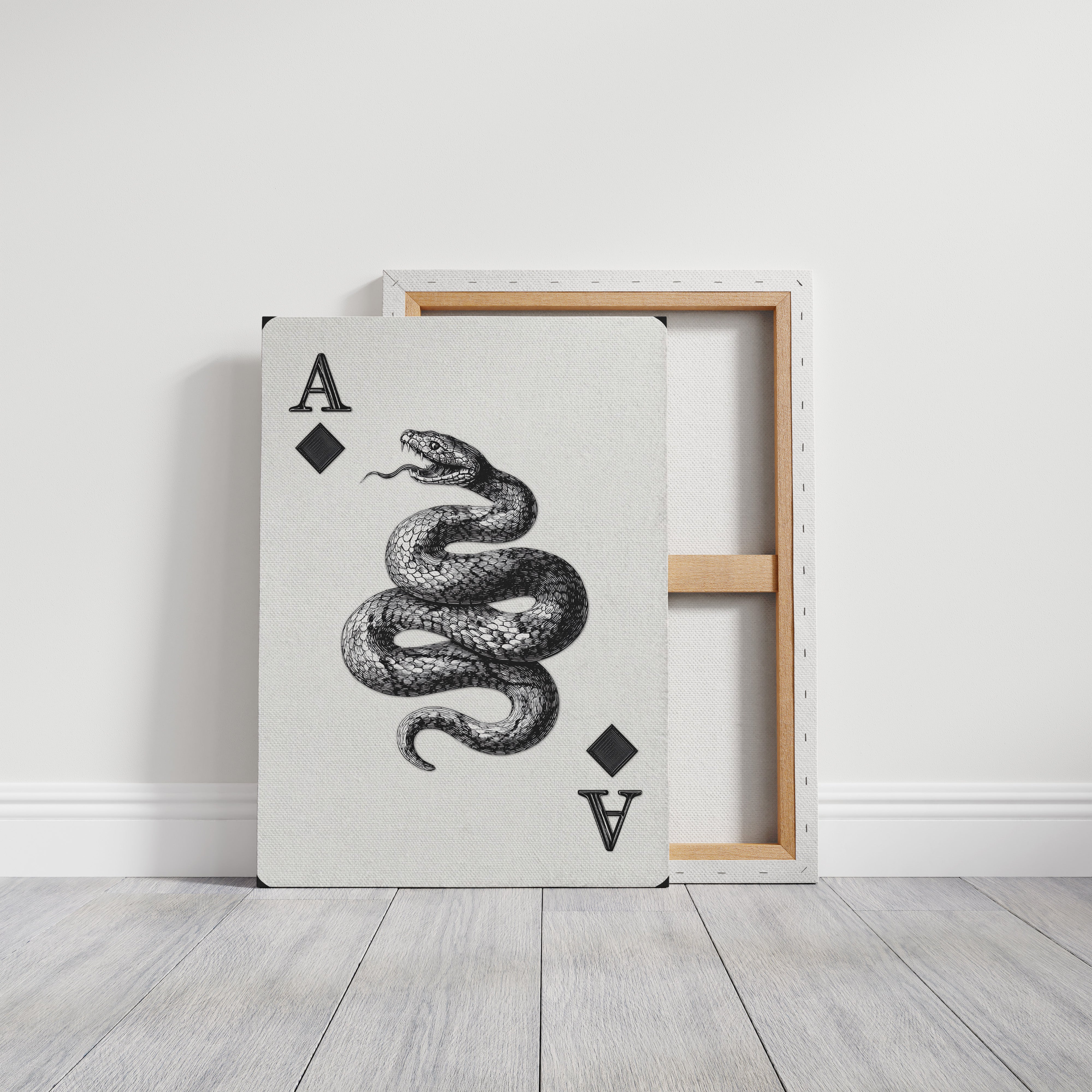 A mesmerizing serpent coils with deliberate grace, its scales rendered in striking black and white detail against a pristine backdrop. The intricate linework captures every texture of the snake's muscular form, creating a powerful contrast between light and shadow. Positioned between the classic playing card symbols, this fierce creature commands attention with its open-mouthed stance and hypnotic presence. An ideal statement piece for a modern game room, office, or any space seeking to add an edge of sophisticated drama.