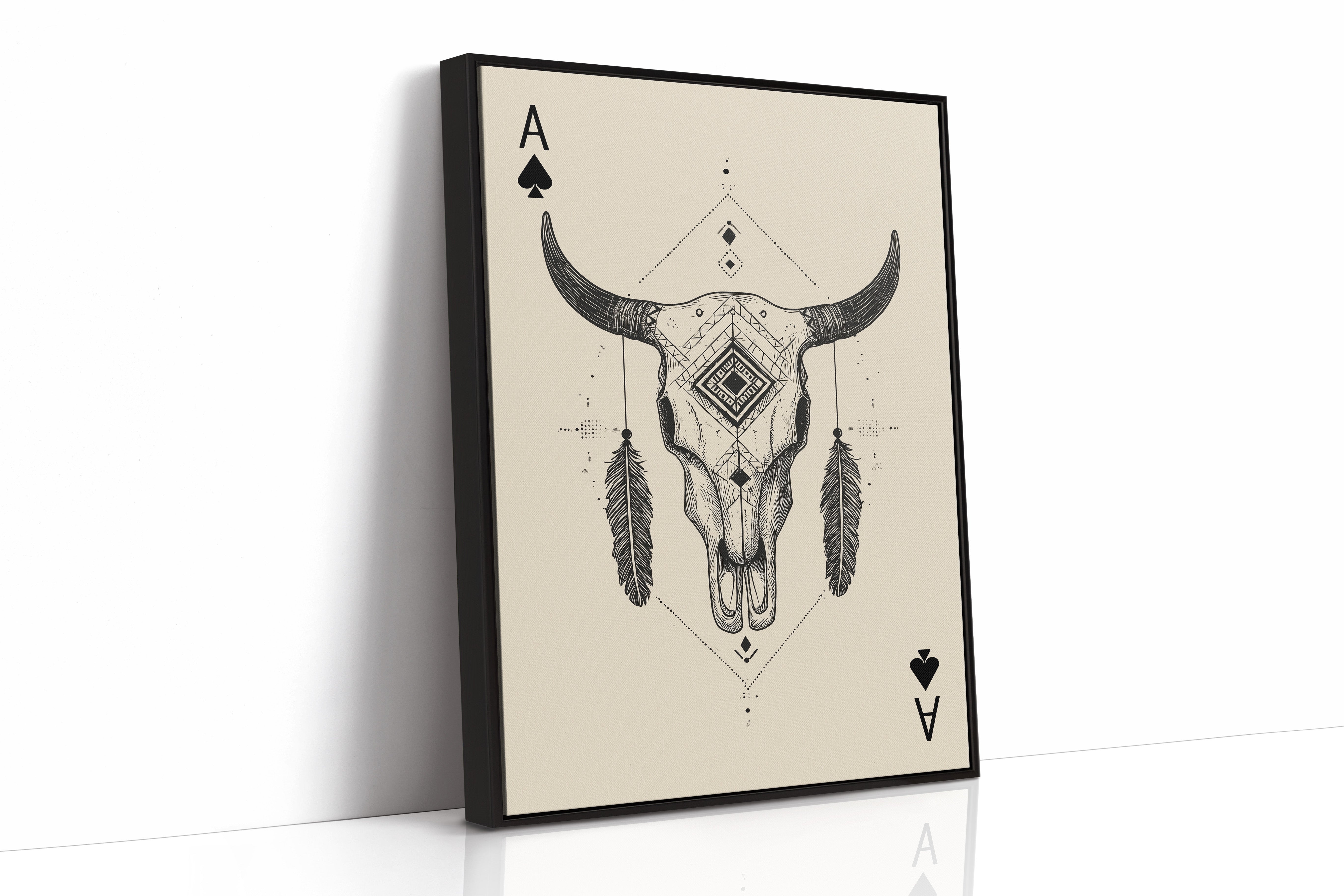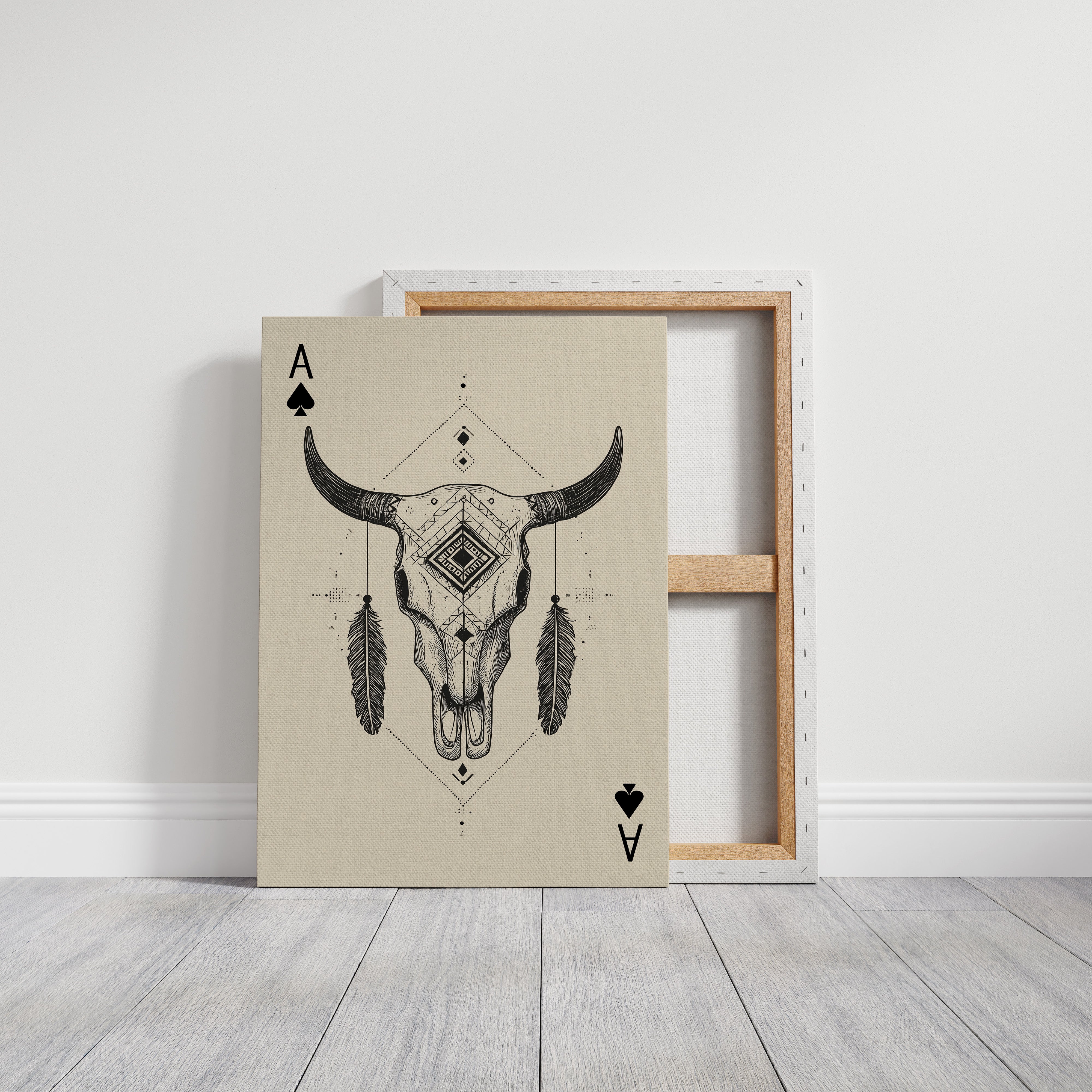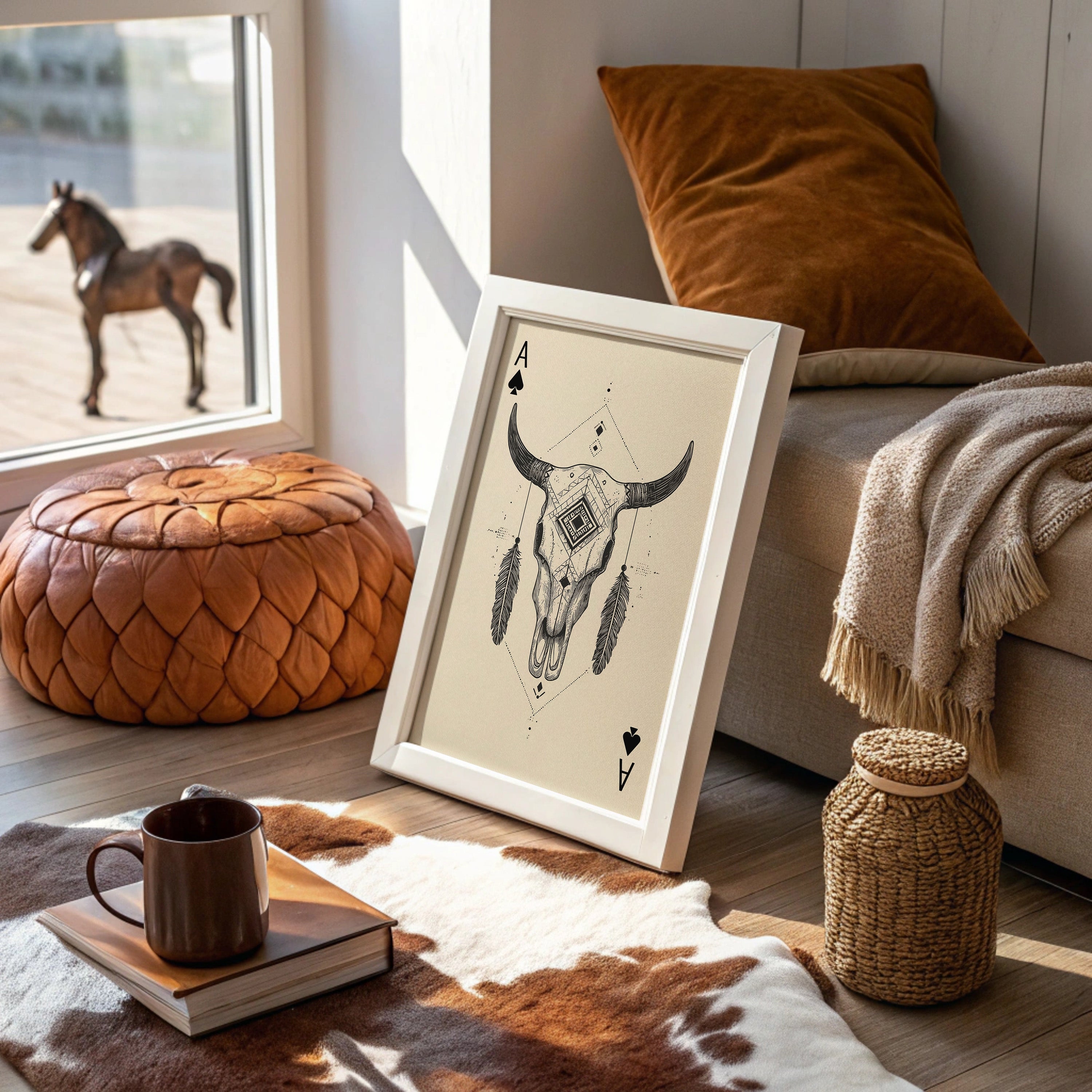 Where playing cards meet wild west symbolism, this striking skull illustration commands attention through bold geometric patterns and delicate feather details. The monochromatic design merges contemporary line work with traditional southwestern motifs, creating a powerful statement piece that bridges modern and rustic aesthetics. Perfectly suited for a modern ranch house, urban loft, or any space seeking to capture the essence of contemporary western style.