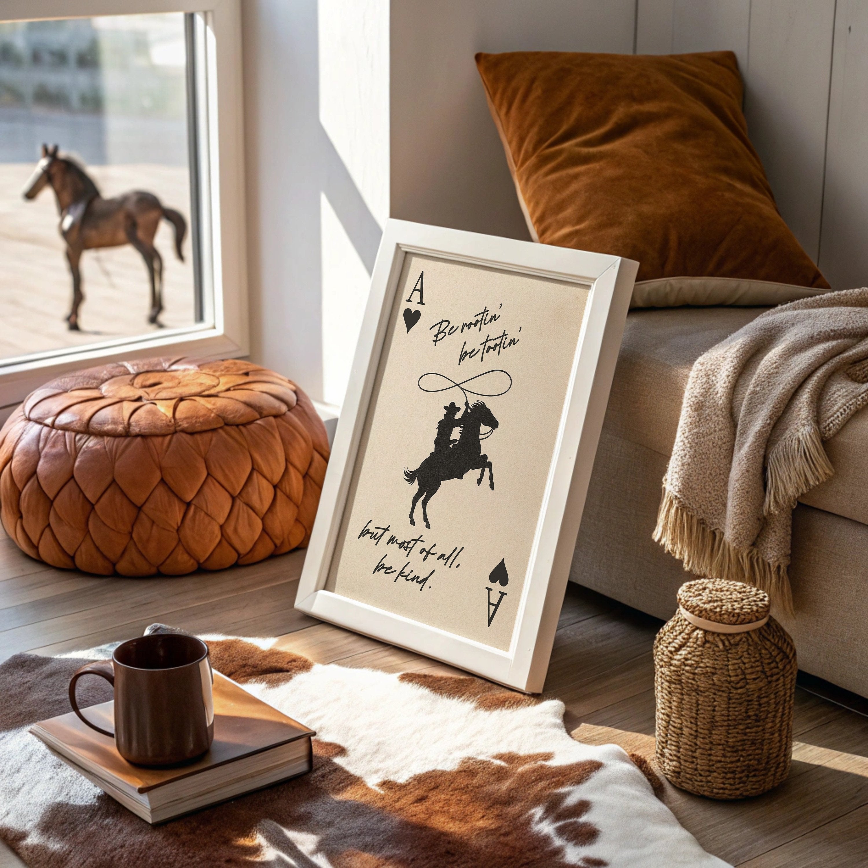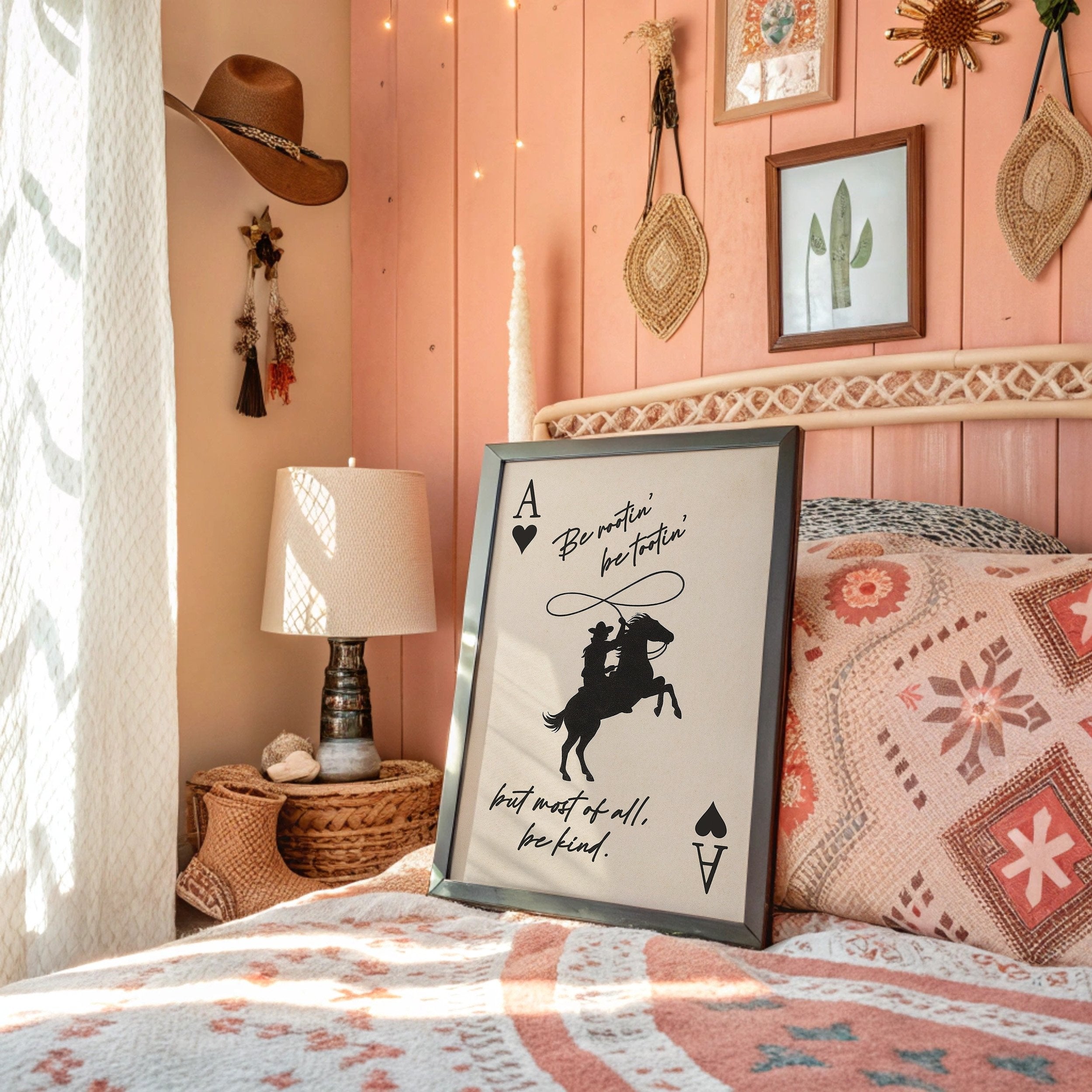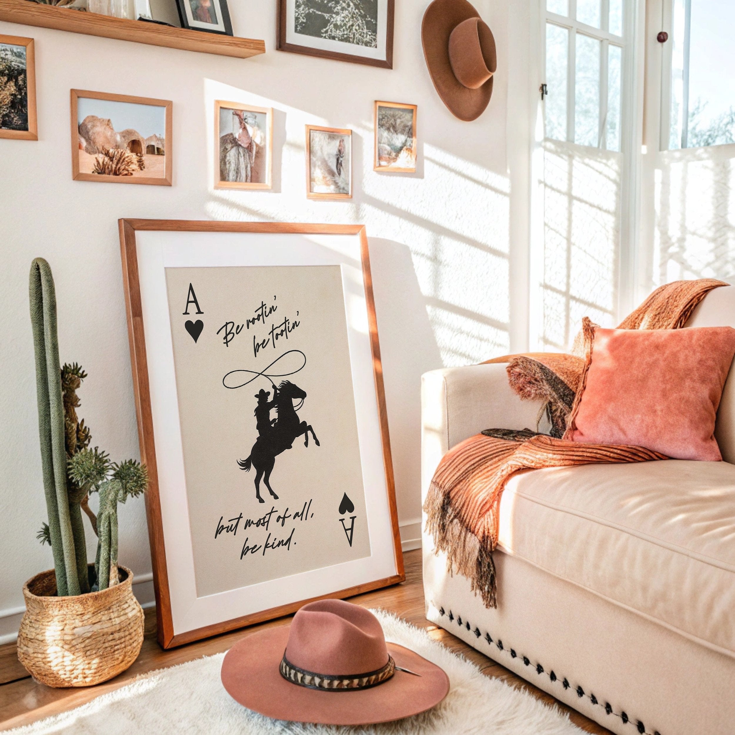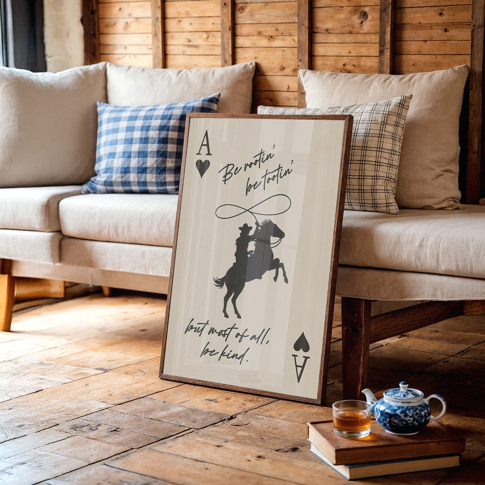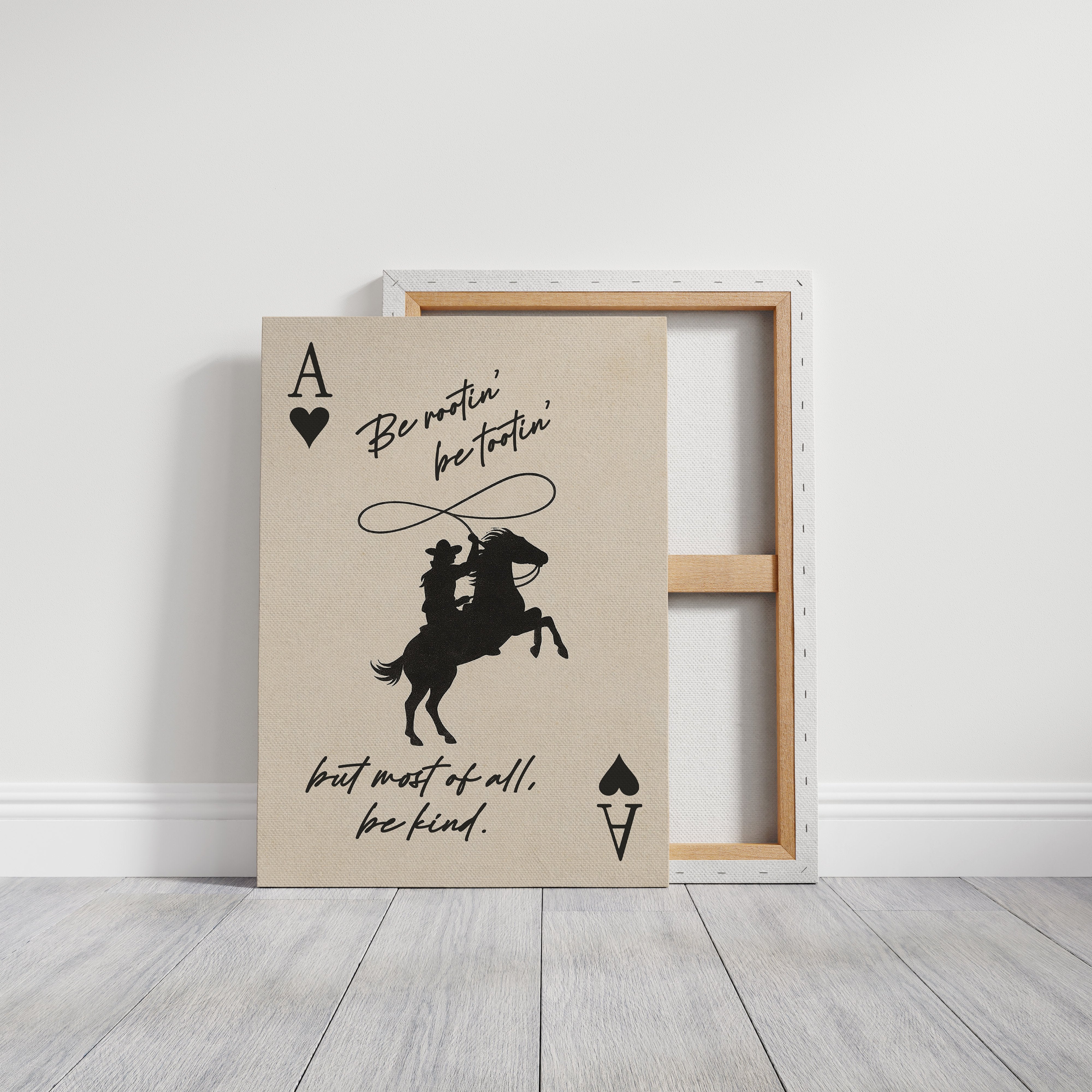Against a warm parchment backdrop, silhouettes tell a story of wild spirit and gentle heart. The bold contrast of black against cream captures a cowboy's silhouette mid-action, lasso swinging above a rearing horse, framed by playing card symbols that speak to life's gamble. The handwritten wisdom""Be rootin', be tootin', but most of all, be kind""weaves together frontier grit with unexpected tenderness.
