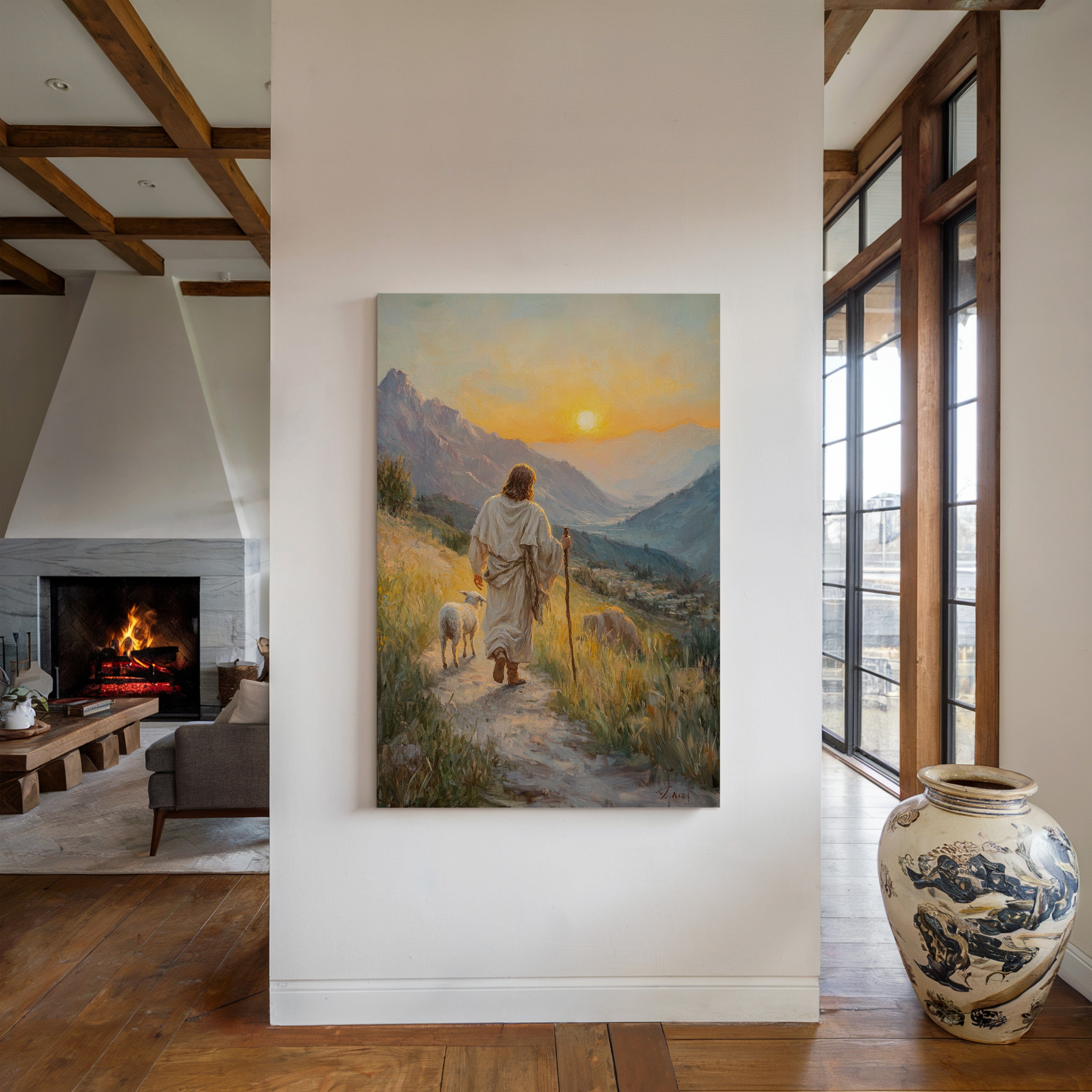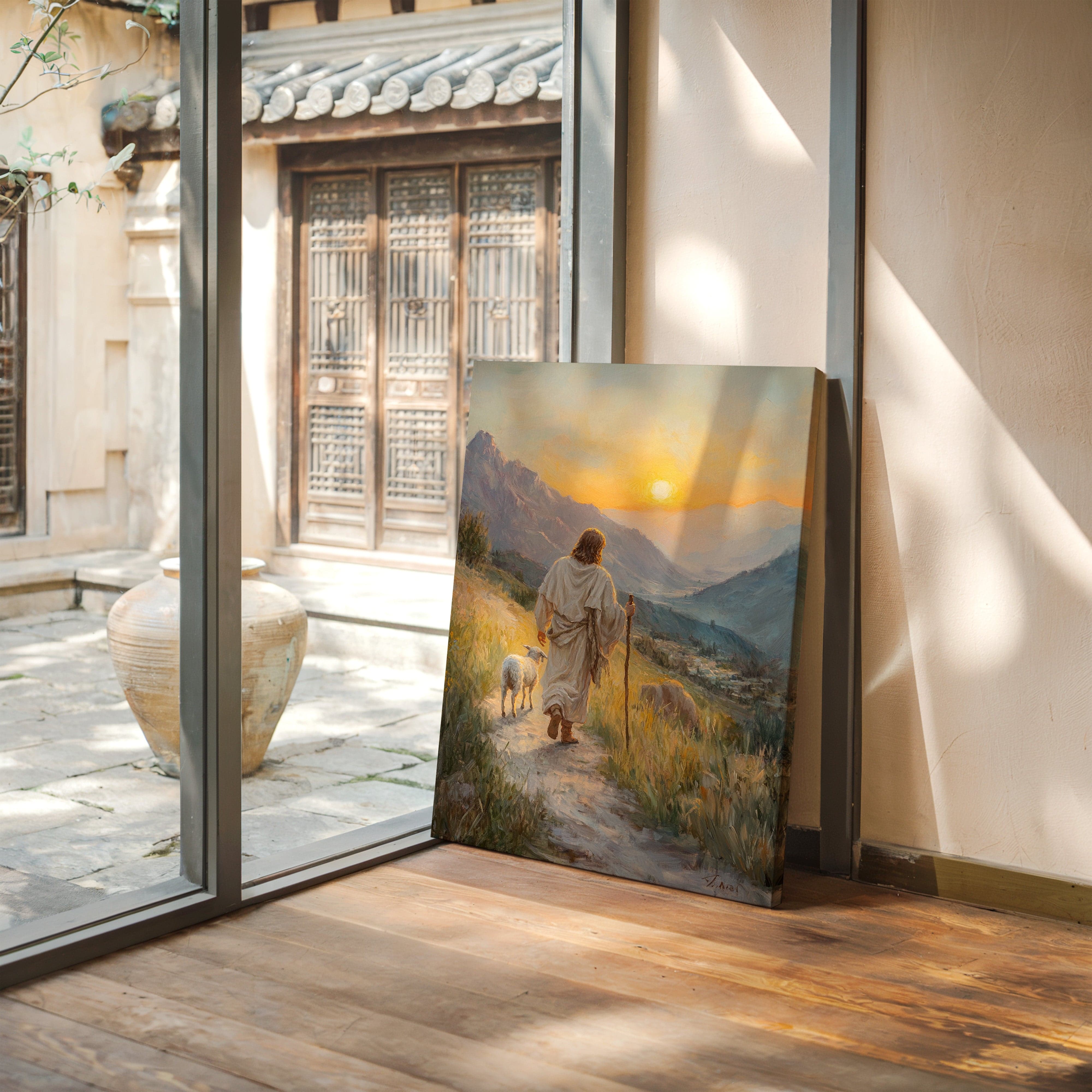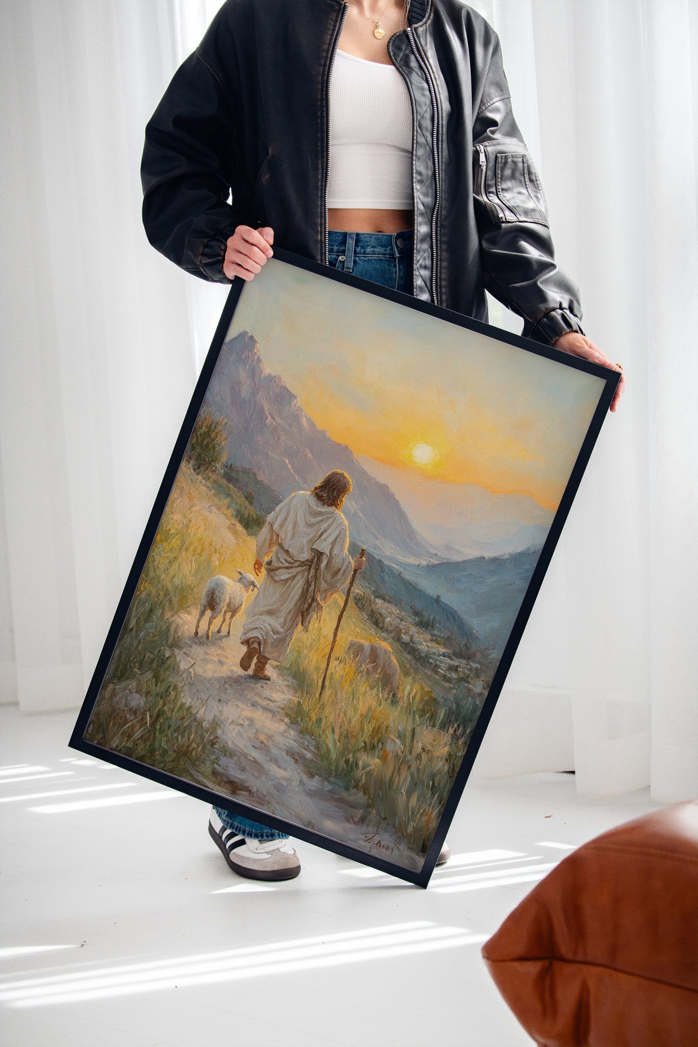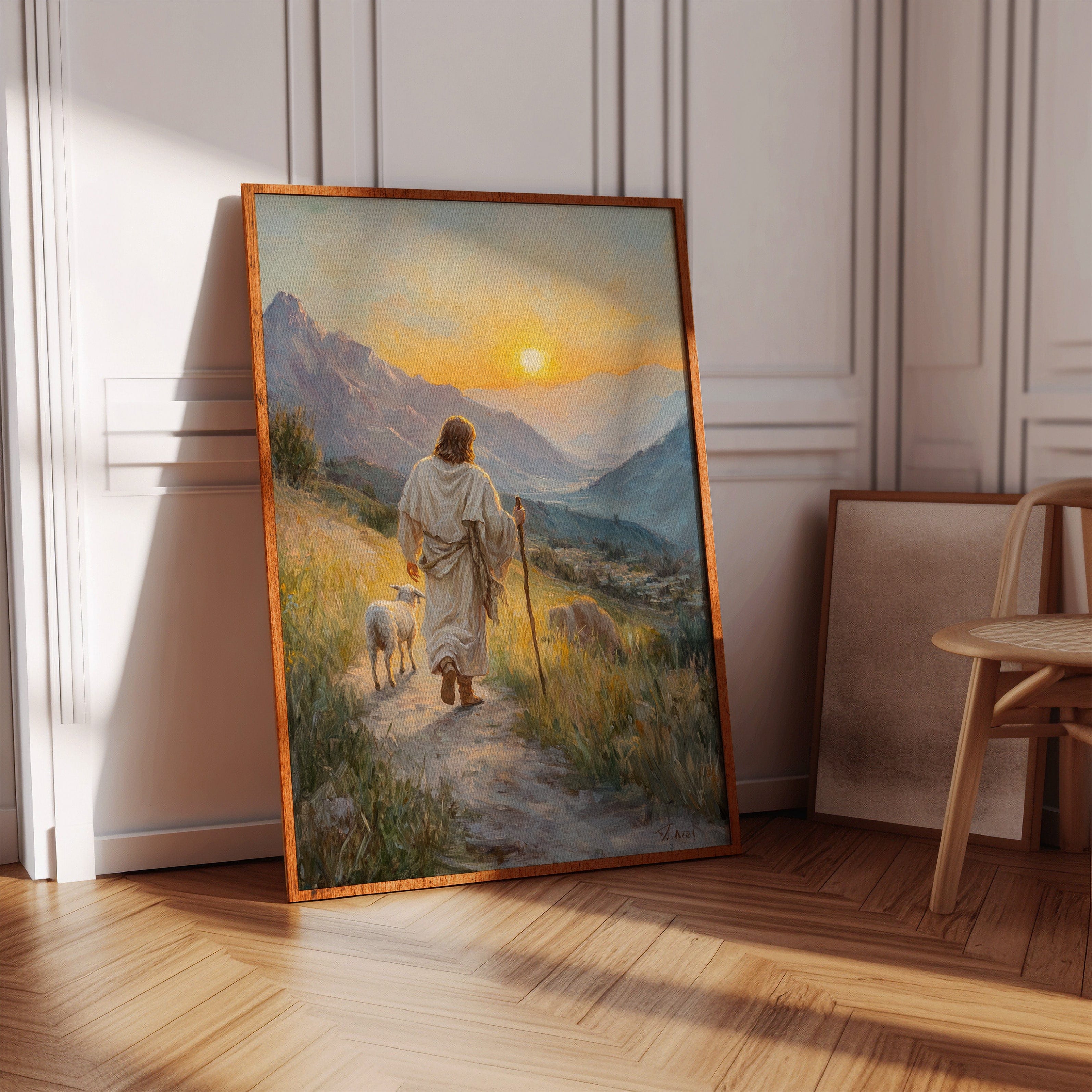 Embrace peace, faith, and divine guidance with this beautifully painted depiction of Jesus as the Good Shepherd. Set against a breathtaking mountain sunset, this artwork symbolizes love, protection, and spiritual grace, making it a perfect addition to any prayer room, church, or home decor.
