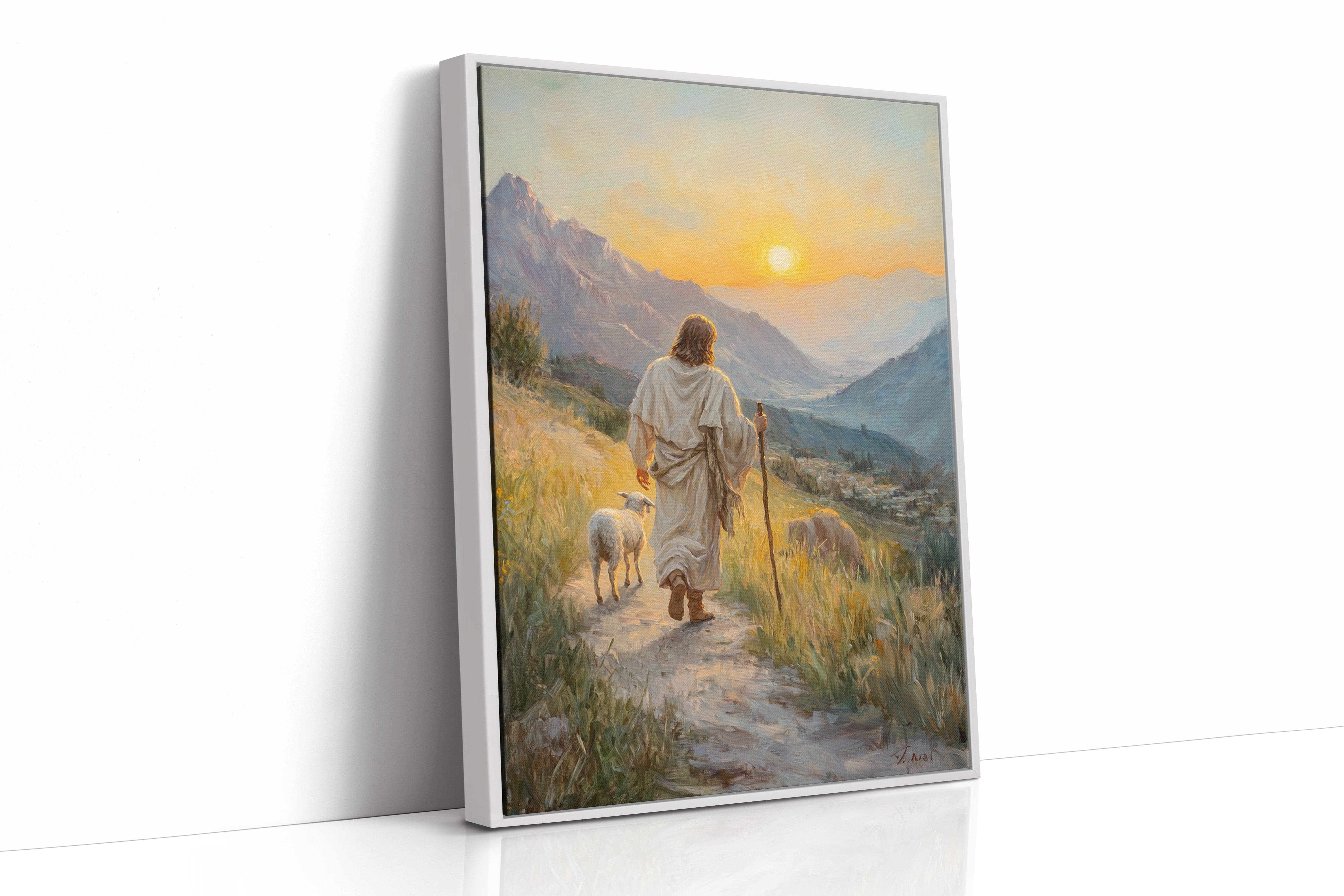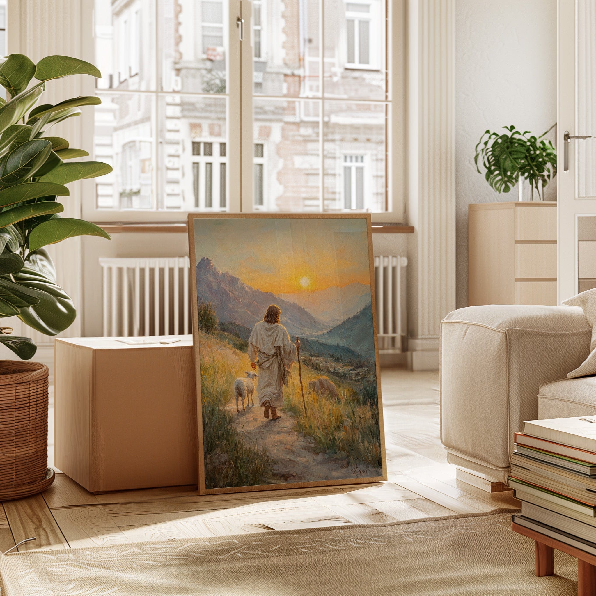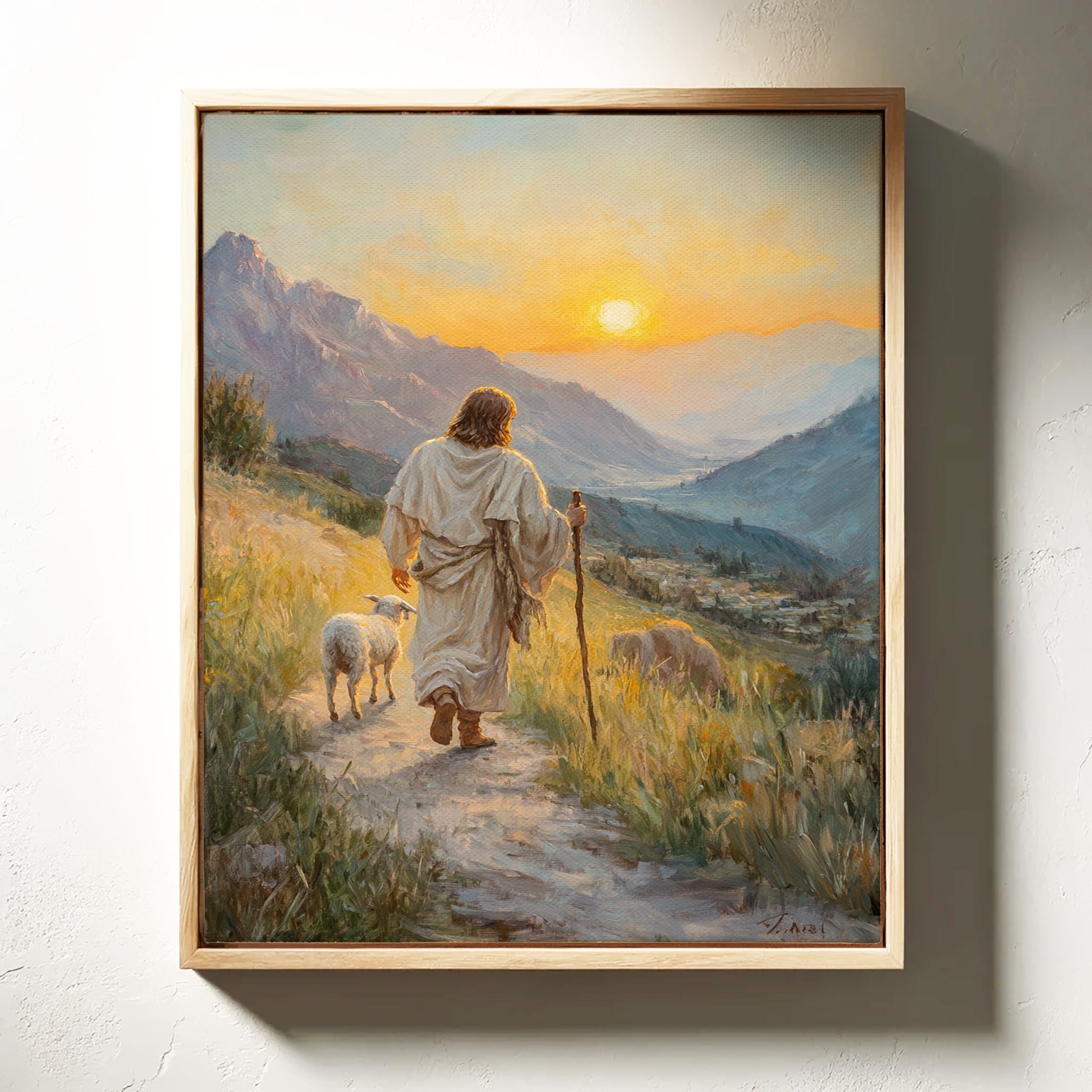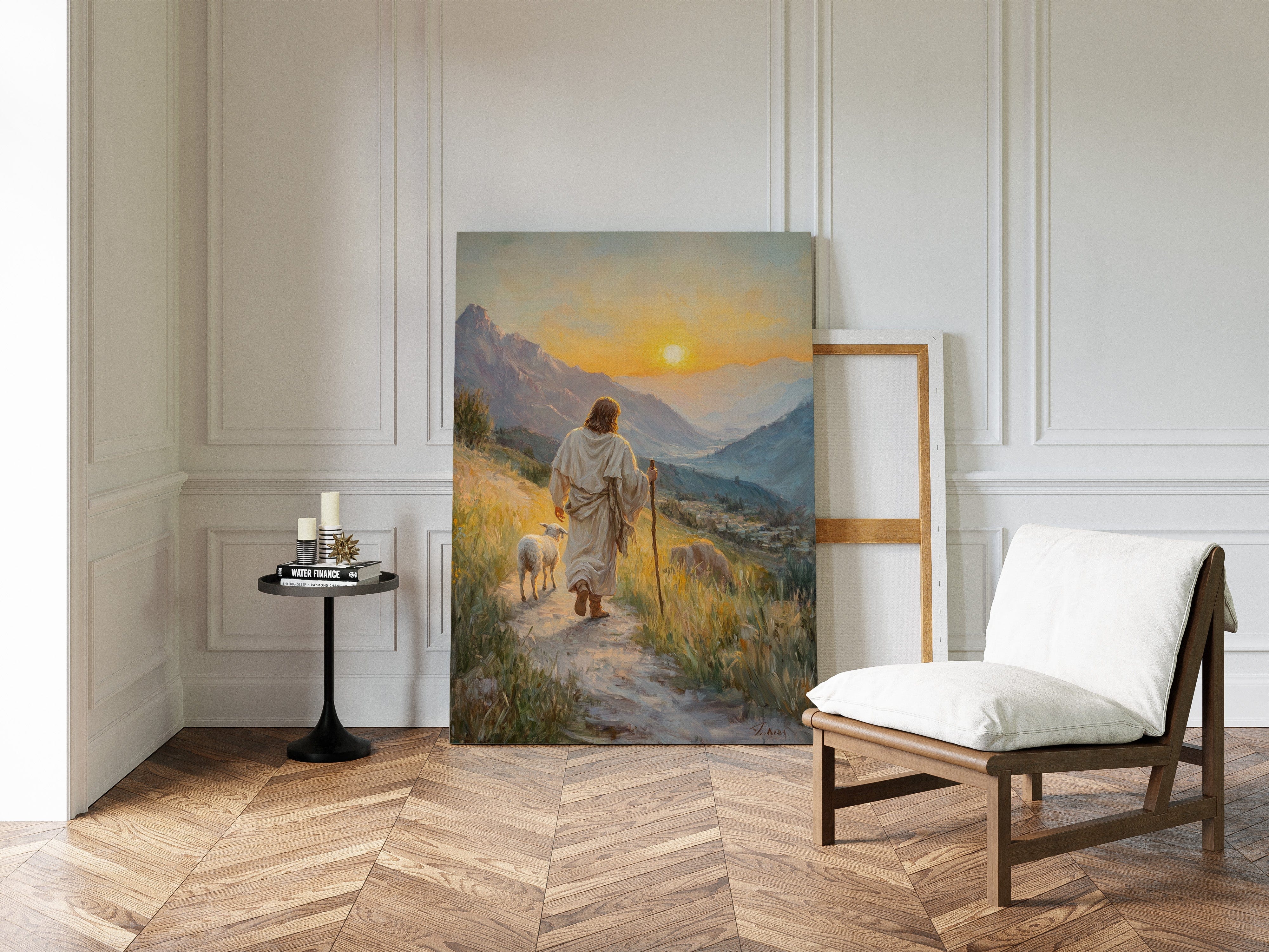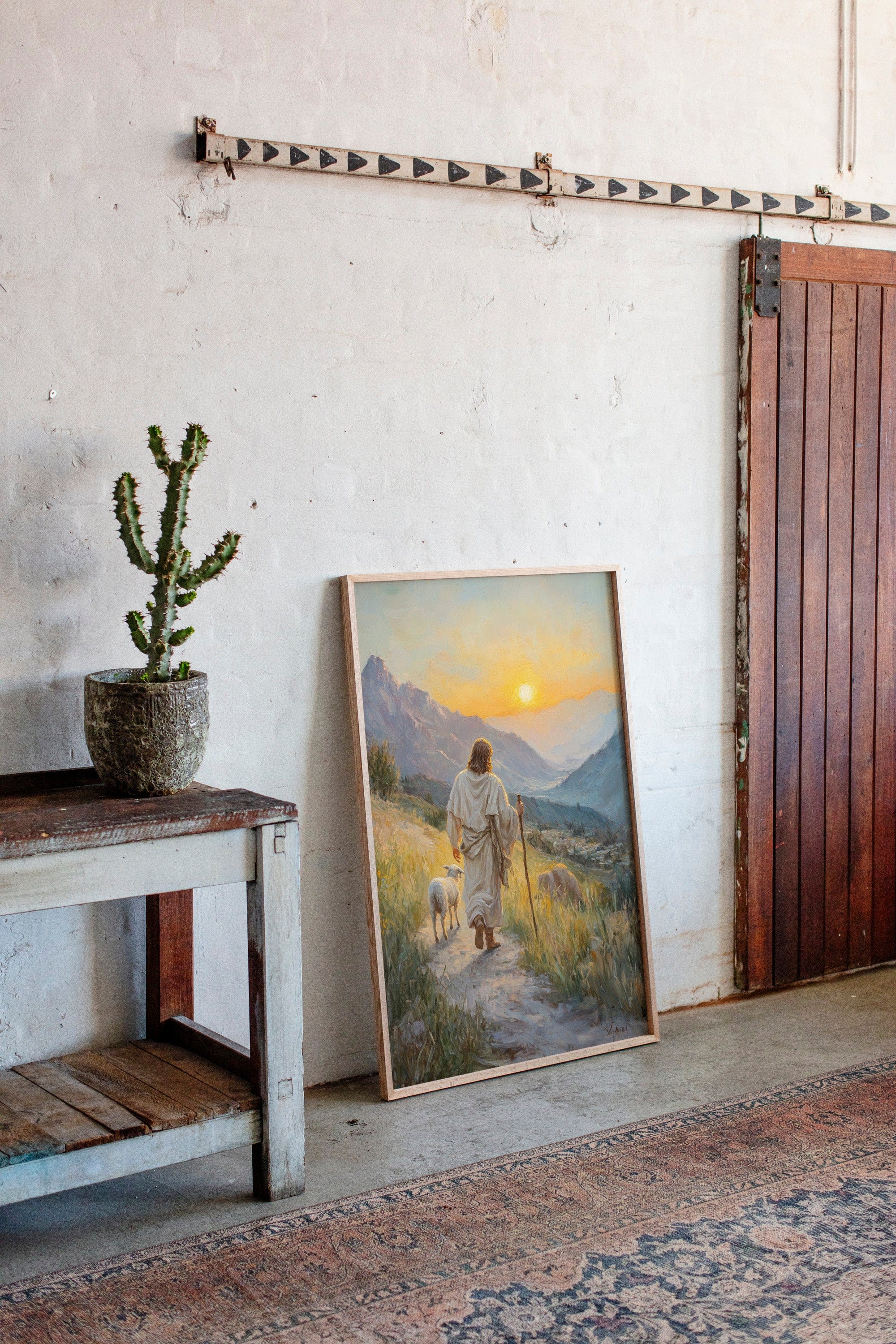 Embrace peace, faith, and divine guidance with this beautifully painted depiction of Jesus as the Good Shepherd. Set against a breathtaking mountain sunset, this artwork symbolizes love, protection, and spiritual grace, making it a perfect addition to any prayer room, church, or home decor.